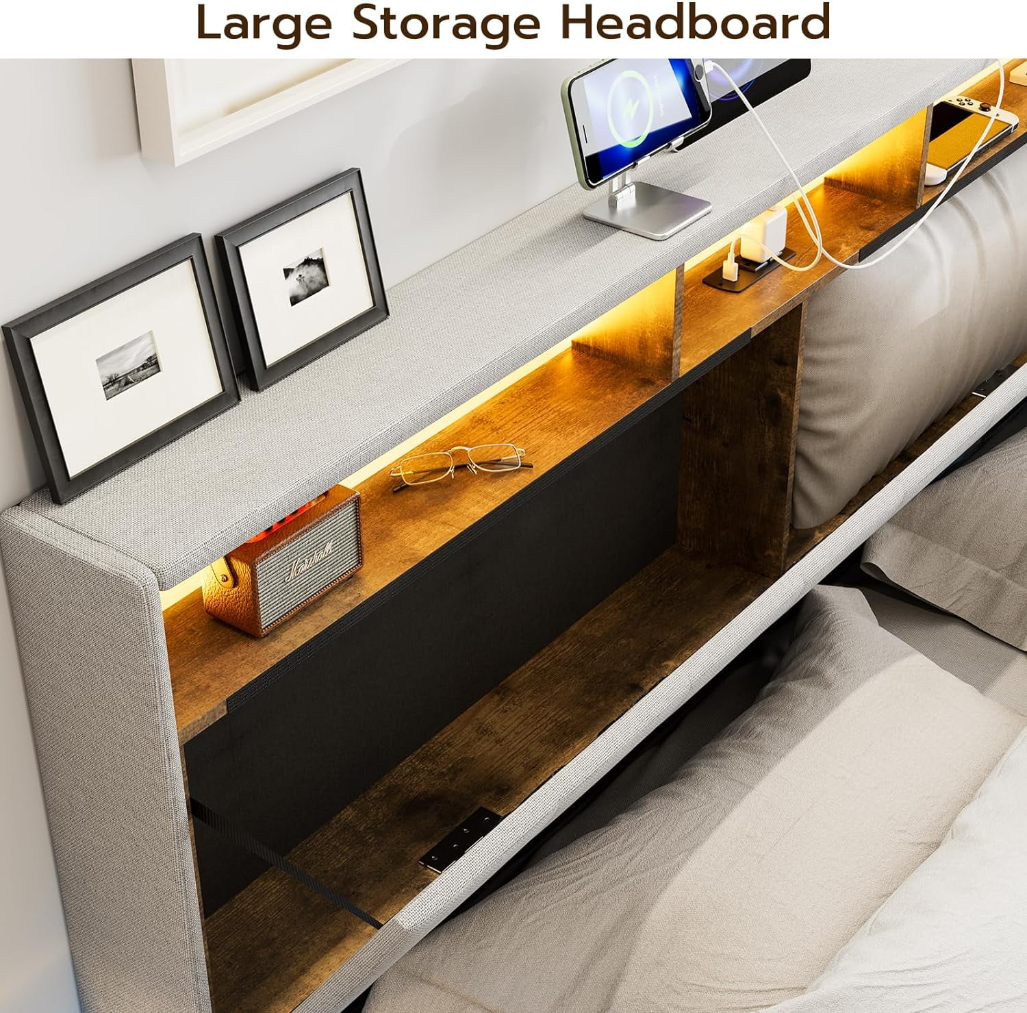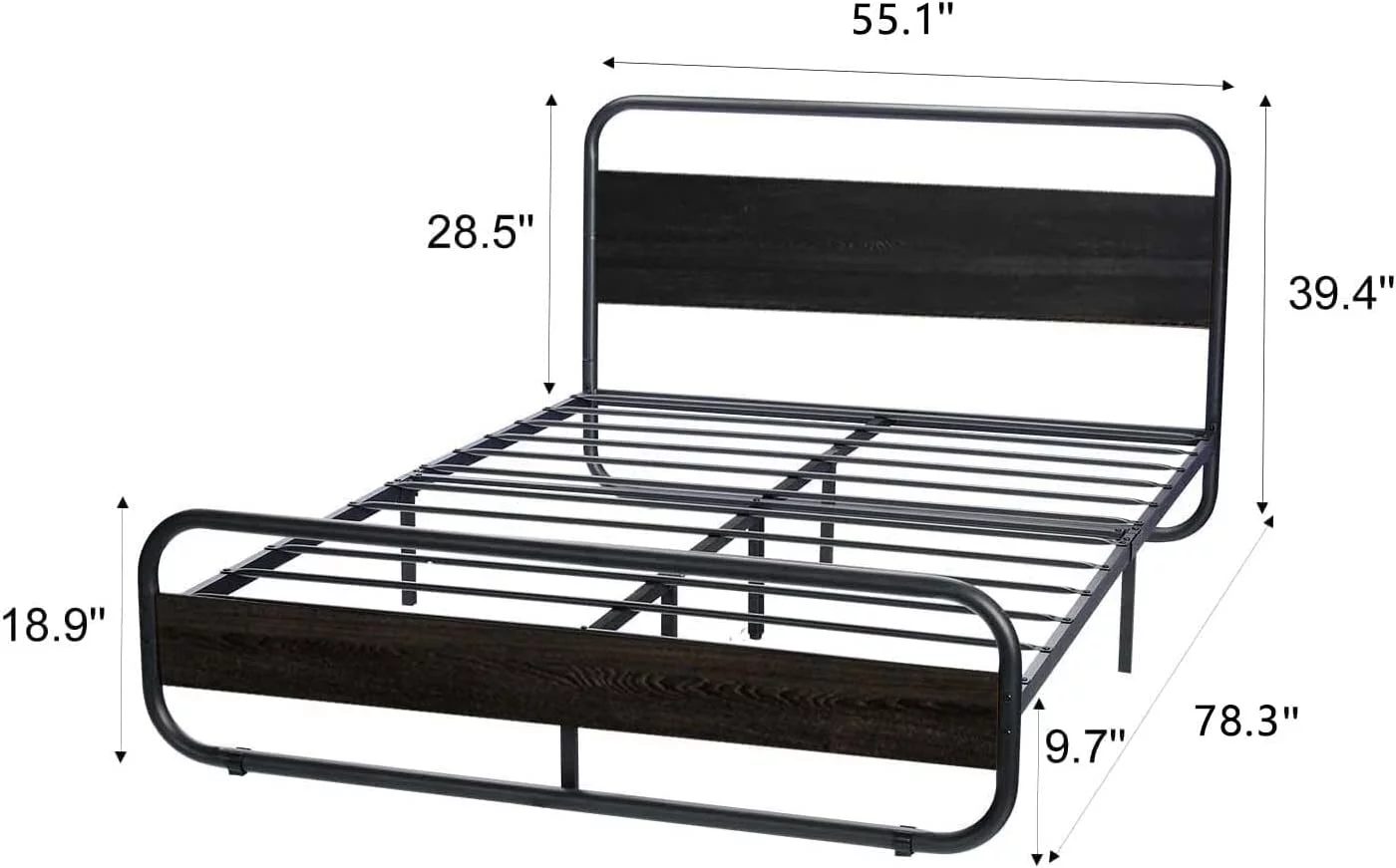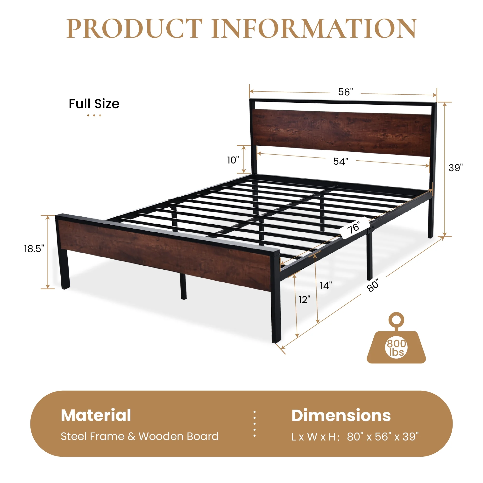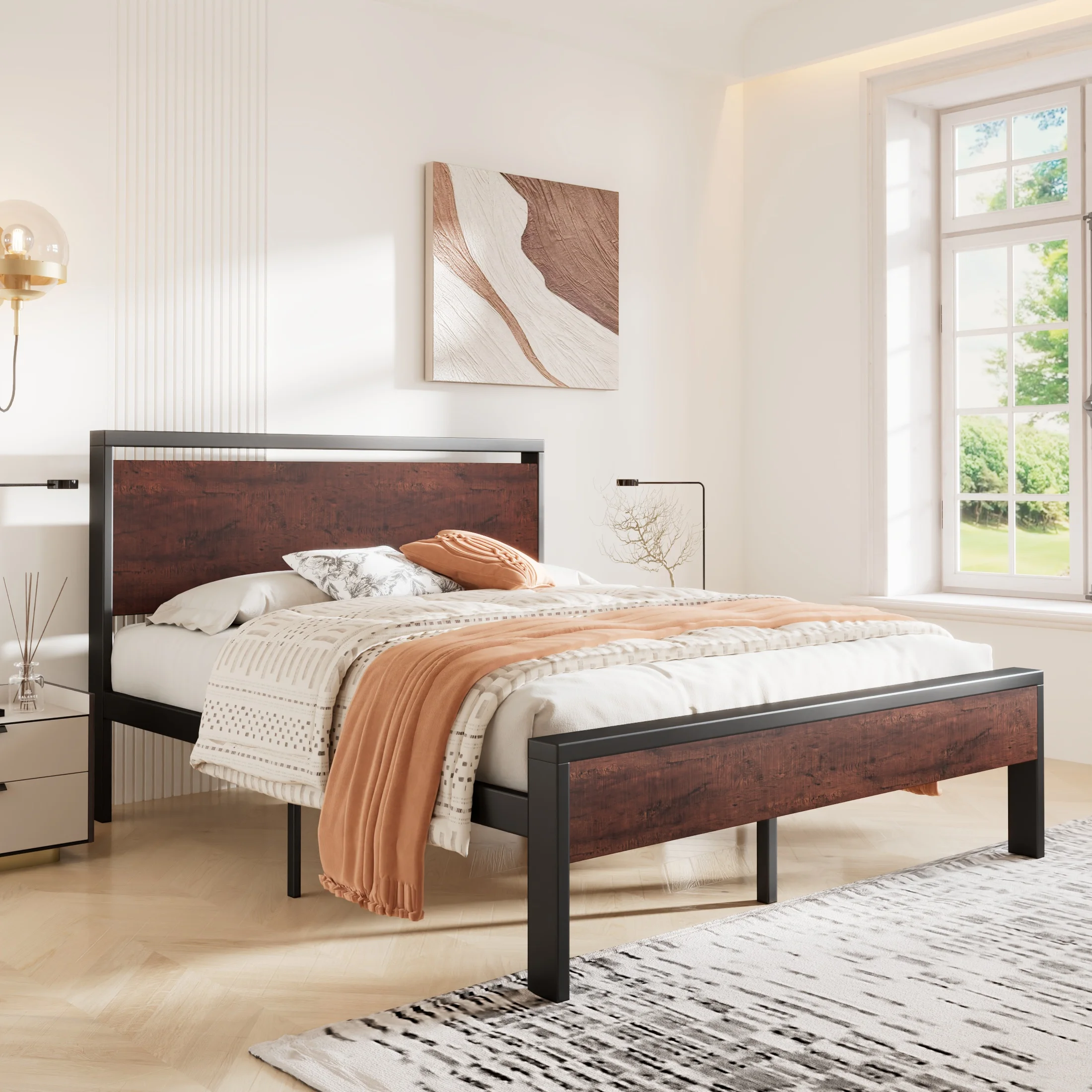 Sha Cerlin Full Size Metal Platform Bed Frame with Wooden Headboard & Underbed Storage, Mahogany