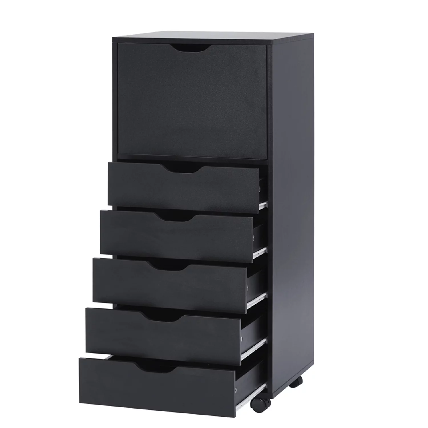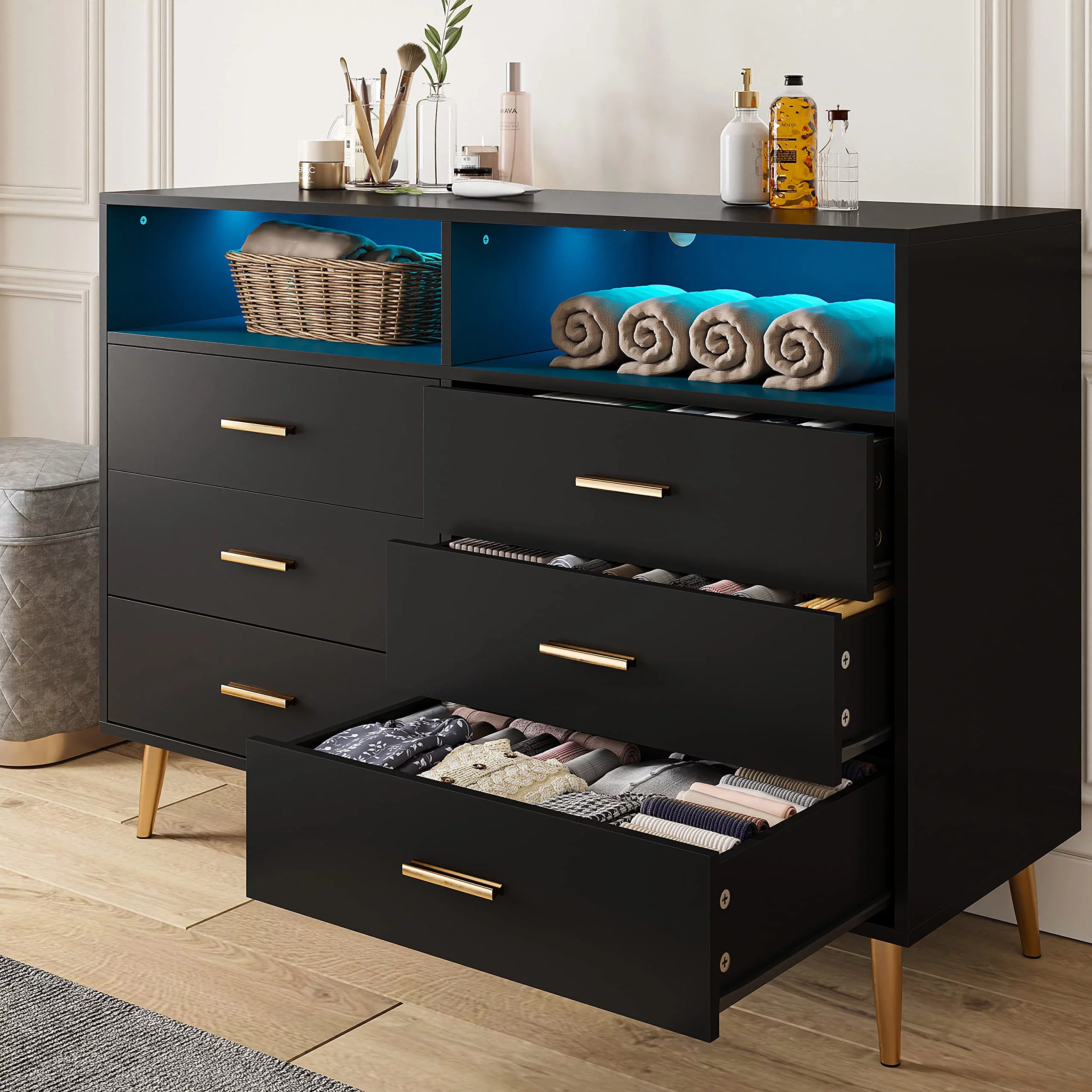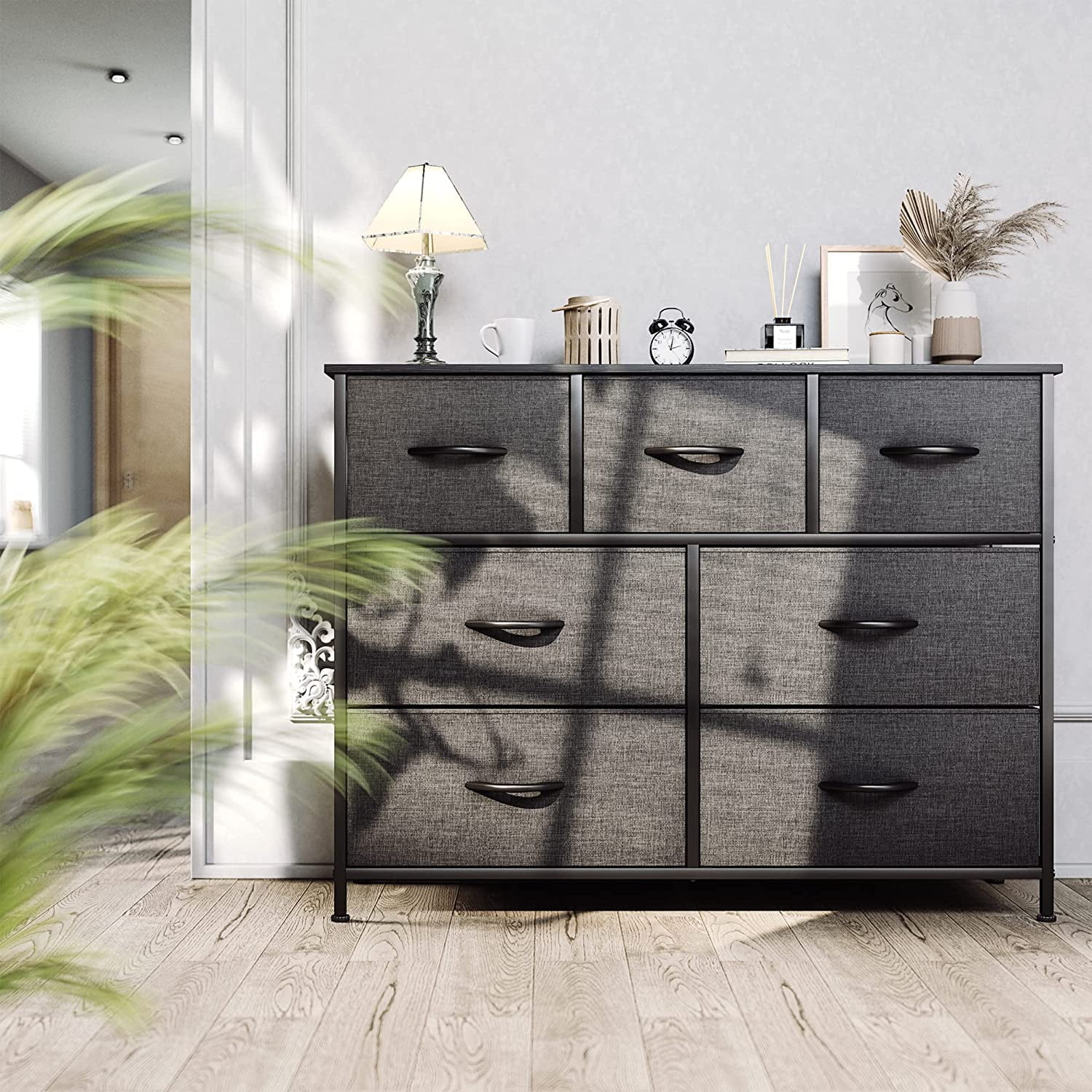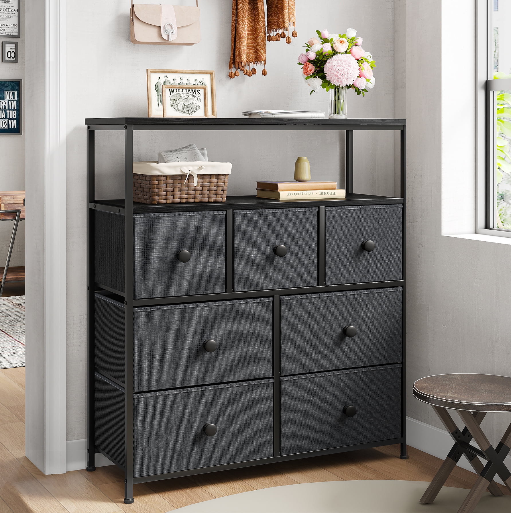 Homfa 7 Drawer Black Dresser for Bedroom, Glass Panel Wood Storage Cabinet with Easy Pull Out Handles for Living Room