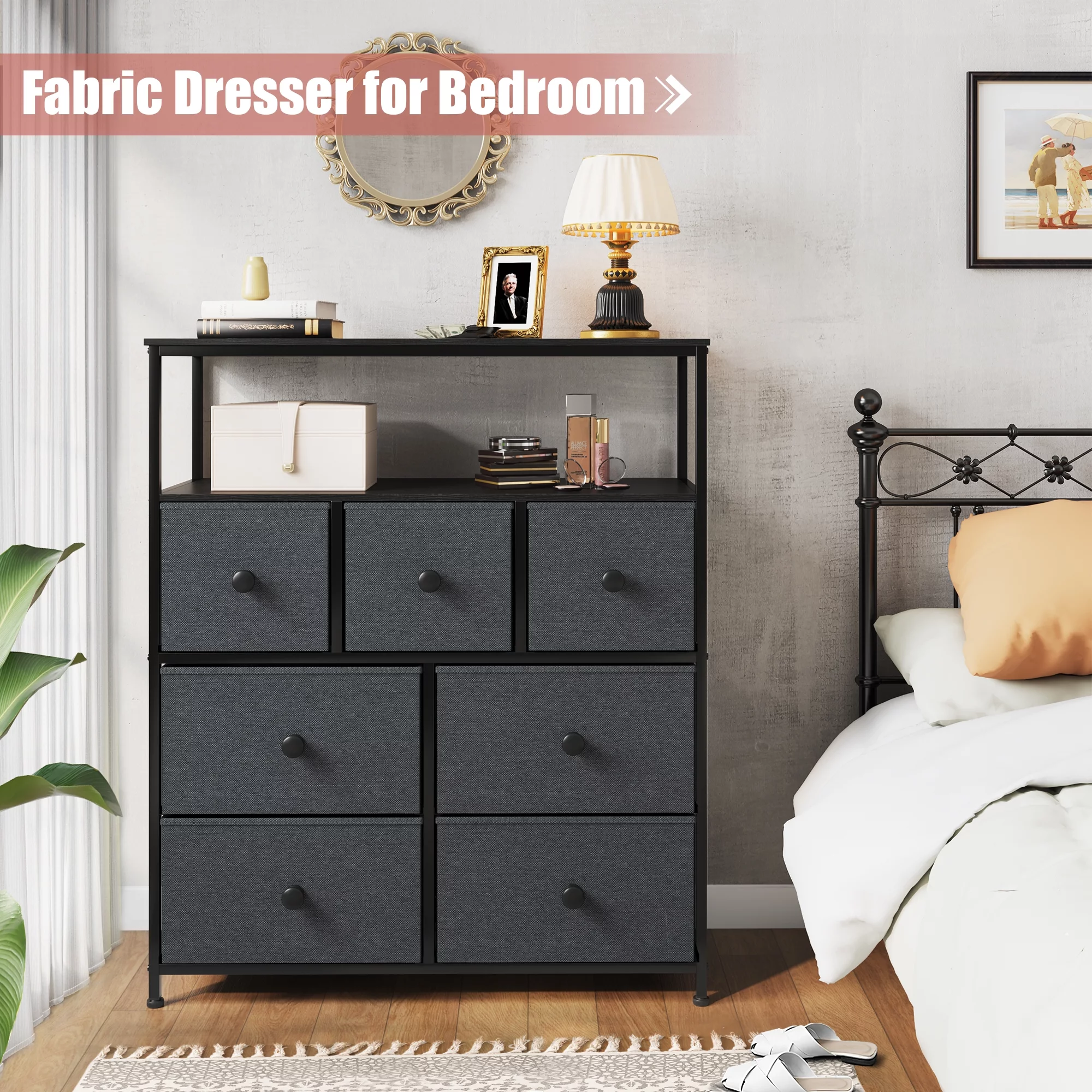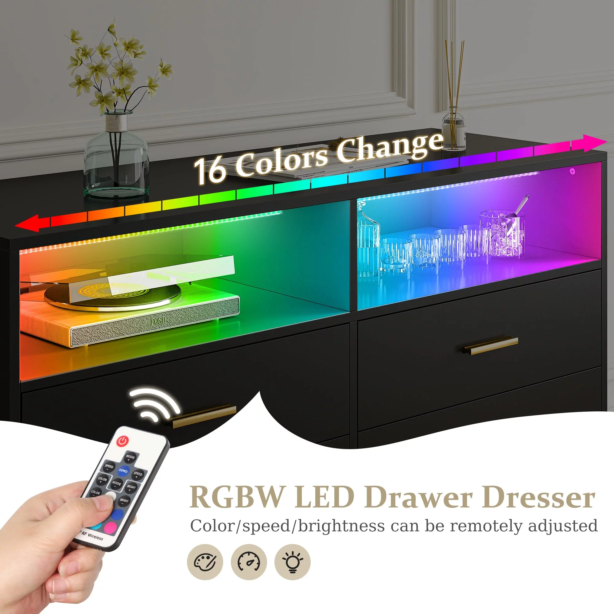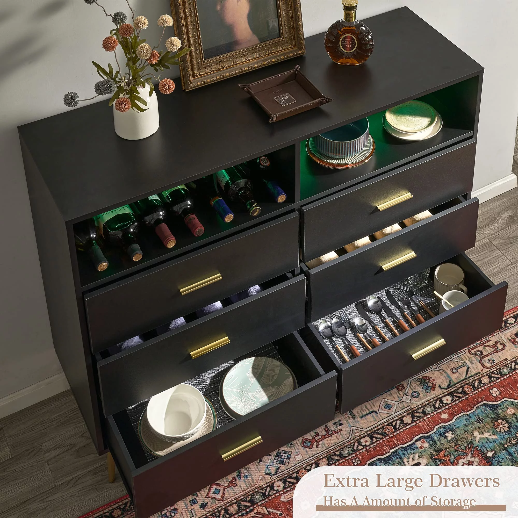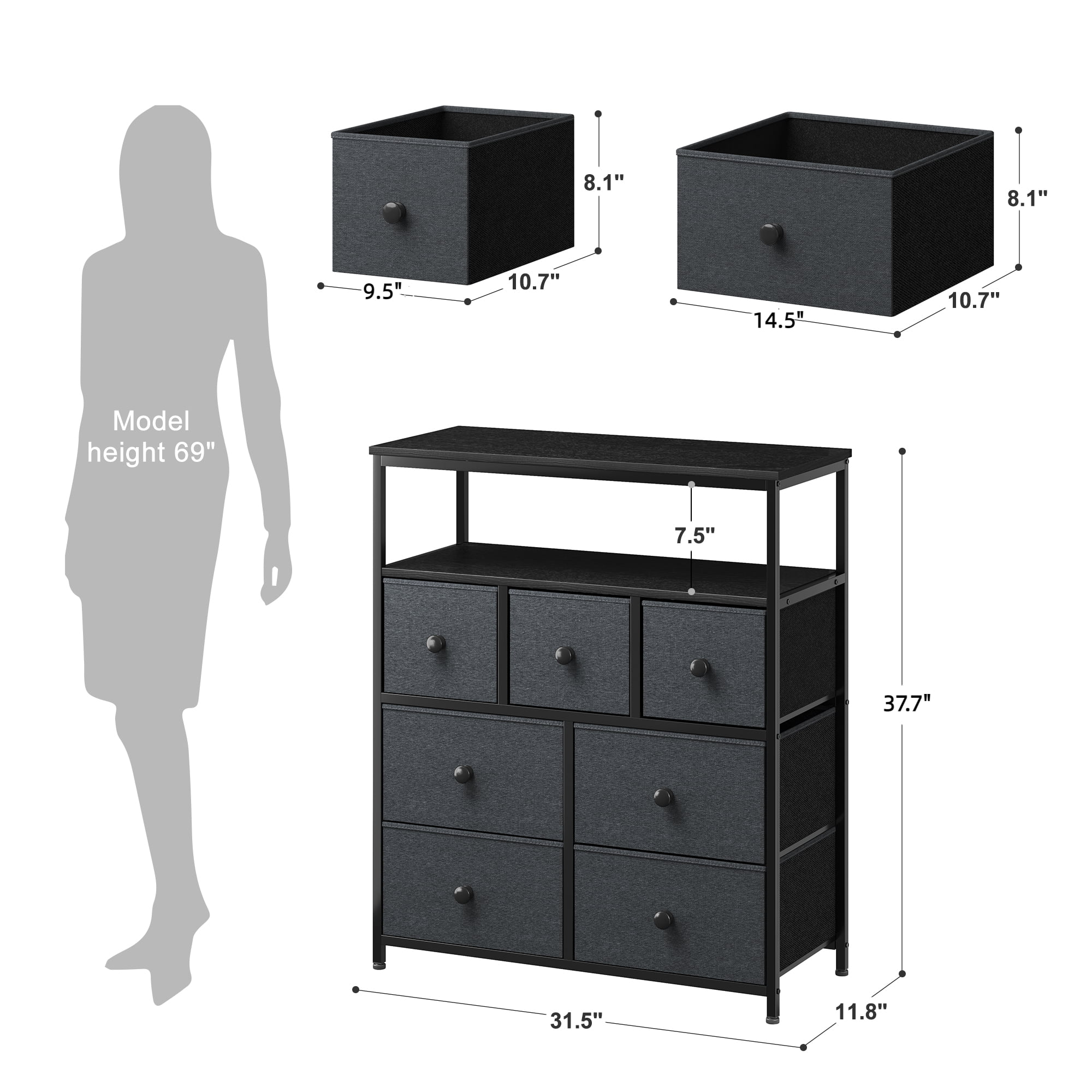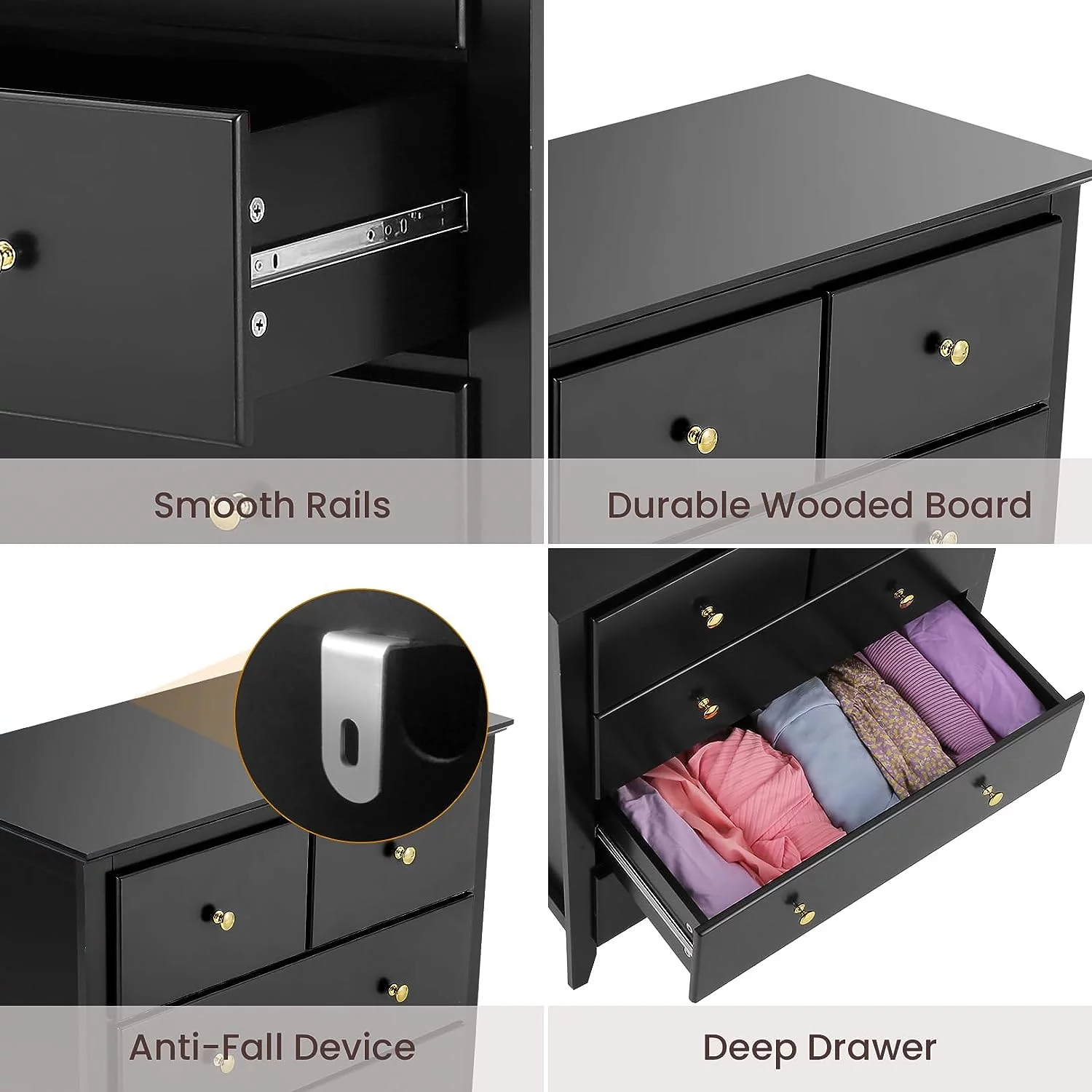 Homfa 7 Drawer Black Dresser for Bedroom, Glass Panel Wood Storage Cabinet with Easy Pull Out Handles for Living Room