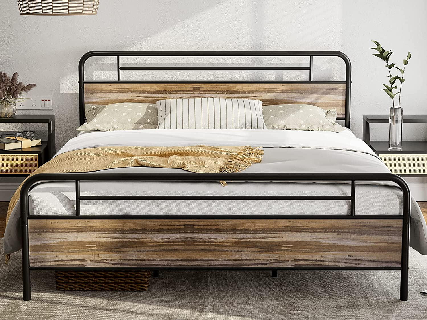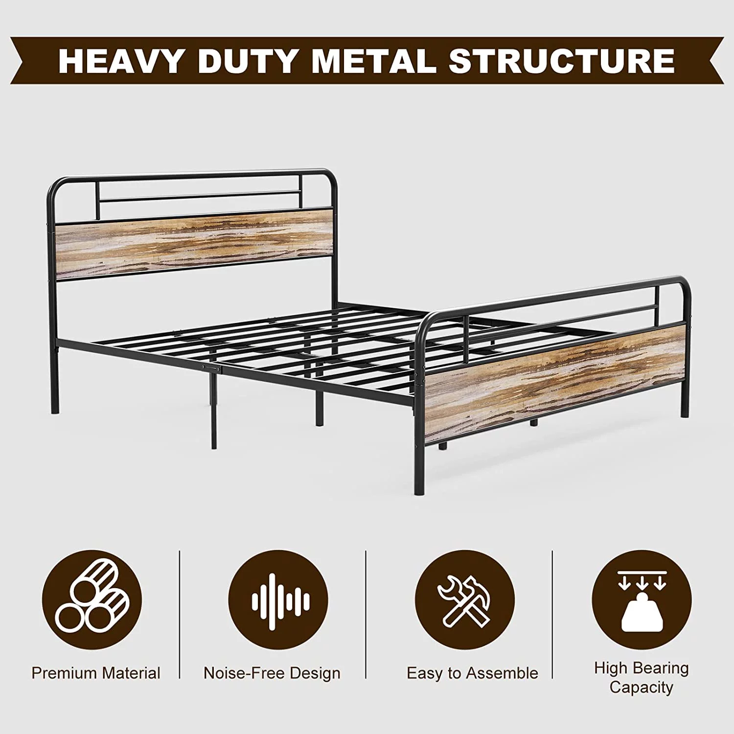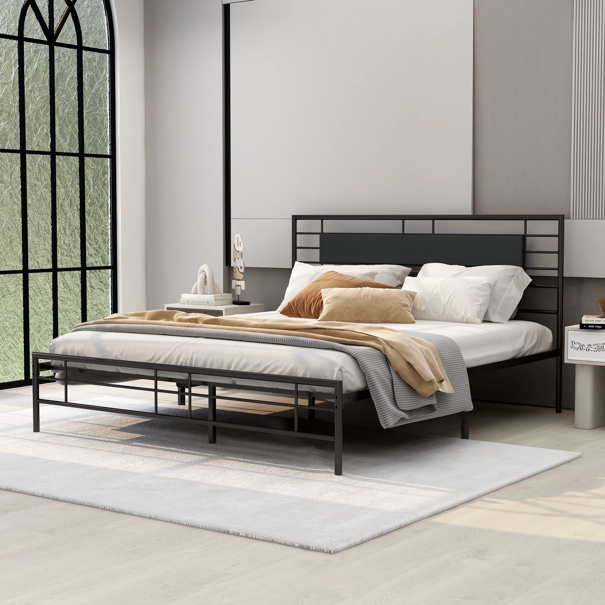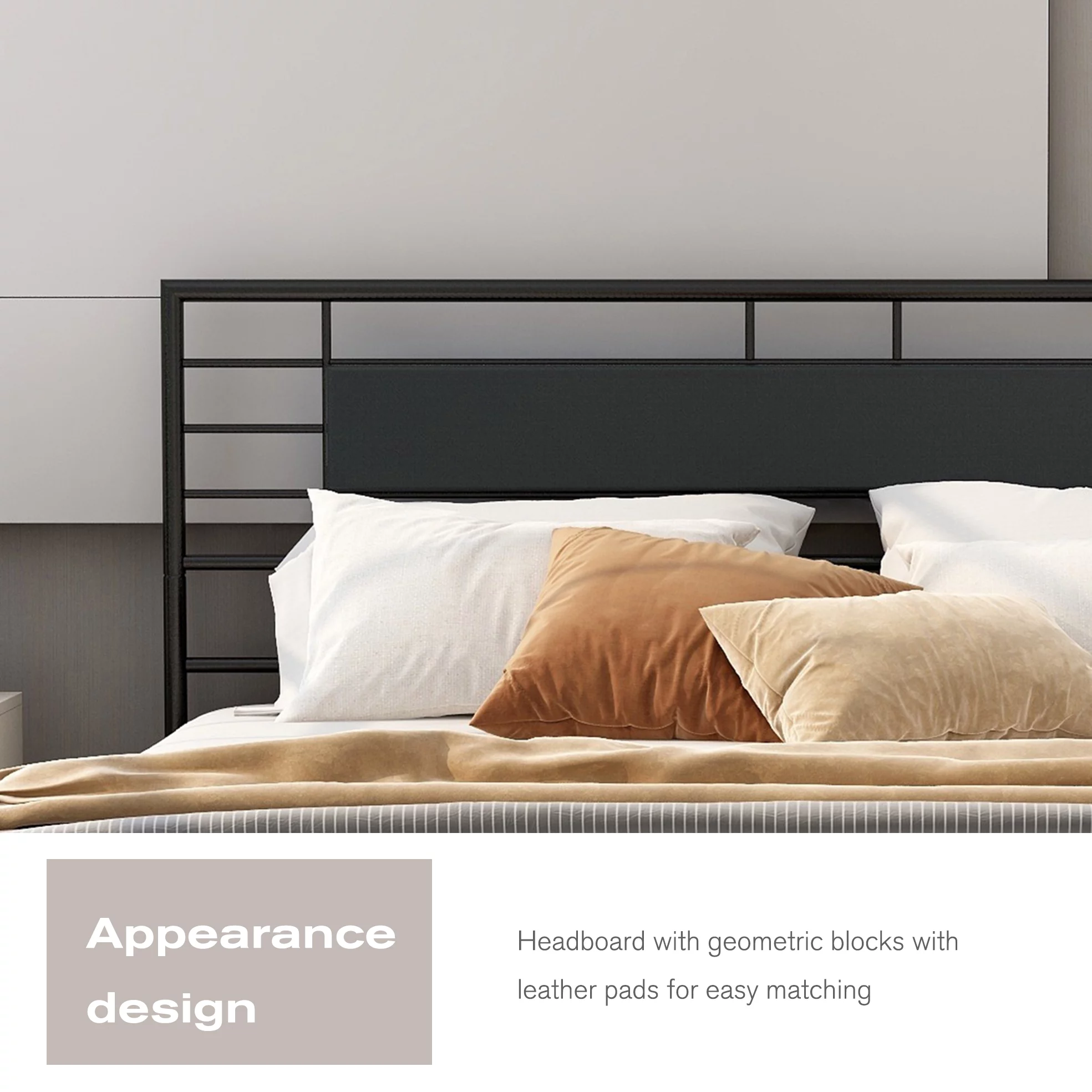 NNV California King Size Platform Metal Bed Frame with Leather Upholstered Headboard, Black