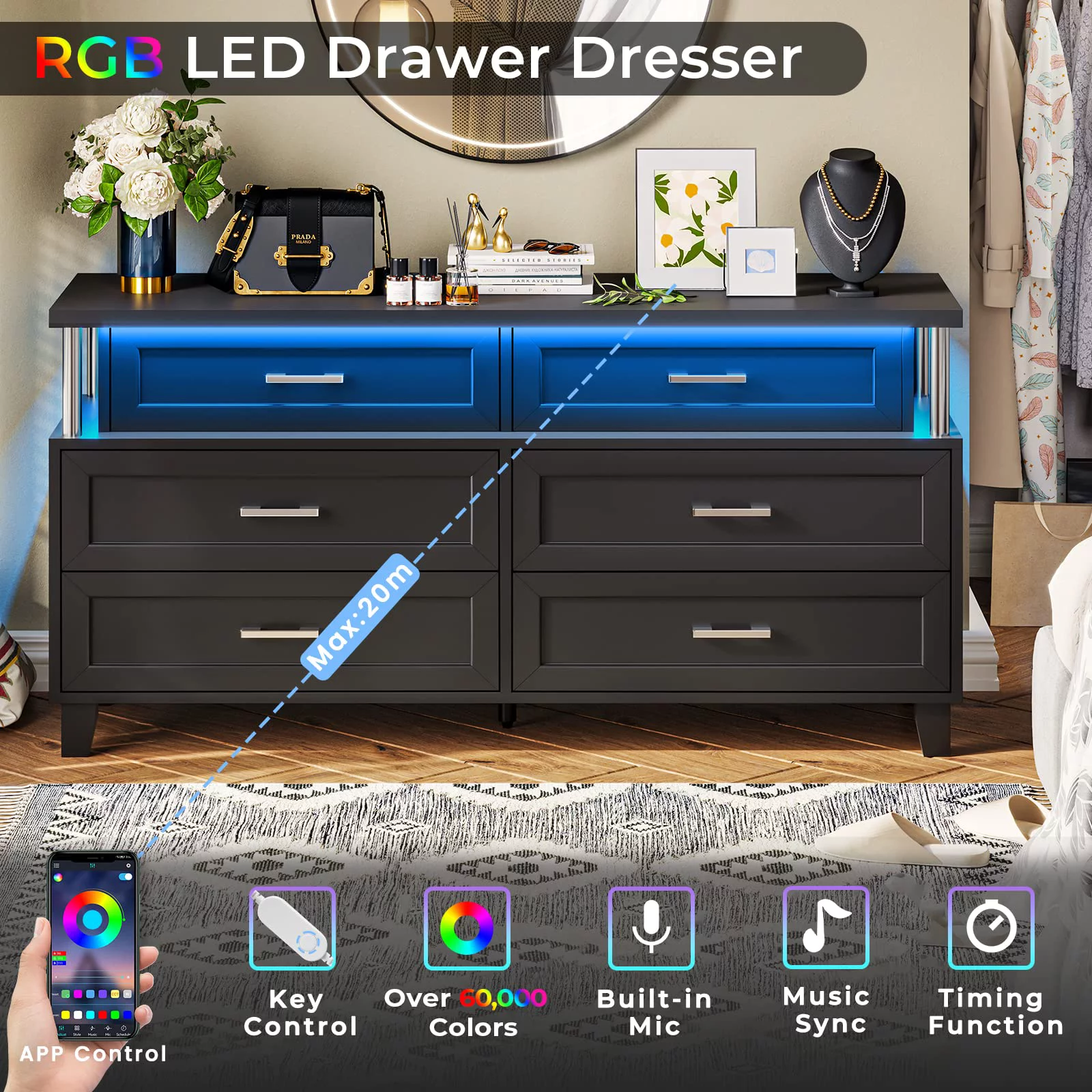 6 Drawer Double Dresser with LED Lights, Black Storage Cabinet for Bedroom, Hallway, Entryway