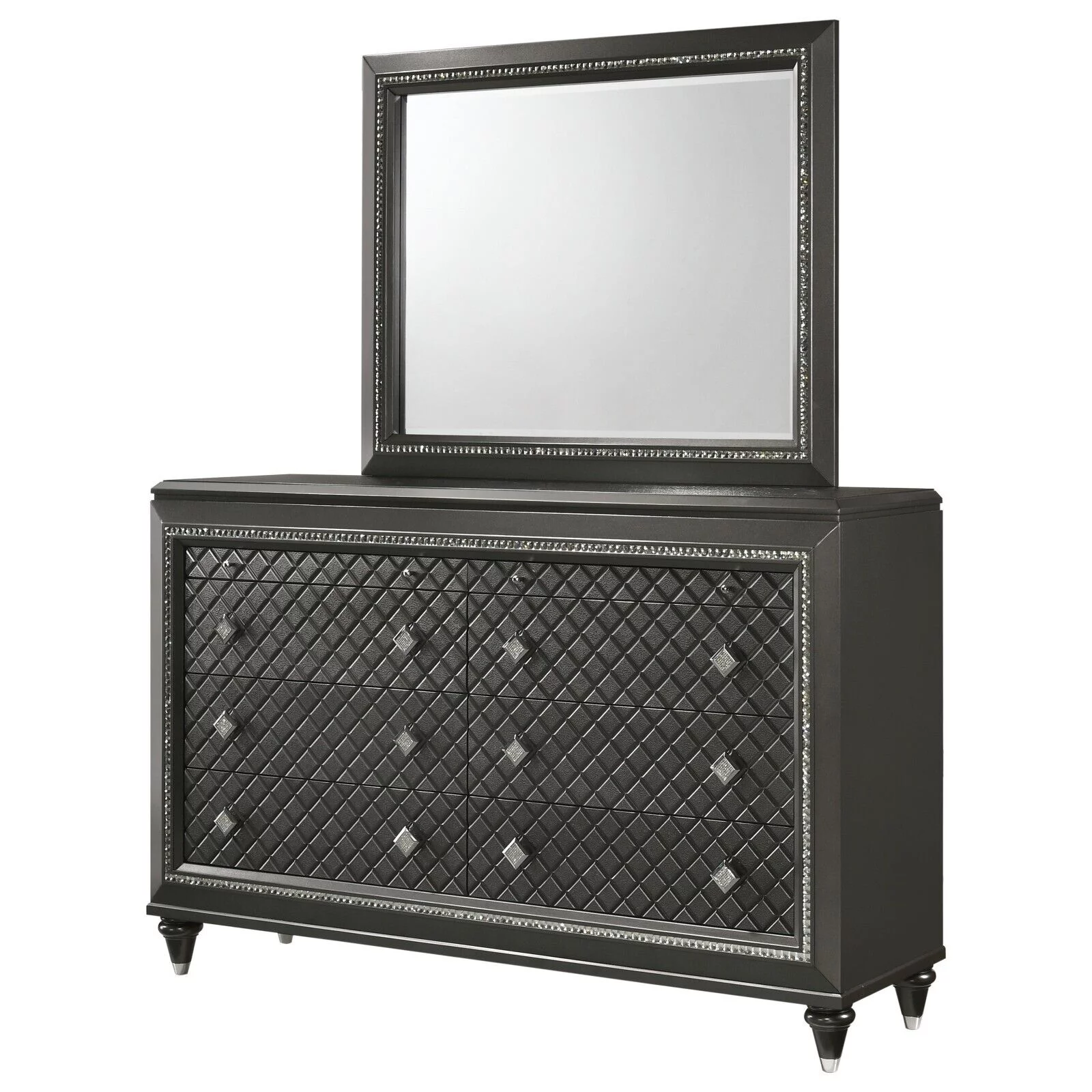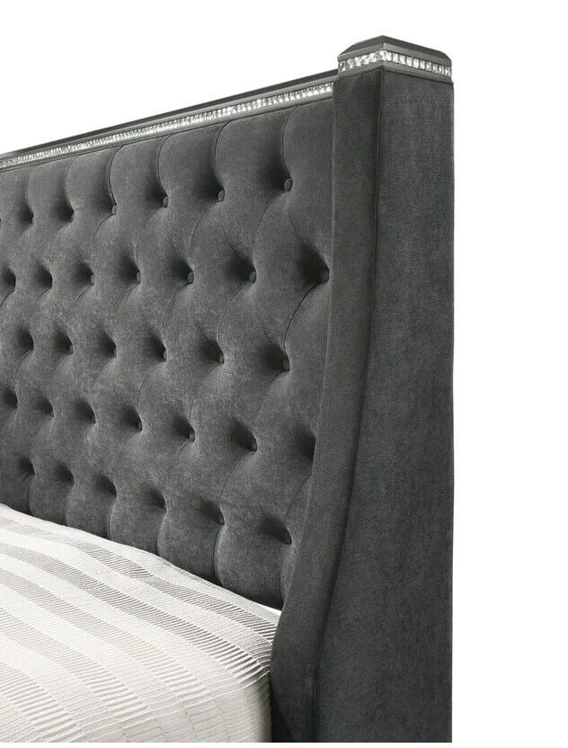 Modern Glam Style 4pc King Size Bedroom Set Grey Upholstered Panel Bed Dresser Mirror Nightstand Bedroom Furniture
