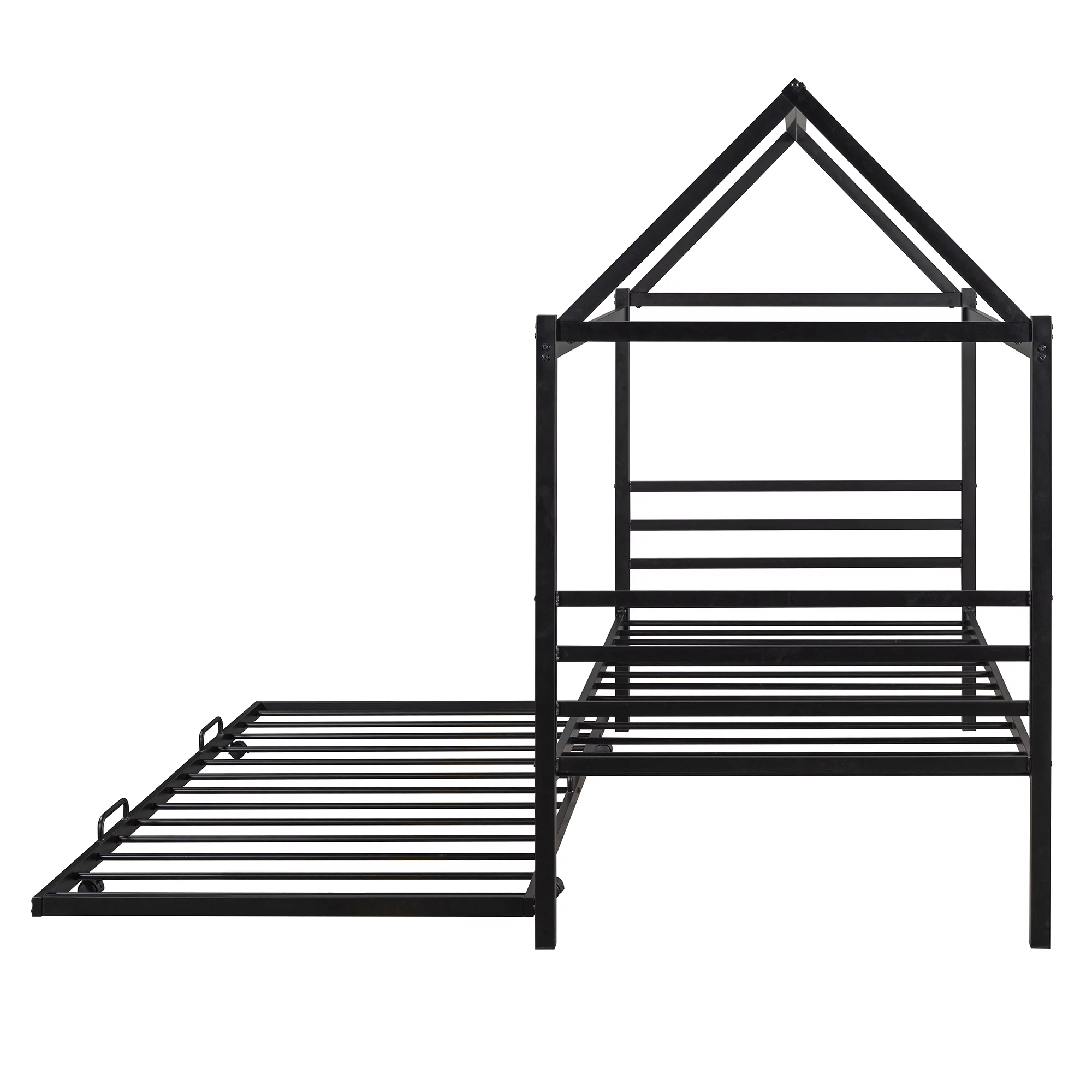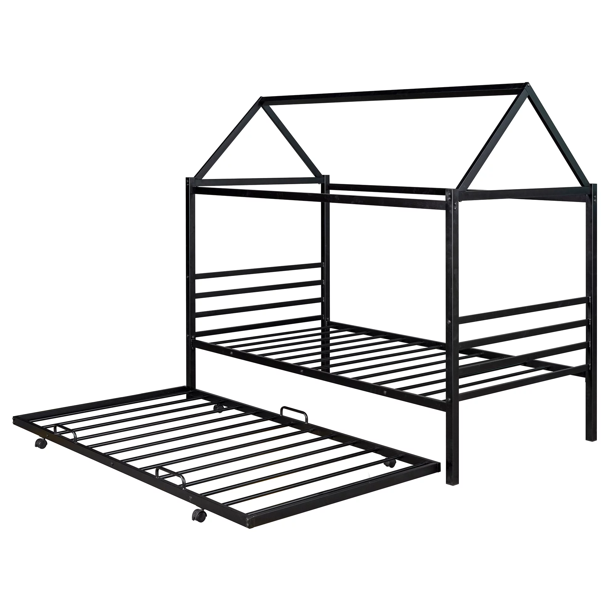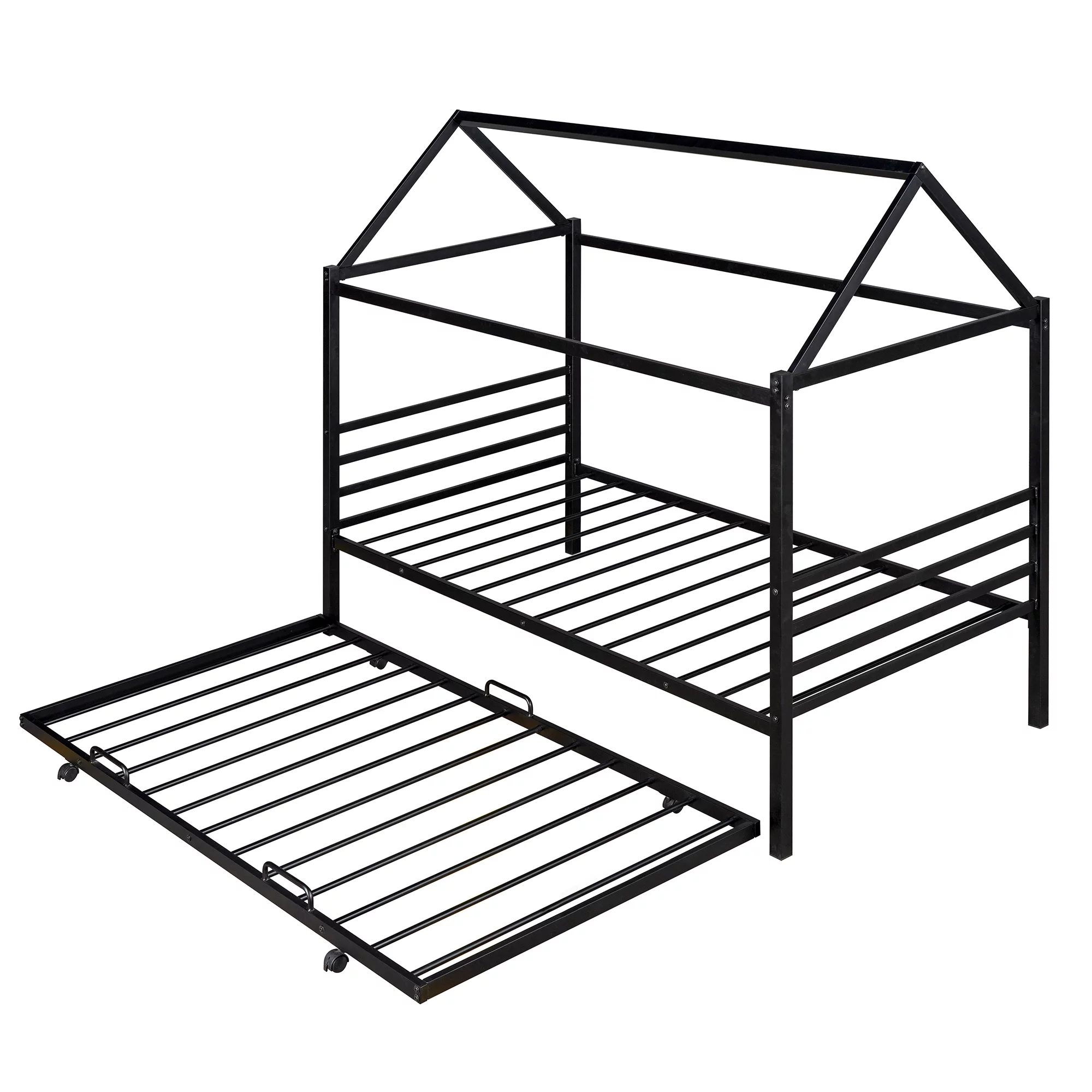 EUROCO Twin Metal House Platform Bed with Trundle for Child, Solid Metal Frame, No Box Spring Needed, Black