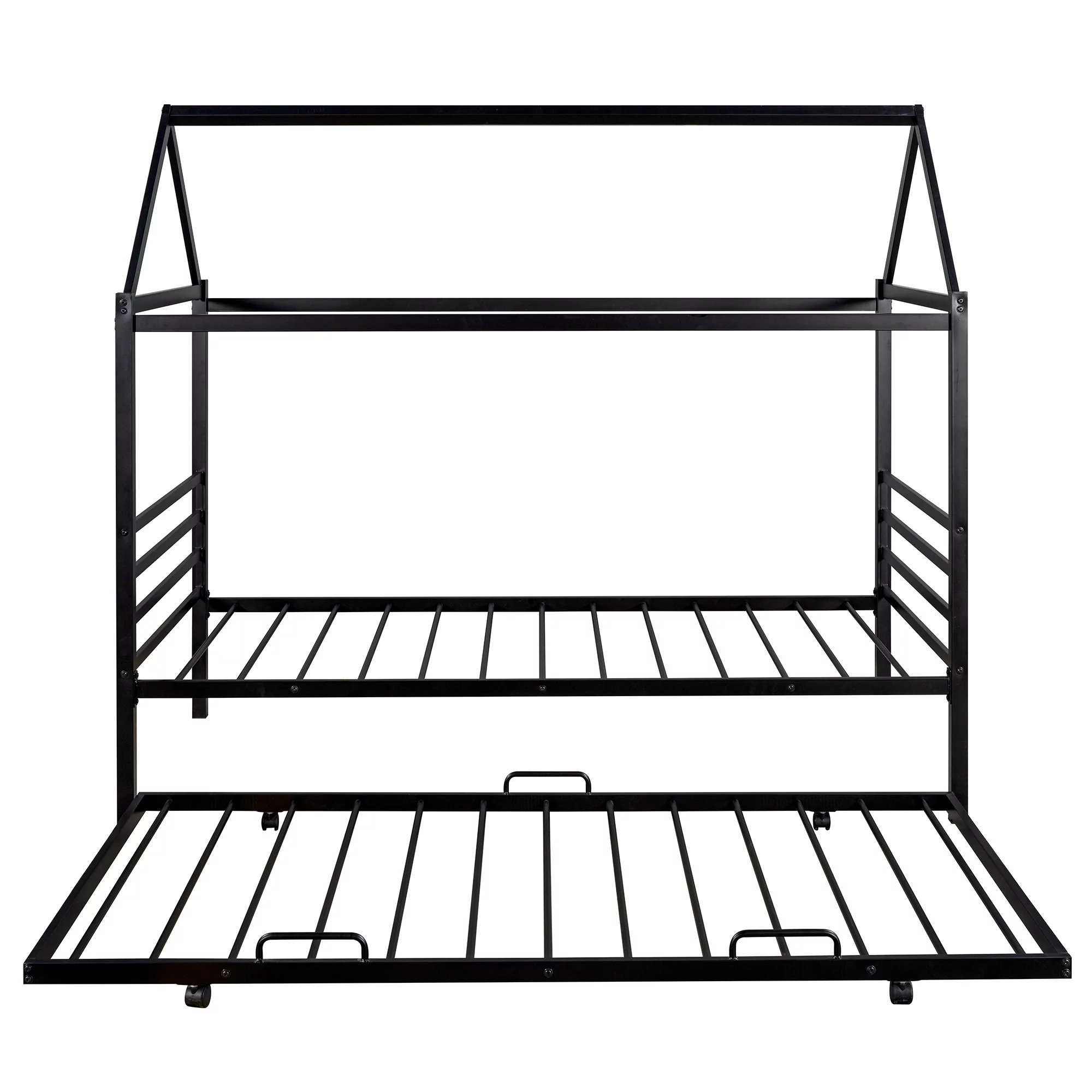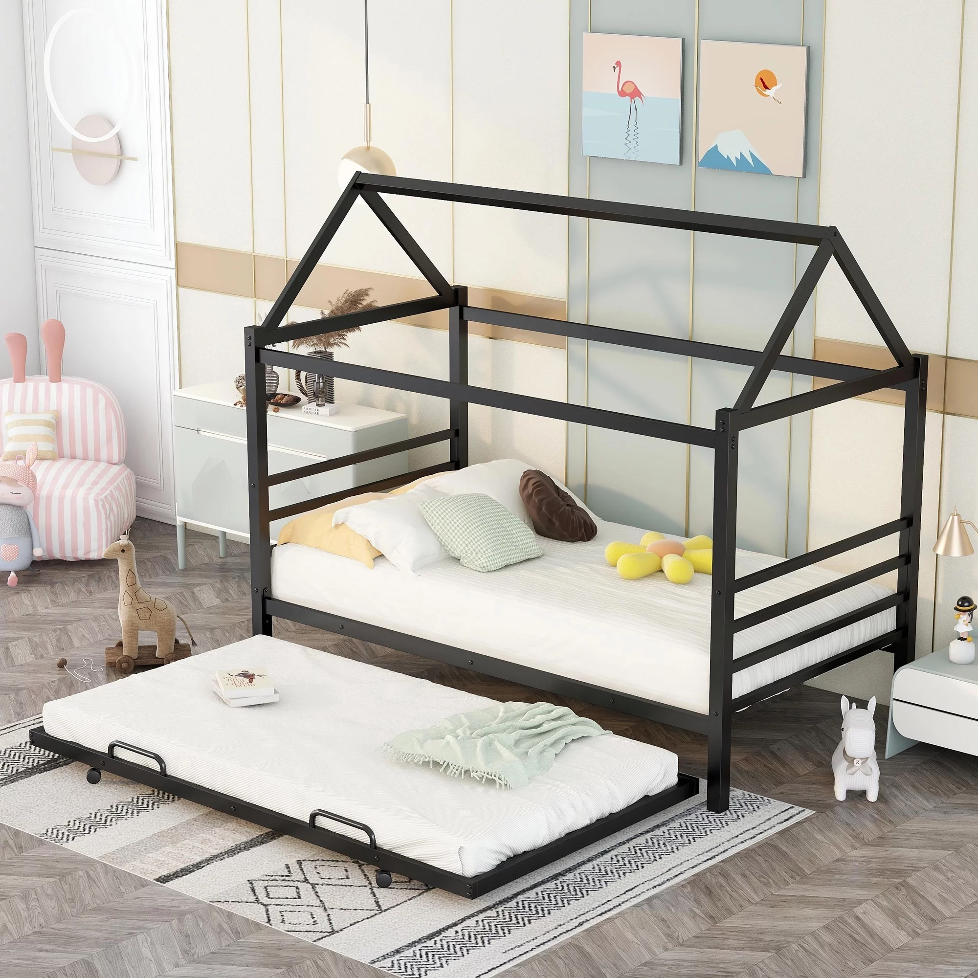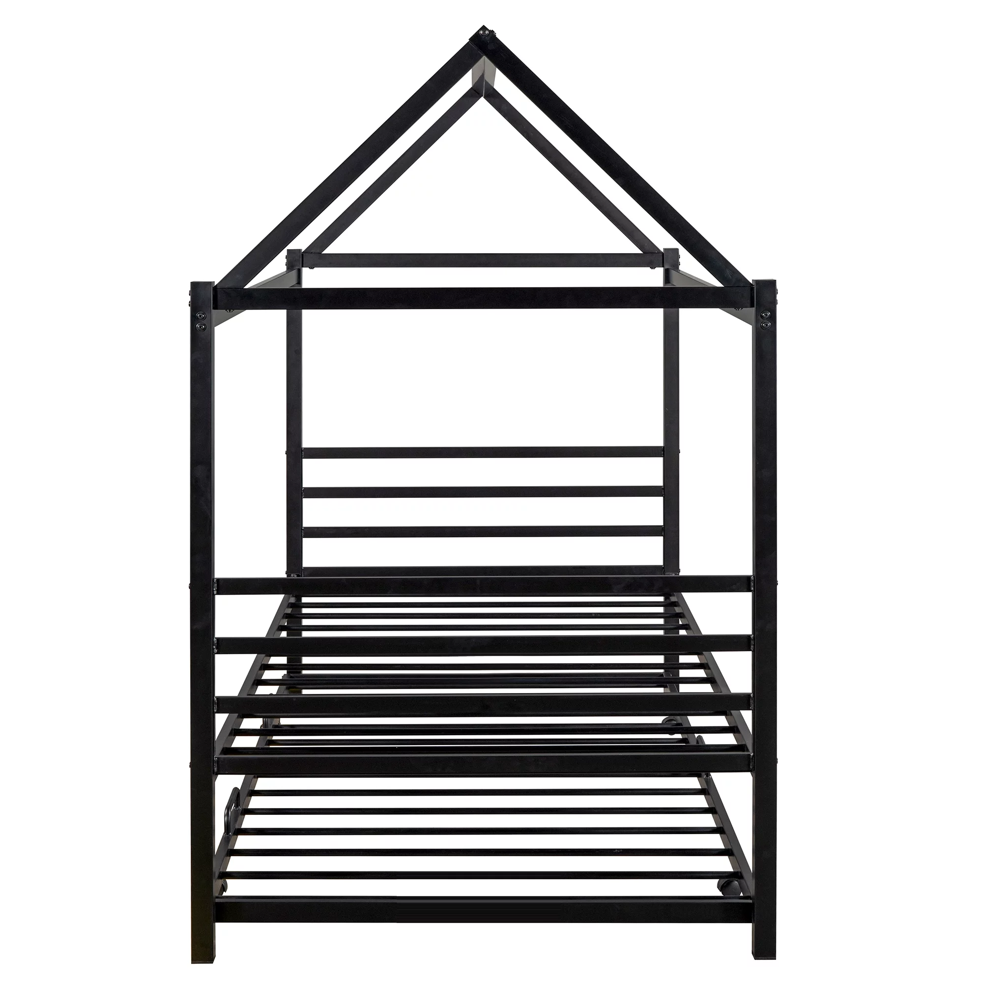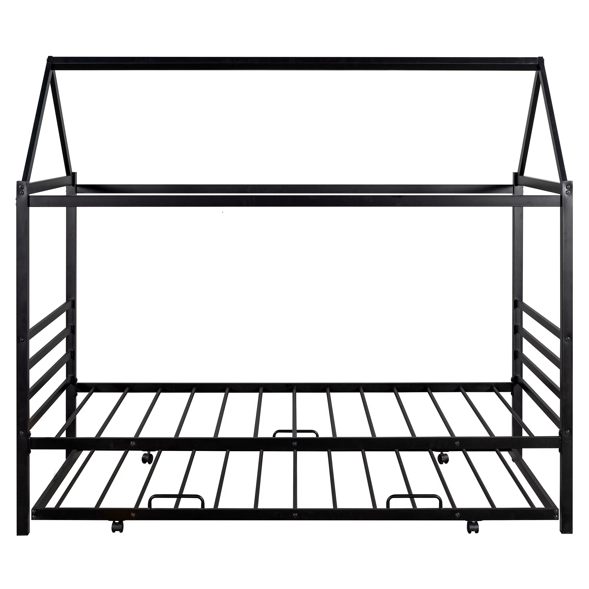 EUROCO Twin Metal House Platform Bed with Trundle for Child, Solid Metal Frame, No Box Spring Needed, Black
