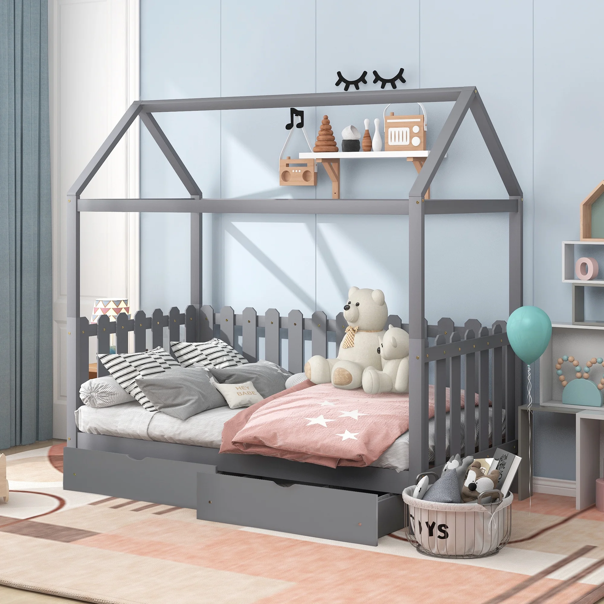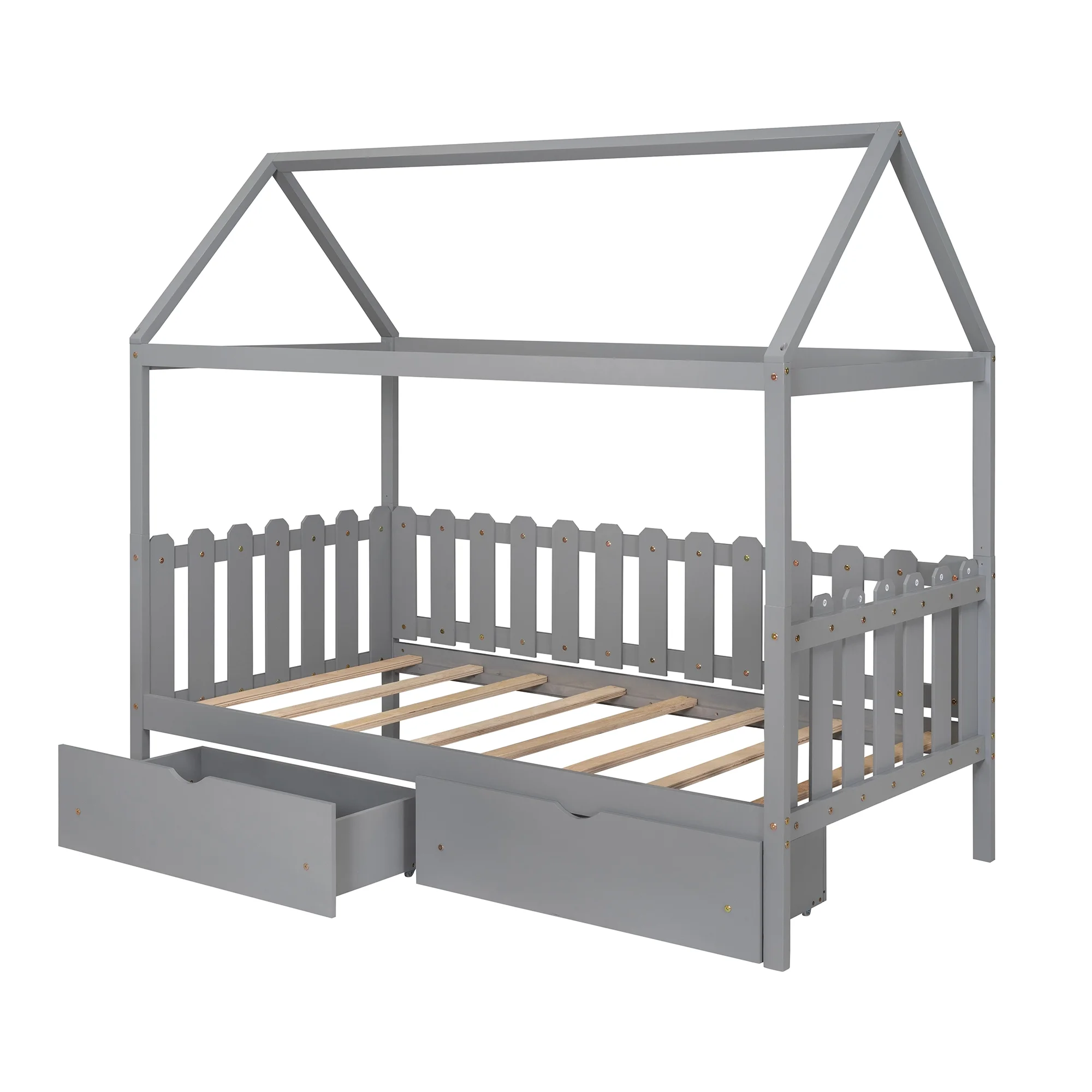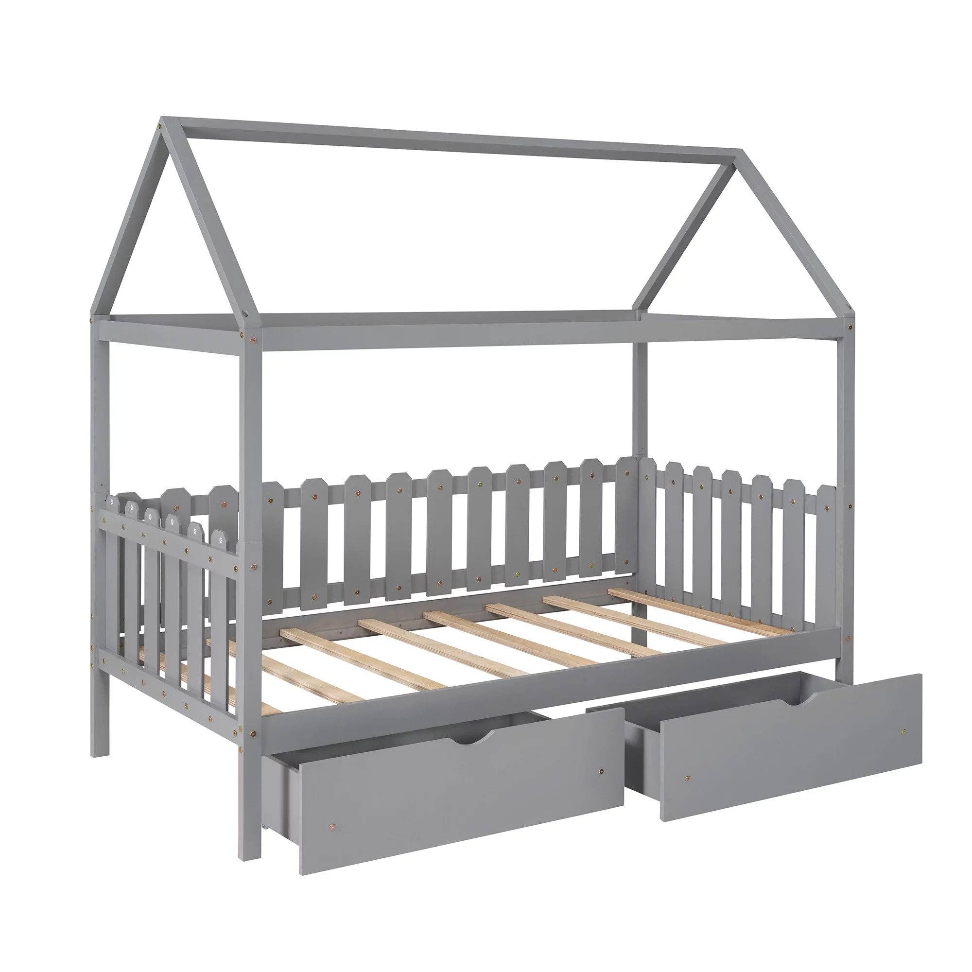 EUROCO Pine Wood Twin Size House Bed with Drawers for Kids, Rustic Style, Gray