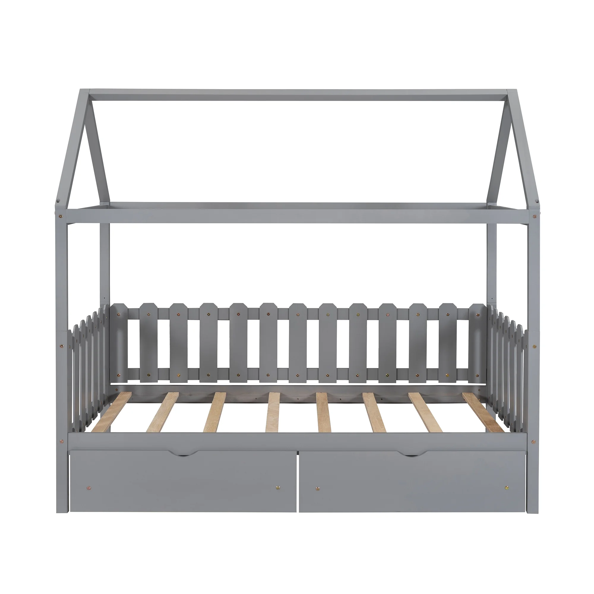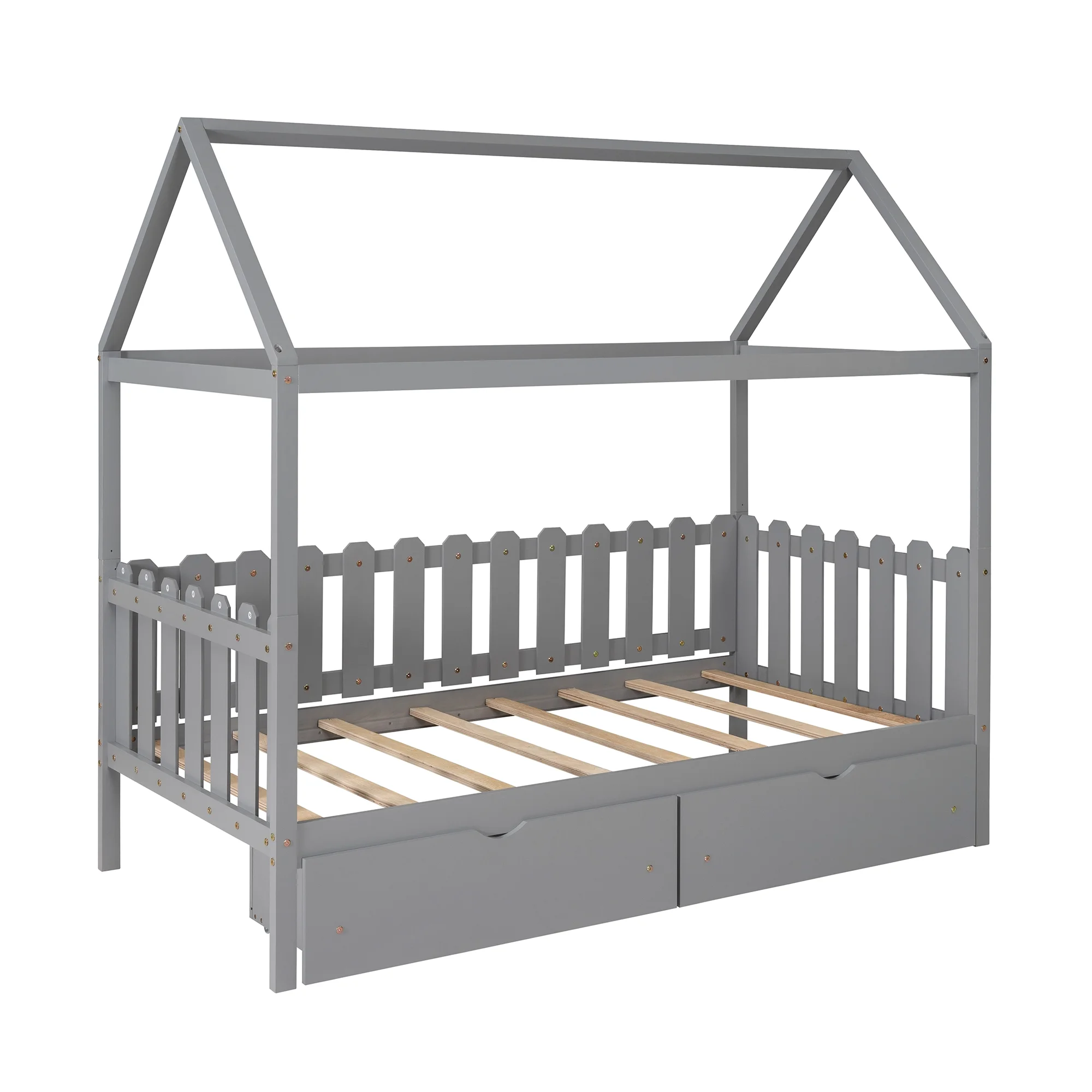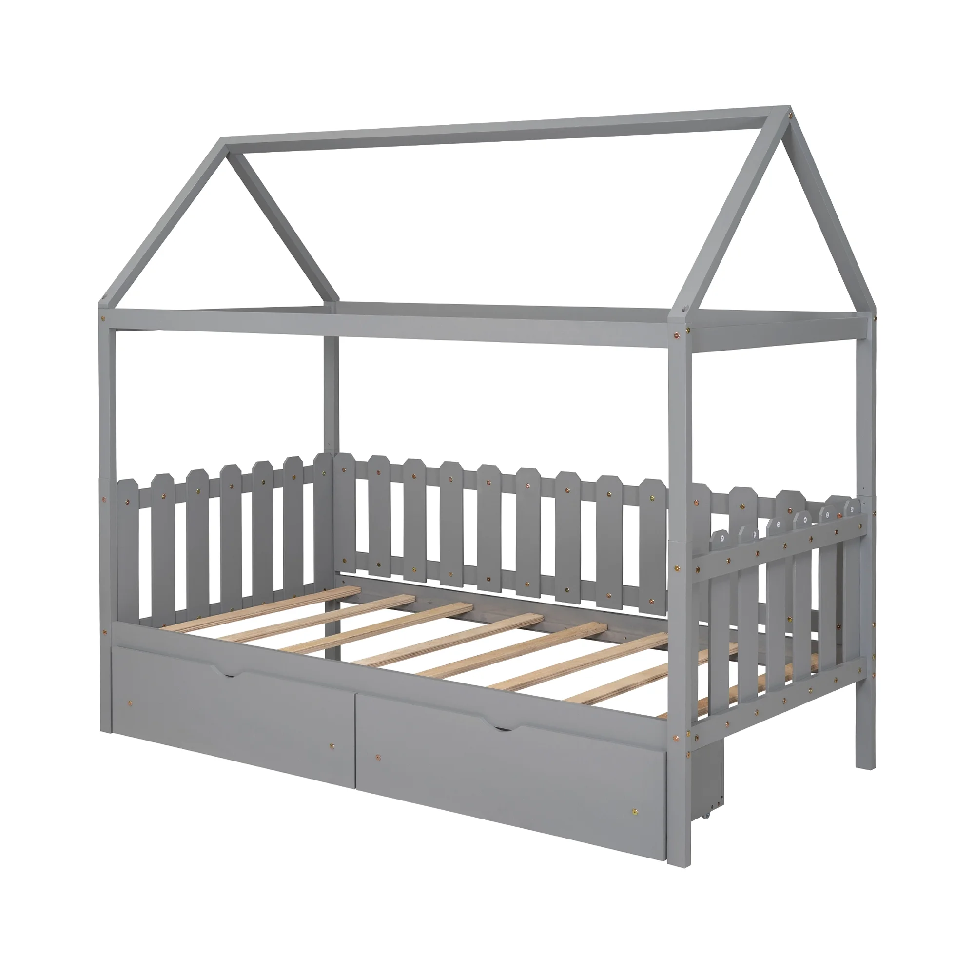 EUROCO Pine Wood Twin Size House Bed with Drawers for Kids, Rustic Style, Gray