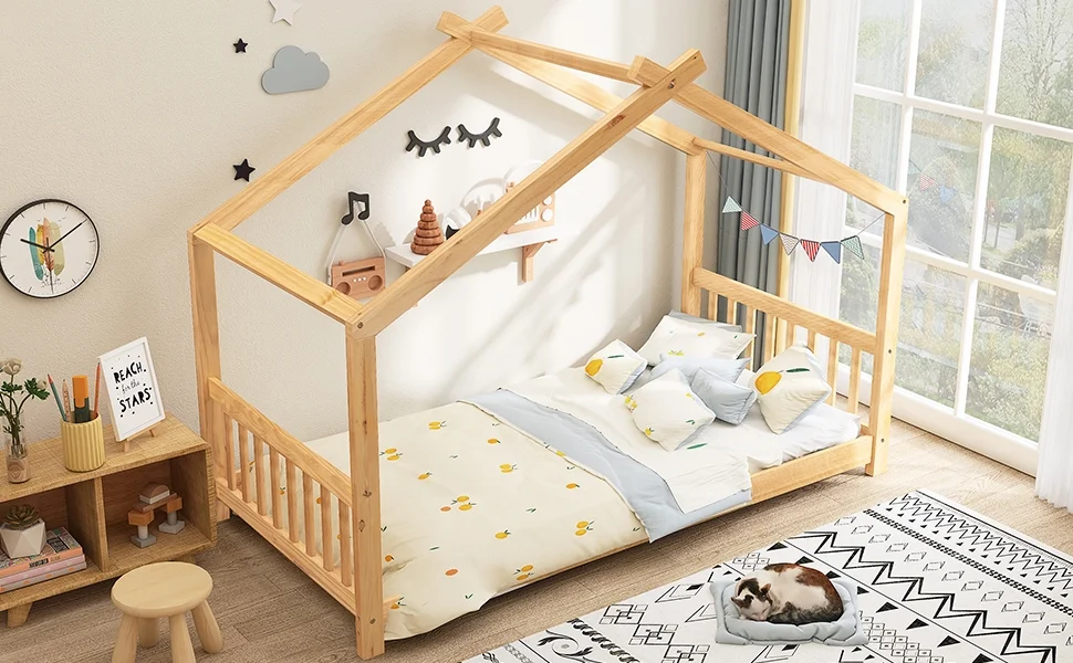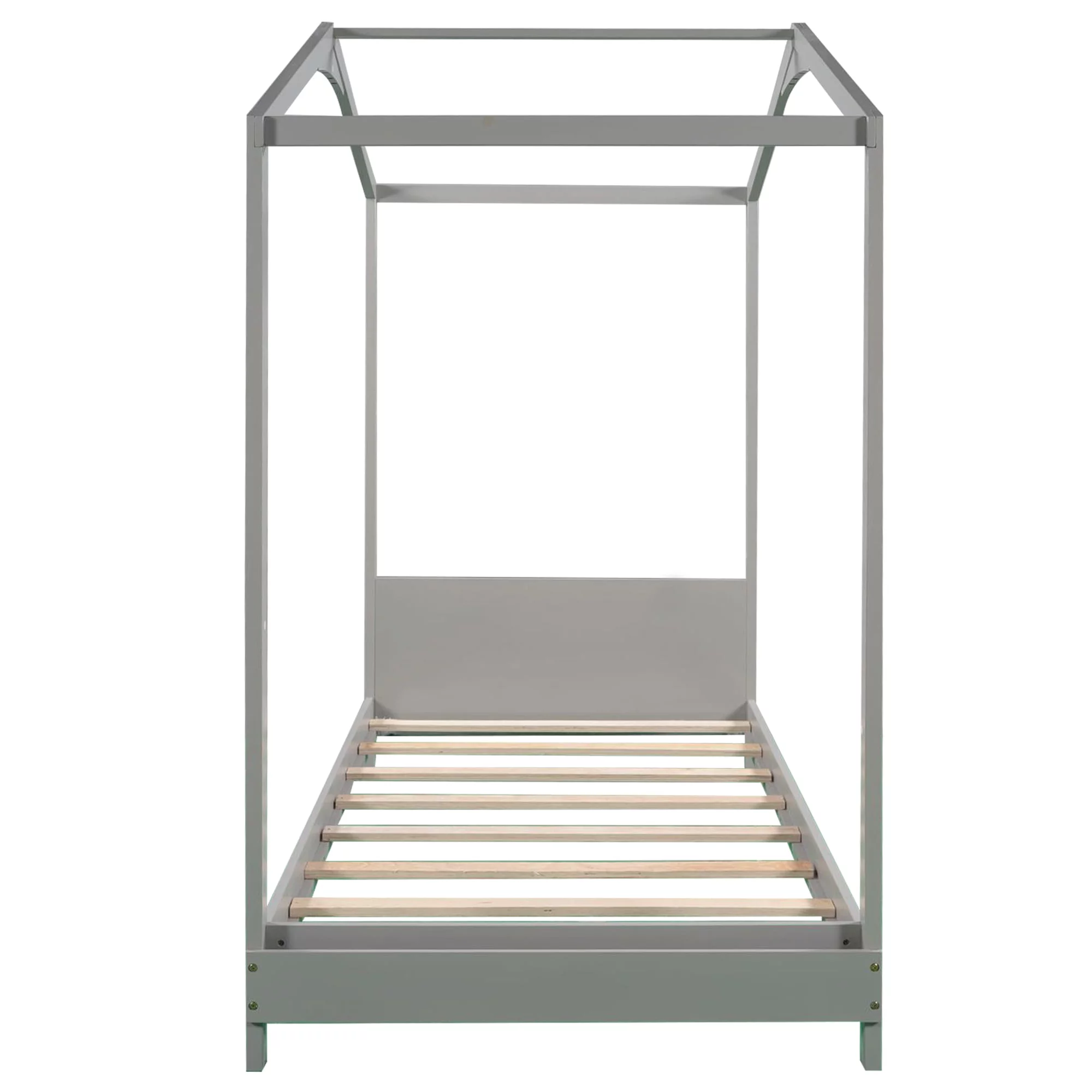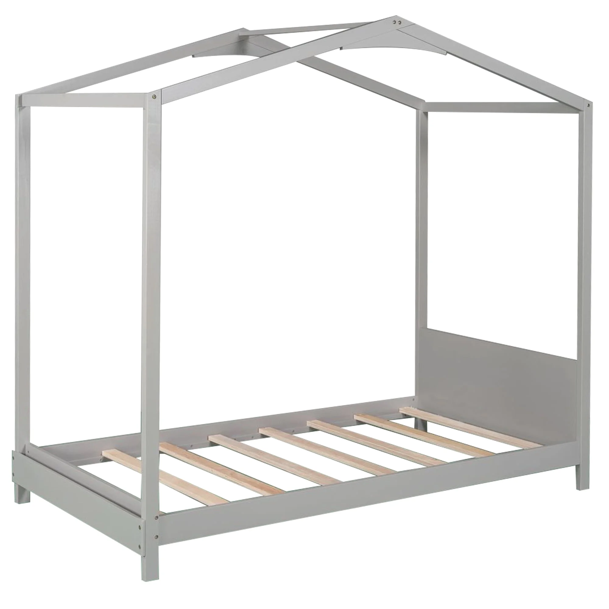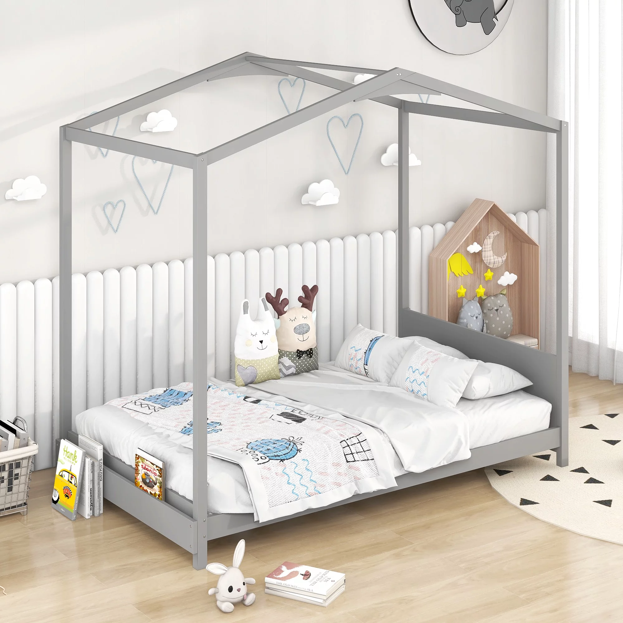 EUROCO Wood Twin Size House Bed with Roof and Book Shelf for Kids, Gray