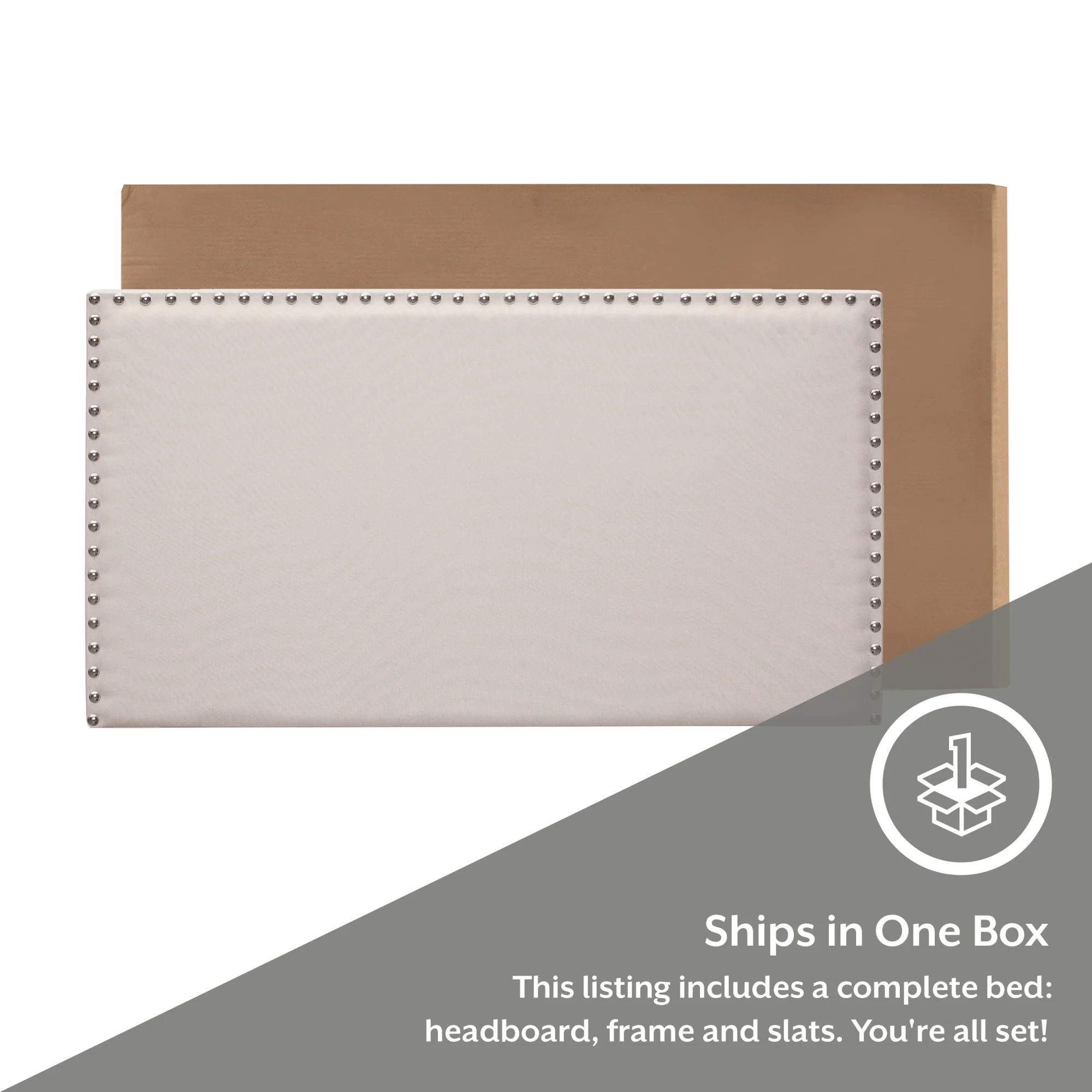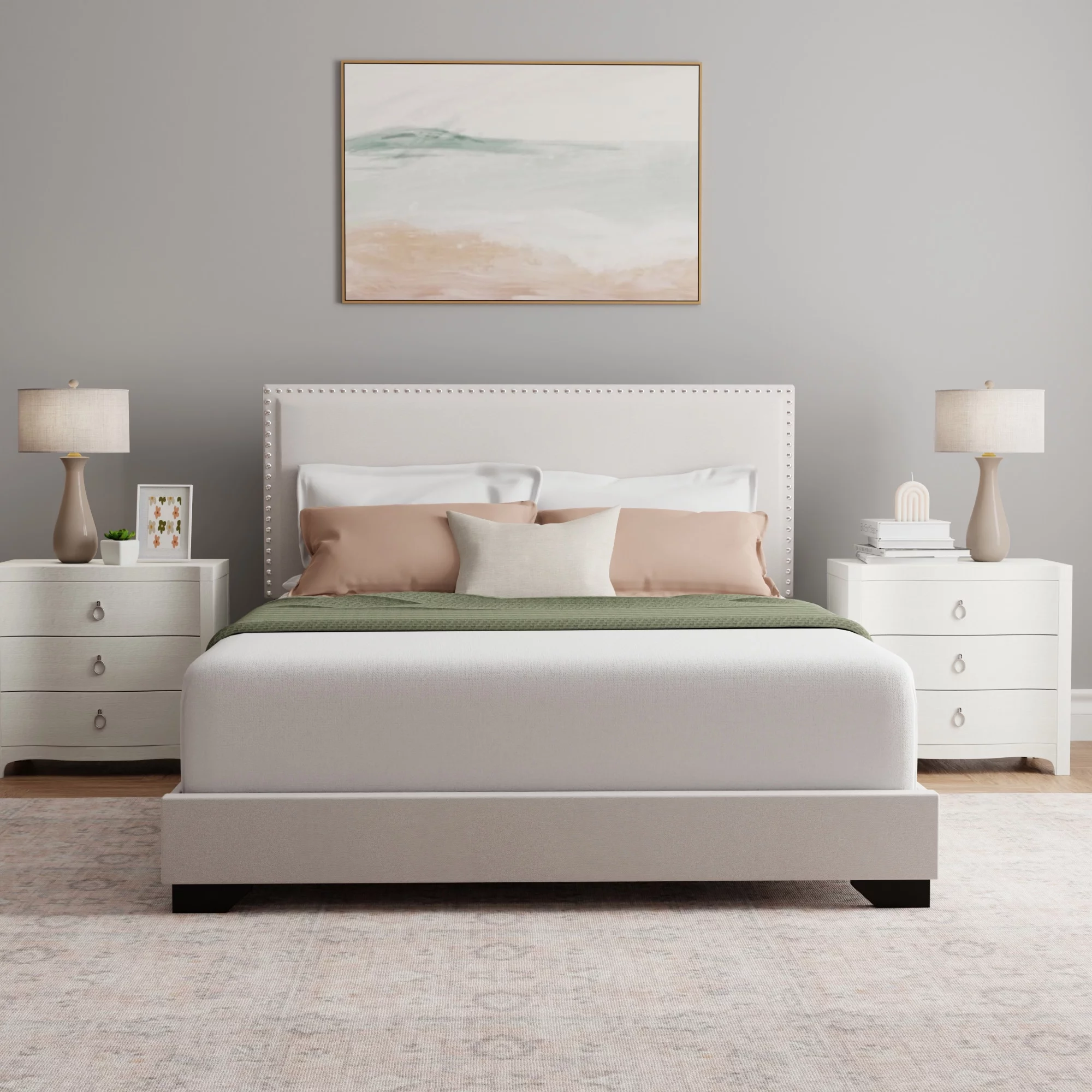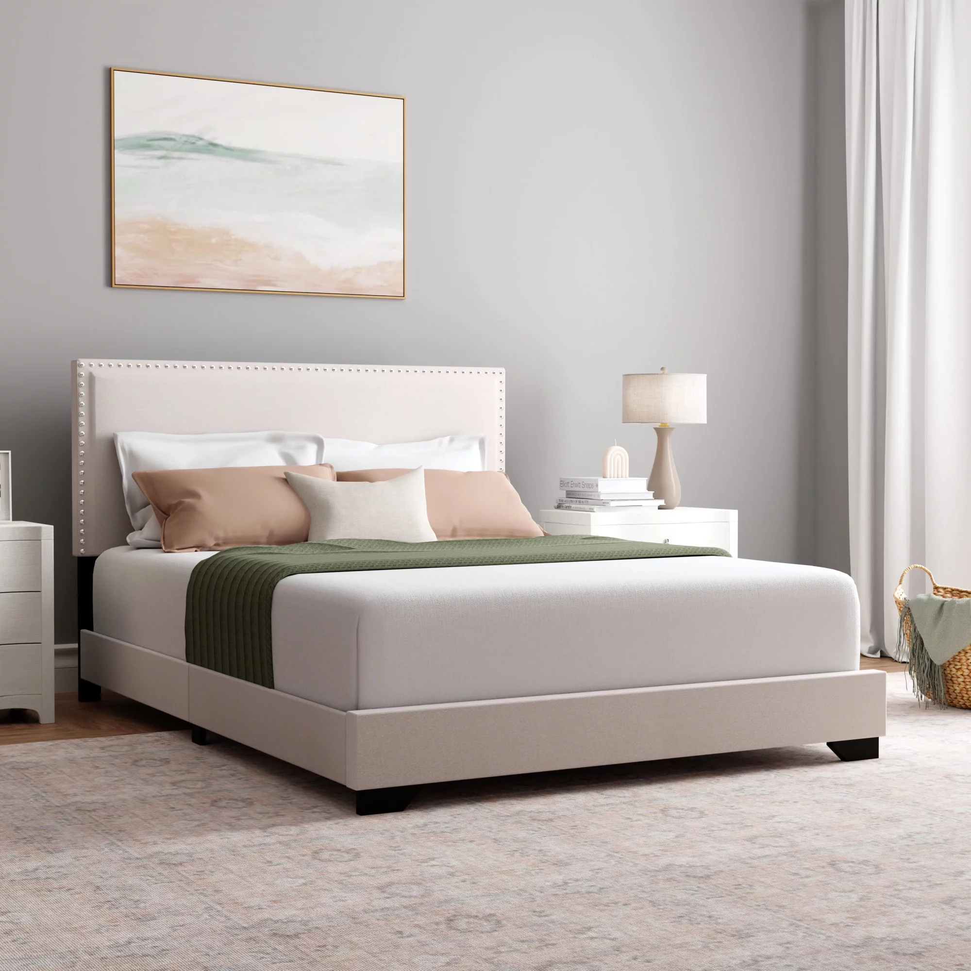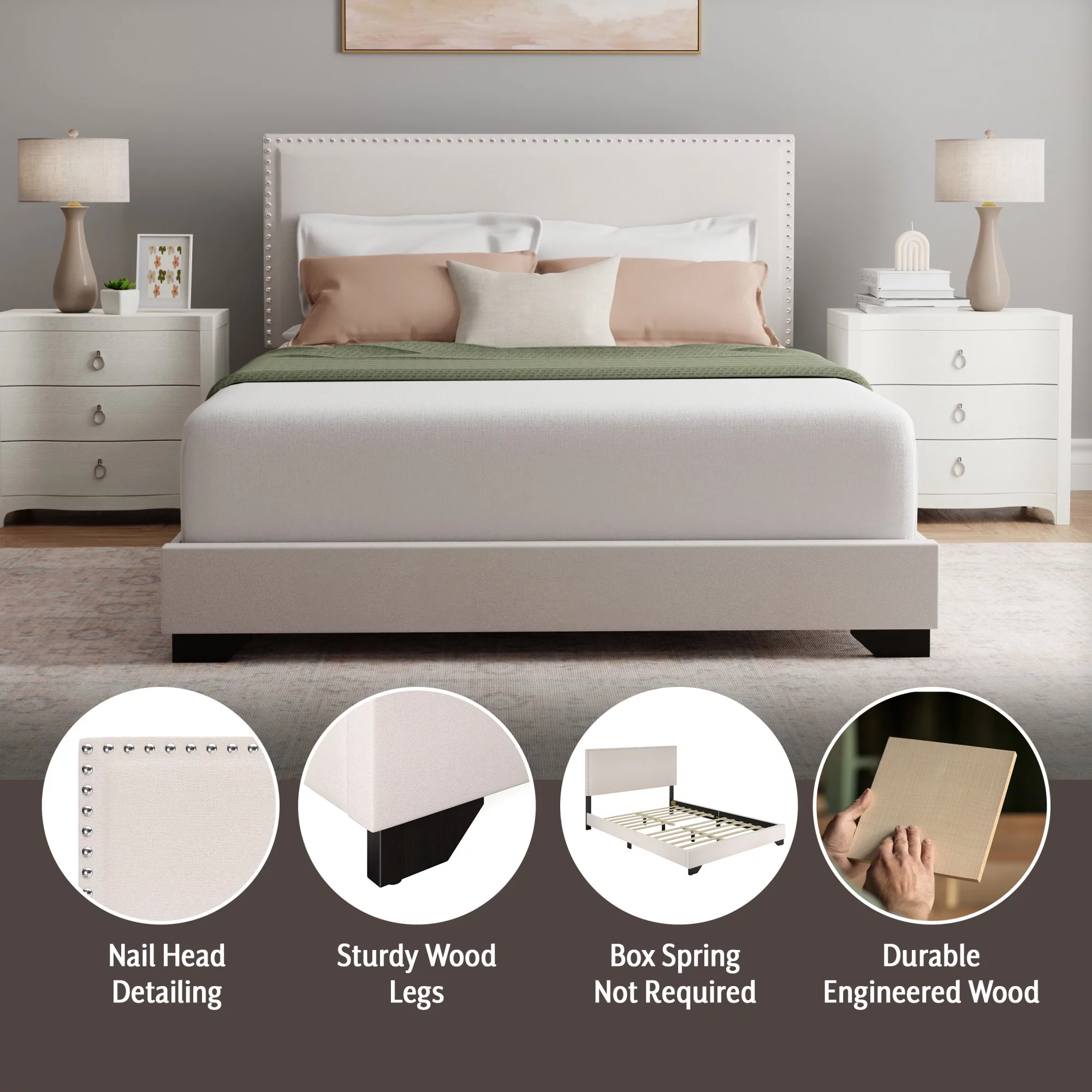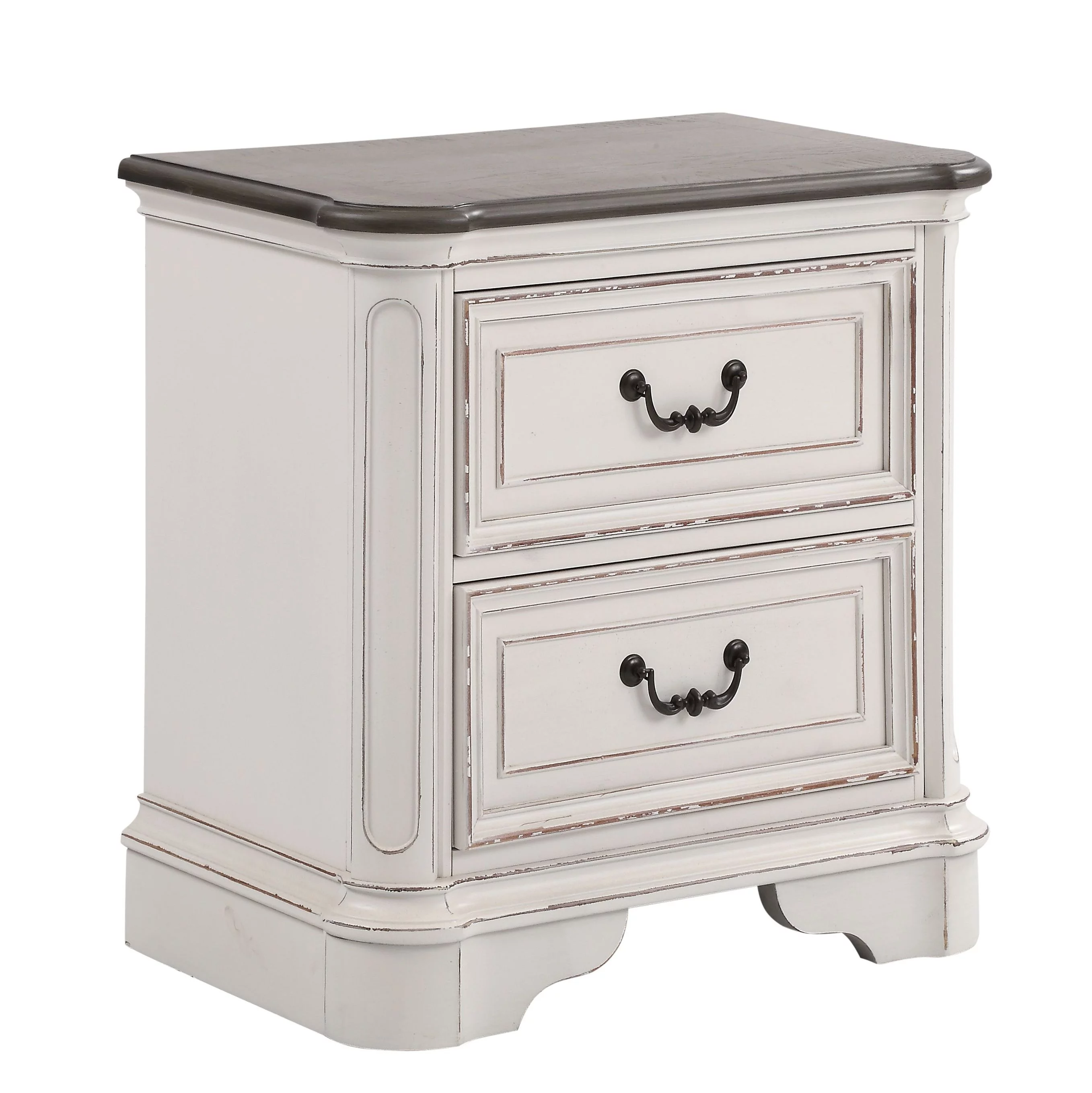 Laval Wood Bedroom Set, Upholstered King Bed, Dresser, Mirror, Nightstand, Chest, Antique White and Oak