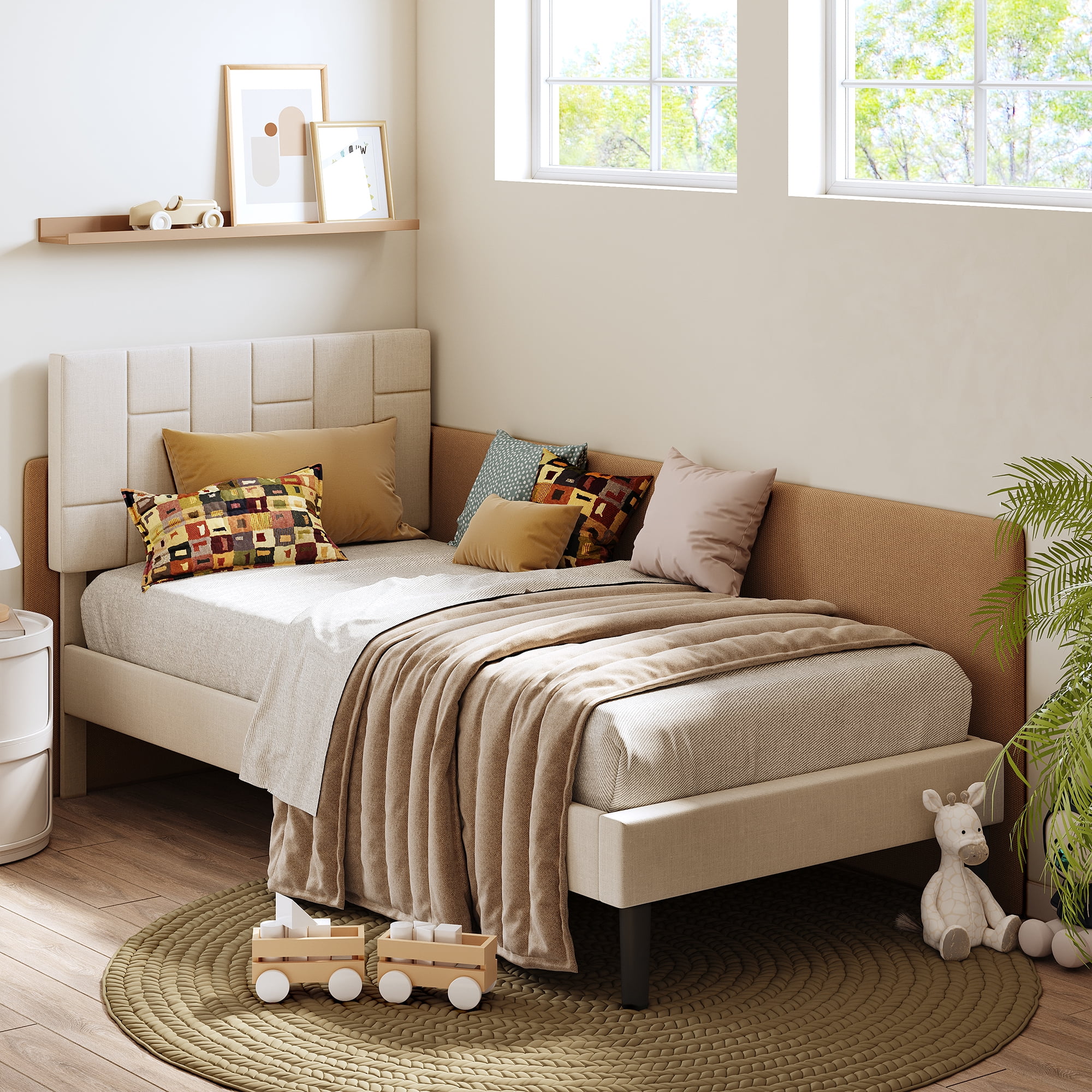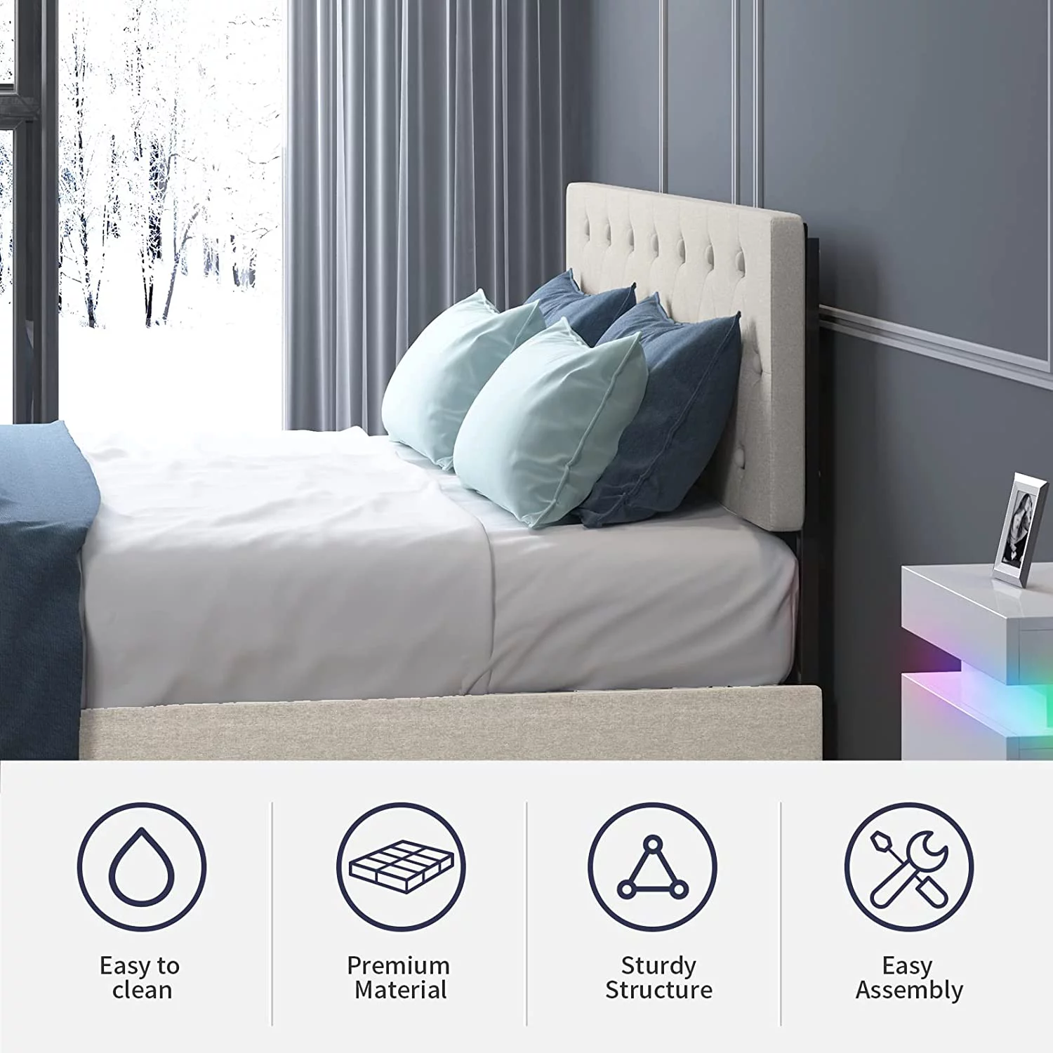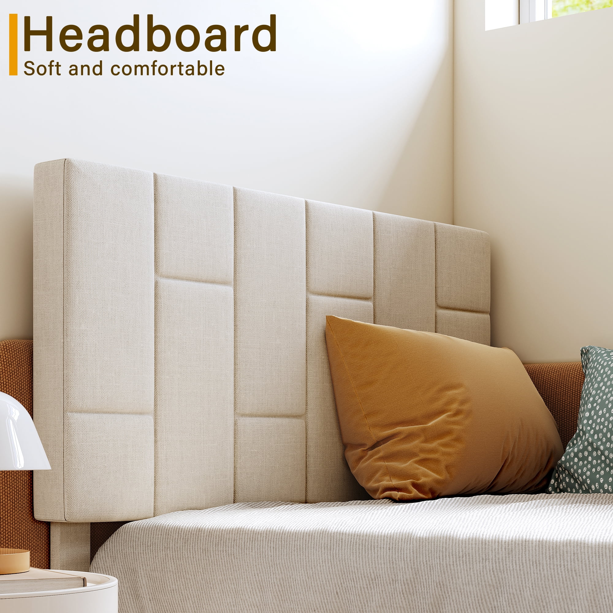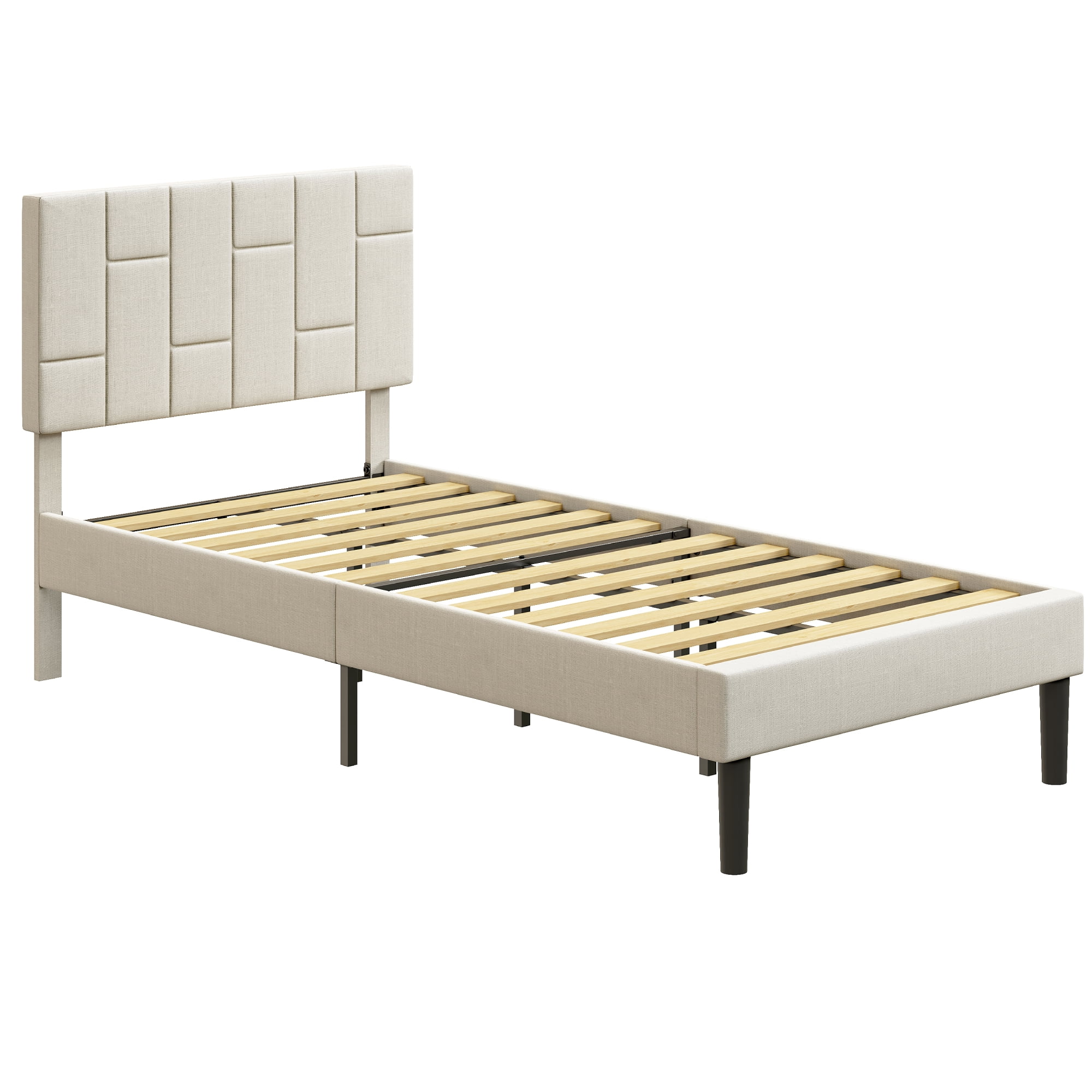 LIKIMIO Twin Platform Bed Frame with Upholstered Headboard and Wood Slat Support, Beige