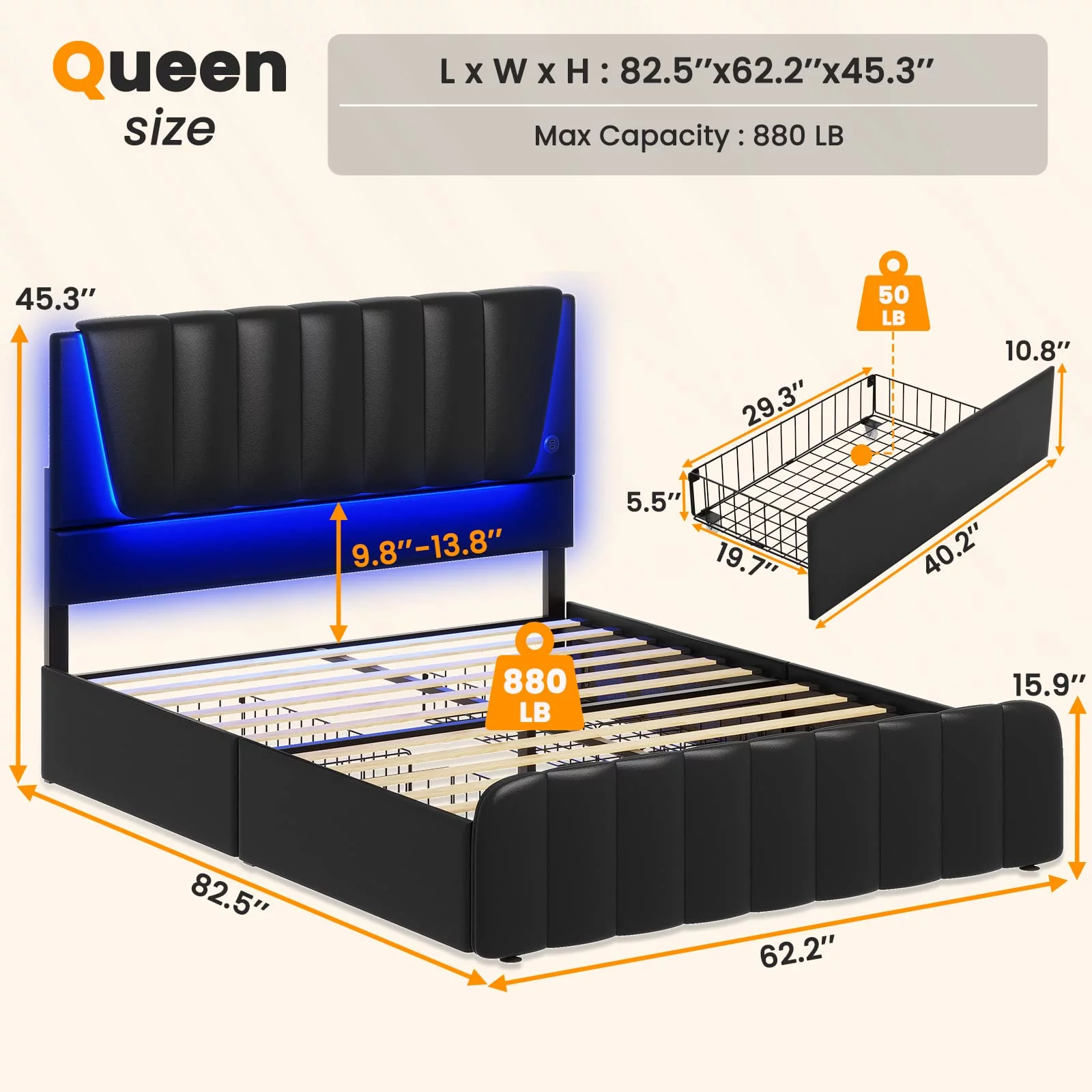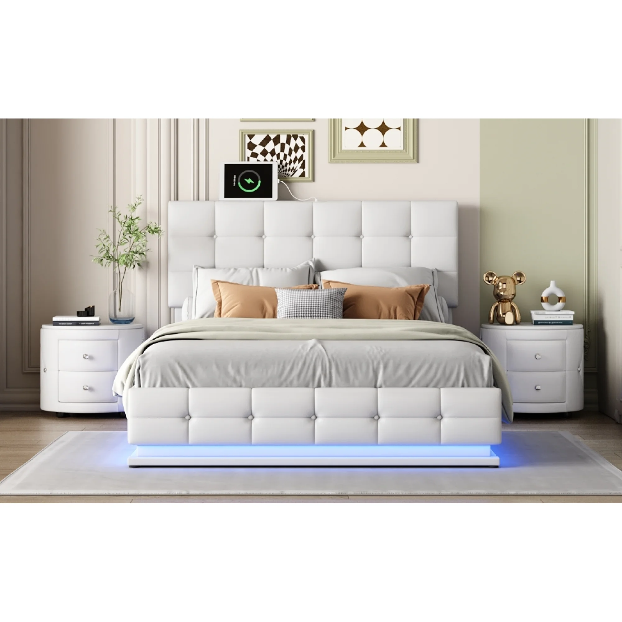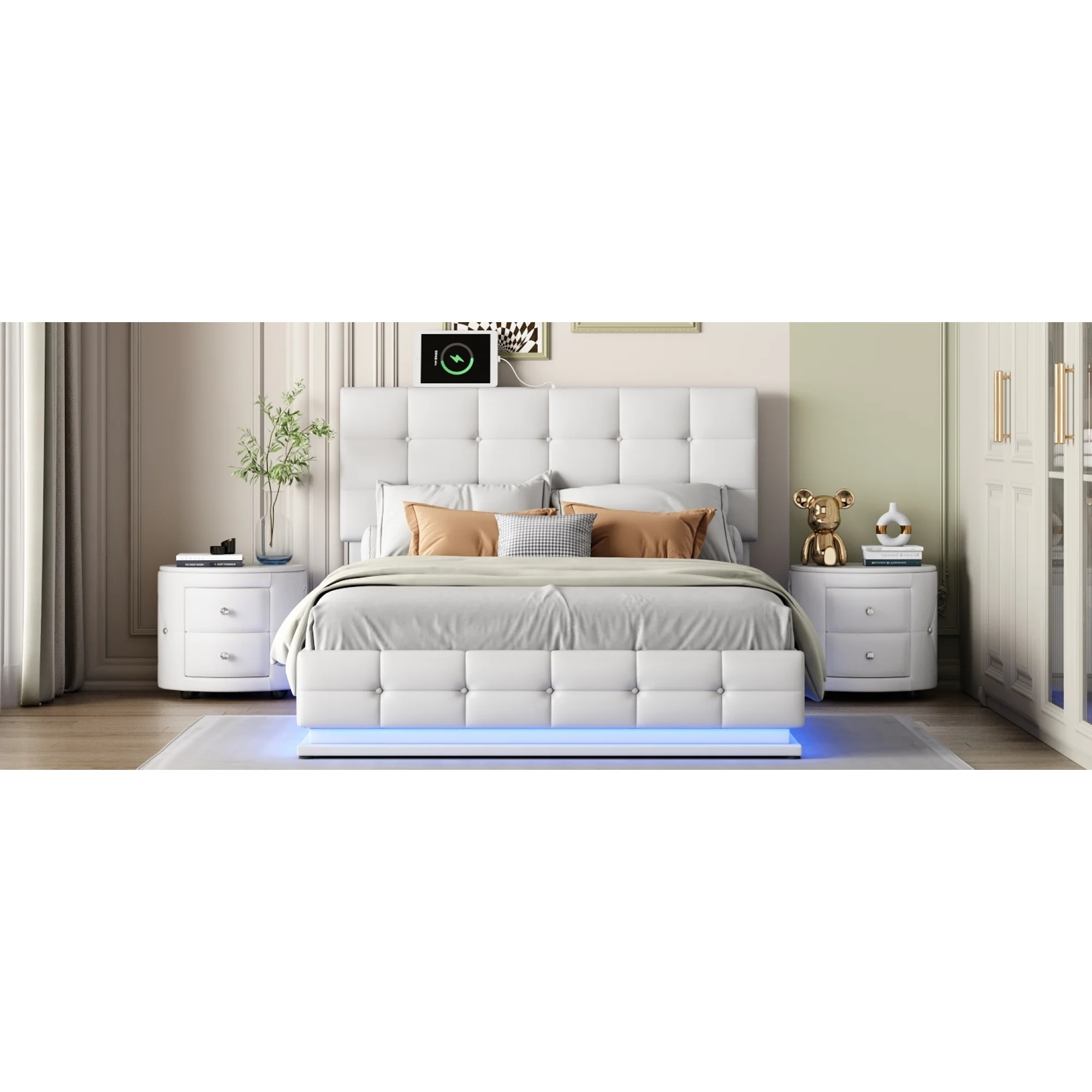 "Queen-Size Bedroom Set with LED-Lit Upholstered Bed, Hydraulic Storage, USB Charging, and Crystal-Decorated Nightstands"