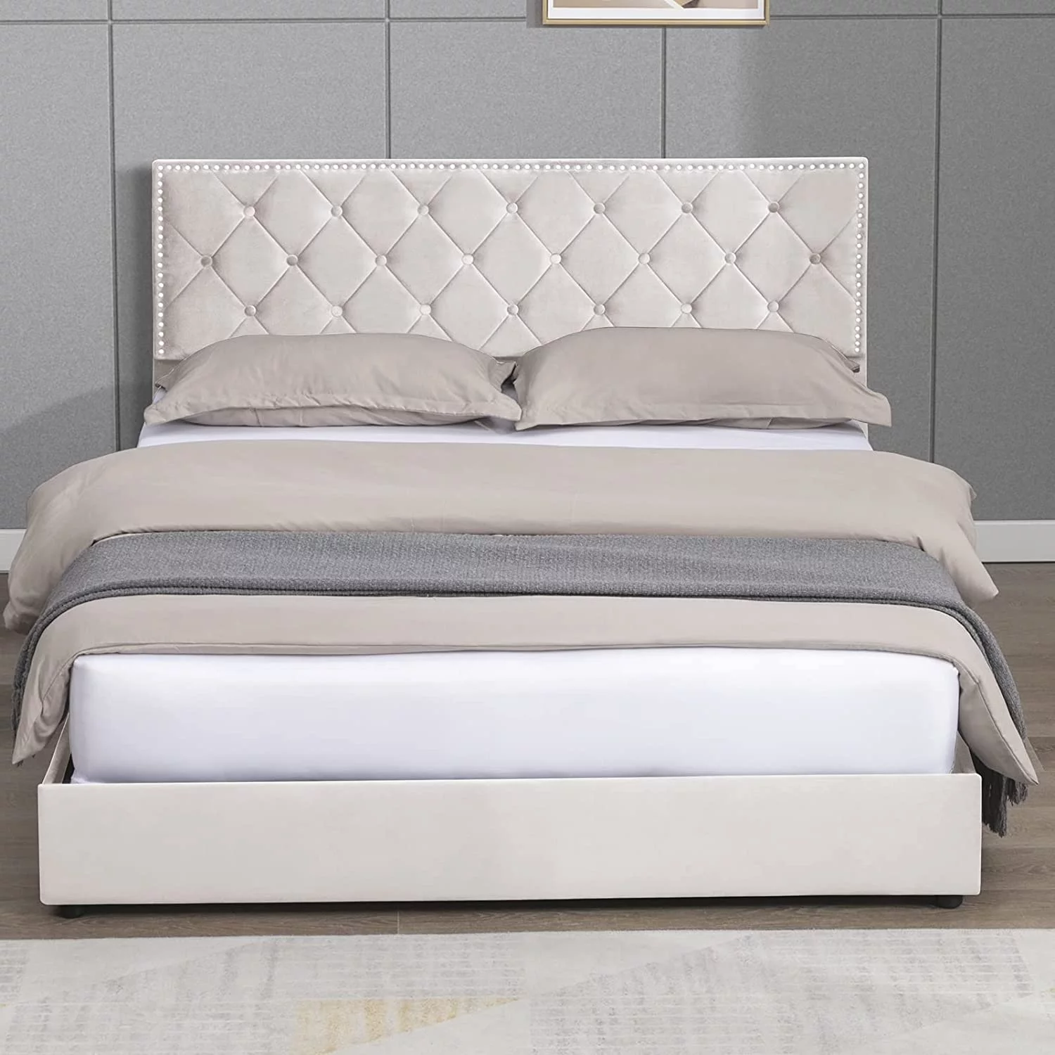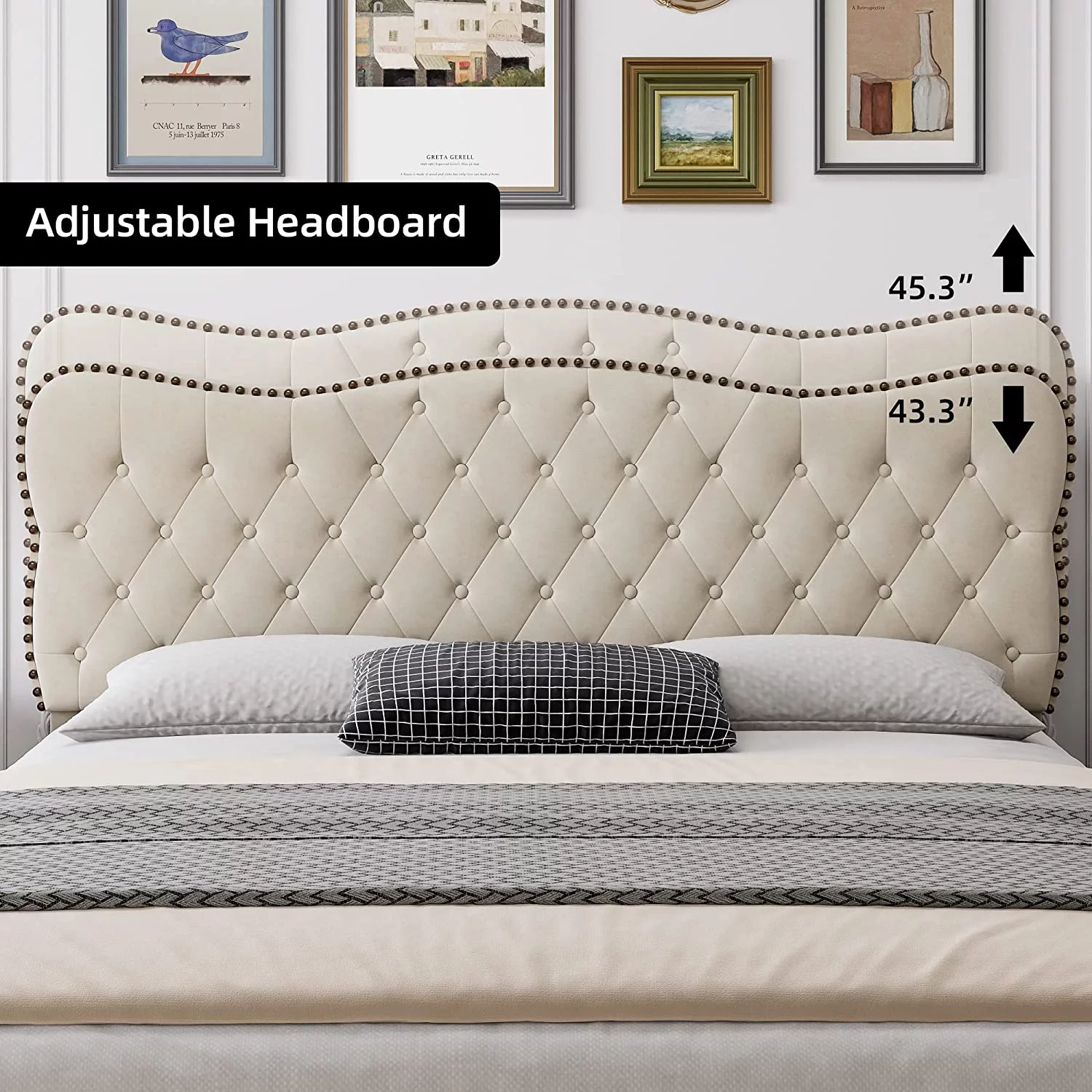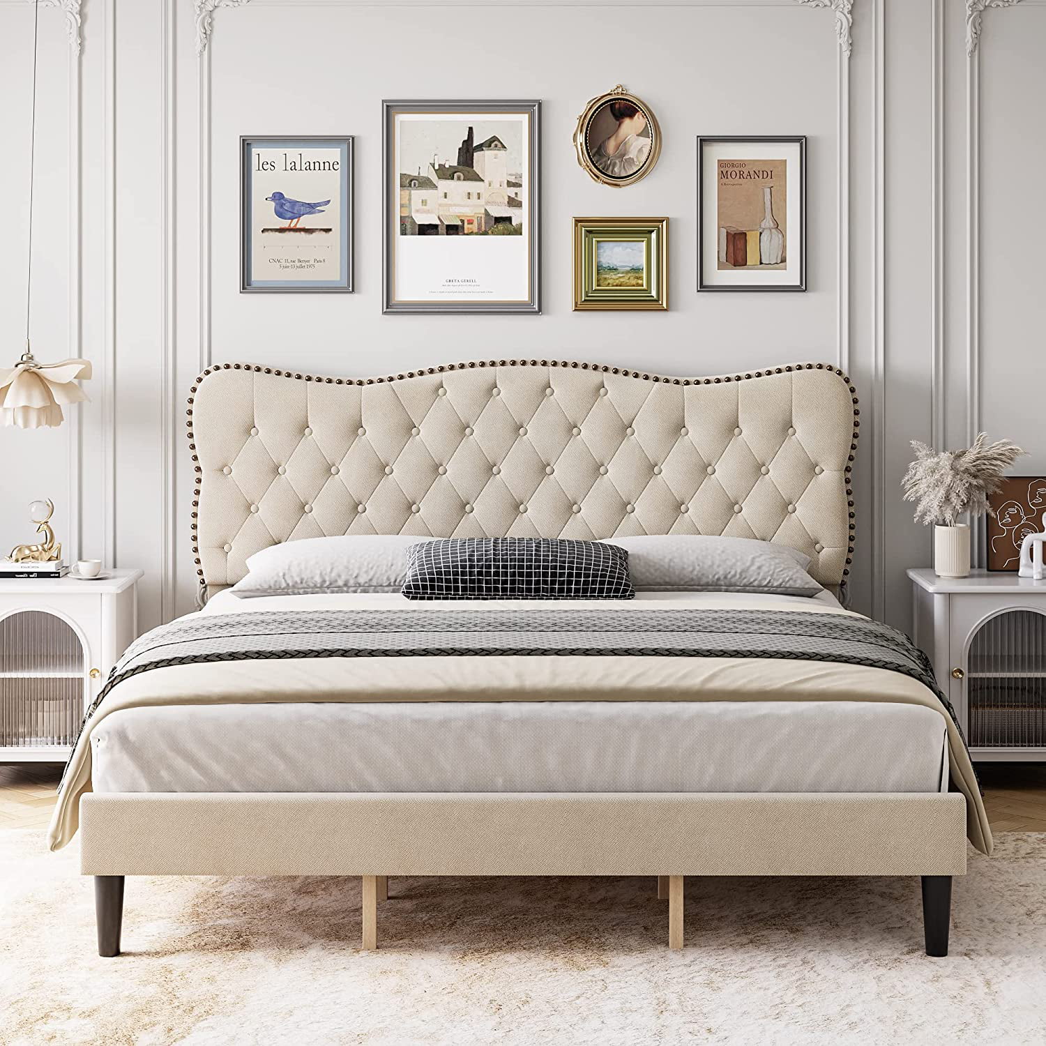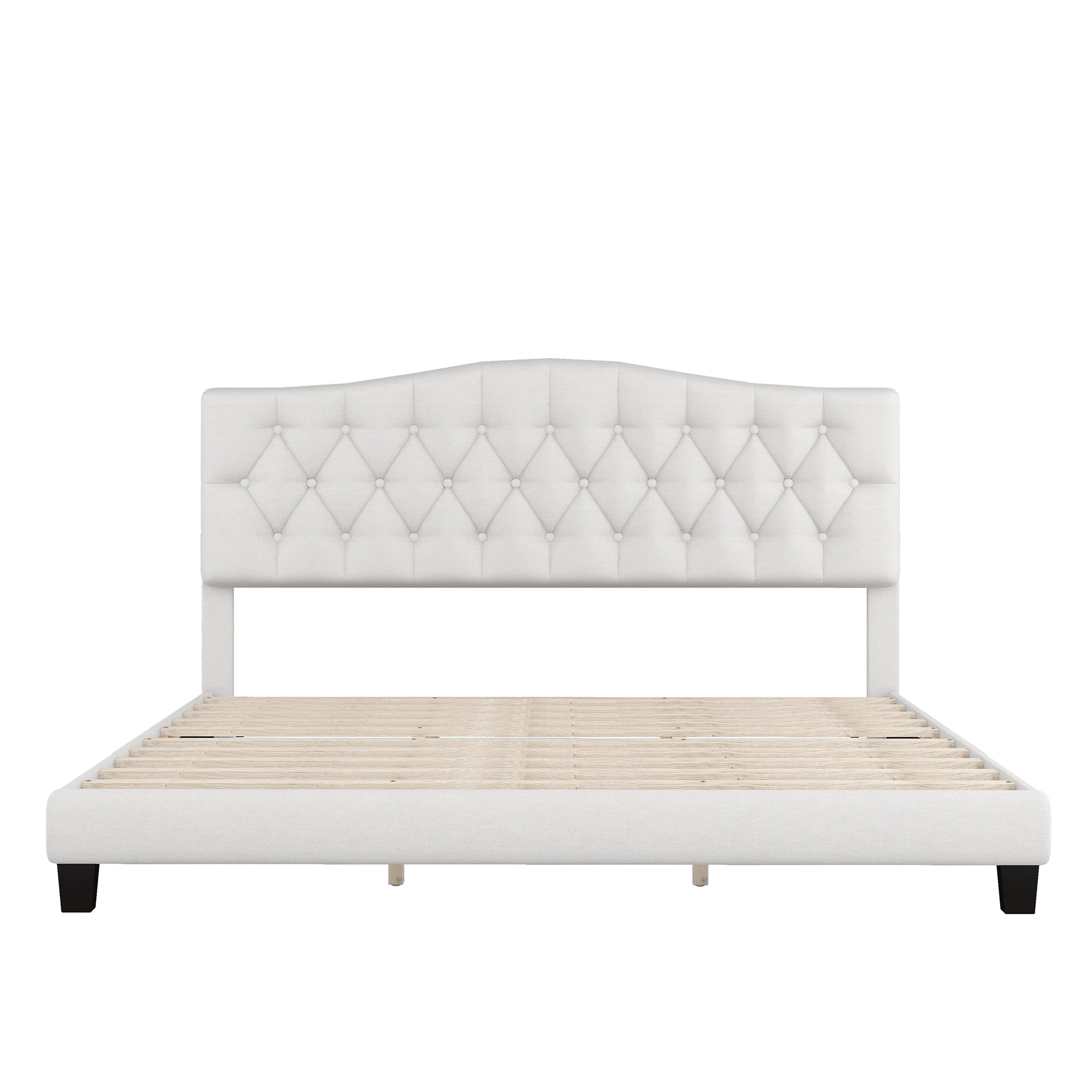 Upholstered Platform Bed with Saddle Curved Headboard and Diamond Tufted Details, King, Beige