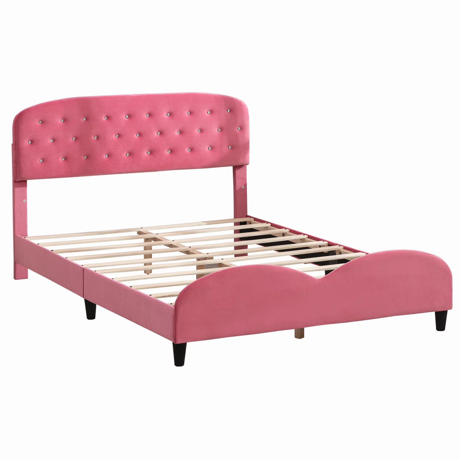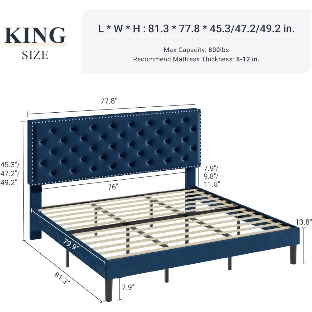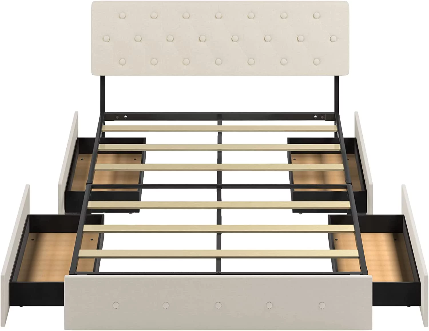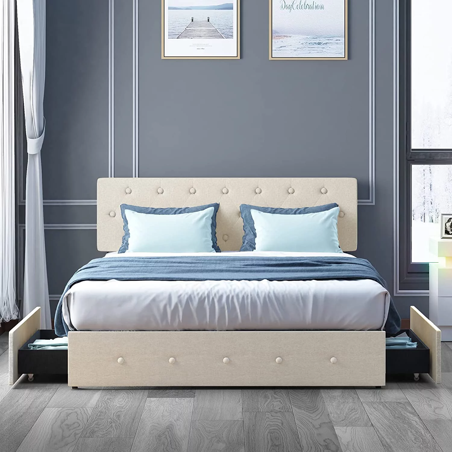 Upholstered Platform Bed with Saddle Curved Headboard and Diamond Tufted Details, King, Beige