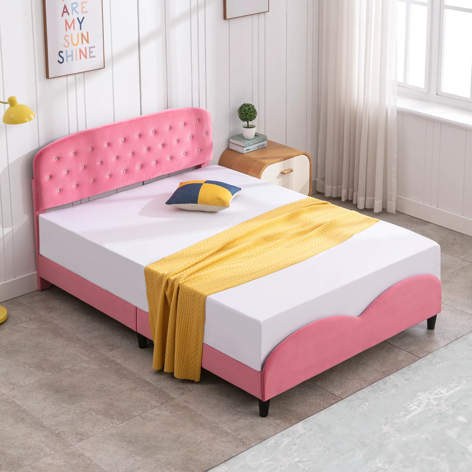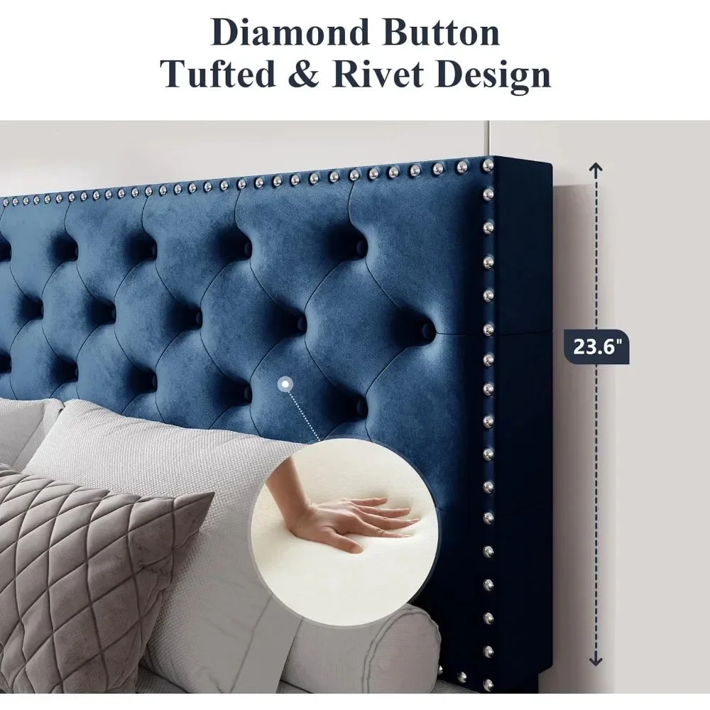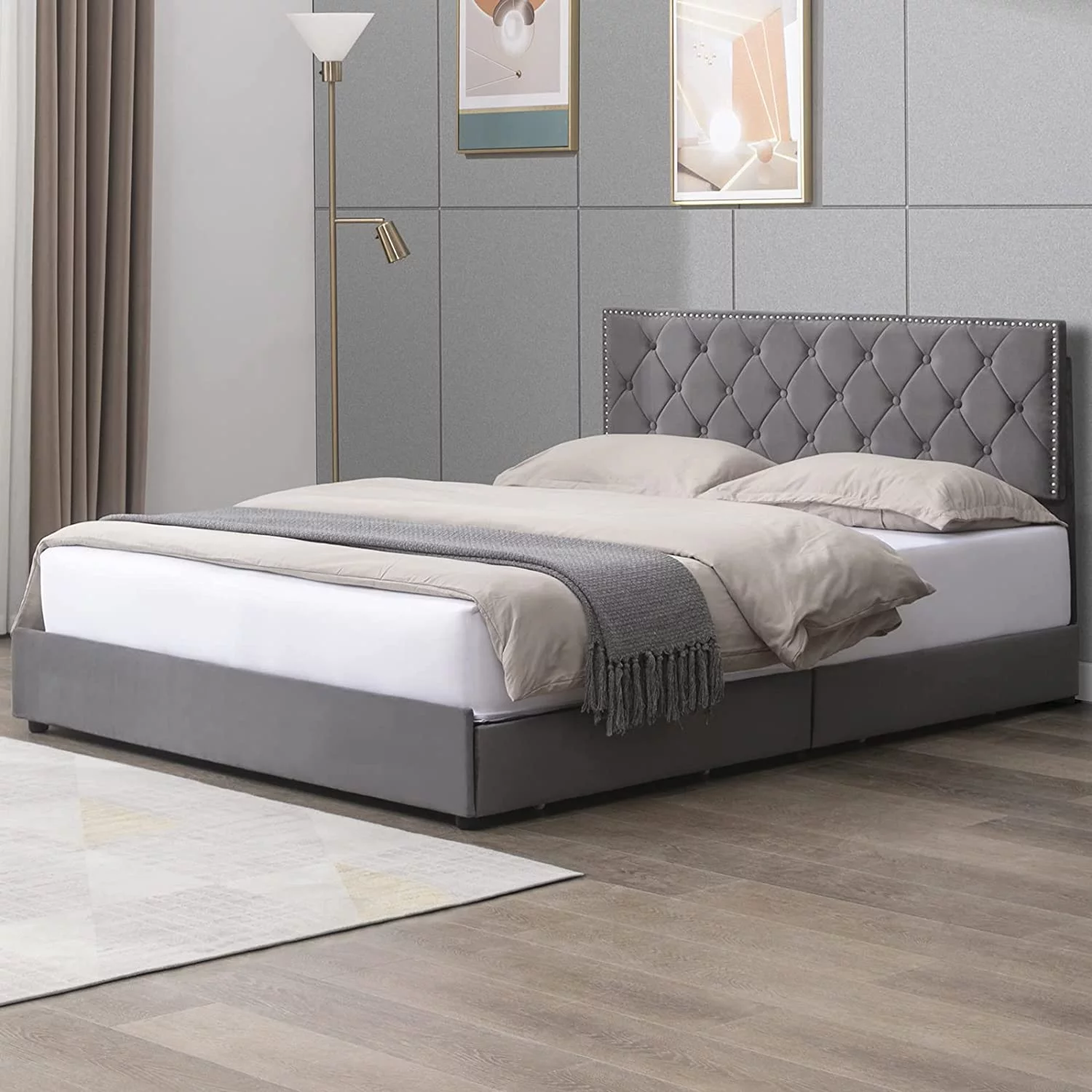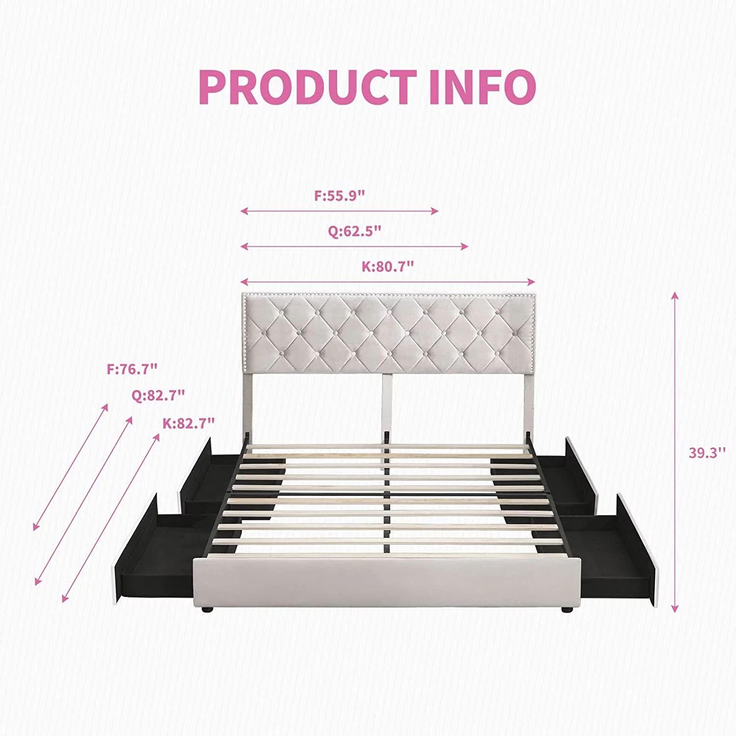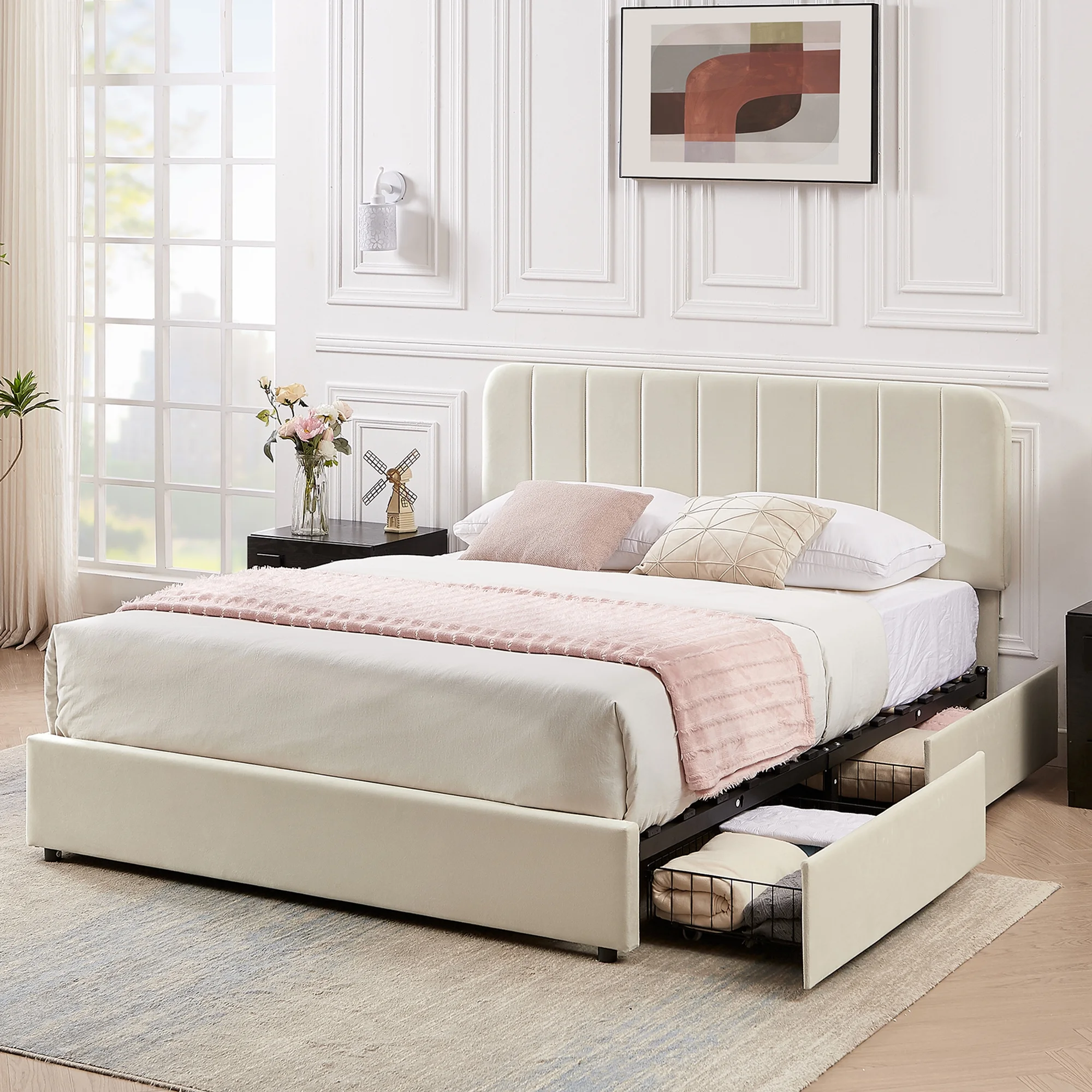 Upholstered Platform Bed with Saddle Curved Headboard and Diamond Tufted Details, King, Beige