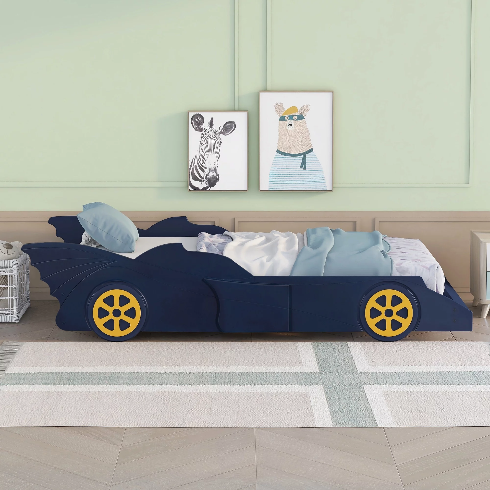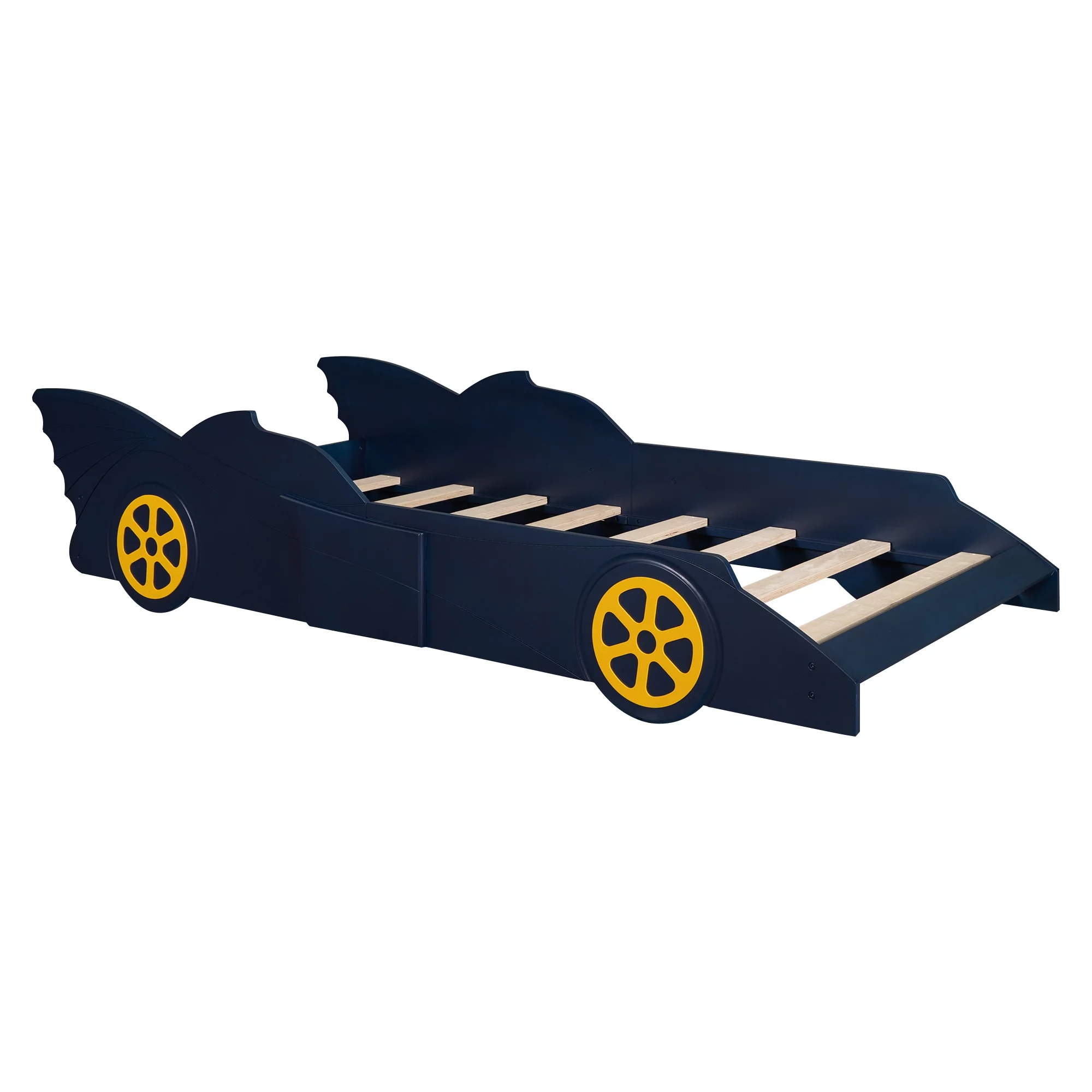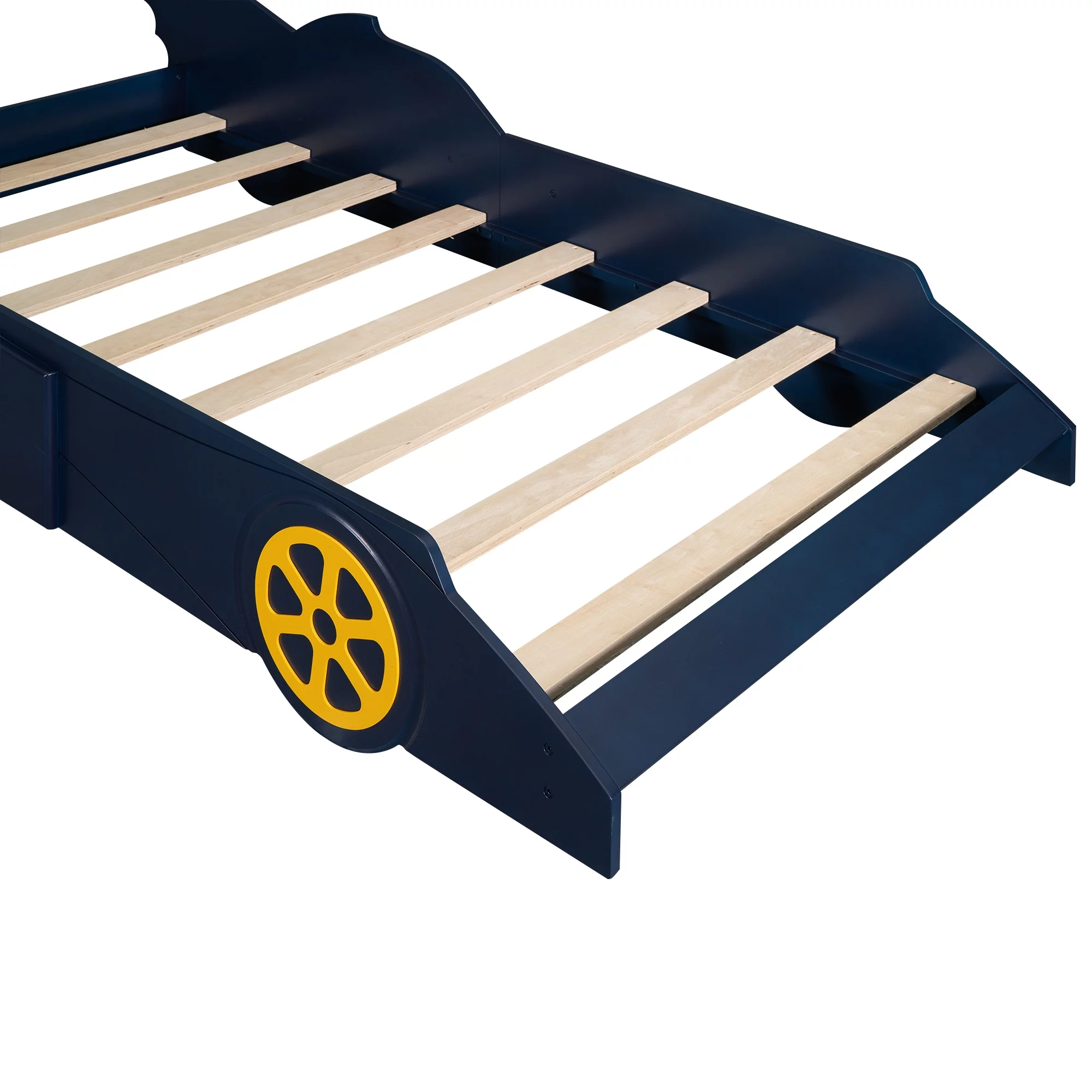 Euroco Wood Race Car-Shaped Twin Size Platform Bed for Kids’ Bedroom, Blue & Yellow
