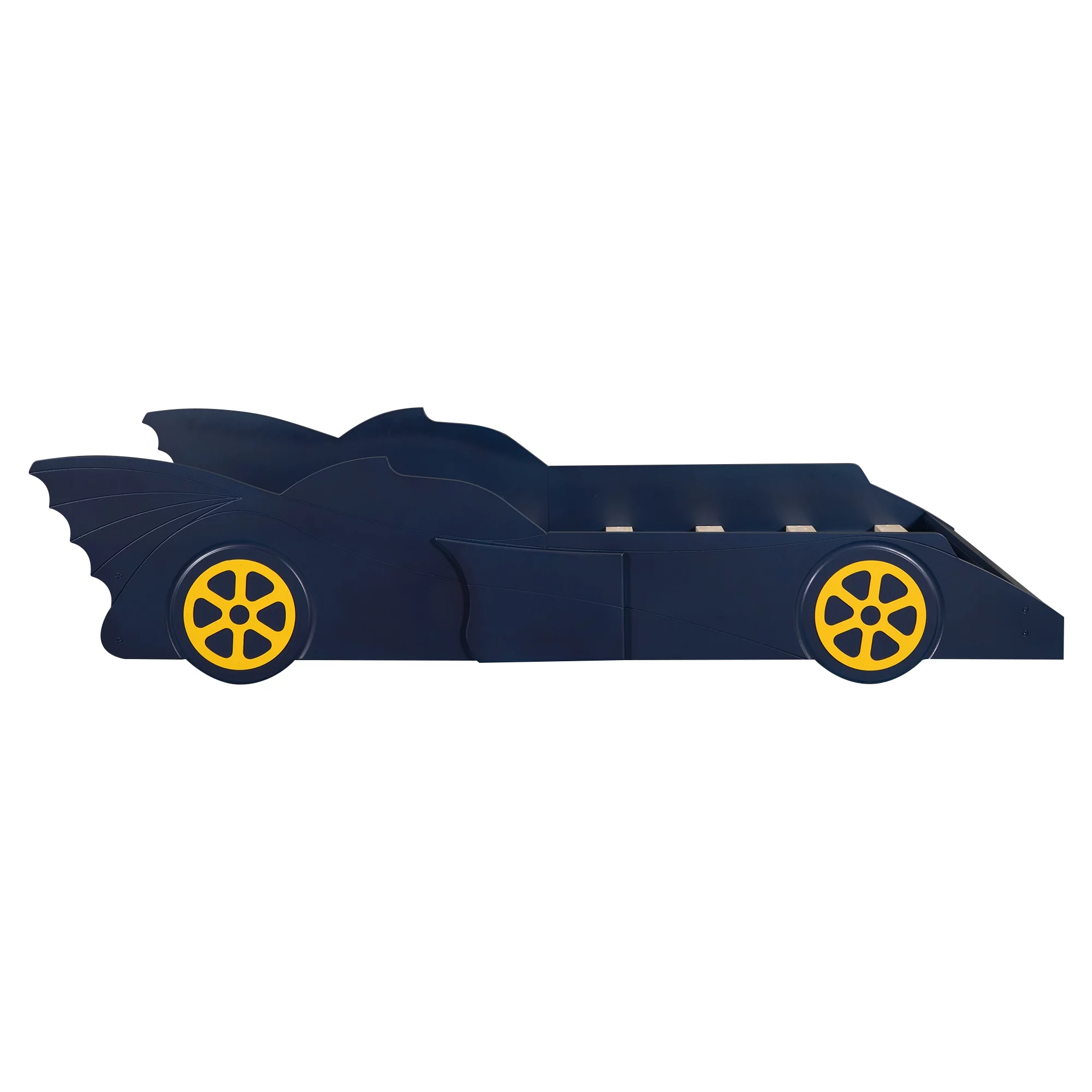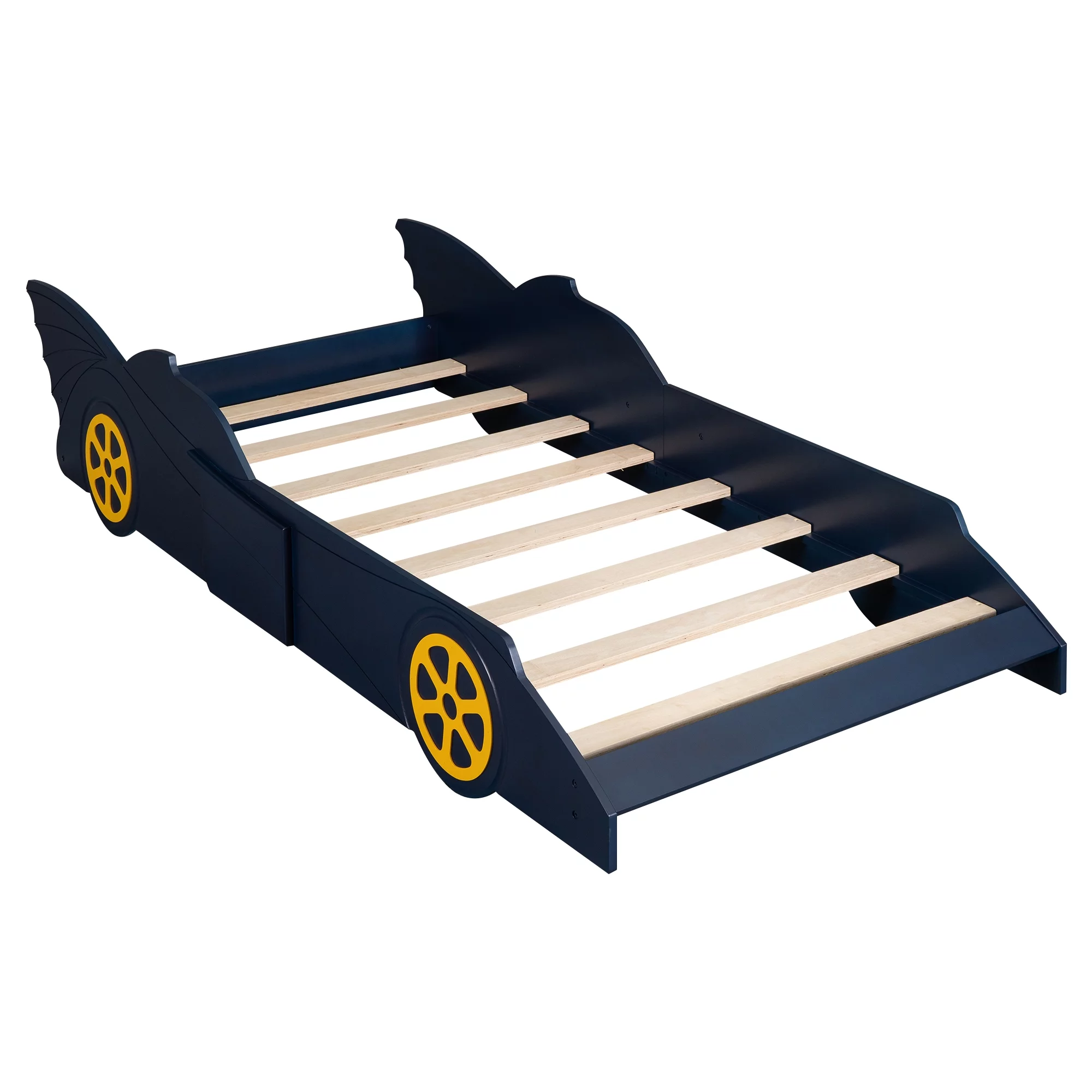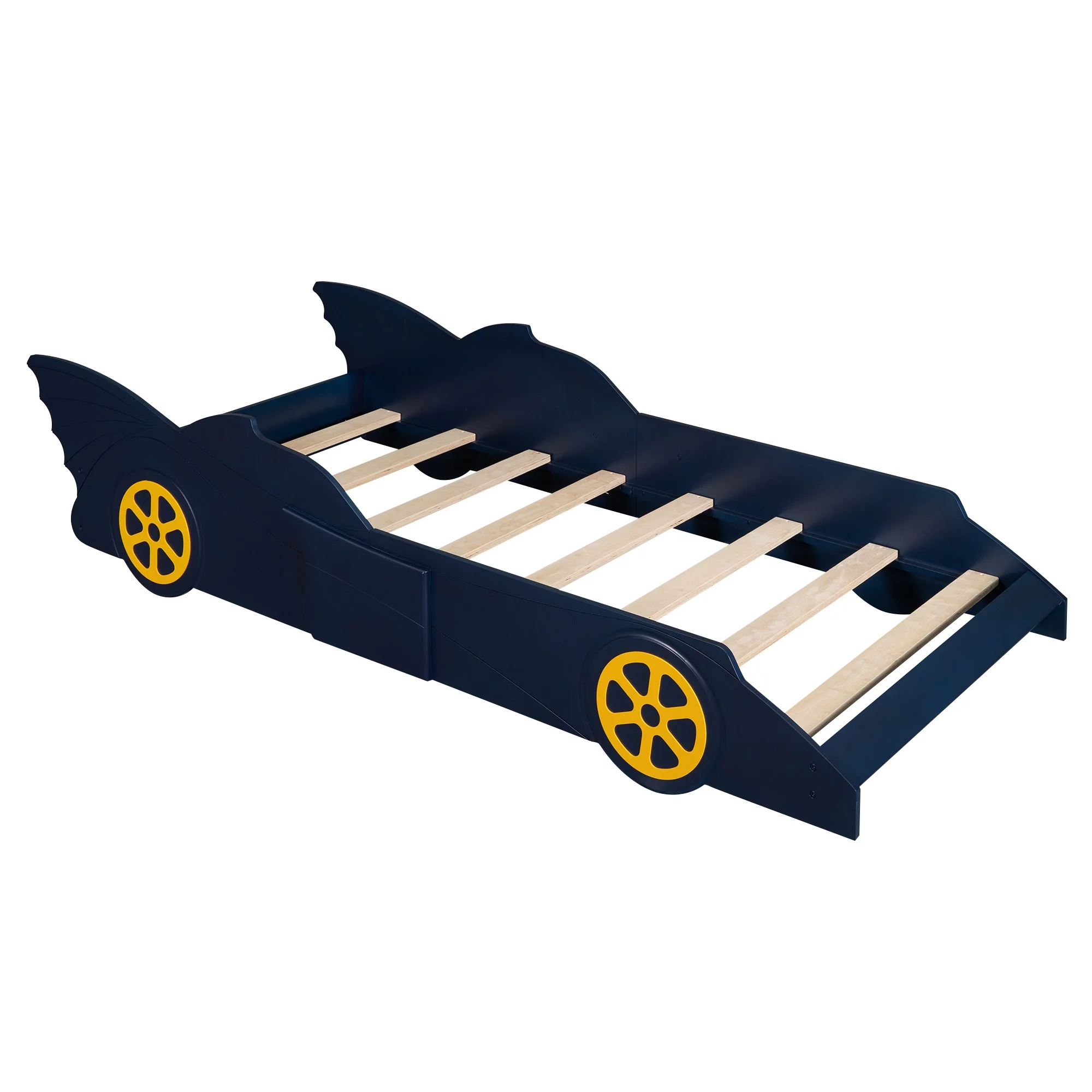 Euroco Wood Race Car-Shaped Twin Size Platform Bed for Kids’ Bedroom, Blue & Yellow
