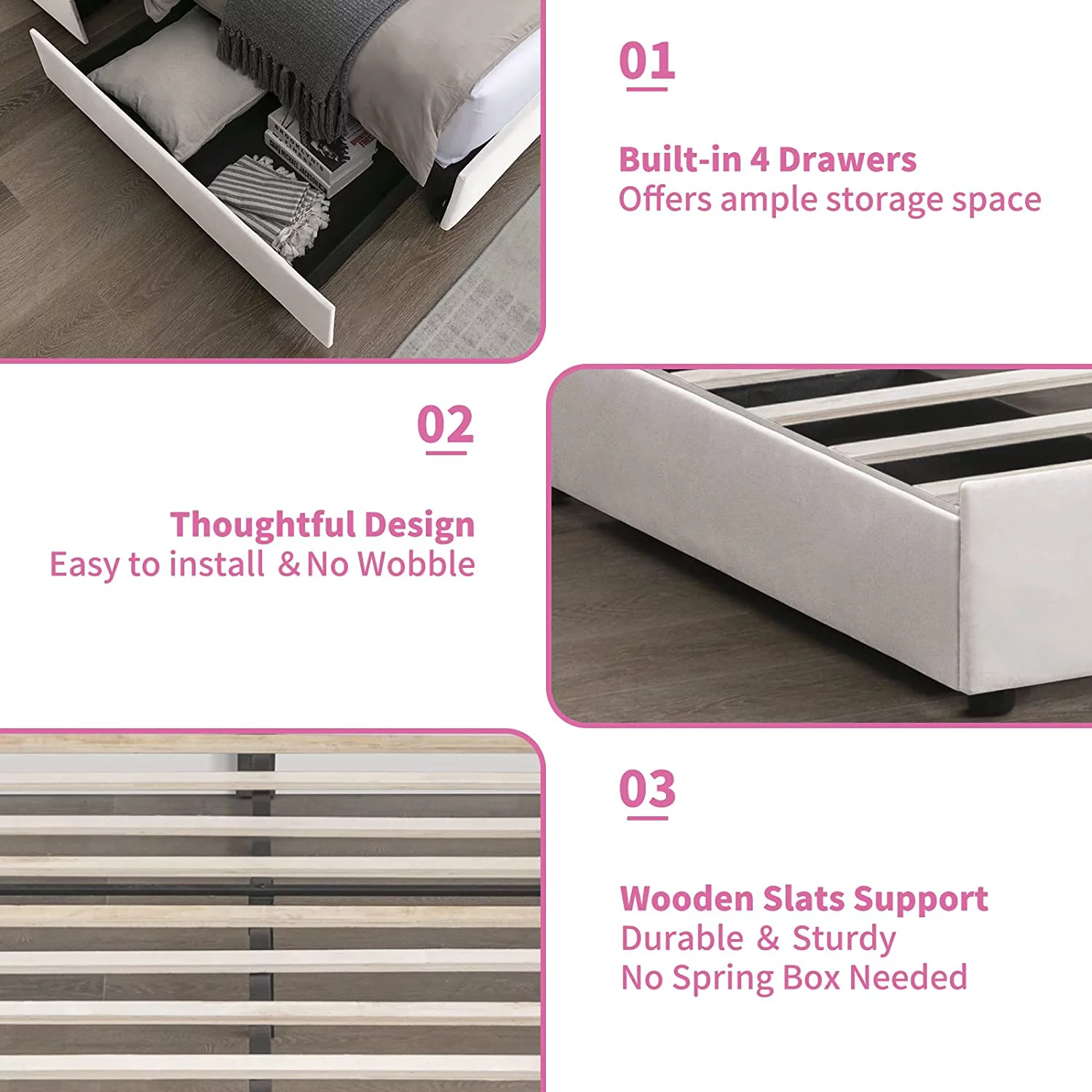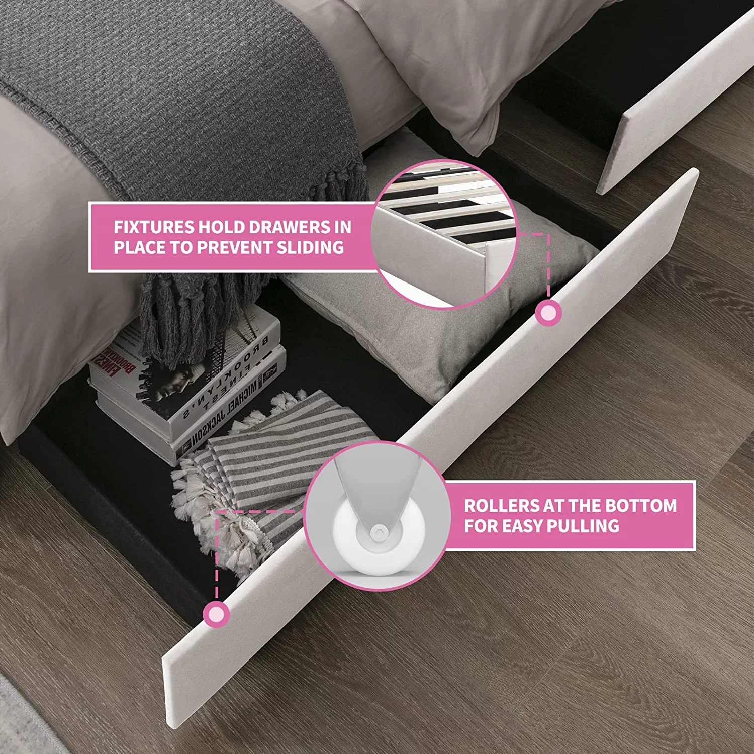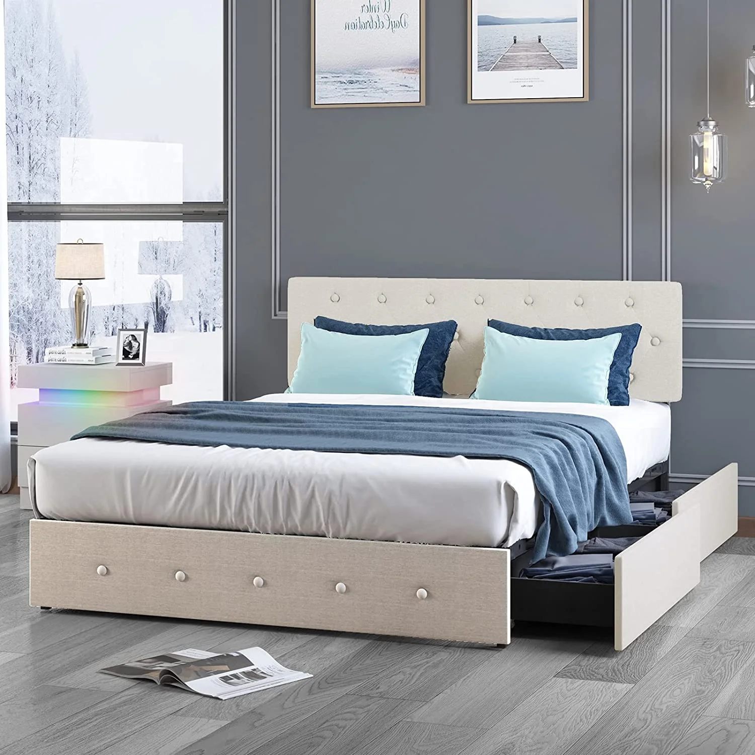 Modern 6pc King PU Upholstered LED Headboard Bed Storage Bedroom Wood Furniture Set Beige Finish