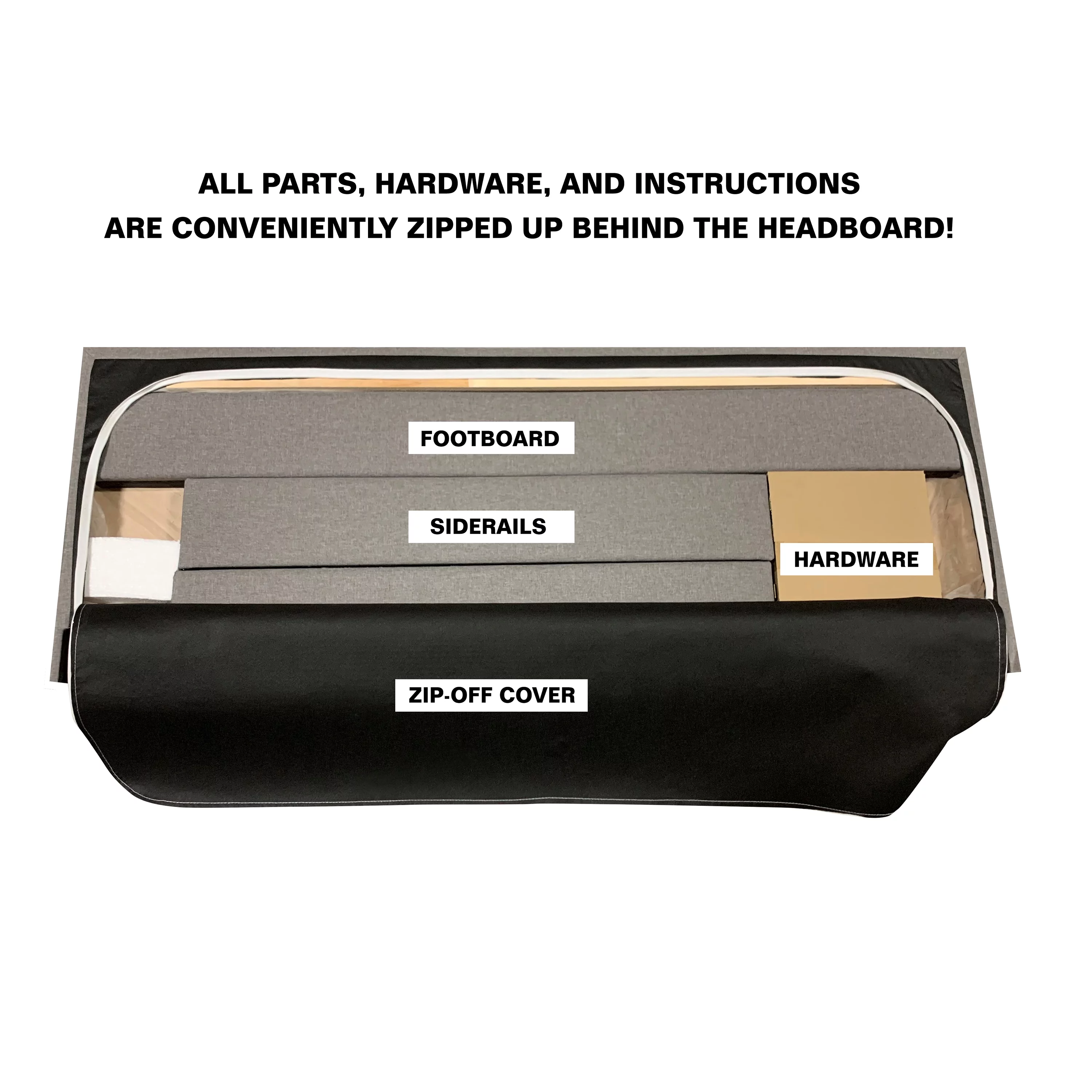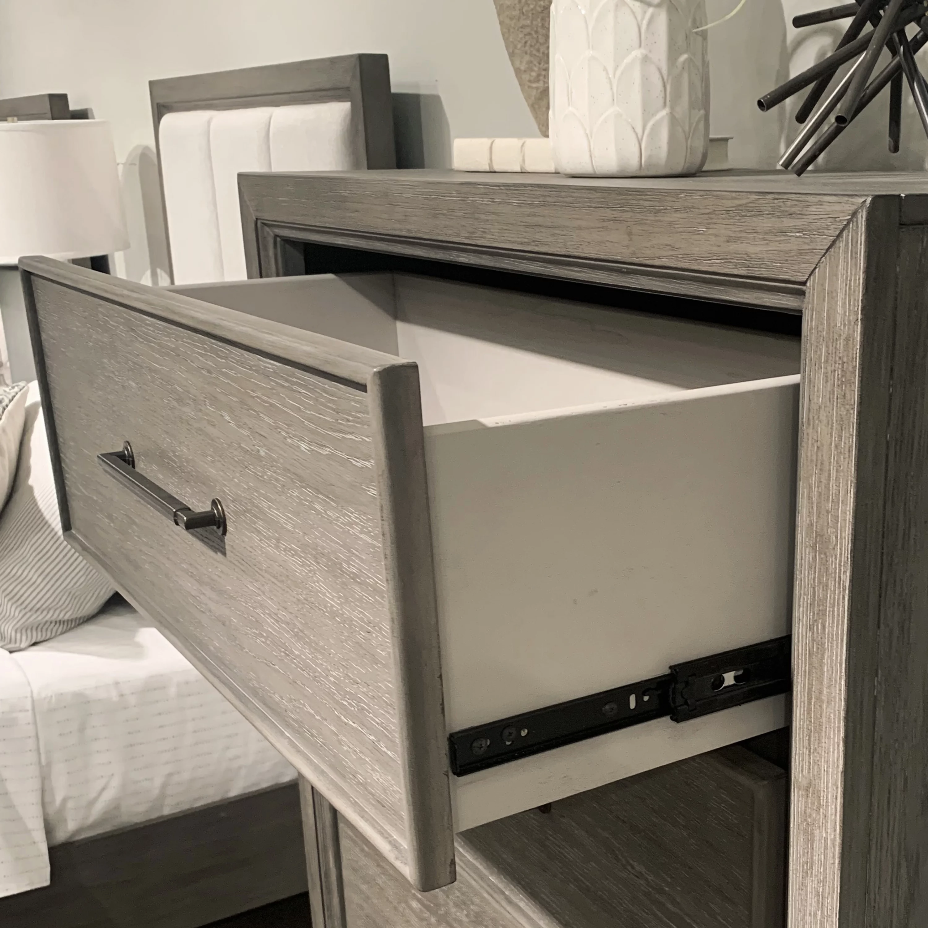 Ennesley Gray Wood Bedroom Set with Upholstered Panel King Bed, Dresser, Mirror, and Nightstand