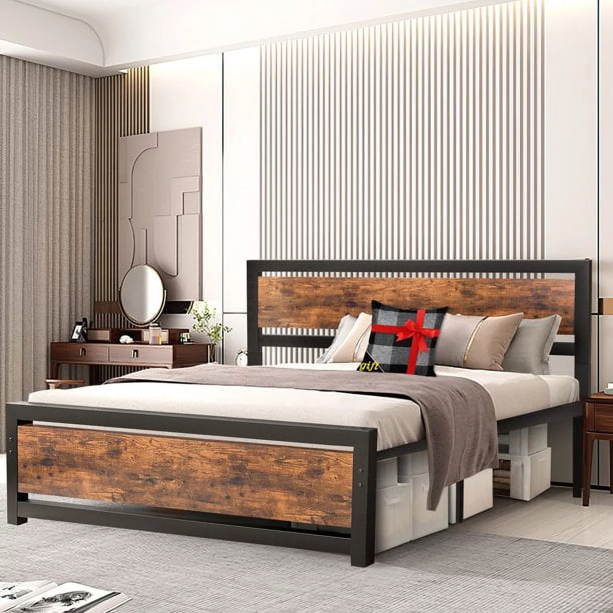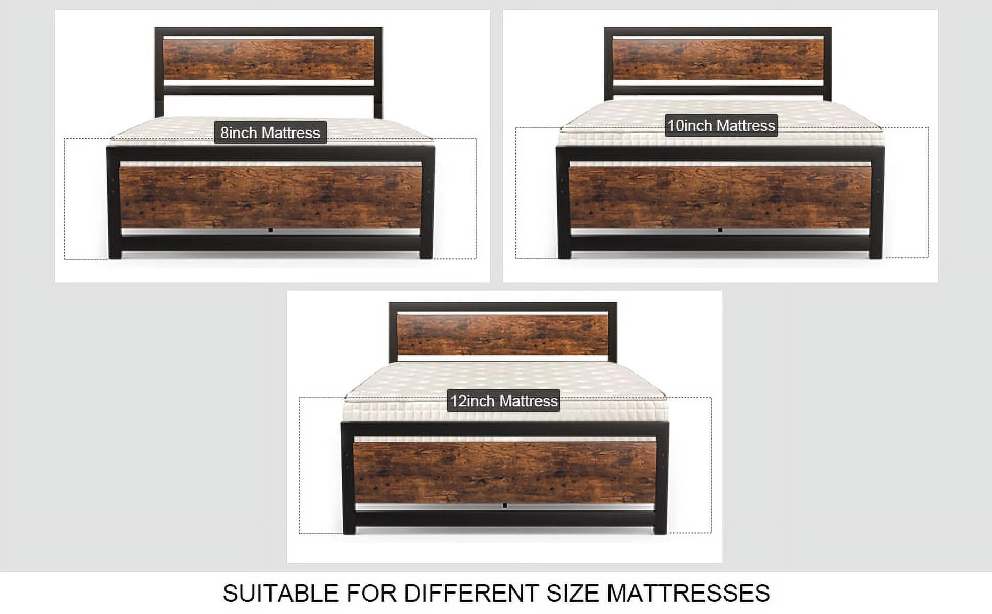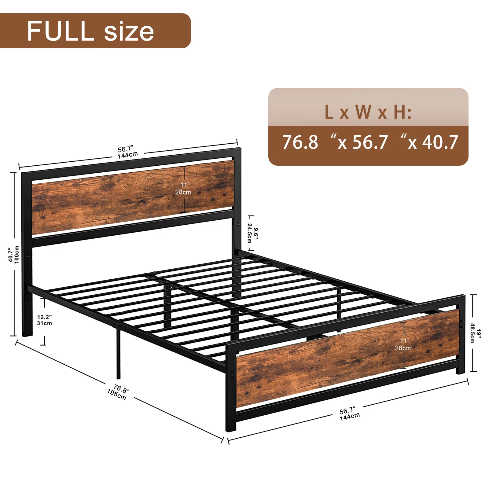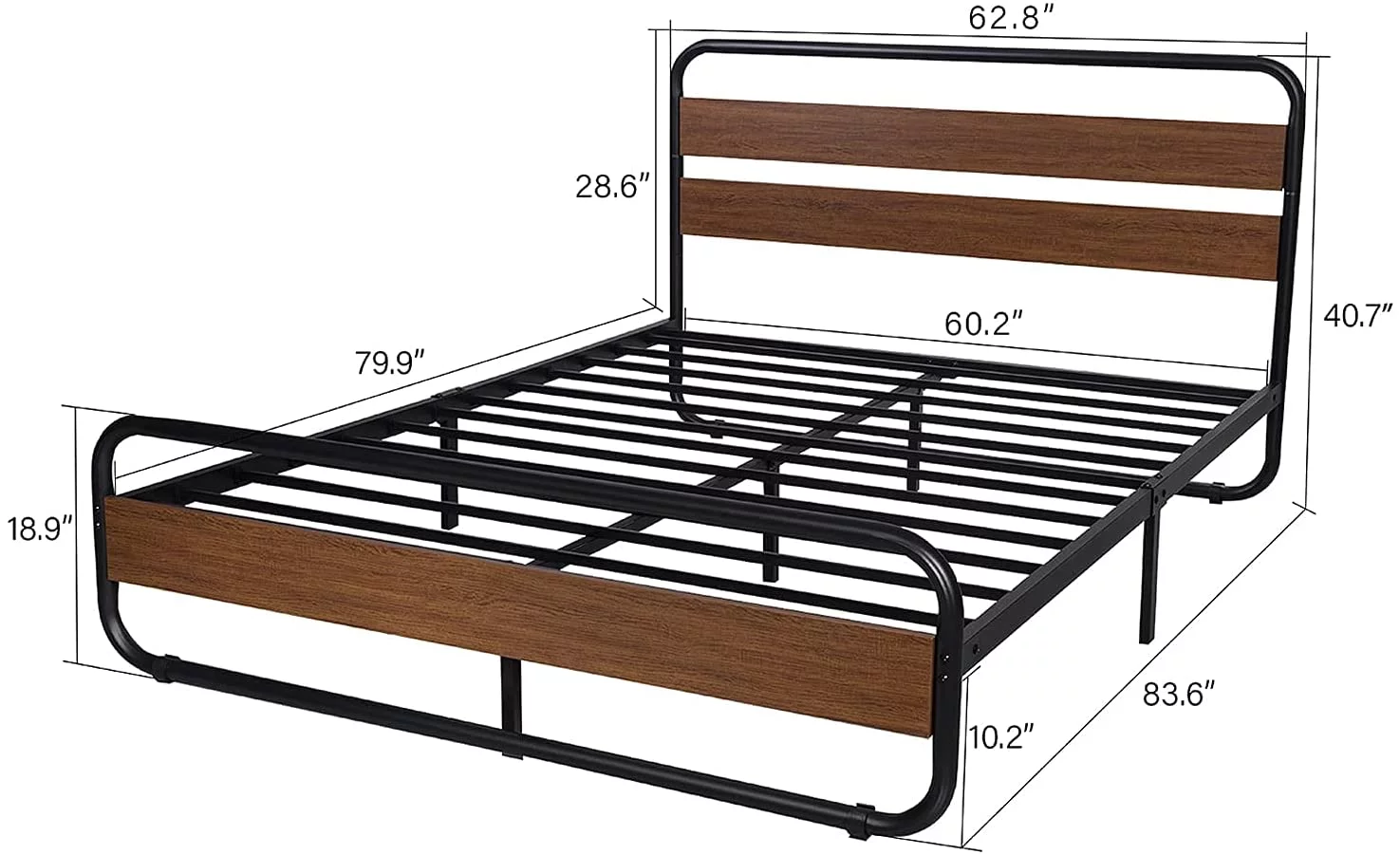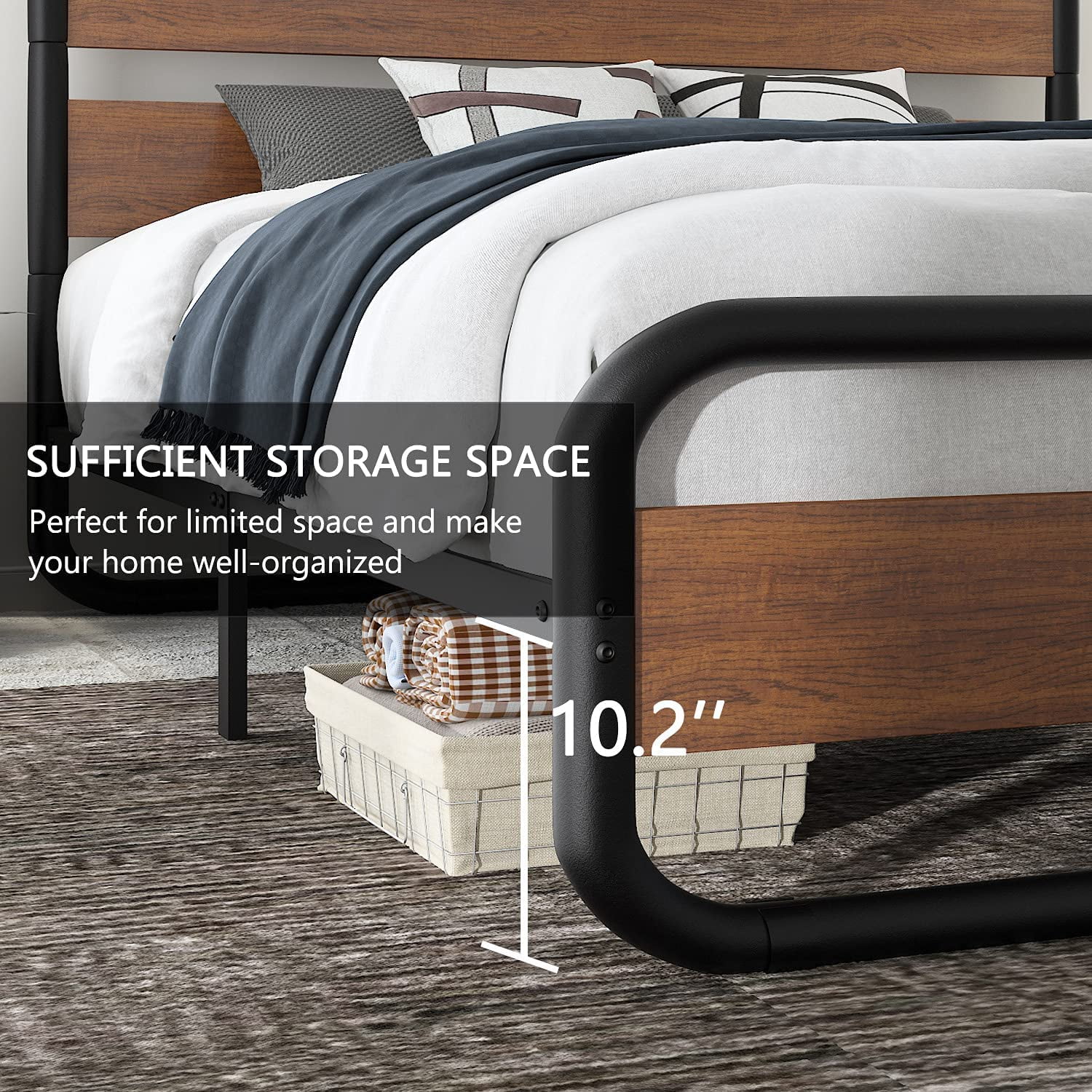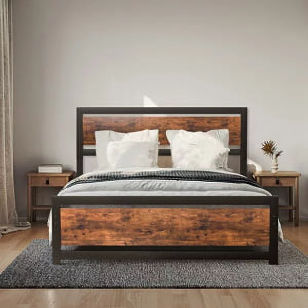 Allewie Walnut Queen Size Metal Platform Bed Frame with Wooden Headboard, Noise free