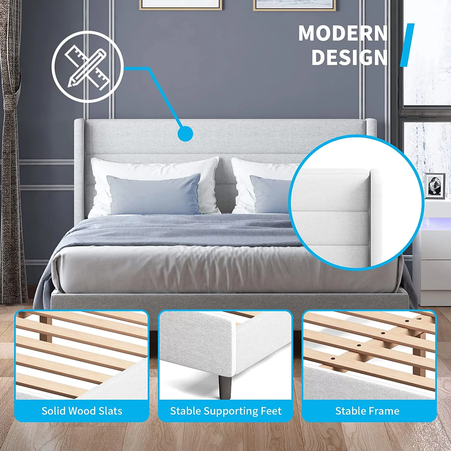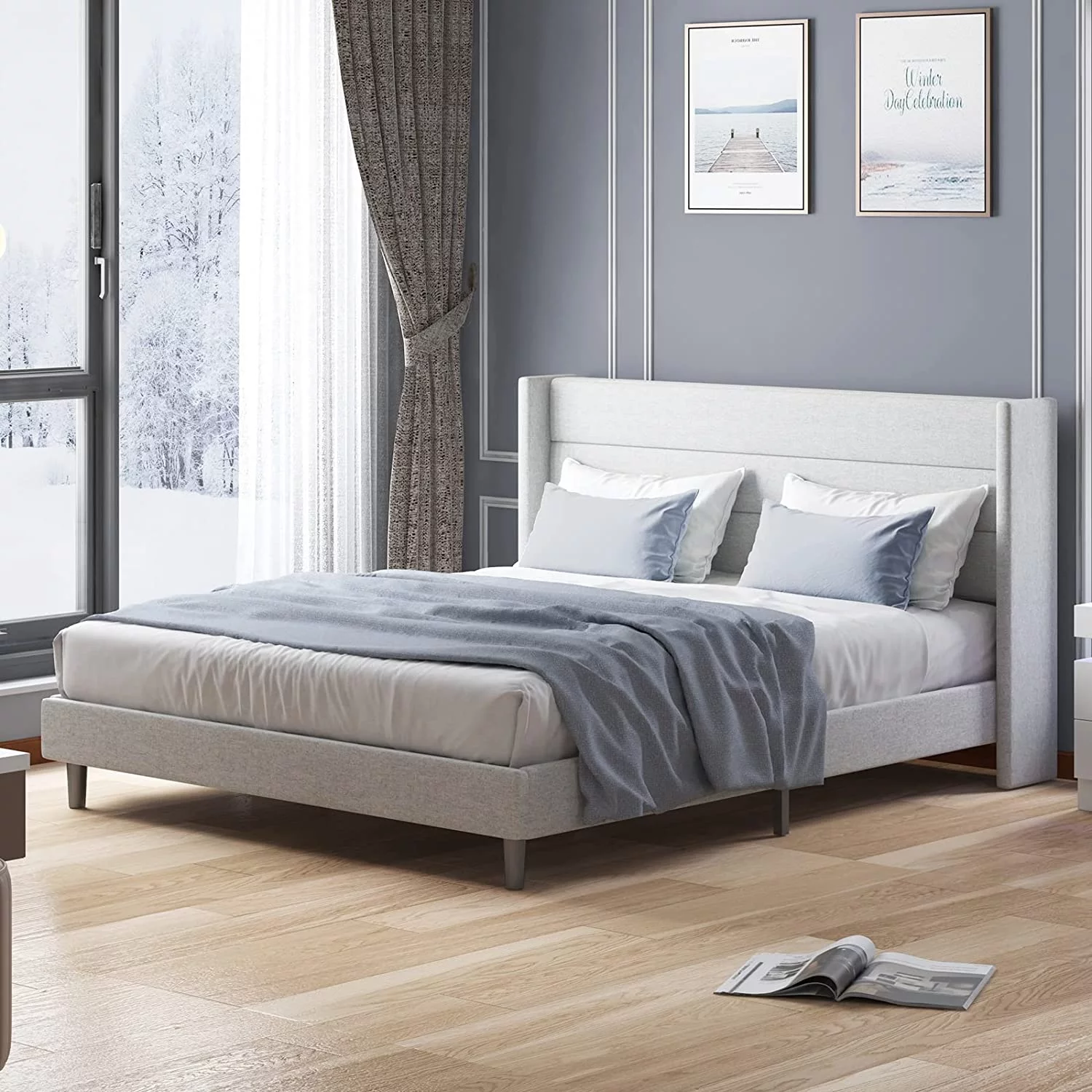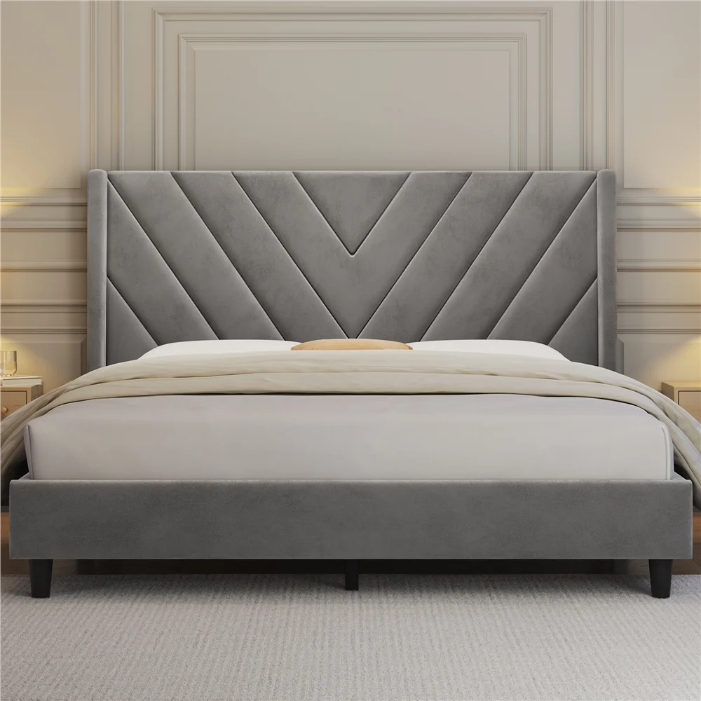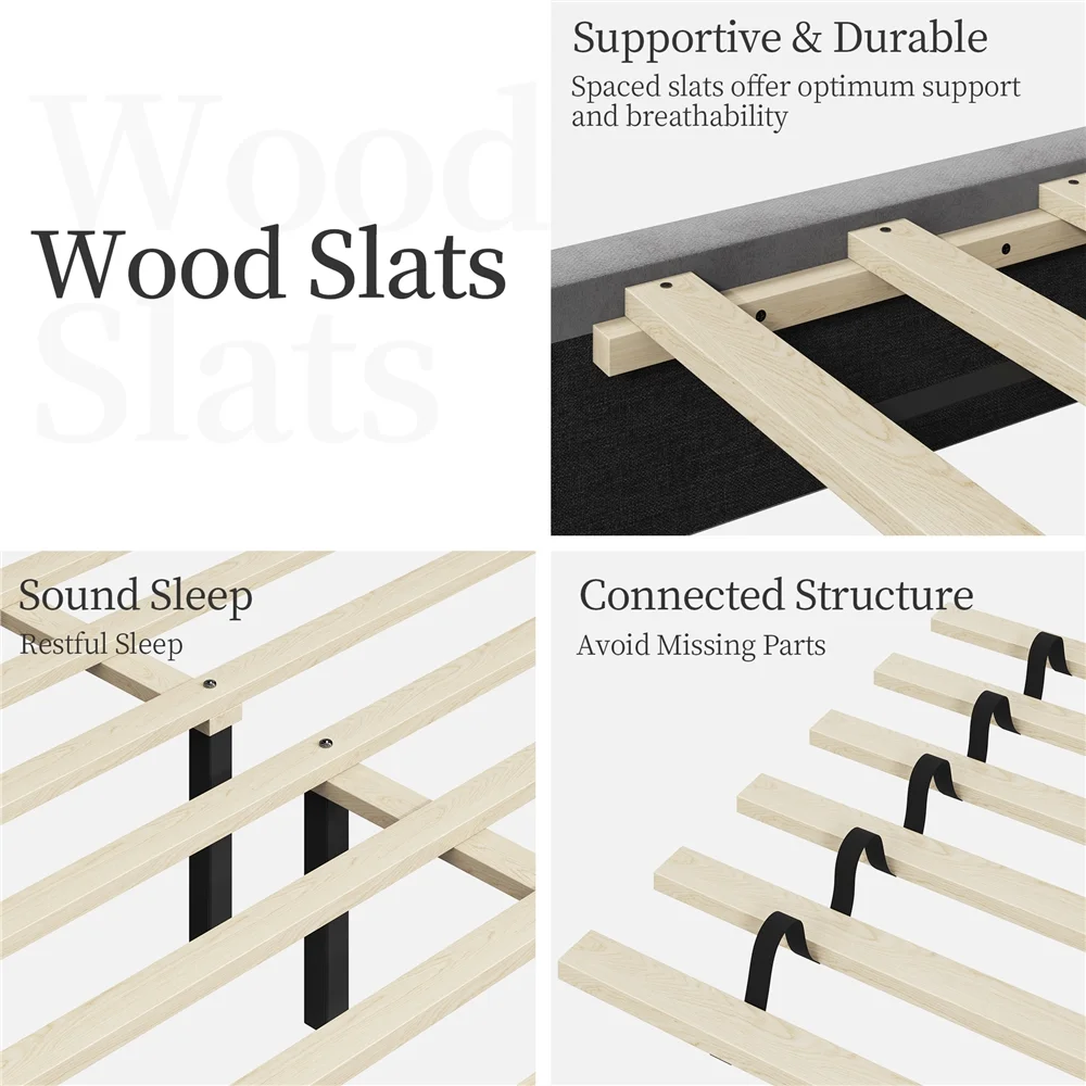 Yaheetech Upholstered Platform Bed Frame with Wooden Slat Support,Queen,Light Gray