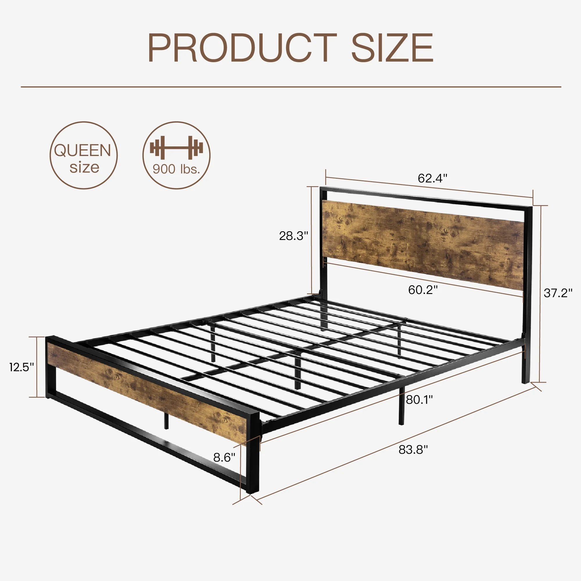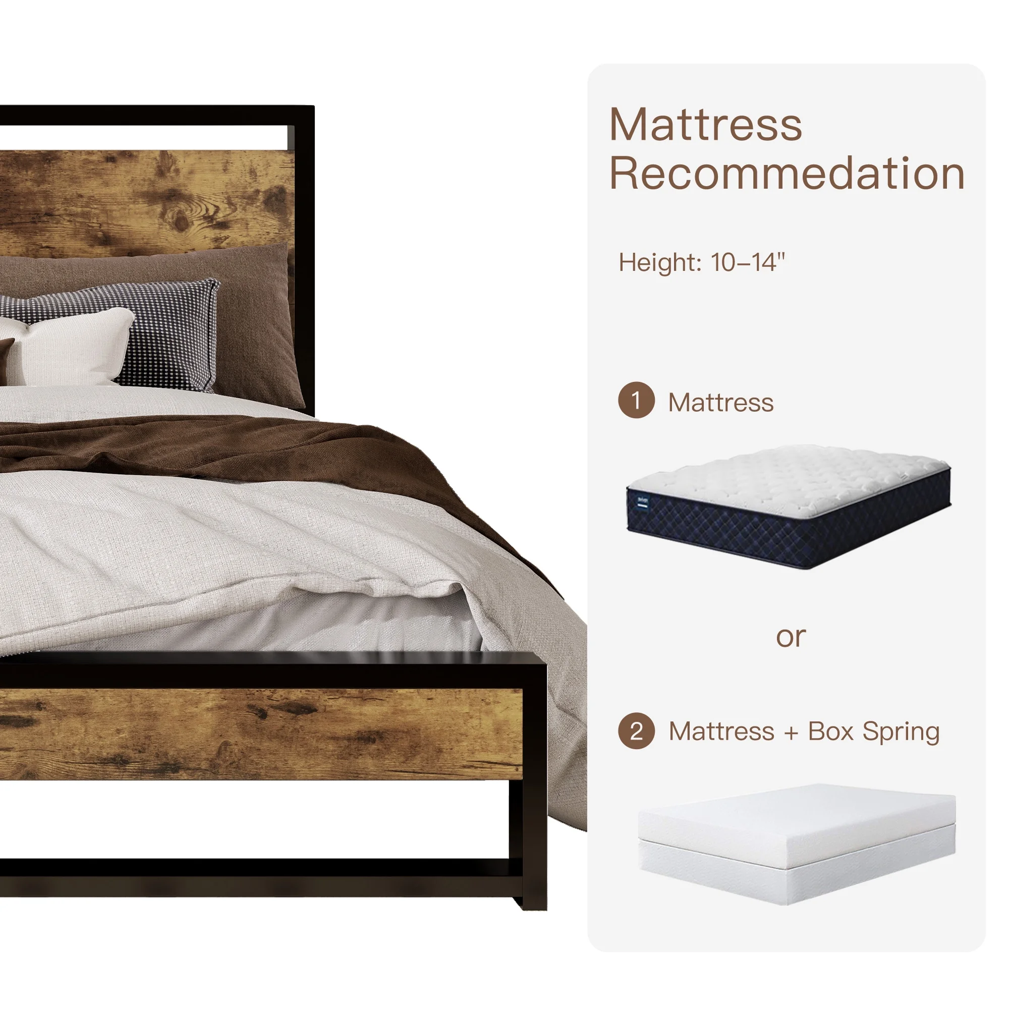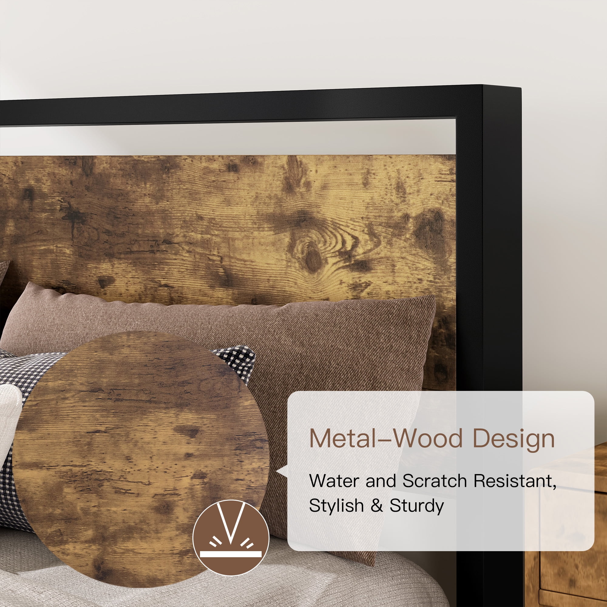 Amolife Queen Size Metal Platform Bed Frame with Industrial Wooden Rivet Headboard, Brown