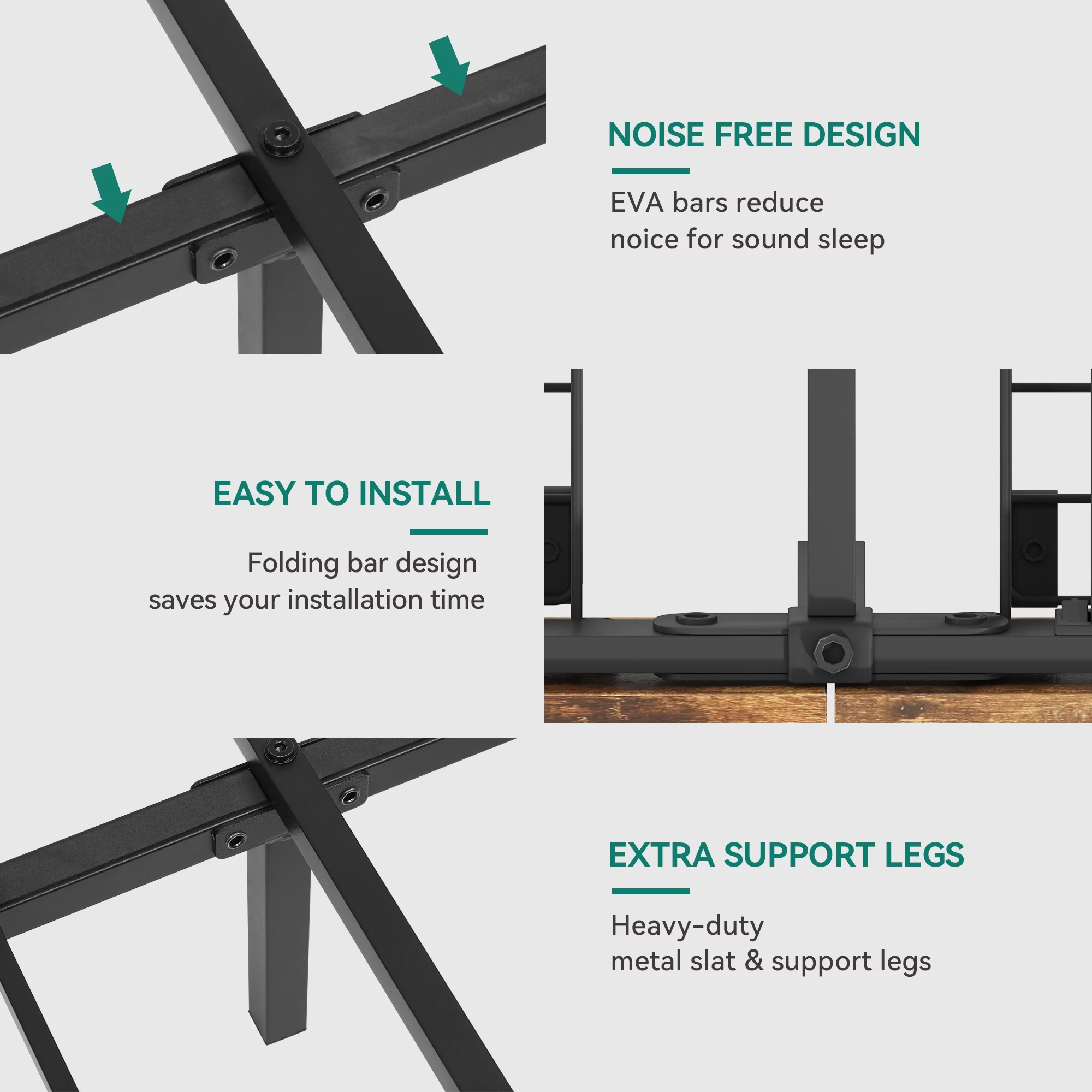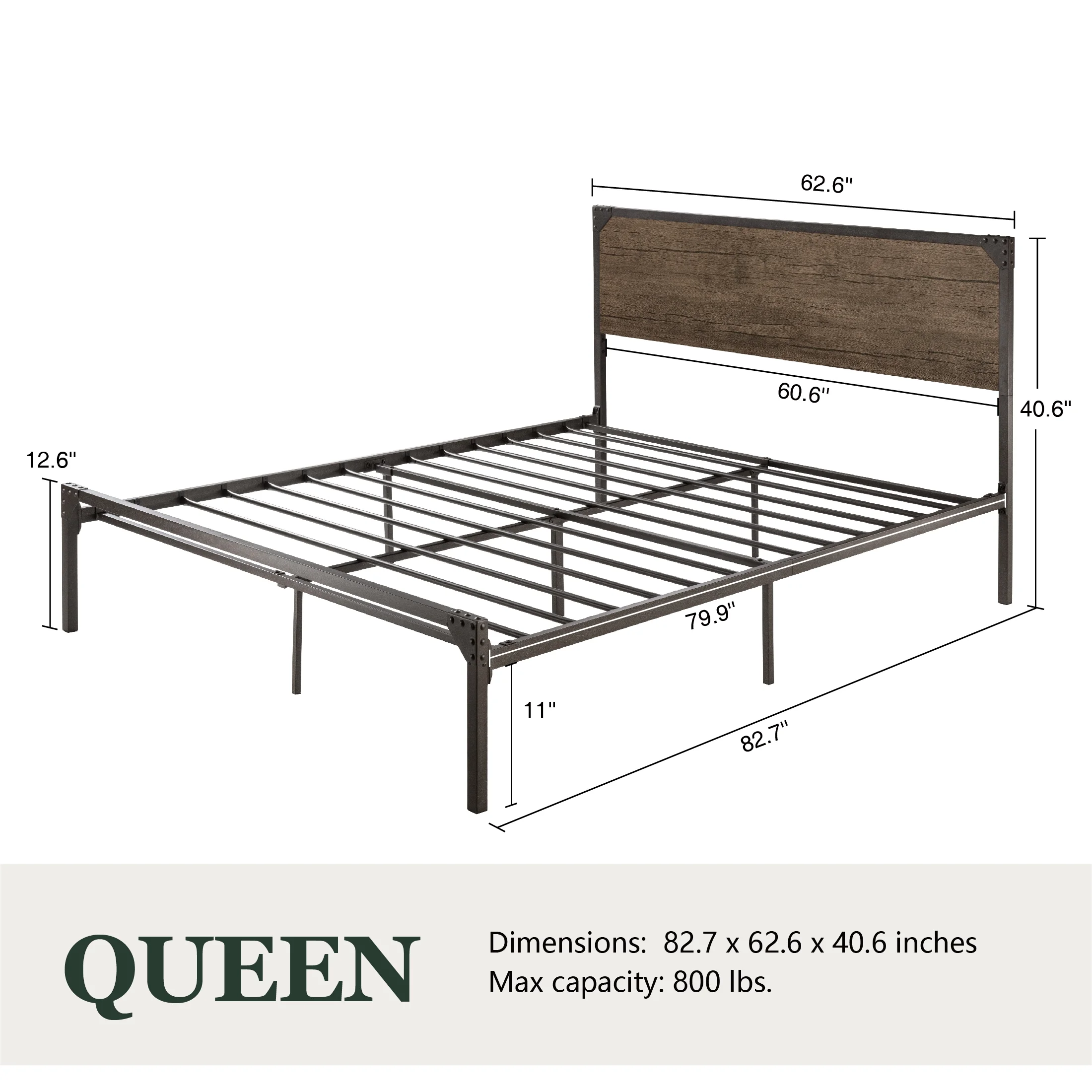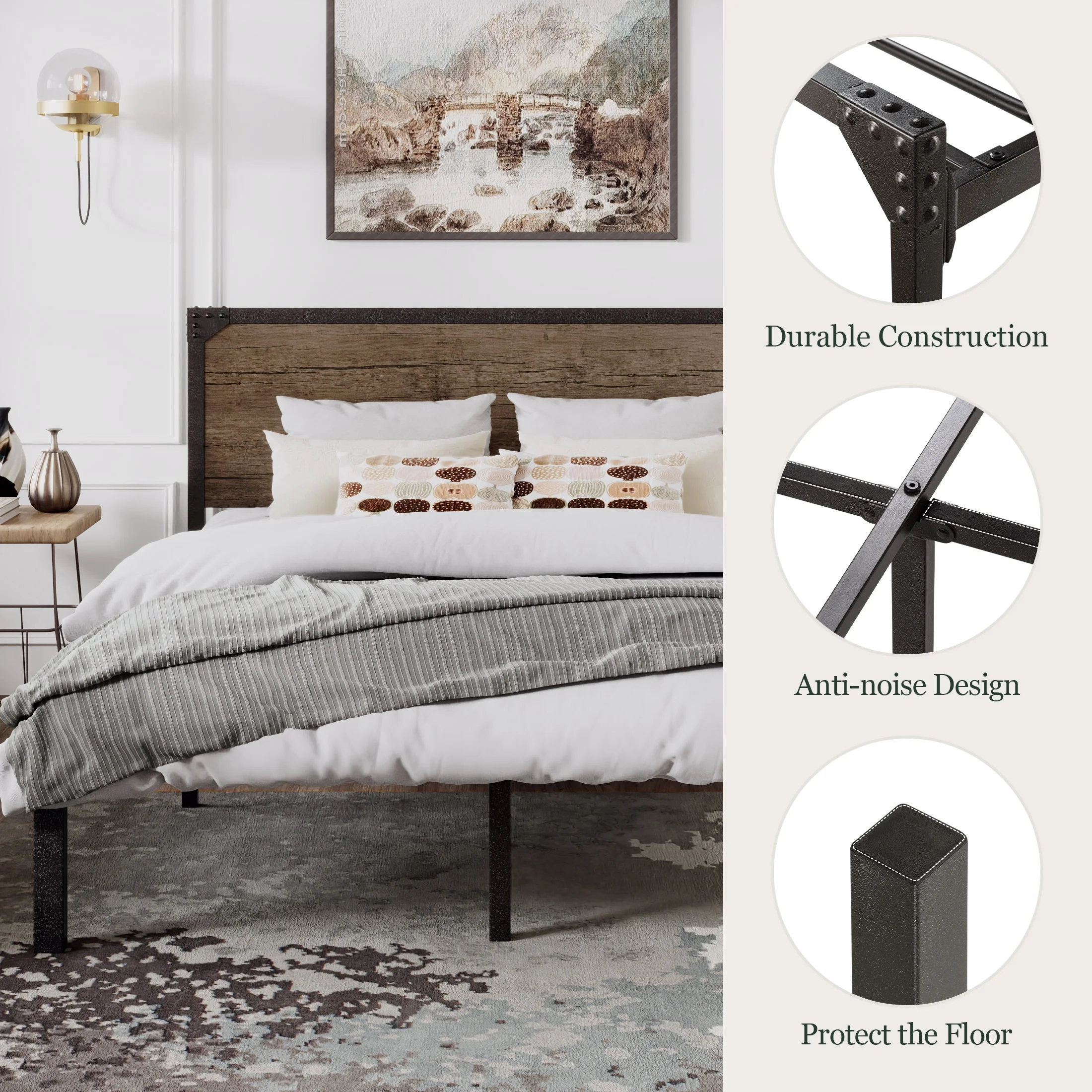 Amolife Queen Size Metal Platform Bed Frame with Industrial Wooden Rivet Headboard, Brown