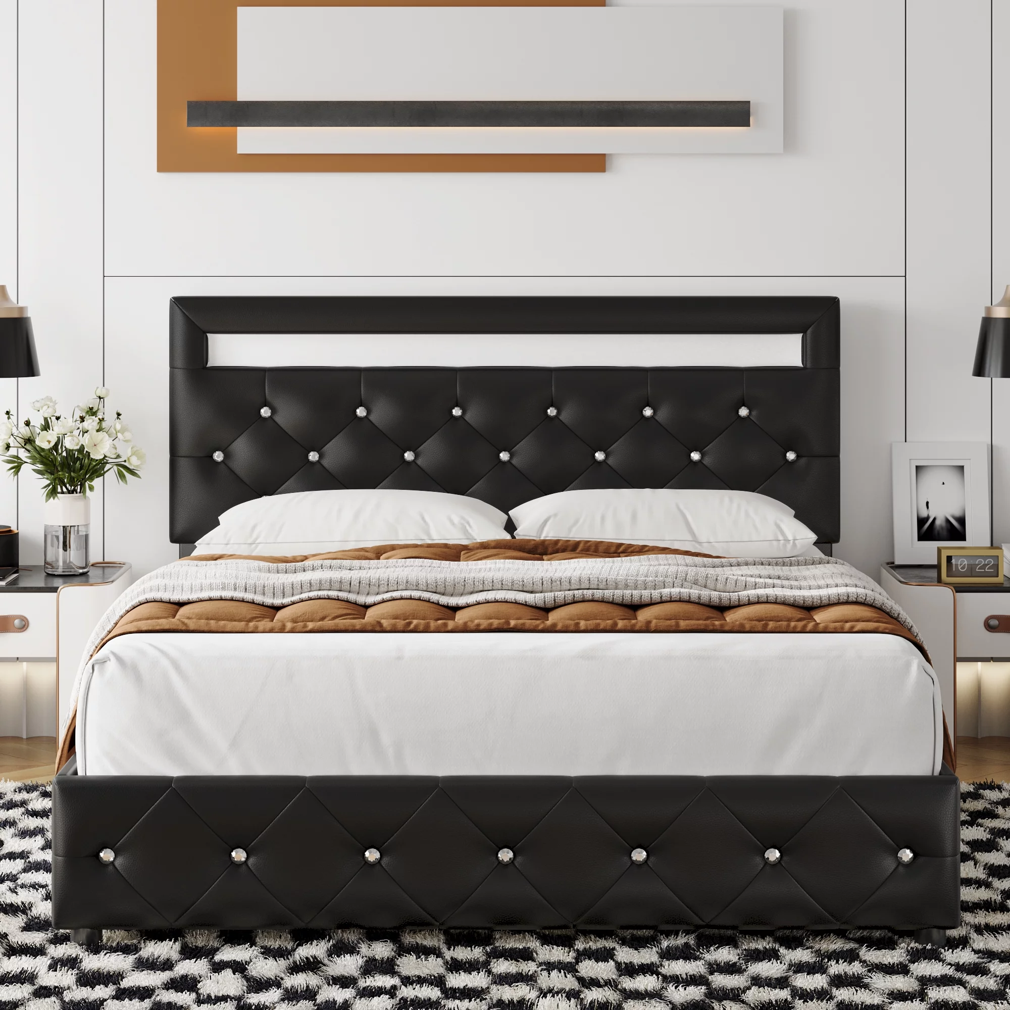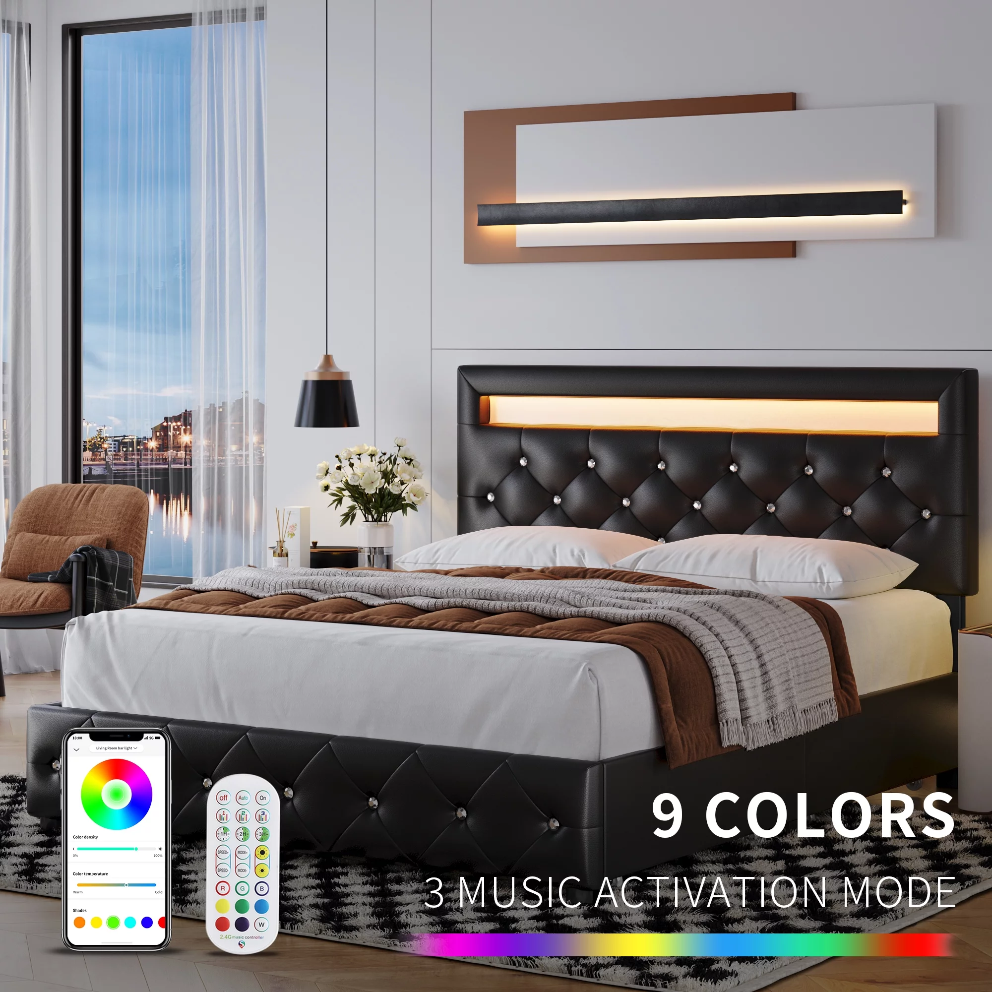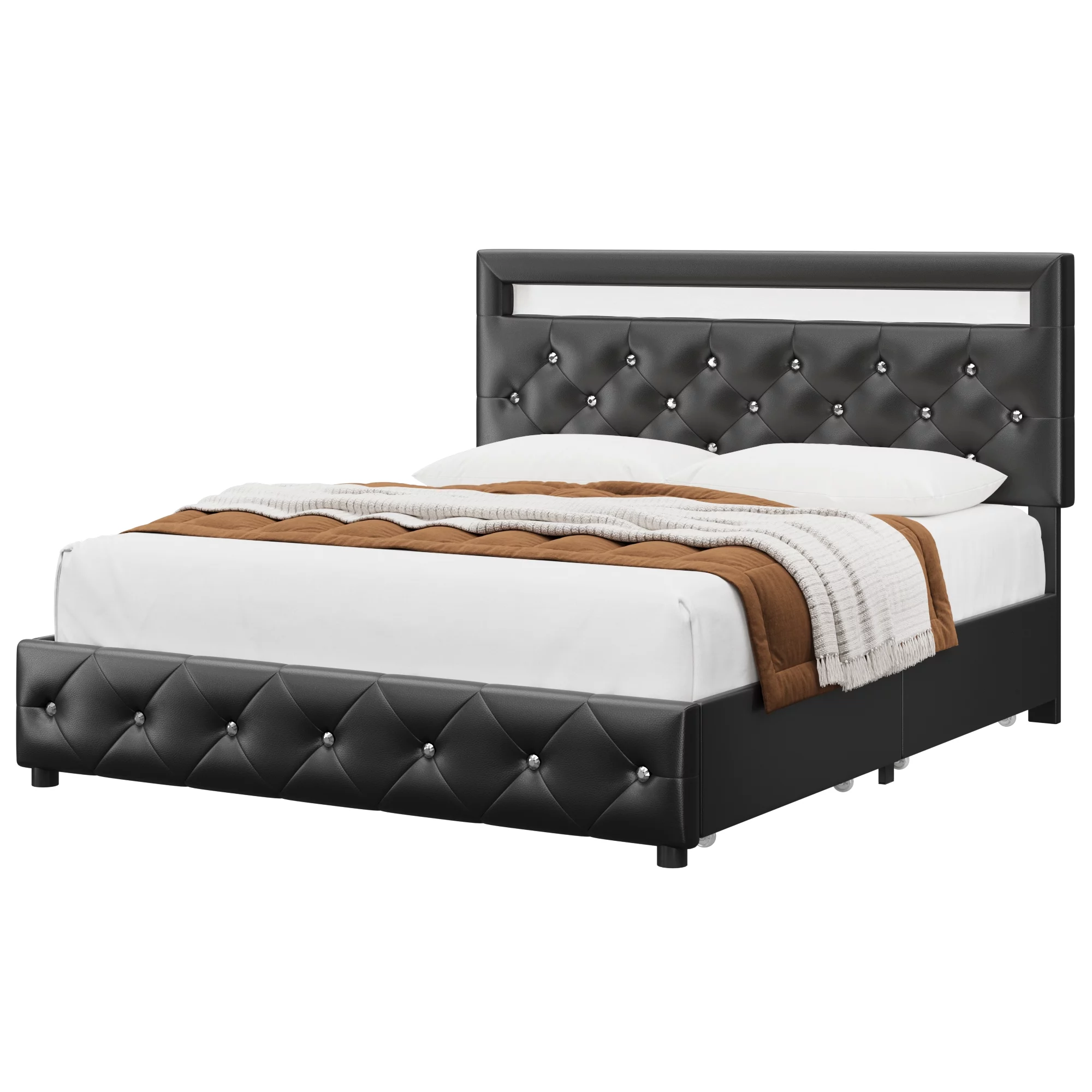 Beautiful 3pc Queen Size LED Upholstered HB Bed Chest Nightstand Wood Bedroom Furniture Set