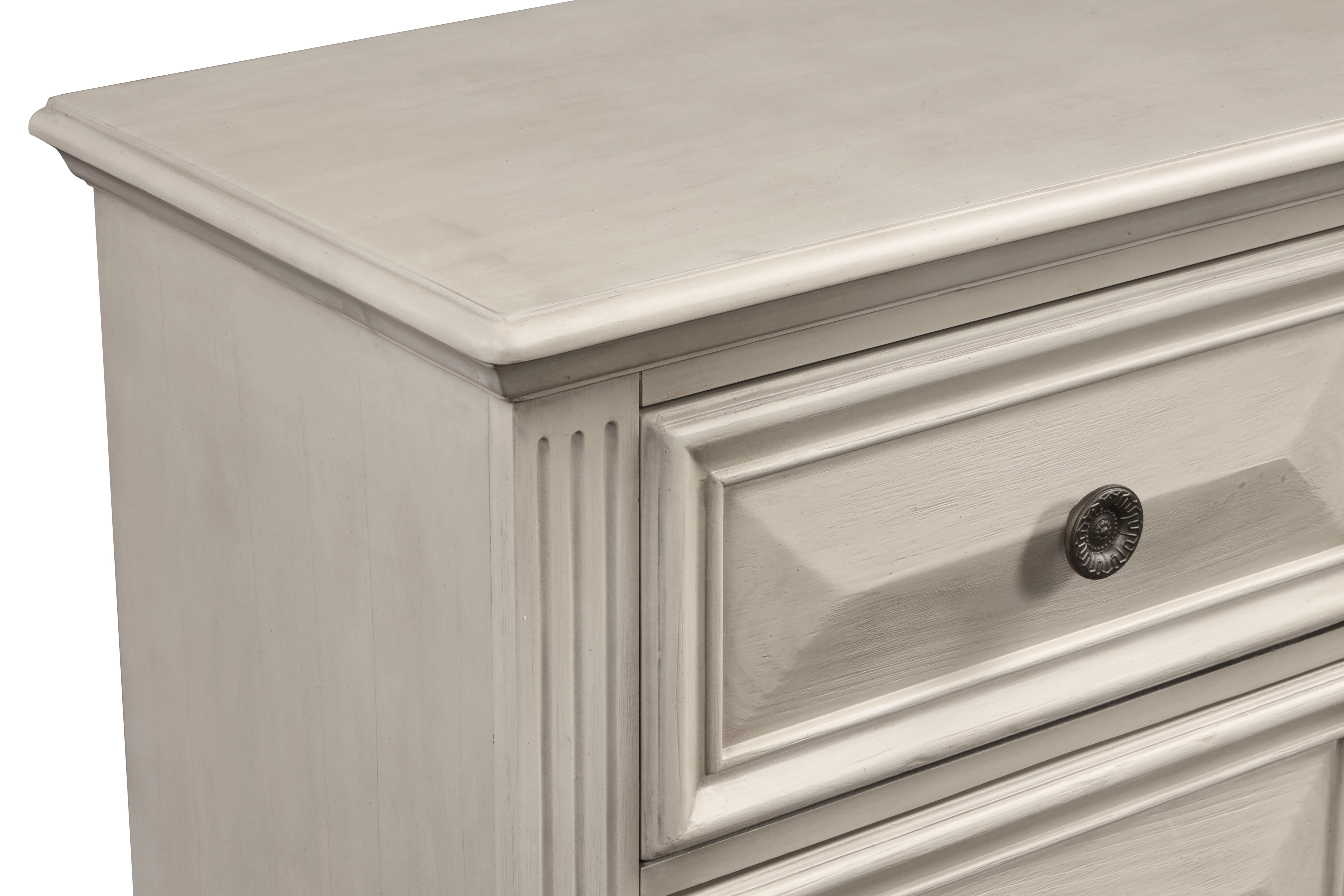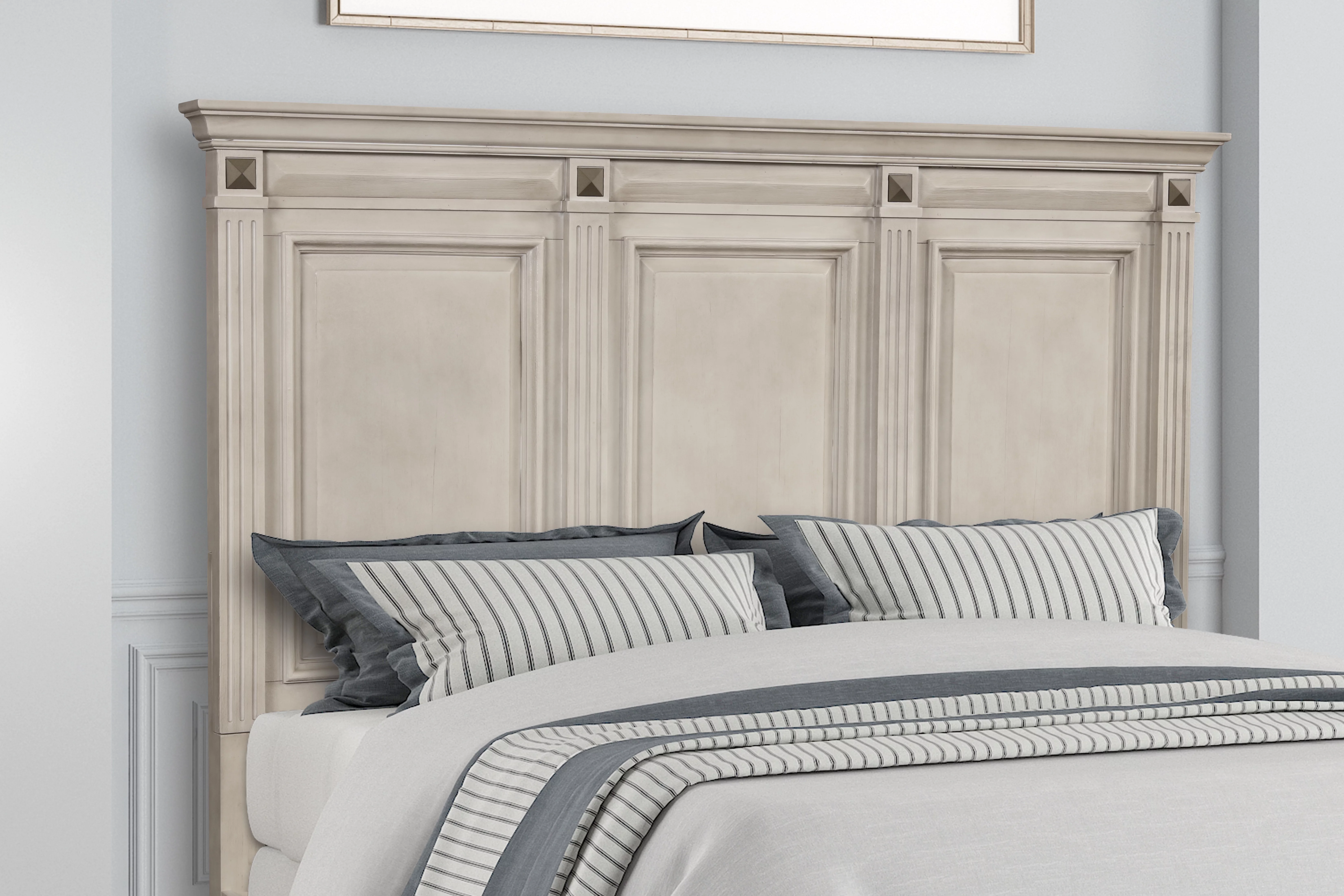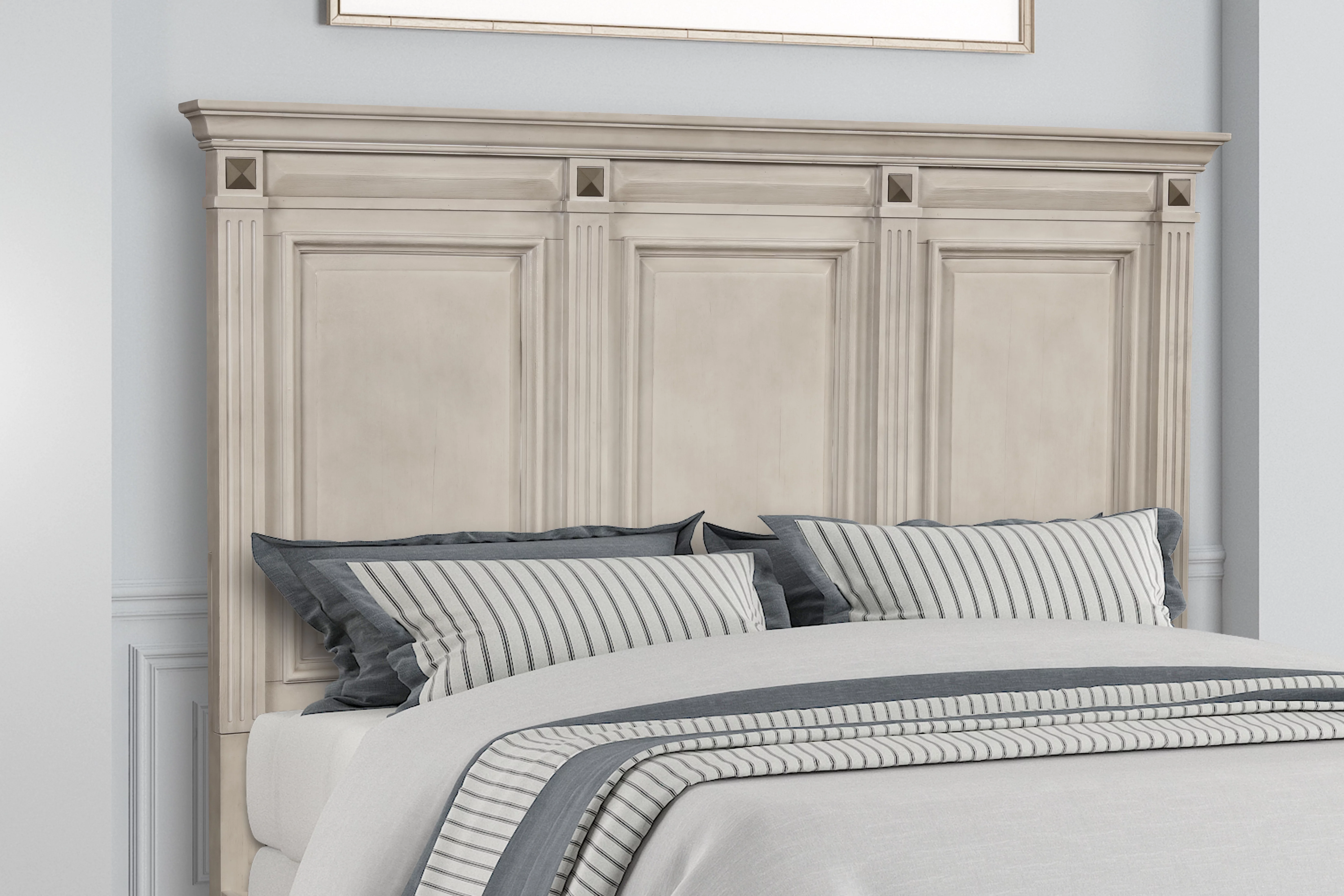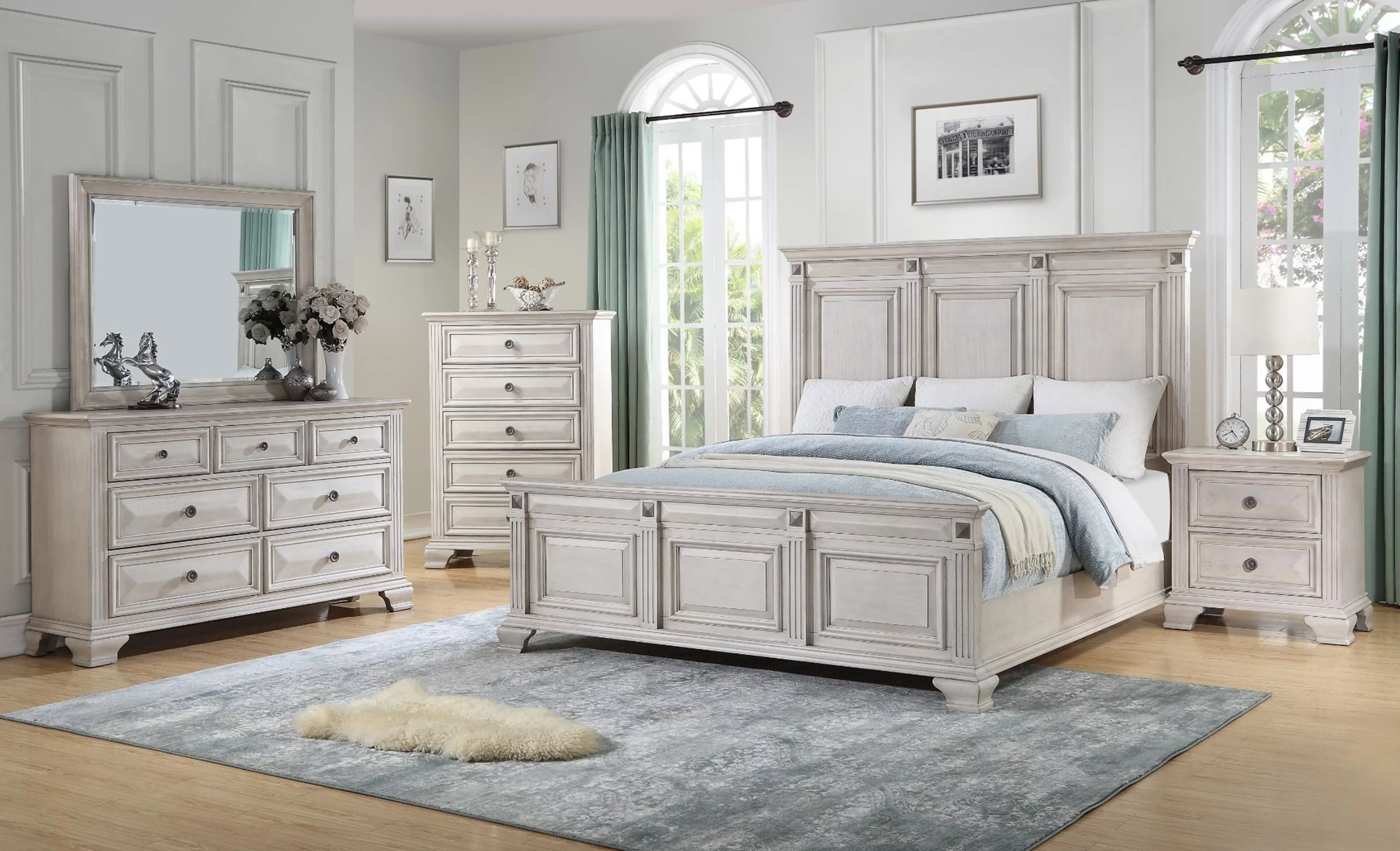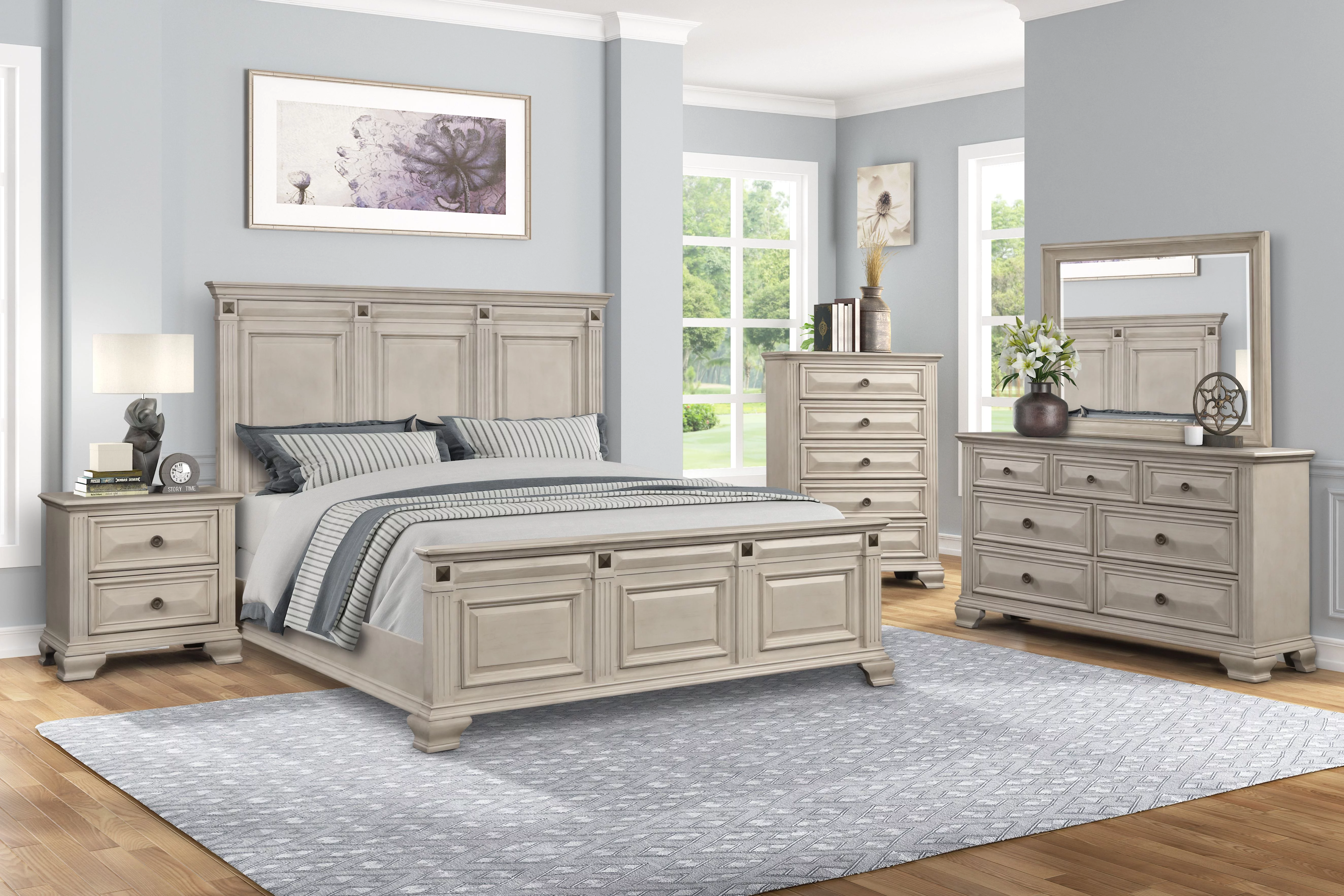 Renova Distressed Parchment Wood Bedroom Set, King Panel Bed, Dresser, Mirror, Two Nightstands, Chest