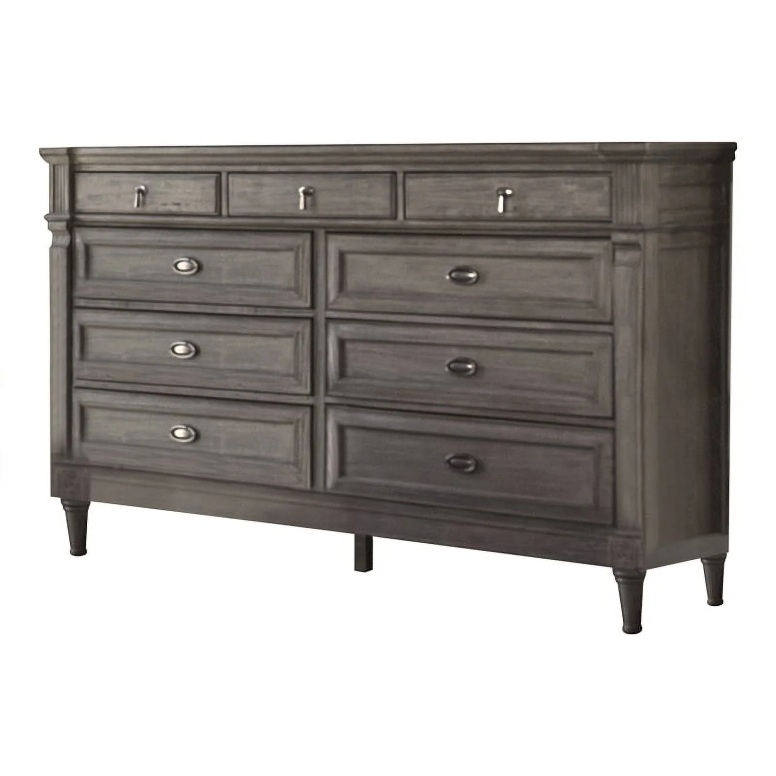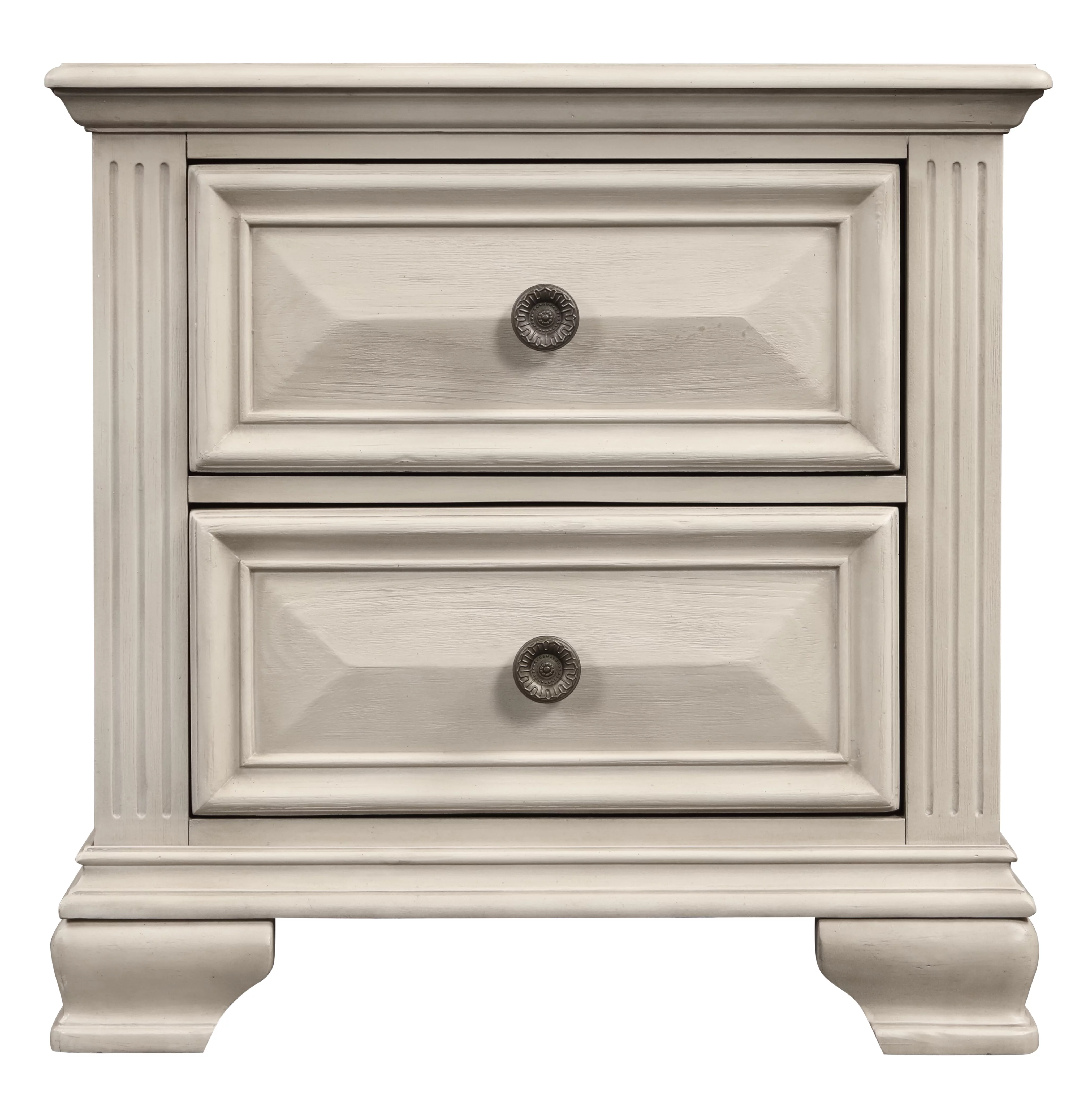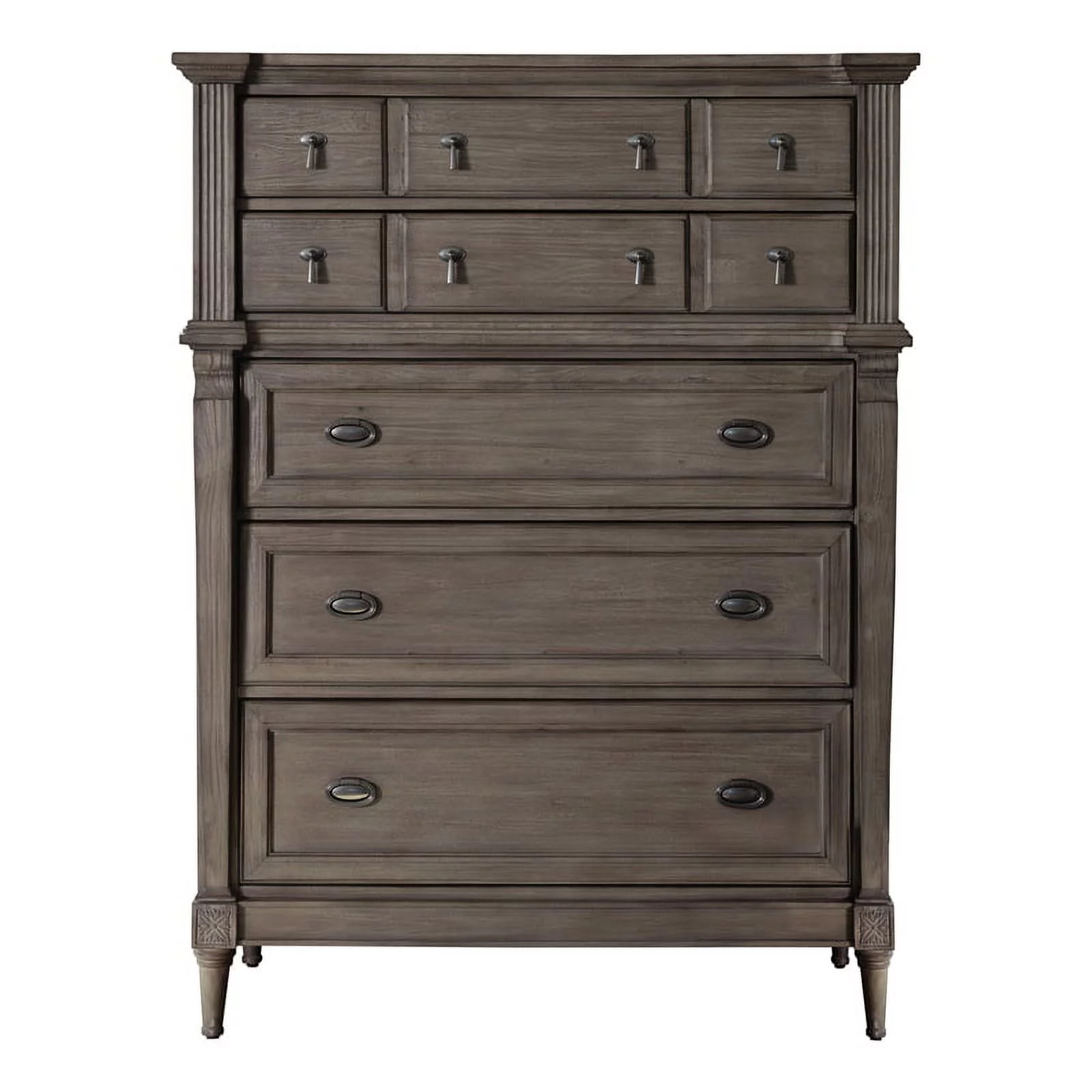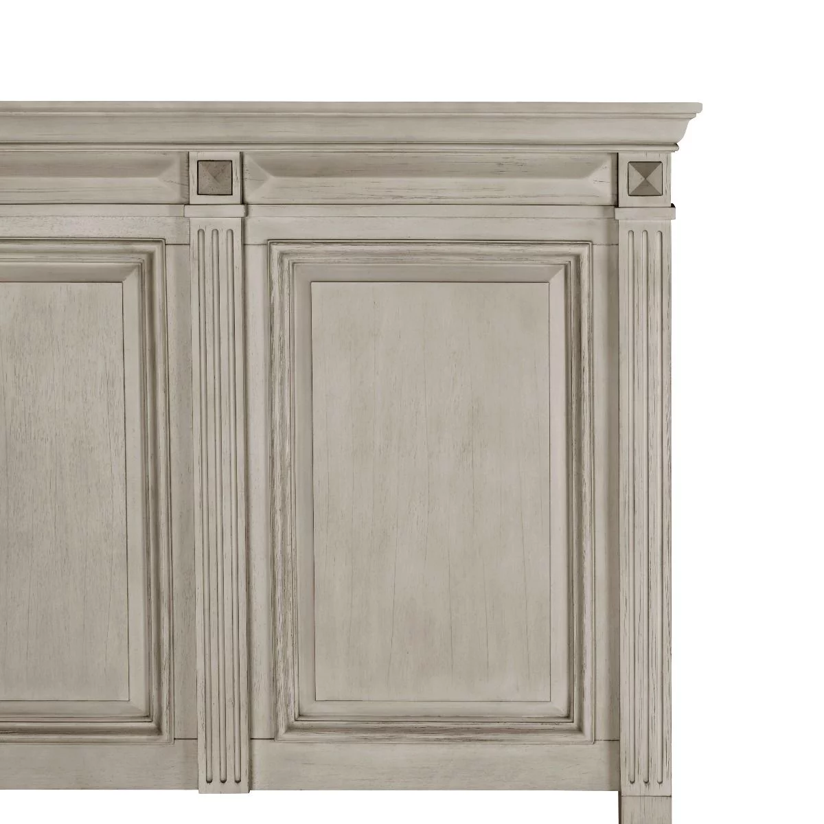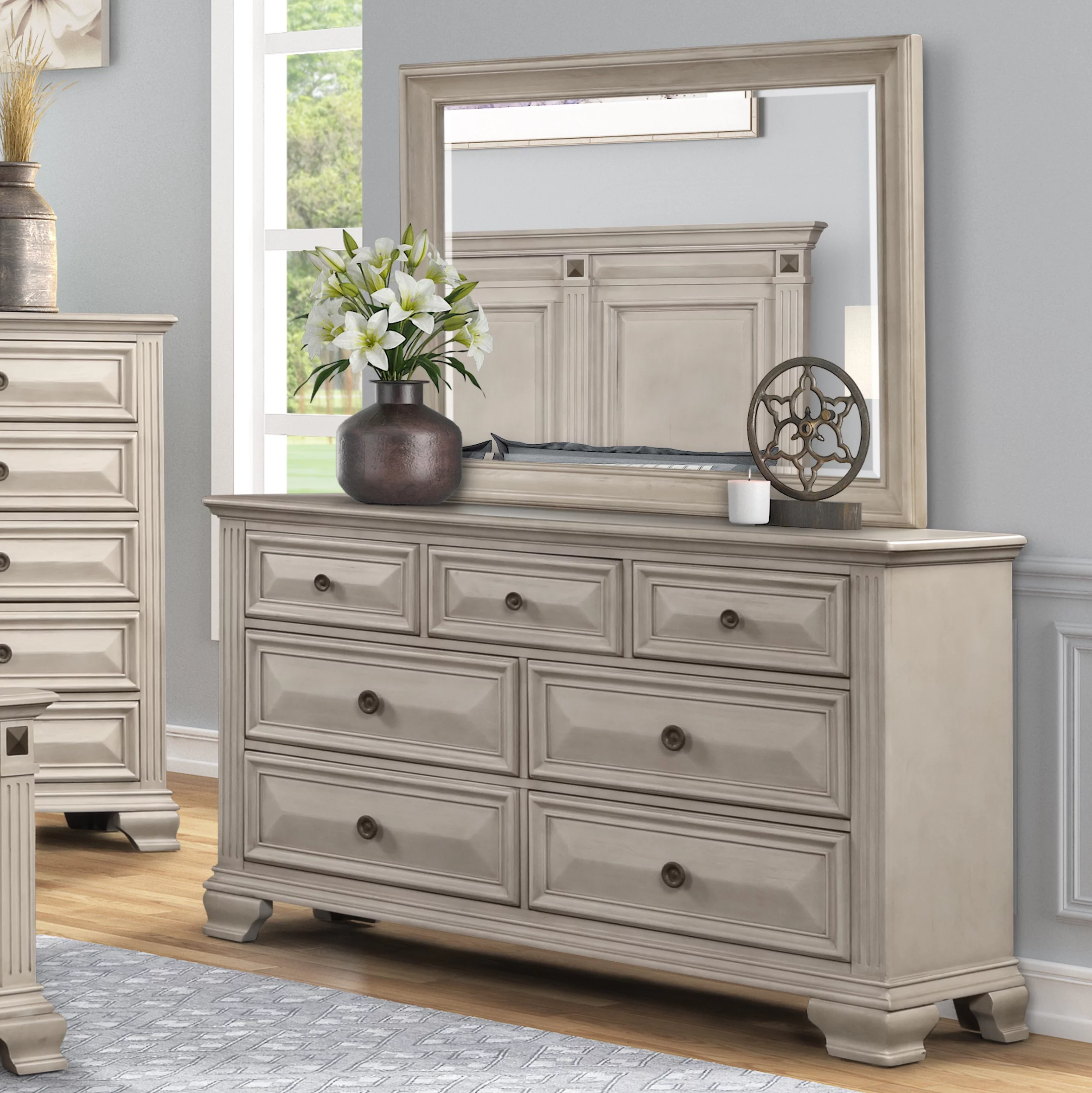 Renova Distressed Parchment Wood Bedroom Set, King Panel Bed, Dresser, Mirror, Two Nightstands, Chest