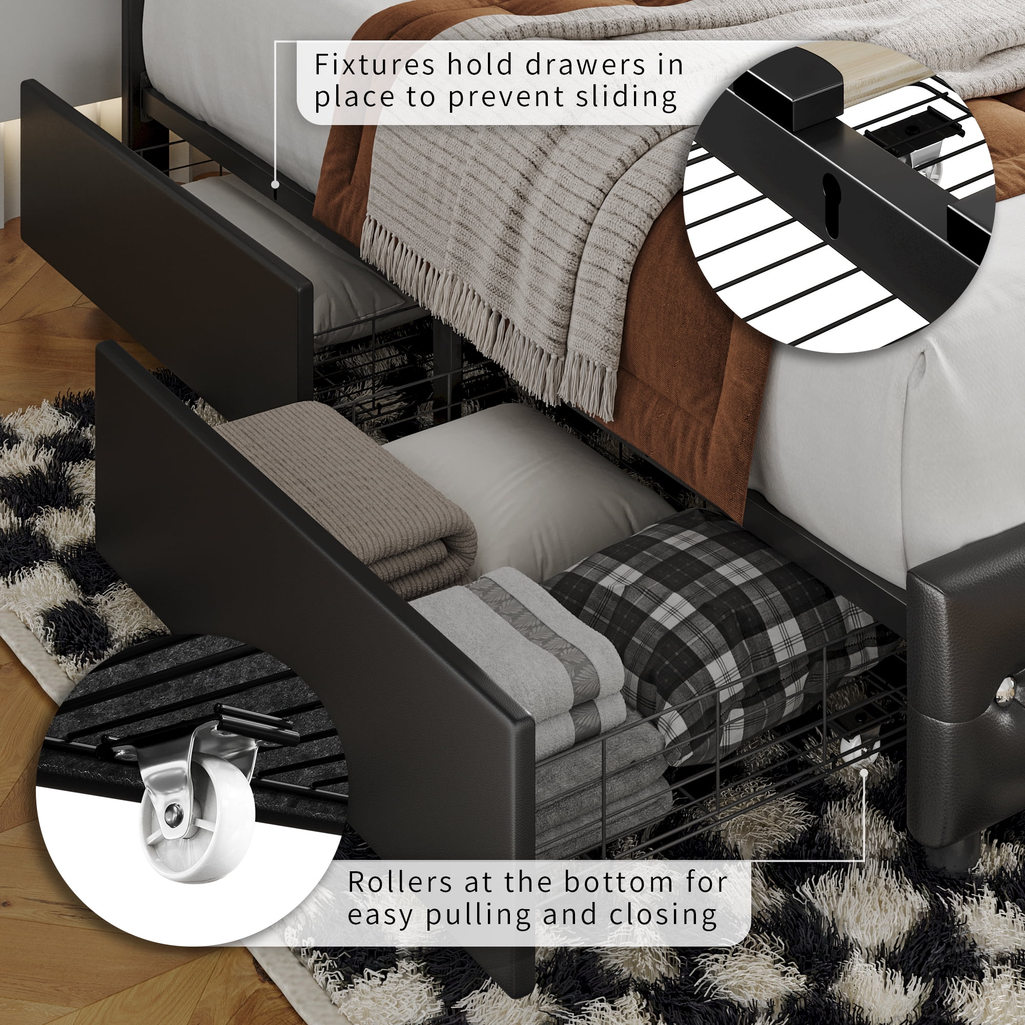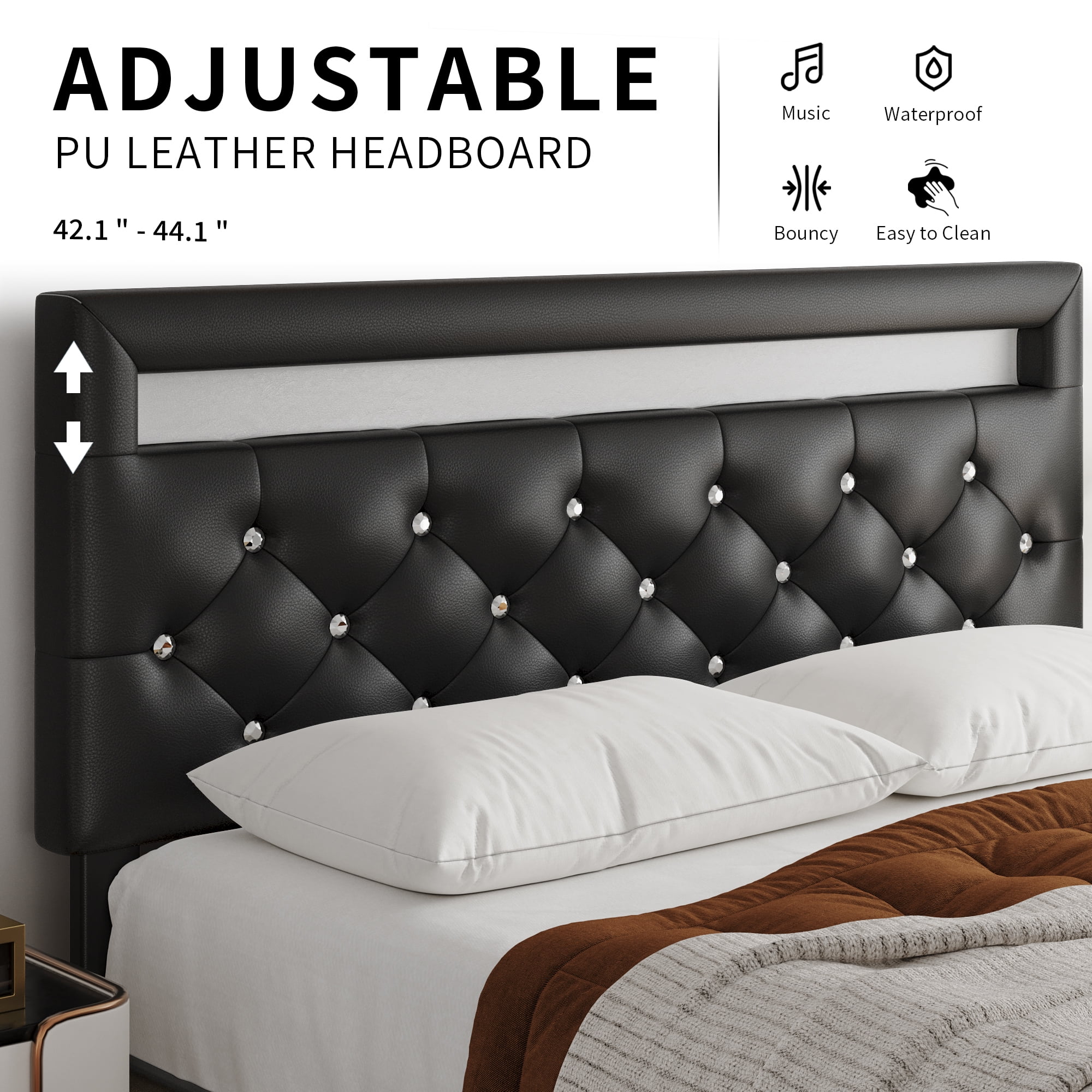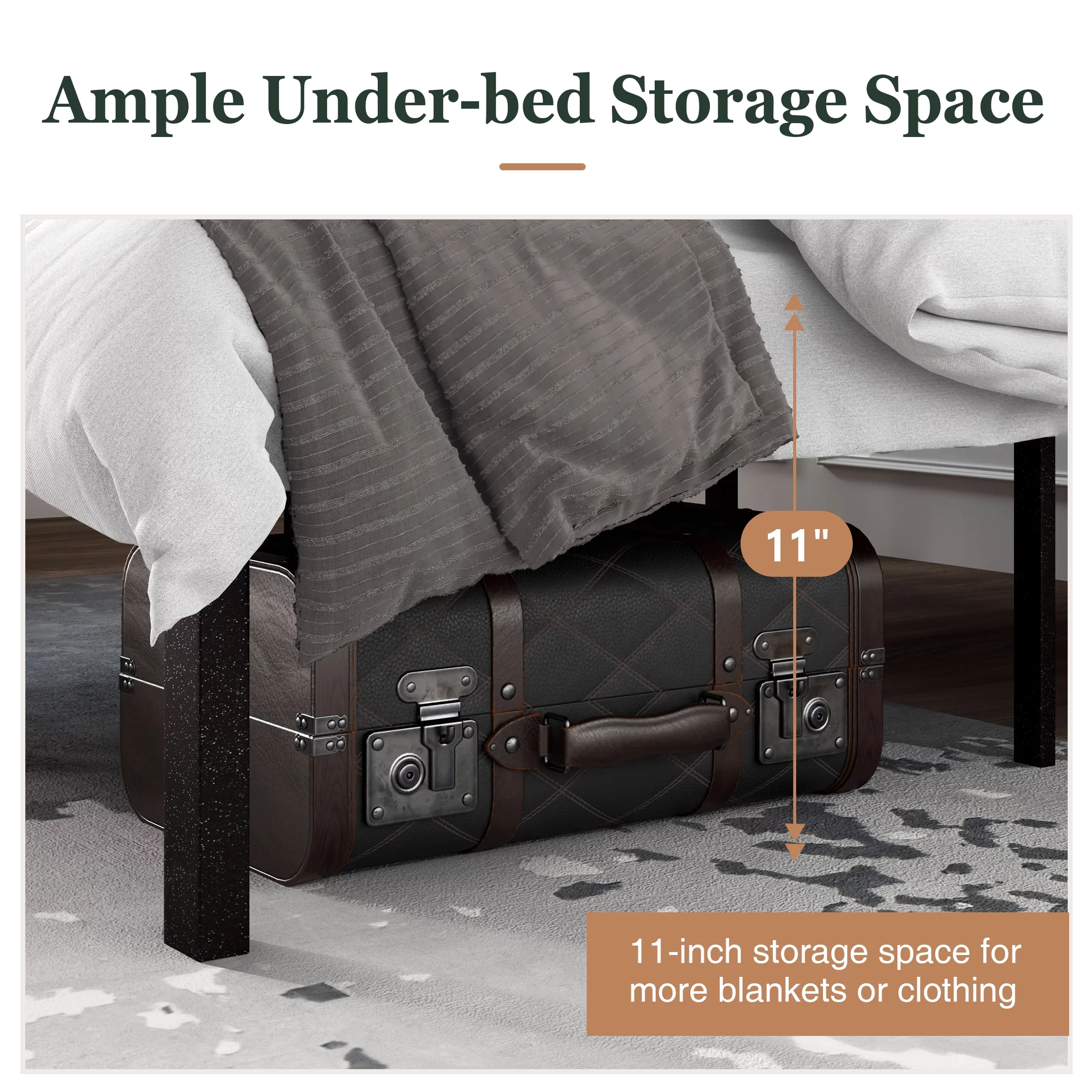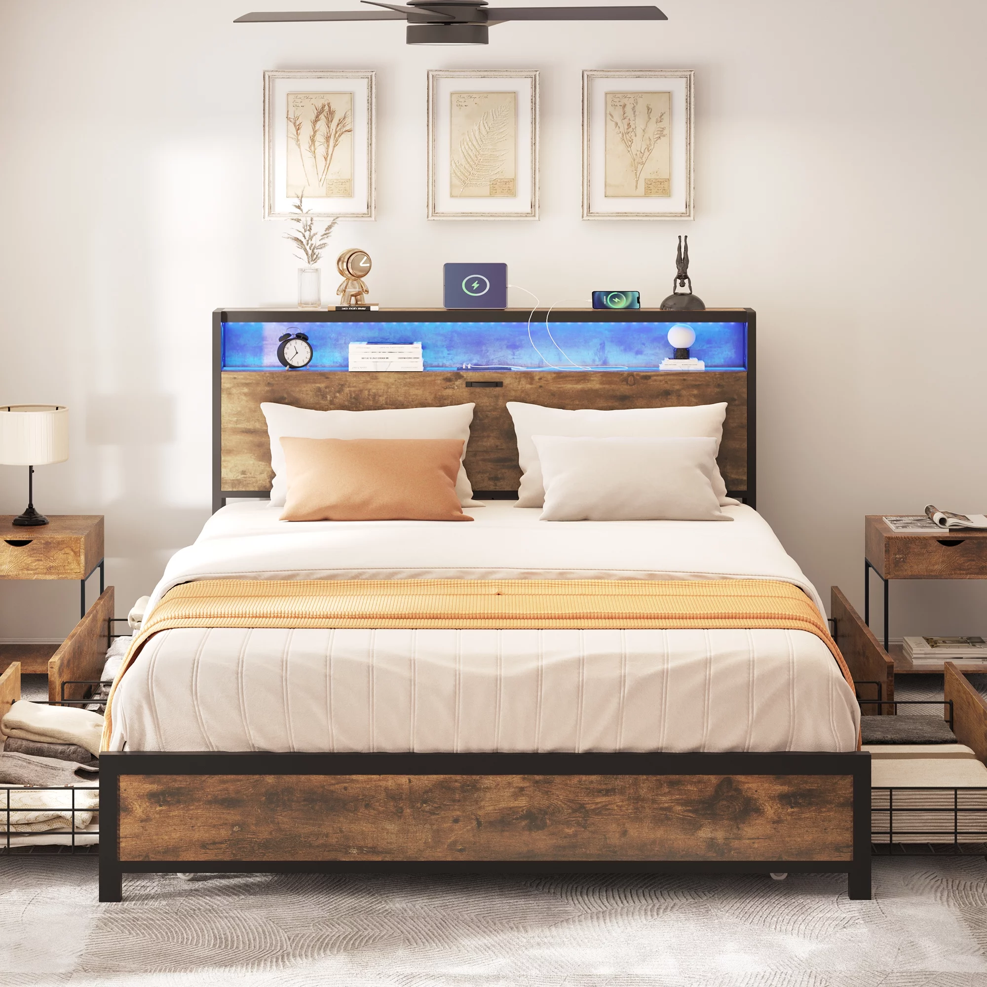 SHA CERLIN Brown Queen Size Industrial Metal Platform Bed Frame with Wooden Headboard & Storage, Adult
