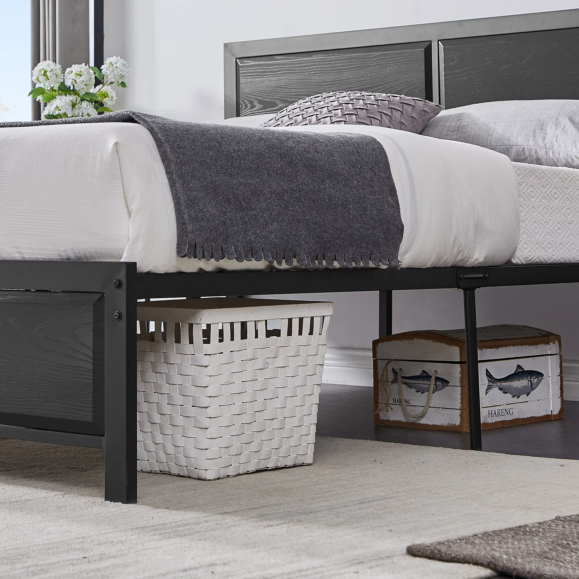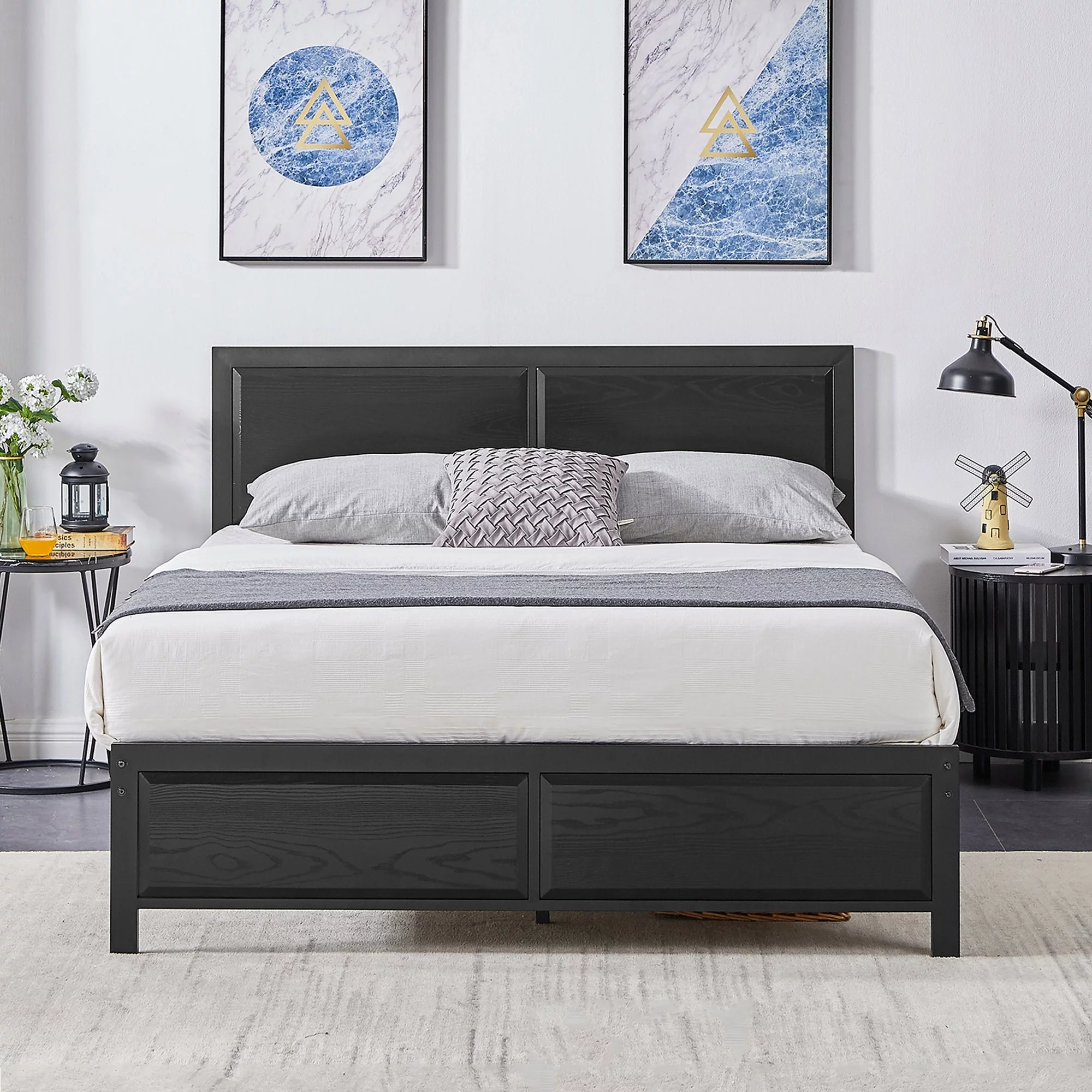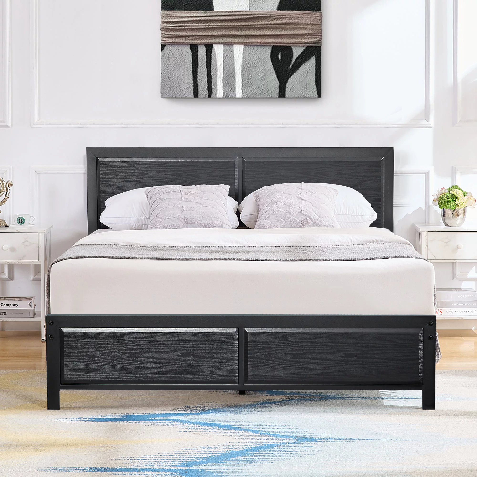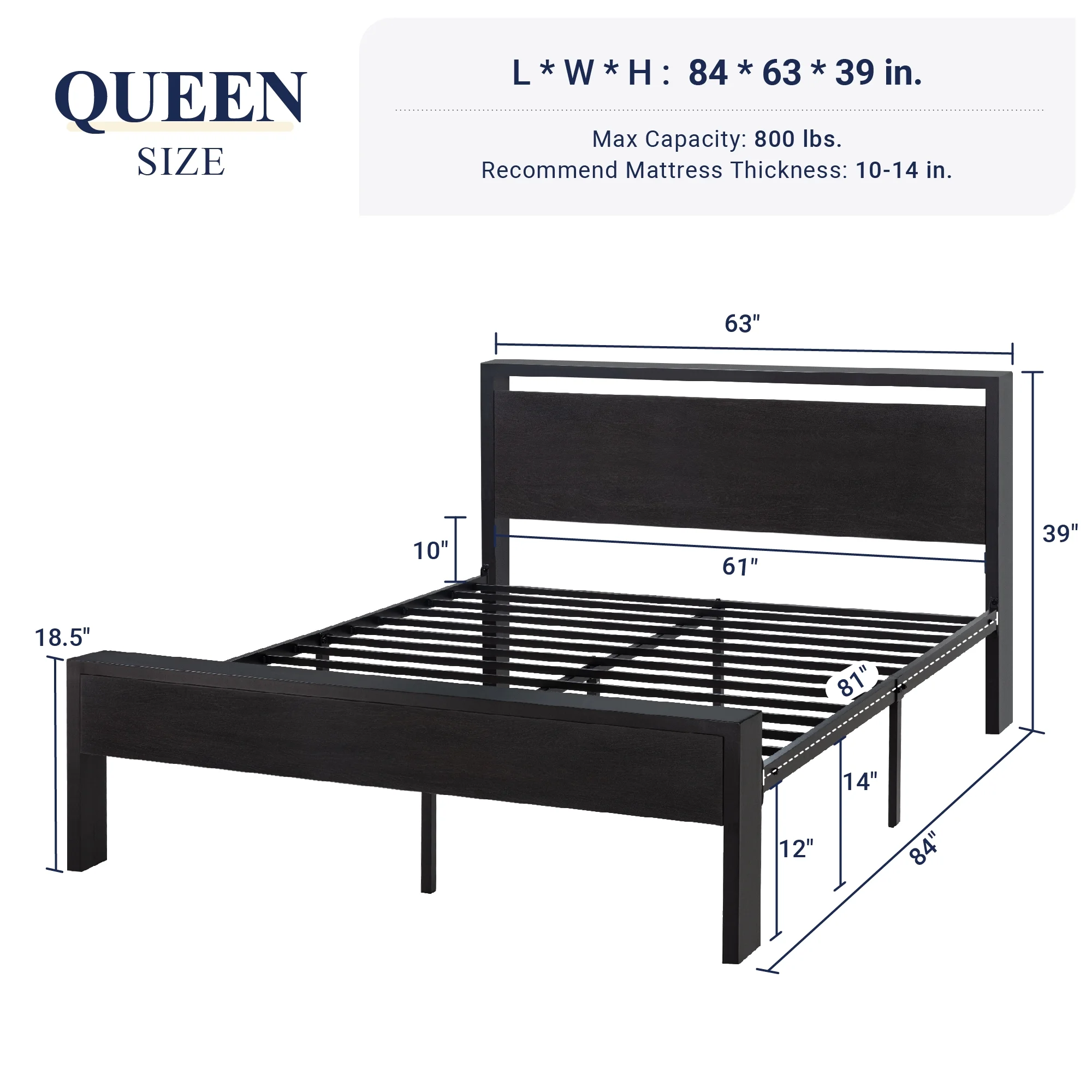 Allewie Black Oak Queen Size Metal Platform Bed Frame with Wood Headboard and Footboard & Metal Slat