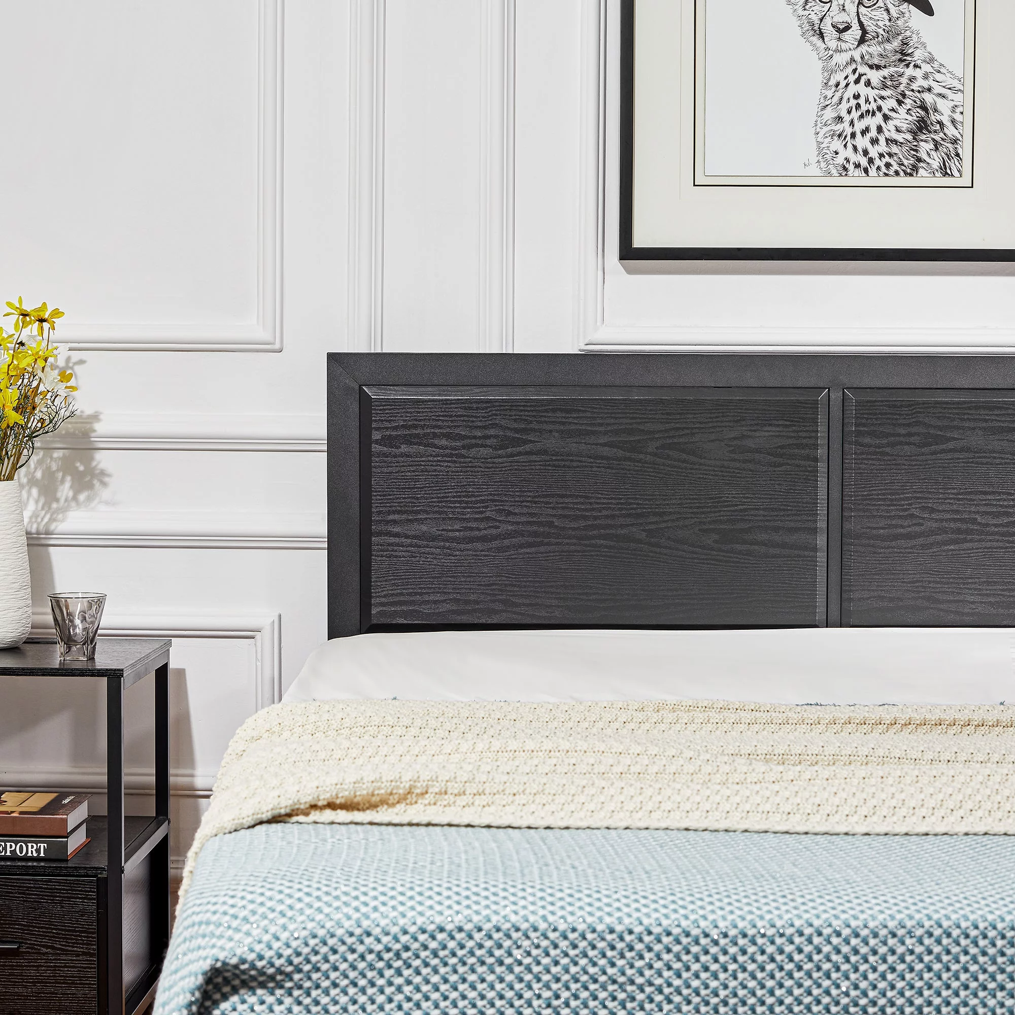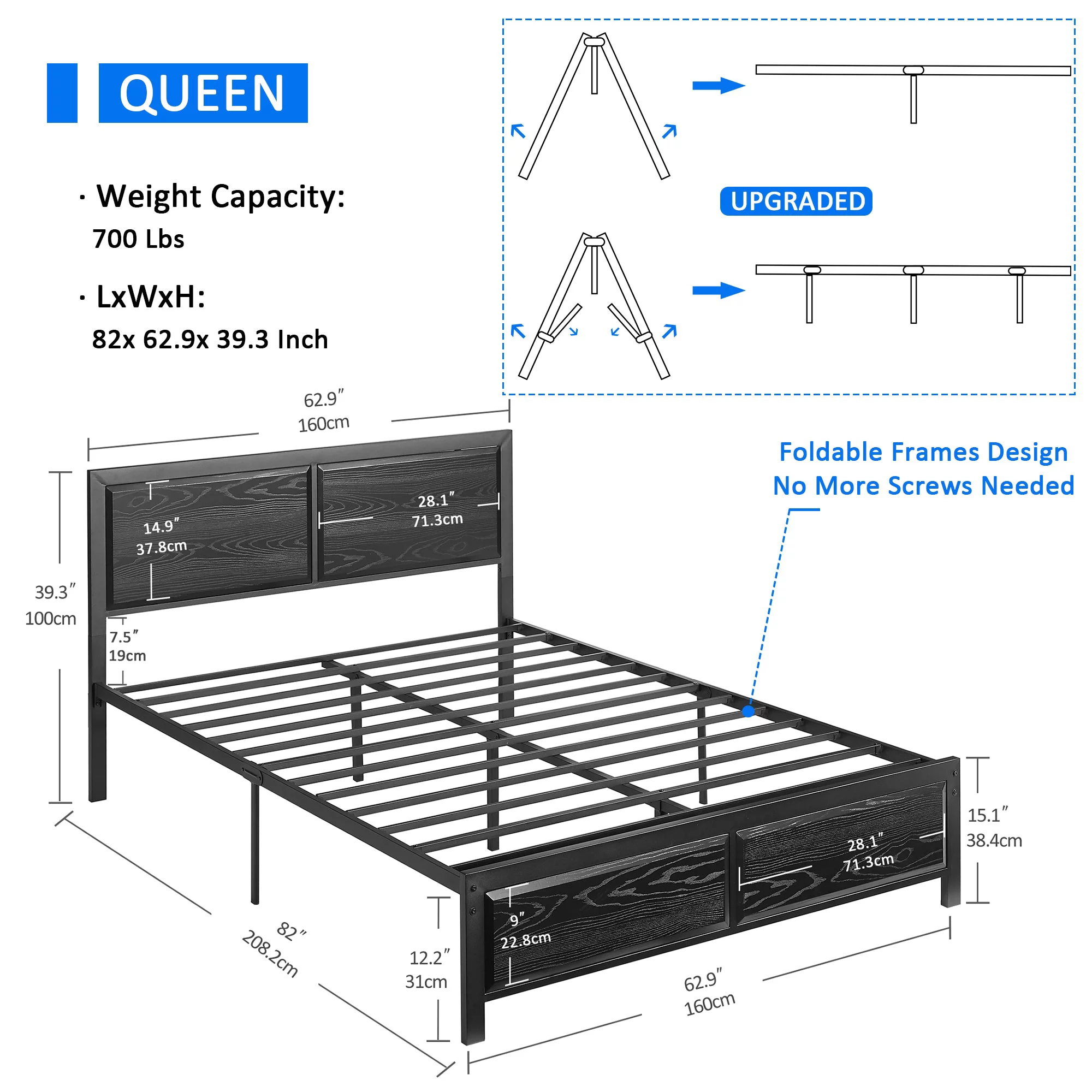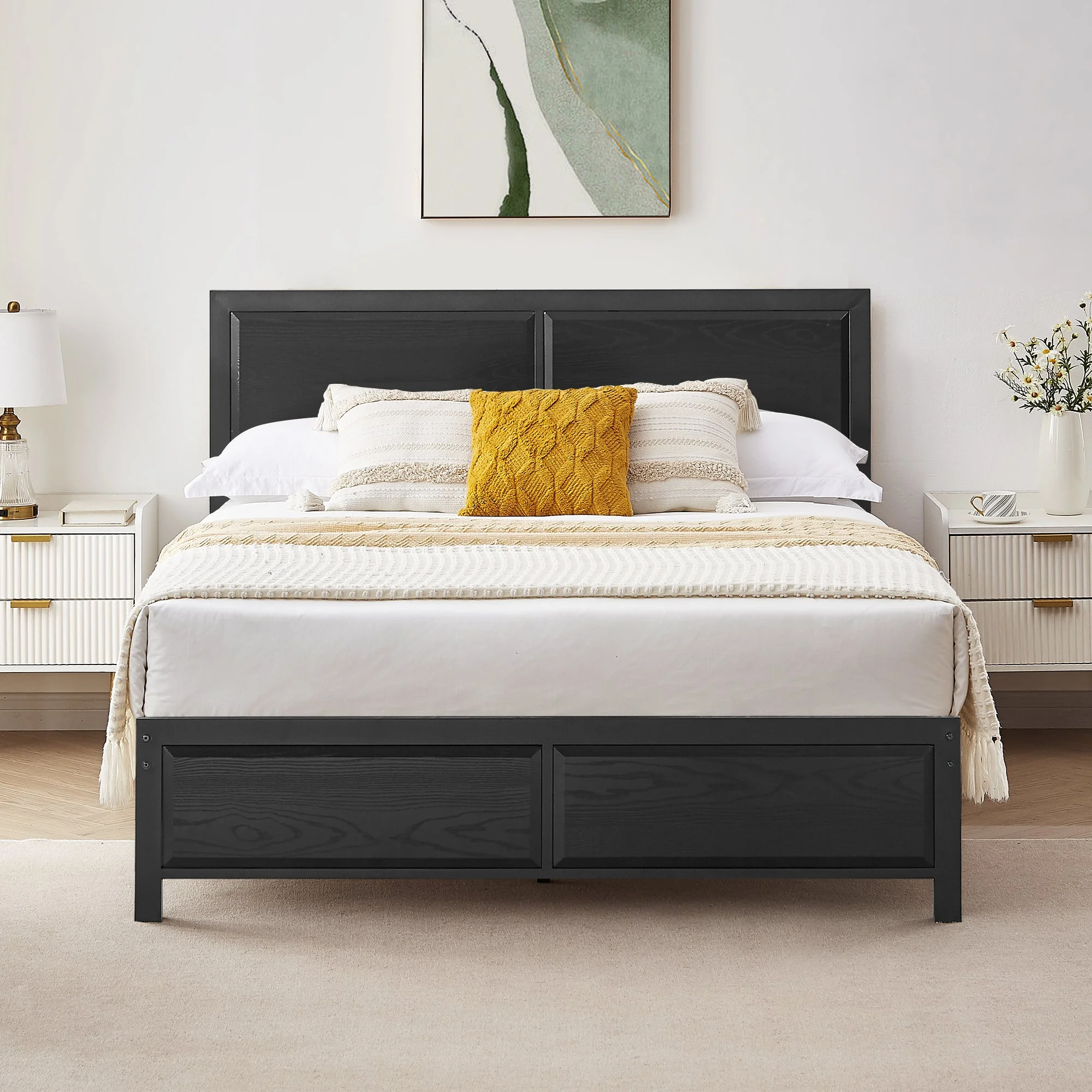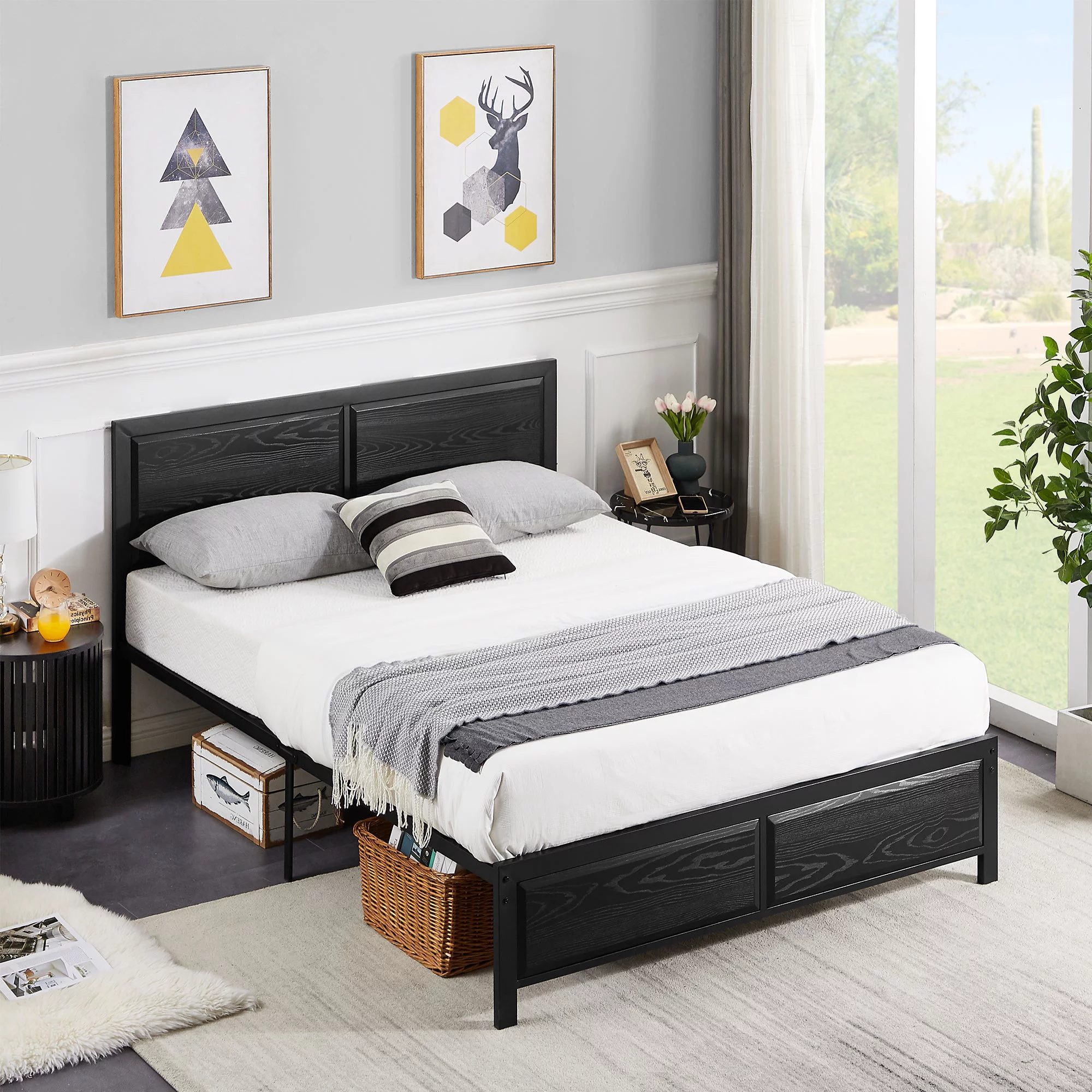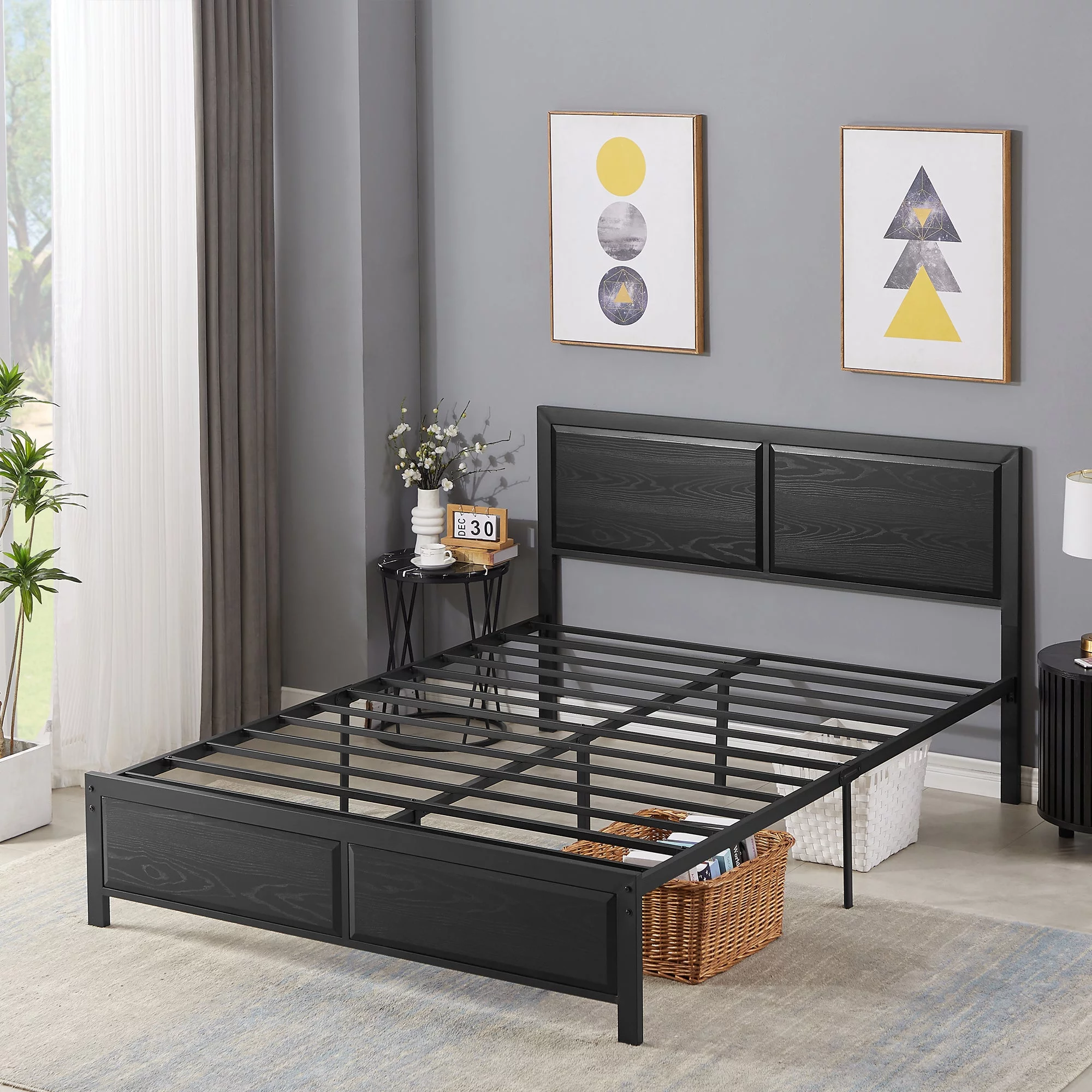 Allewie Black Oak Queen Size Metal Platform Bed Frame with Wood Headboard and Footboard & Metal Slat