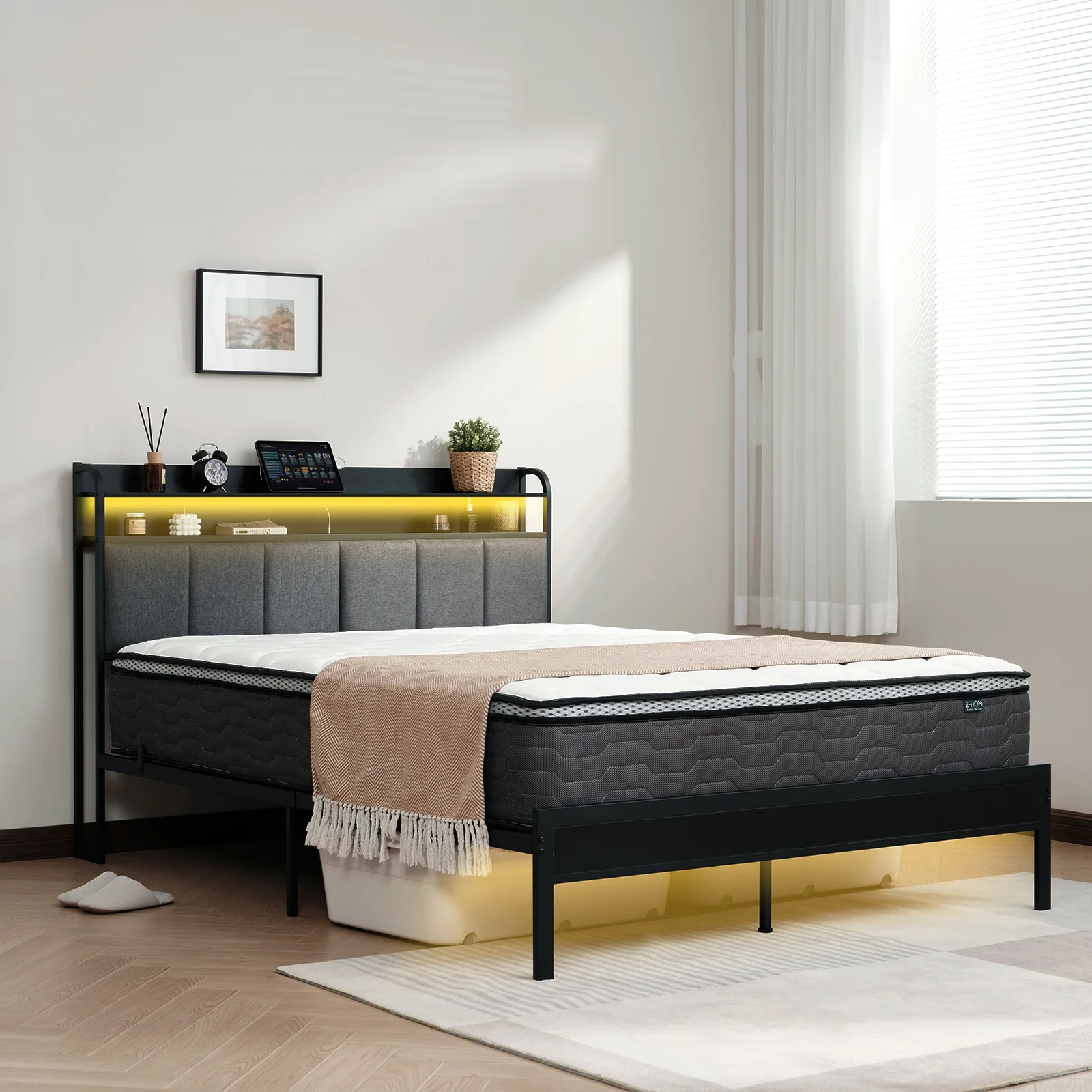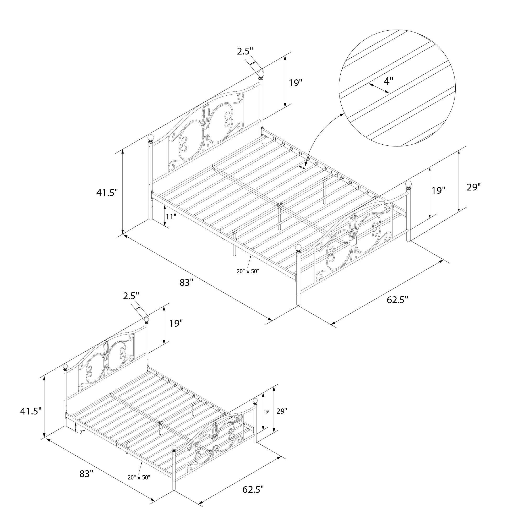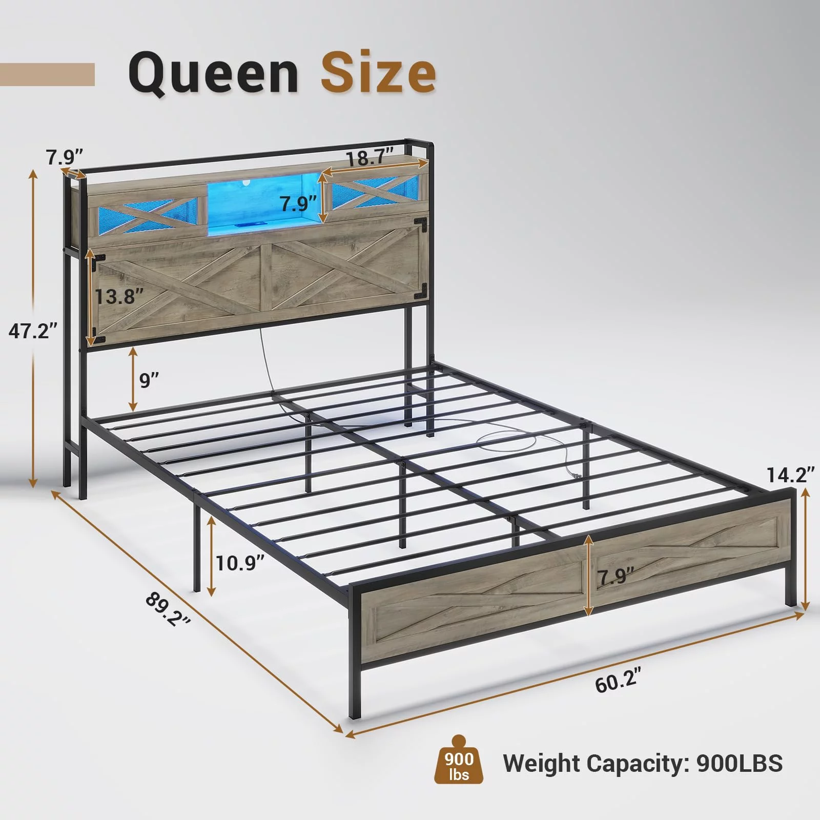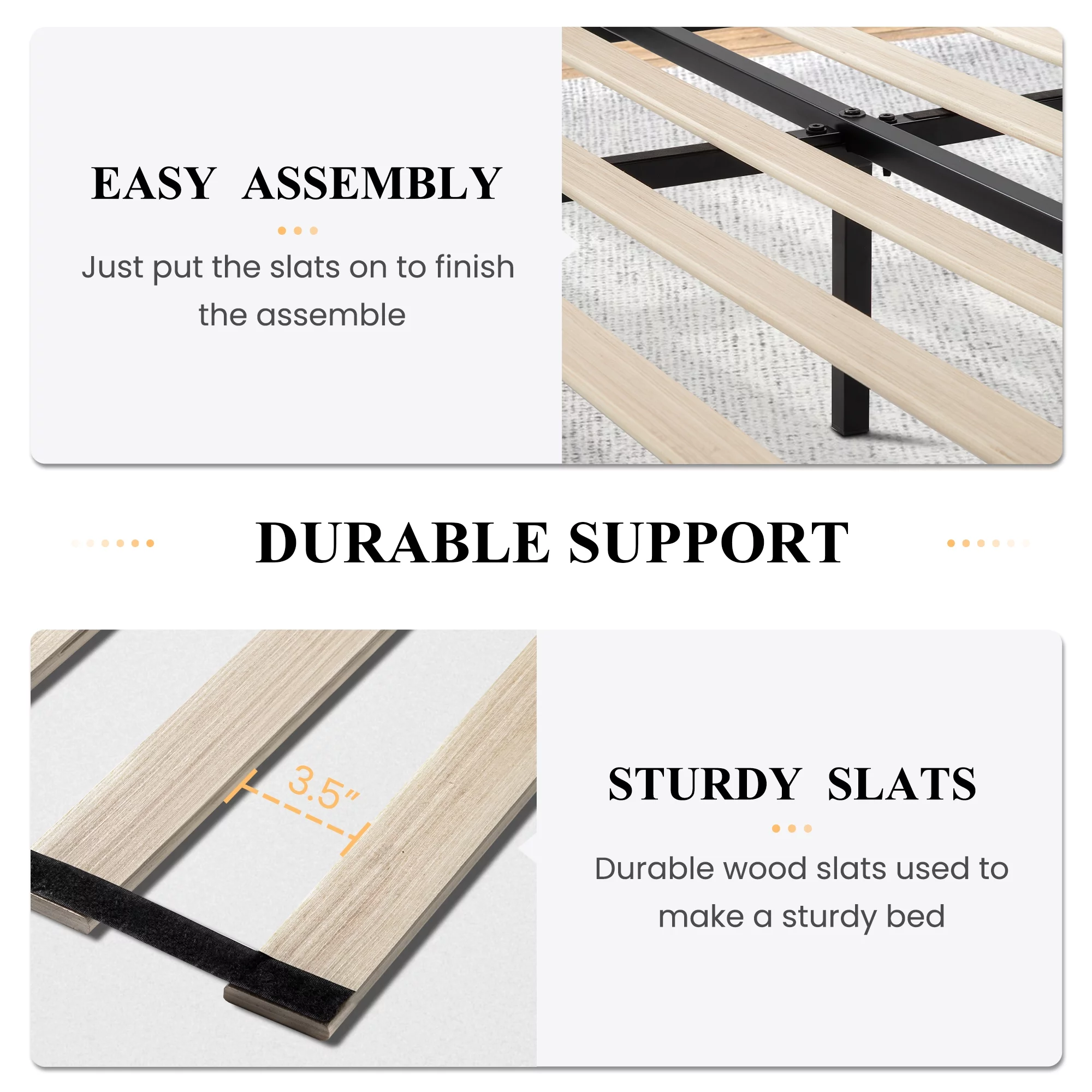 Allewie Black Oak Queen Size Metal Platform Bed Frame with Wood Headboard and Footboard & Metal Slat