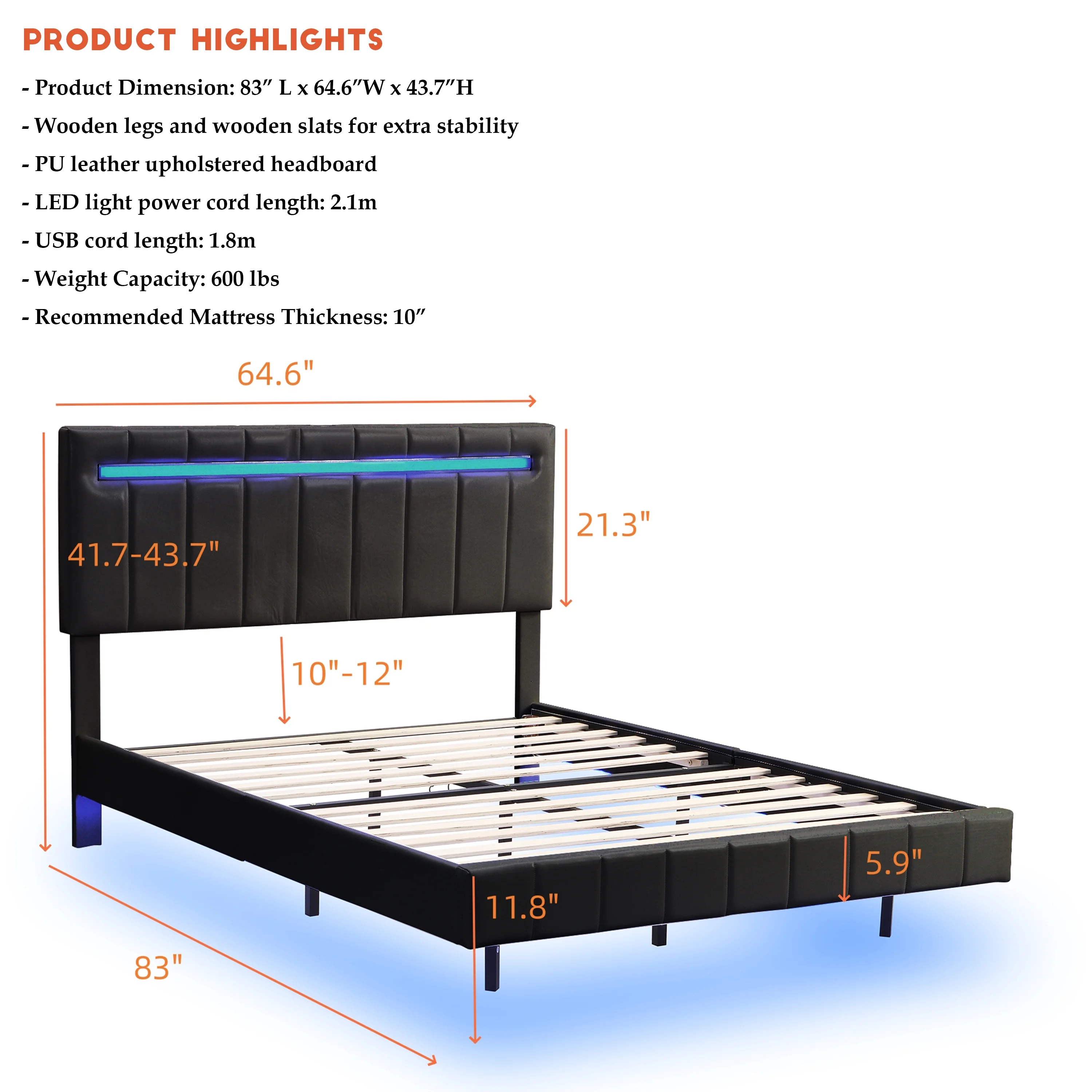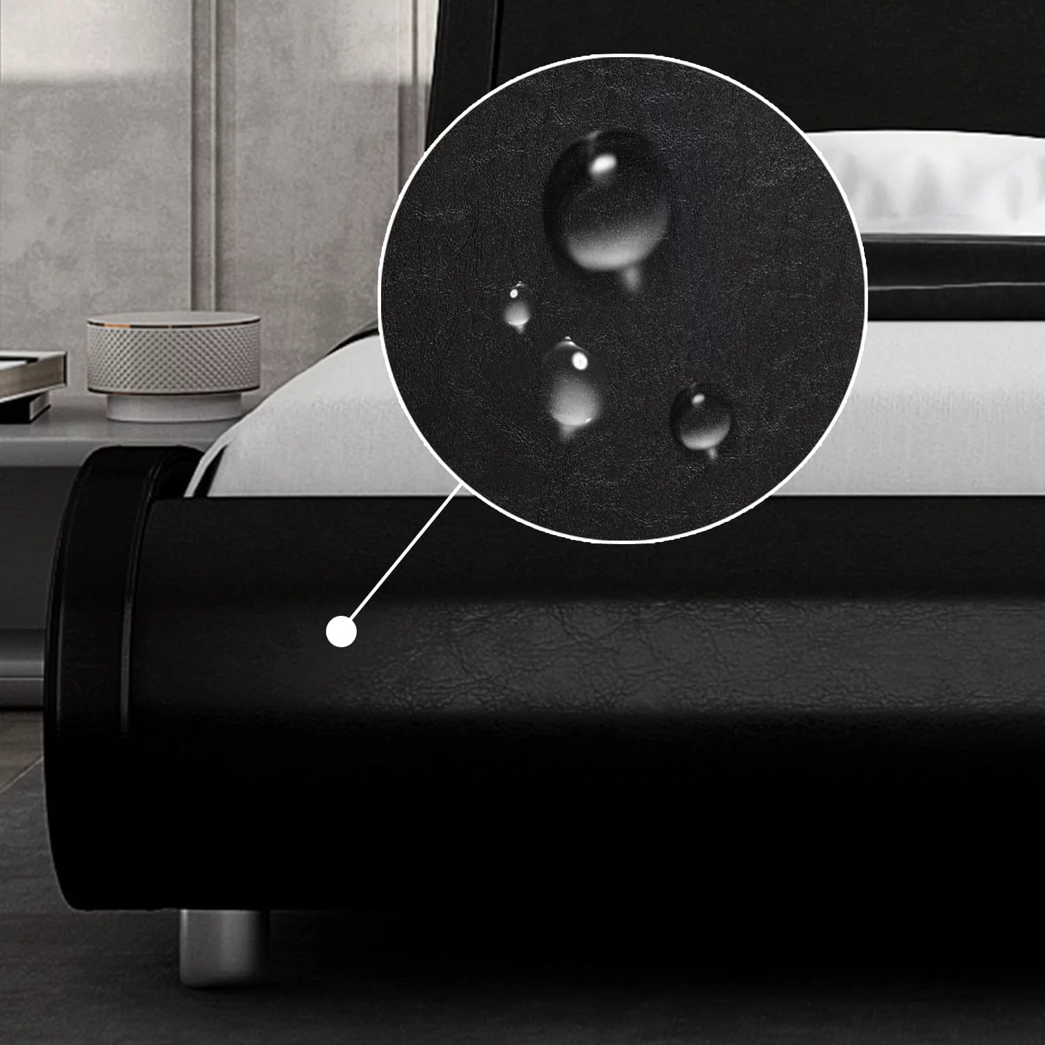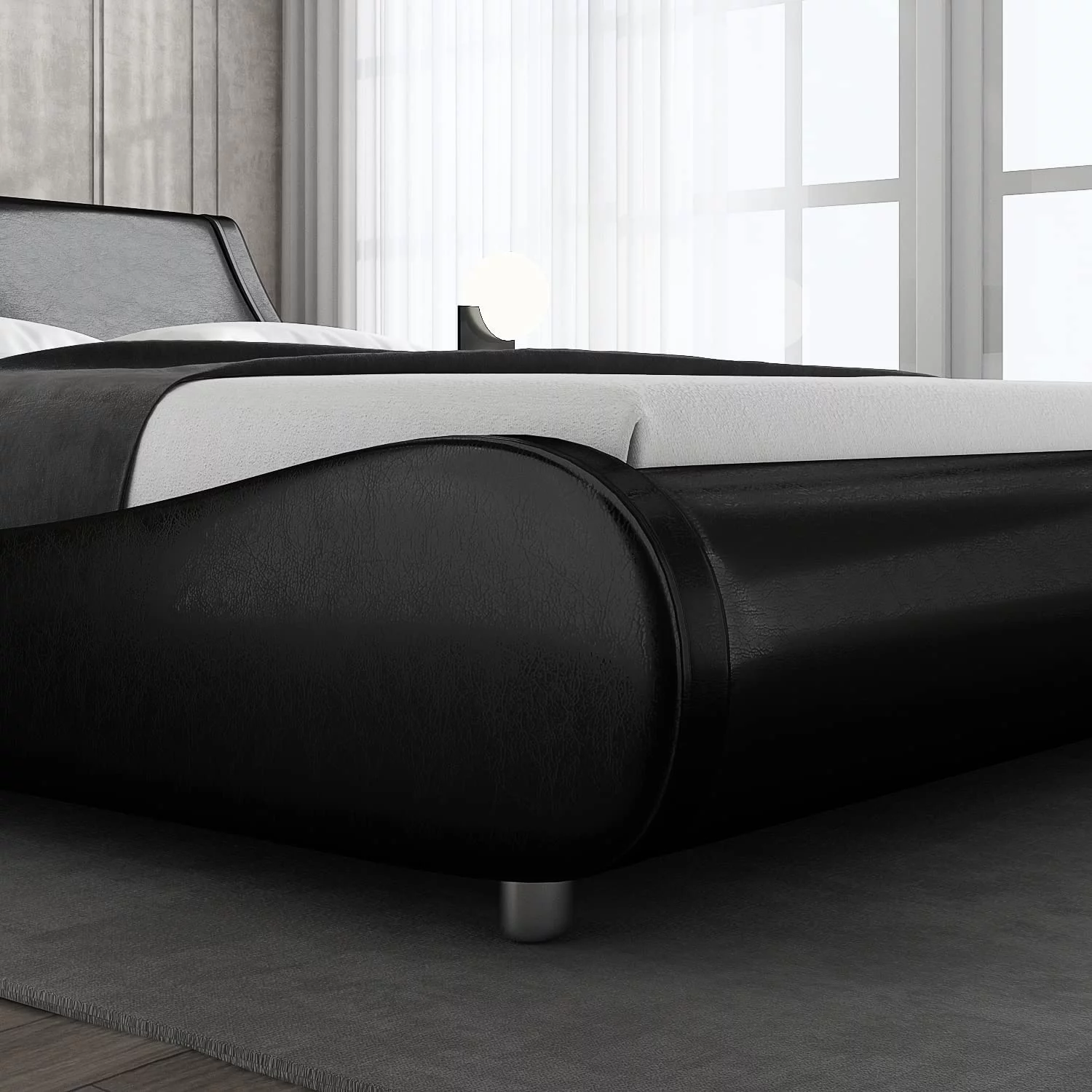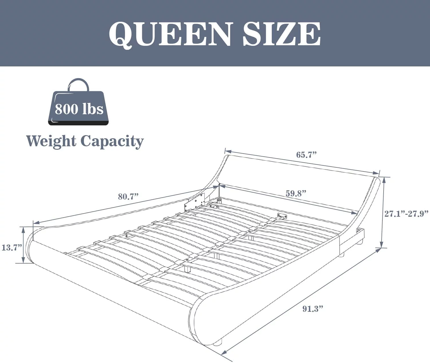 Allewie Low Profile Wave-Like Queen Size Platform Bed Frame with Leather Curved Adjustable Headboard, Glossy Black