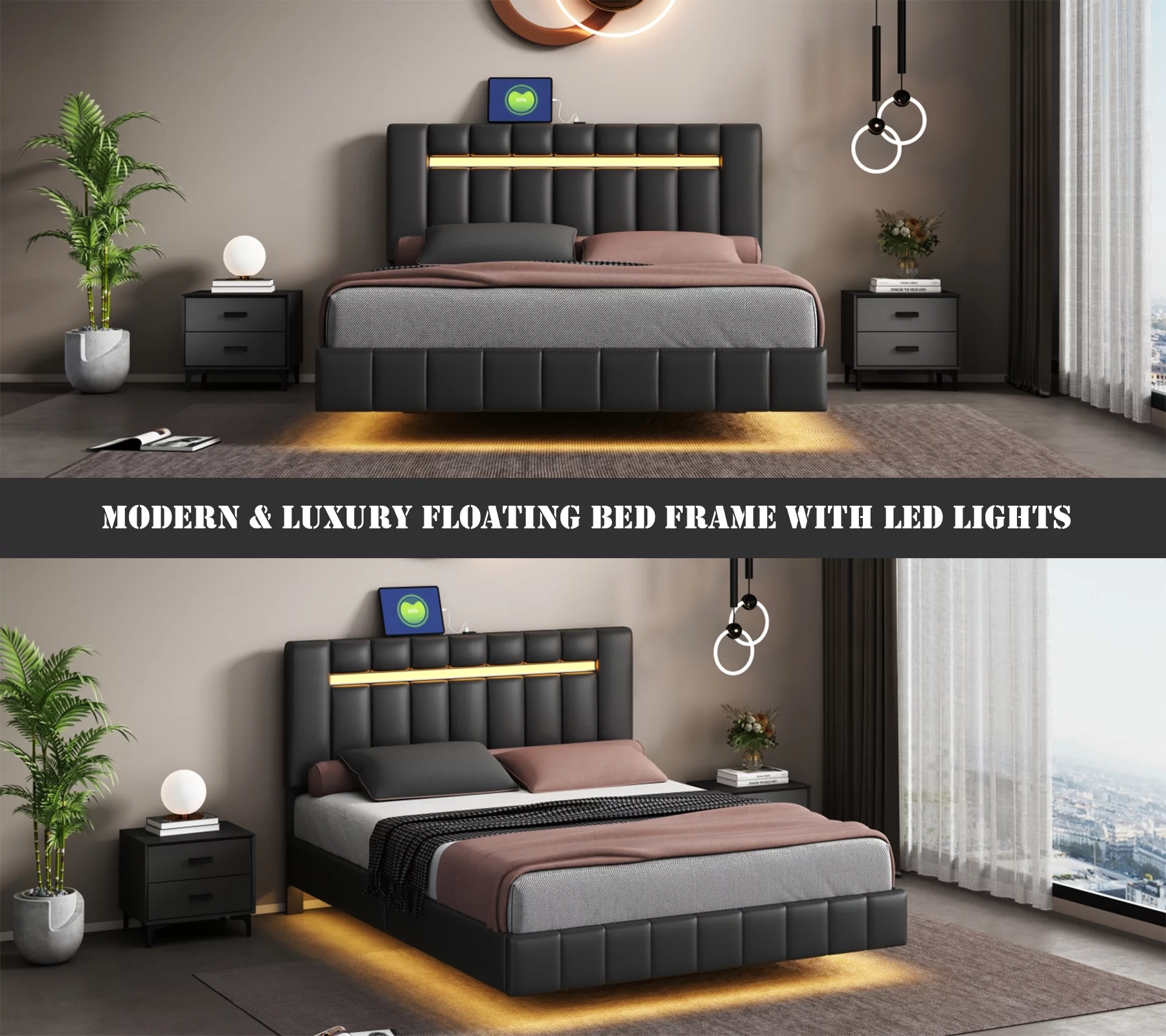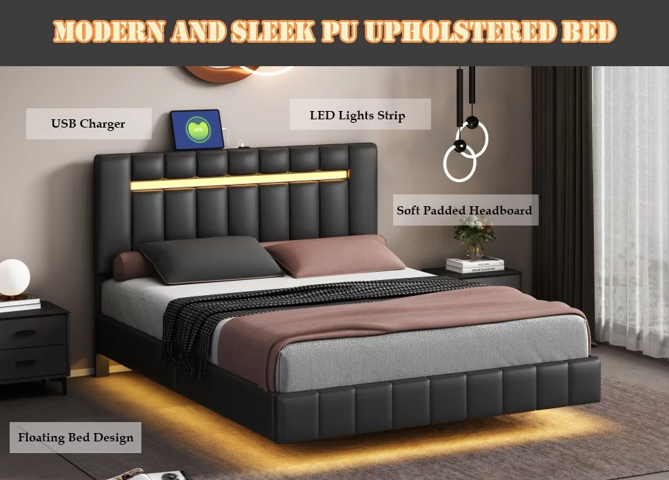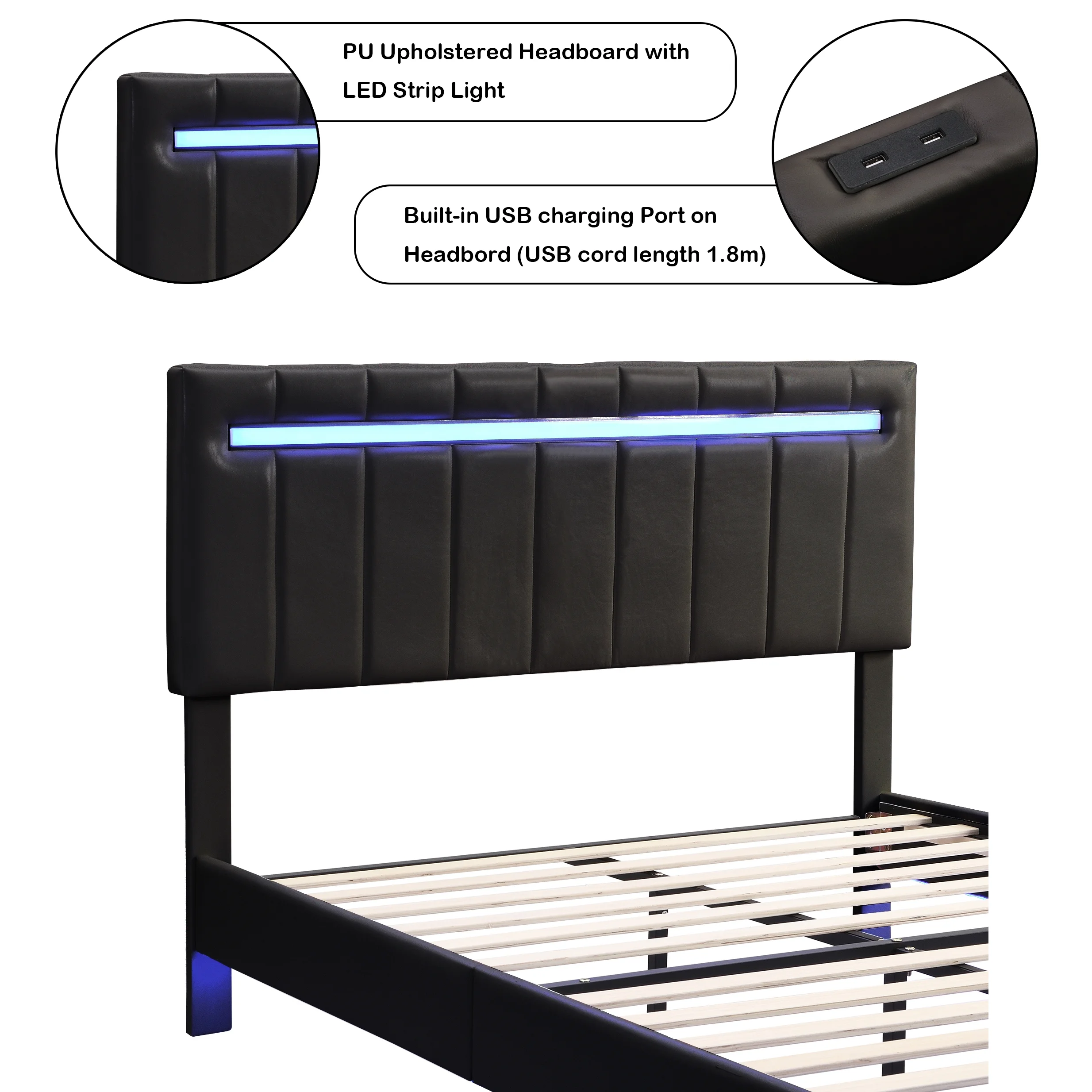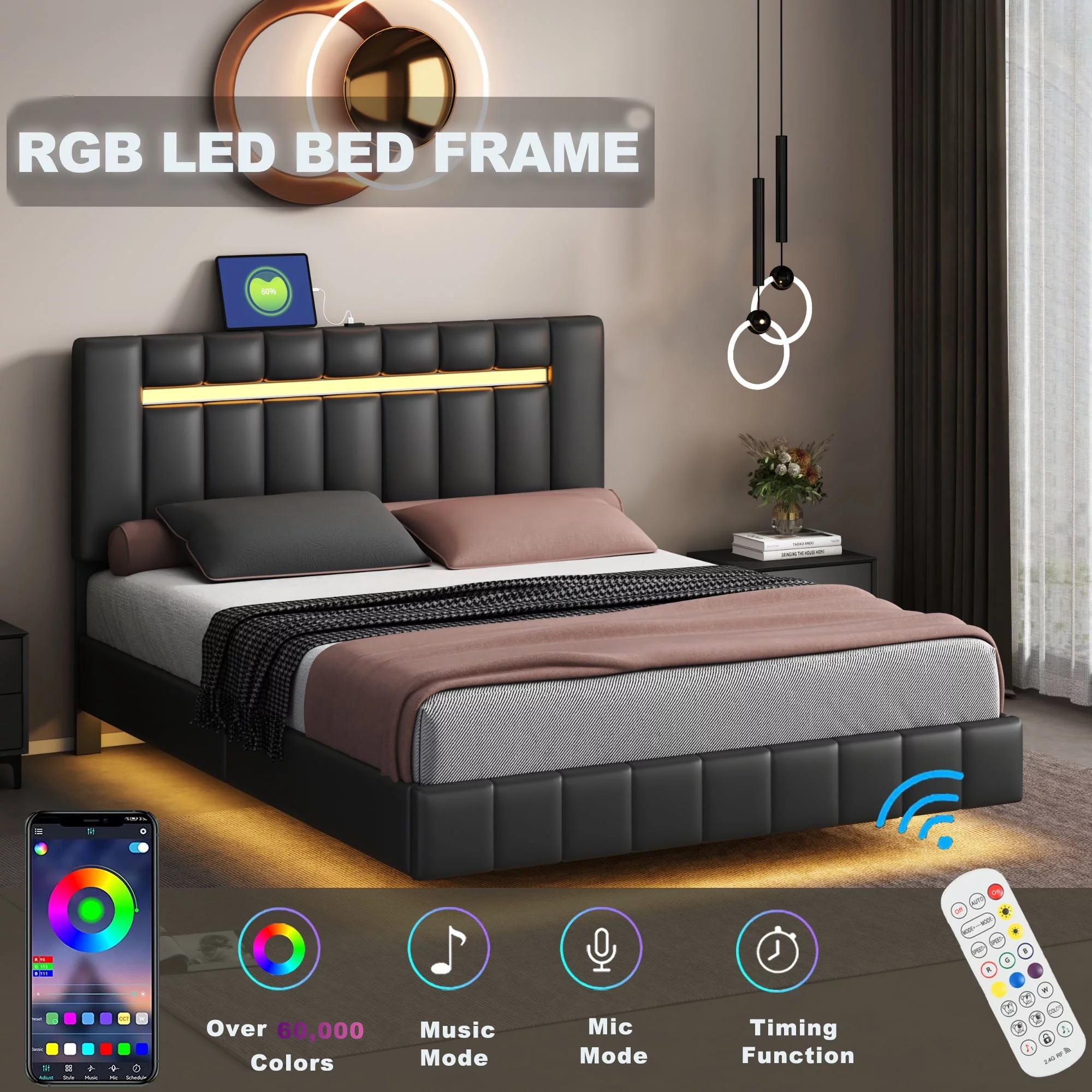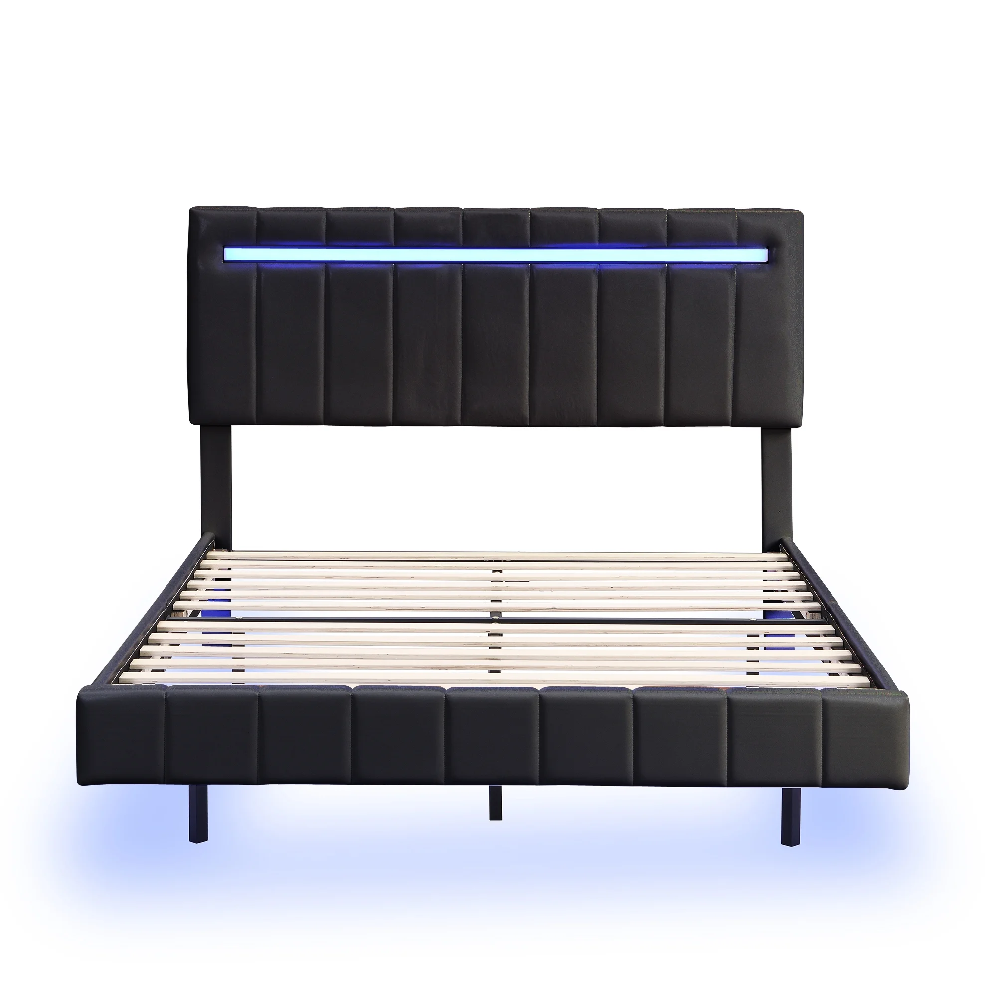 Allewie Low Profile Wave-Like Queen Size Platform Bed Frame with Leather Curved Adjustable Headboard, Glossy Black