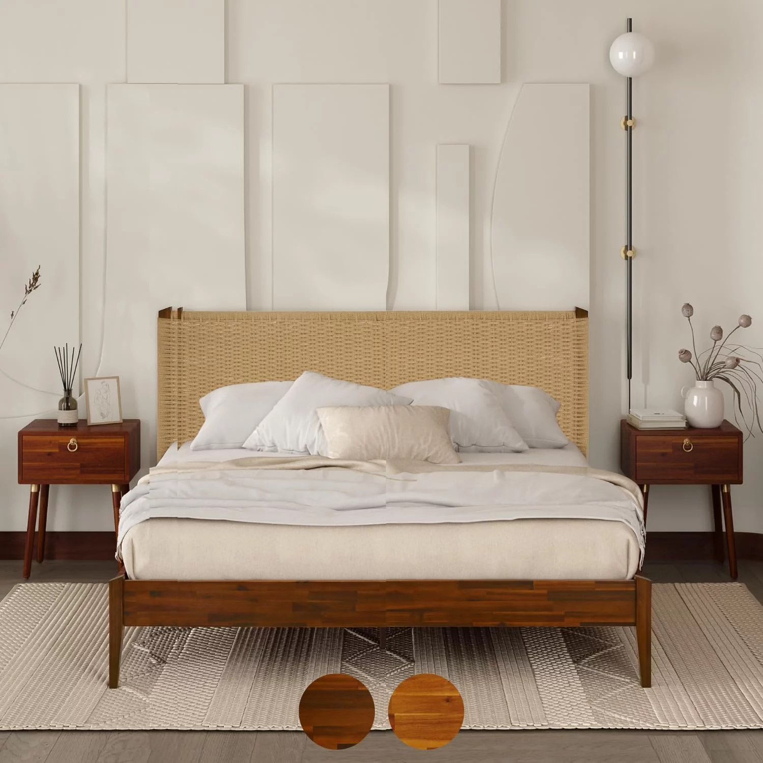 Baxton Studio Rina Mid-Century Modern Ash Wanut Finished Wood and Synthetic Rattan King Size Wrap-Around Headboard