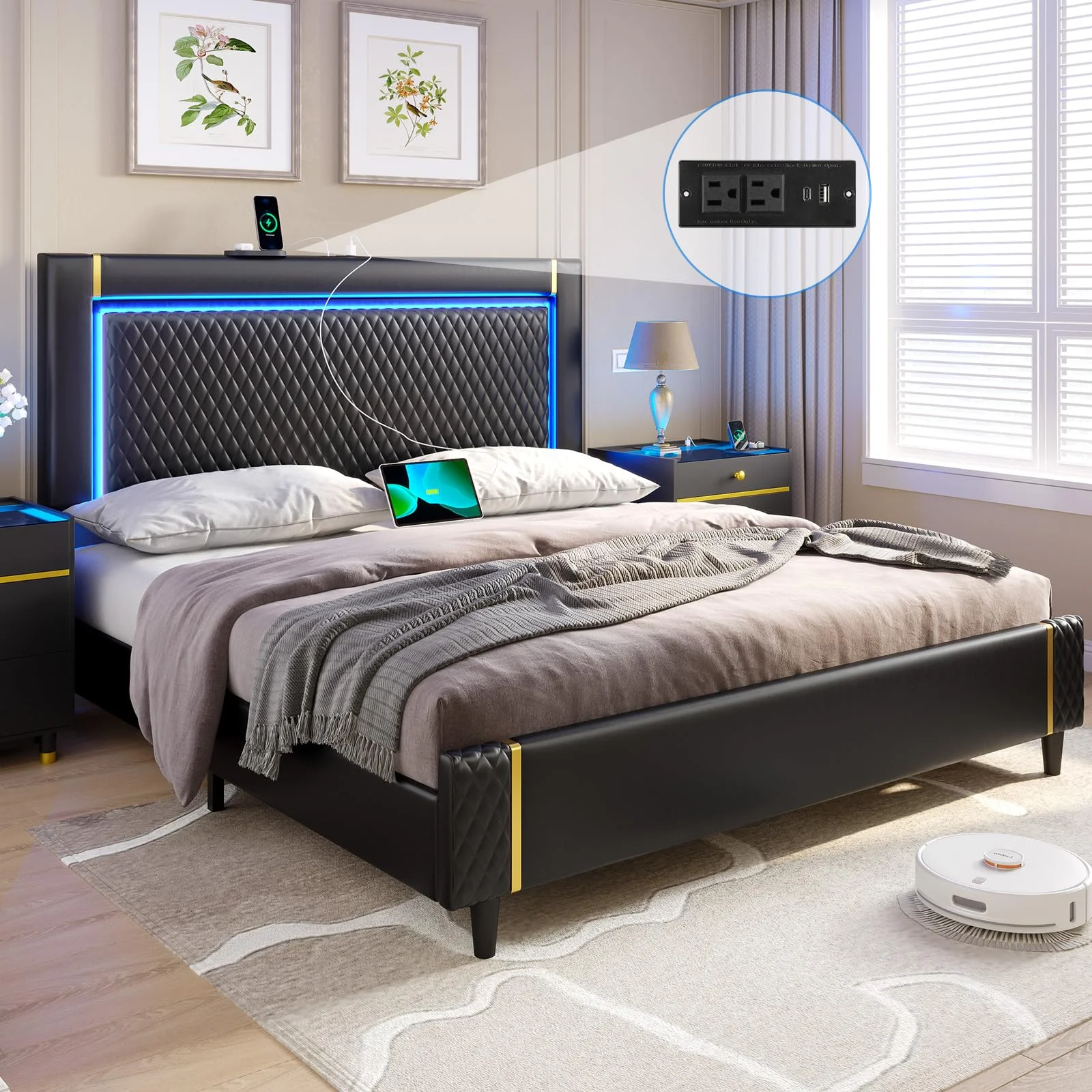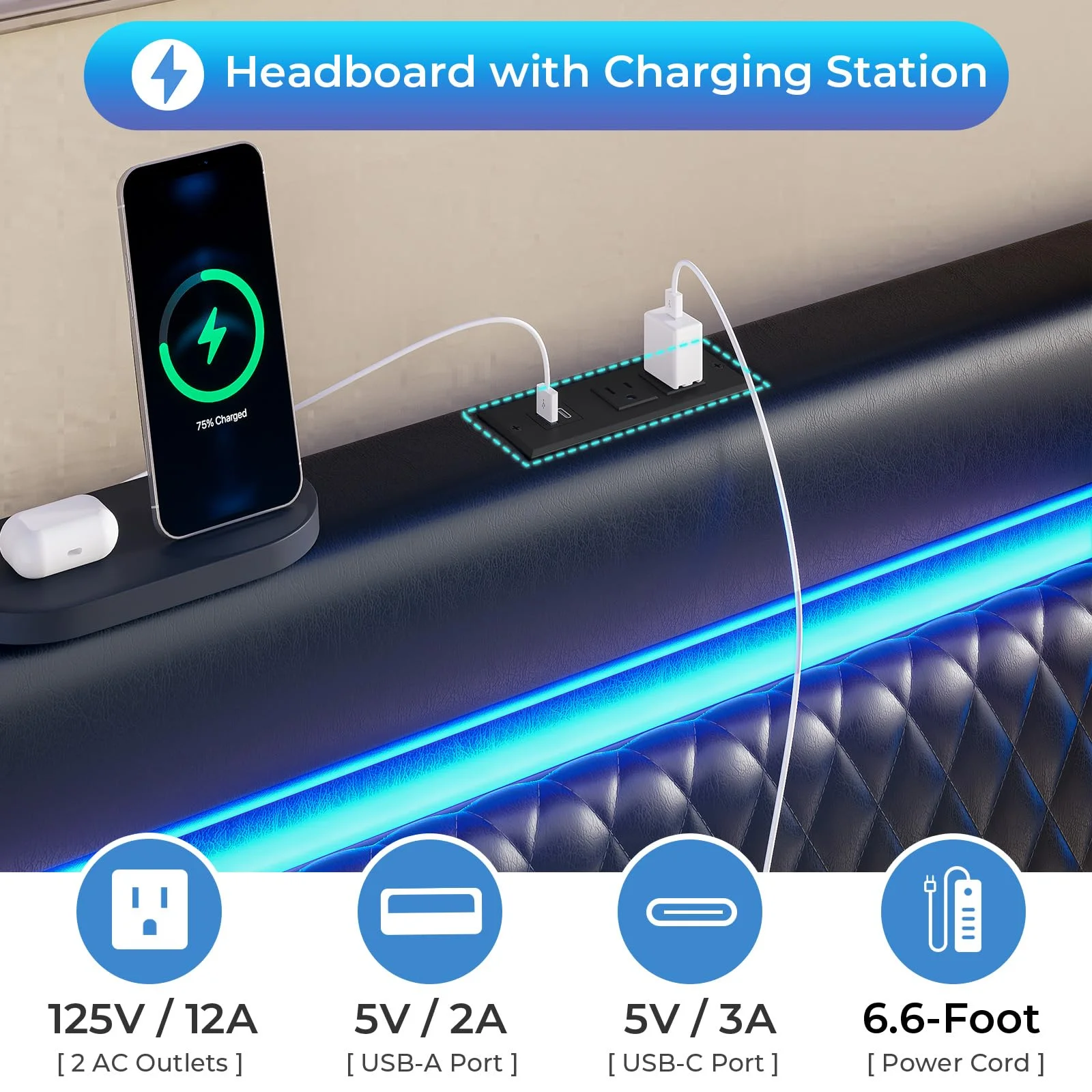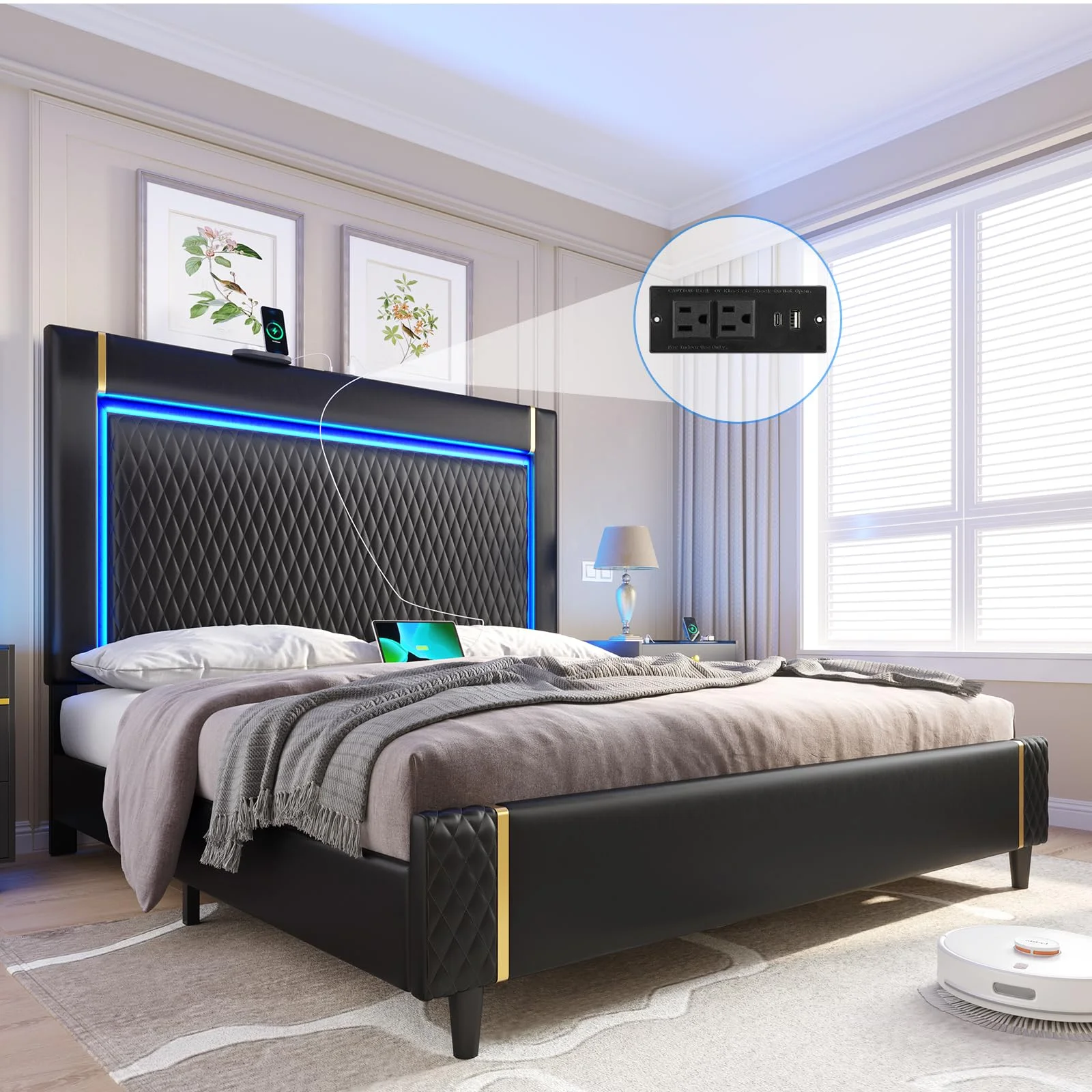 Afuhokles King Bed Frame with Charging Station, Upholstered Bed Frame with LED Lights and Adjustable Headboard, Black