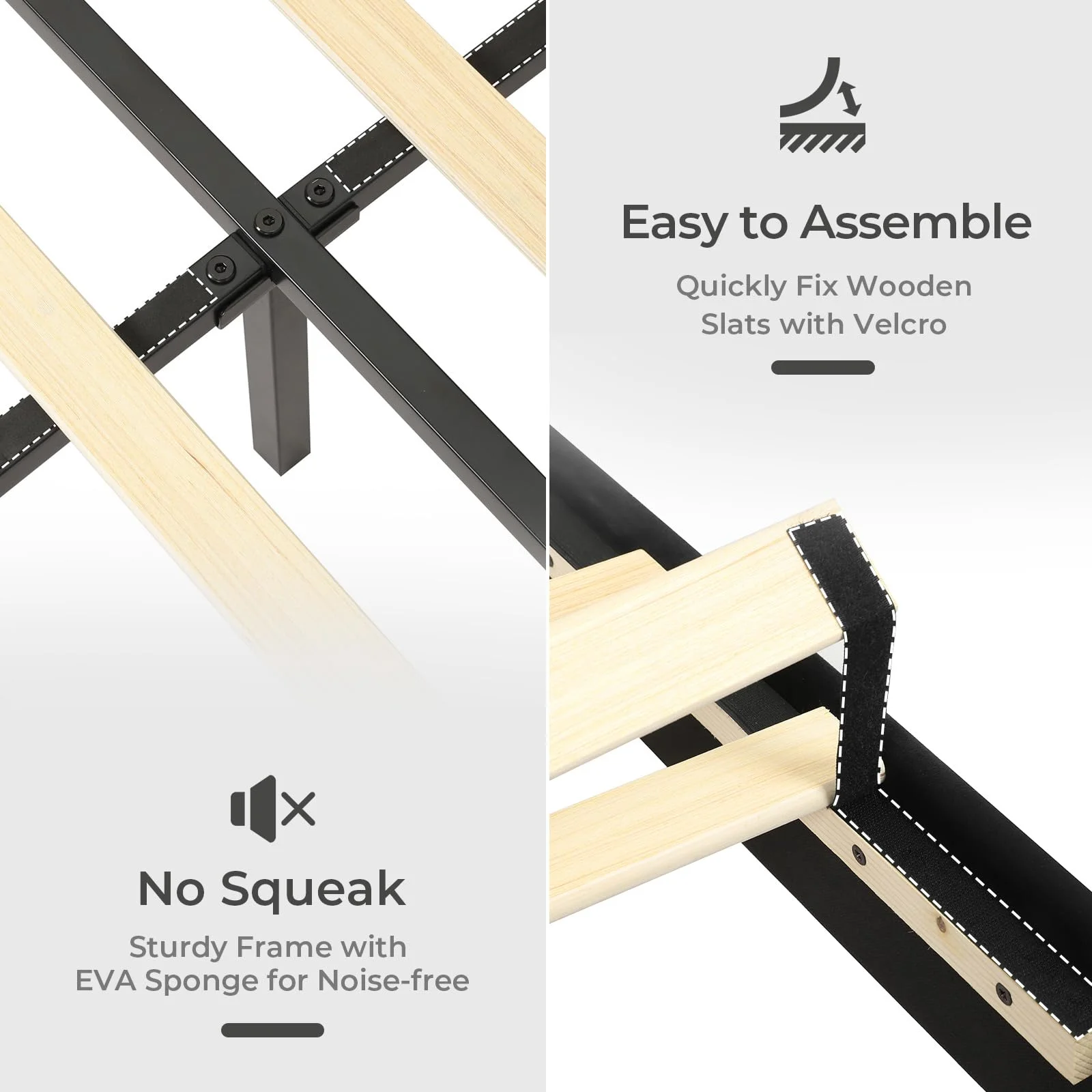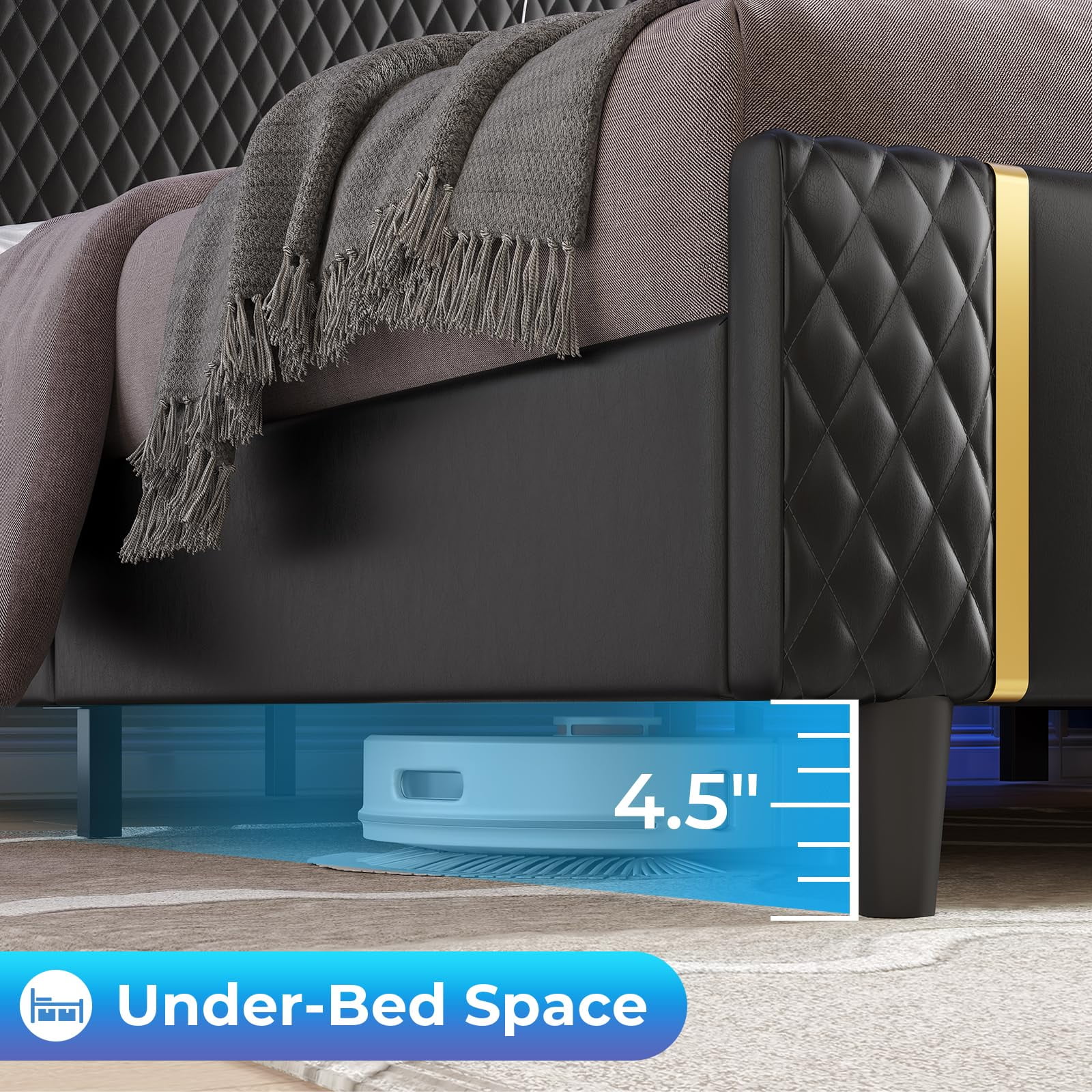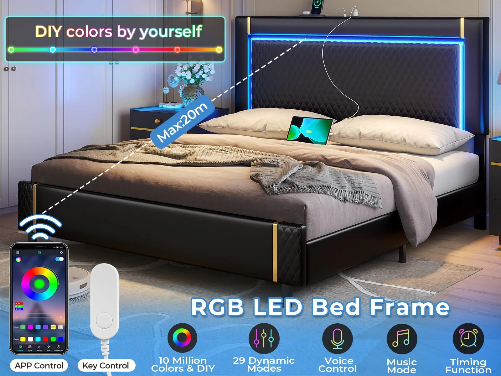Afuhokles King Bed Frame with Charging Station, Upholstered Bed Frame with LED Lights and Adjustable Headboard, Black