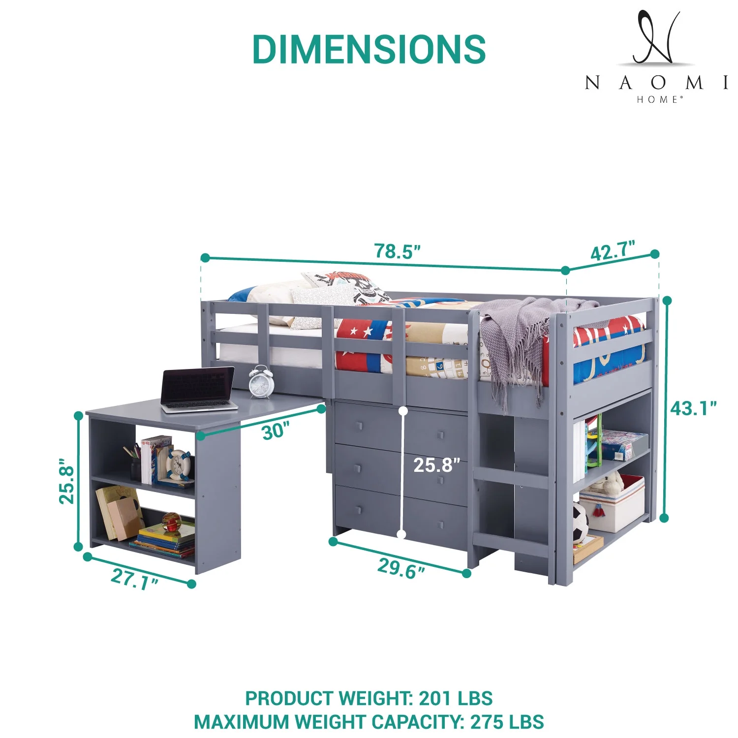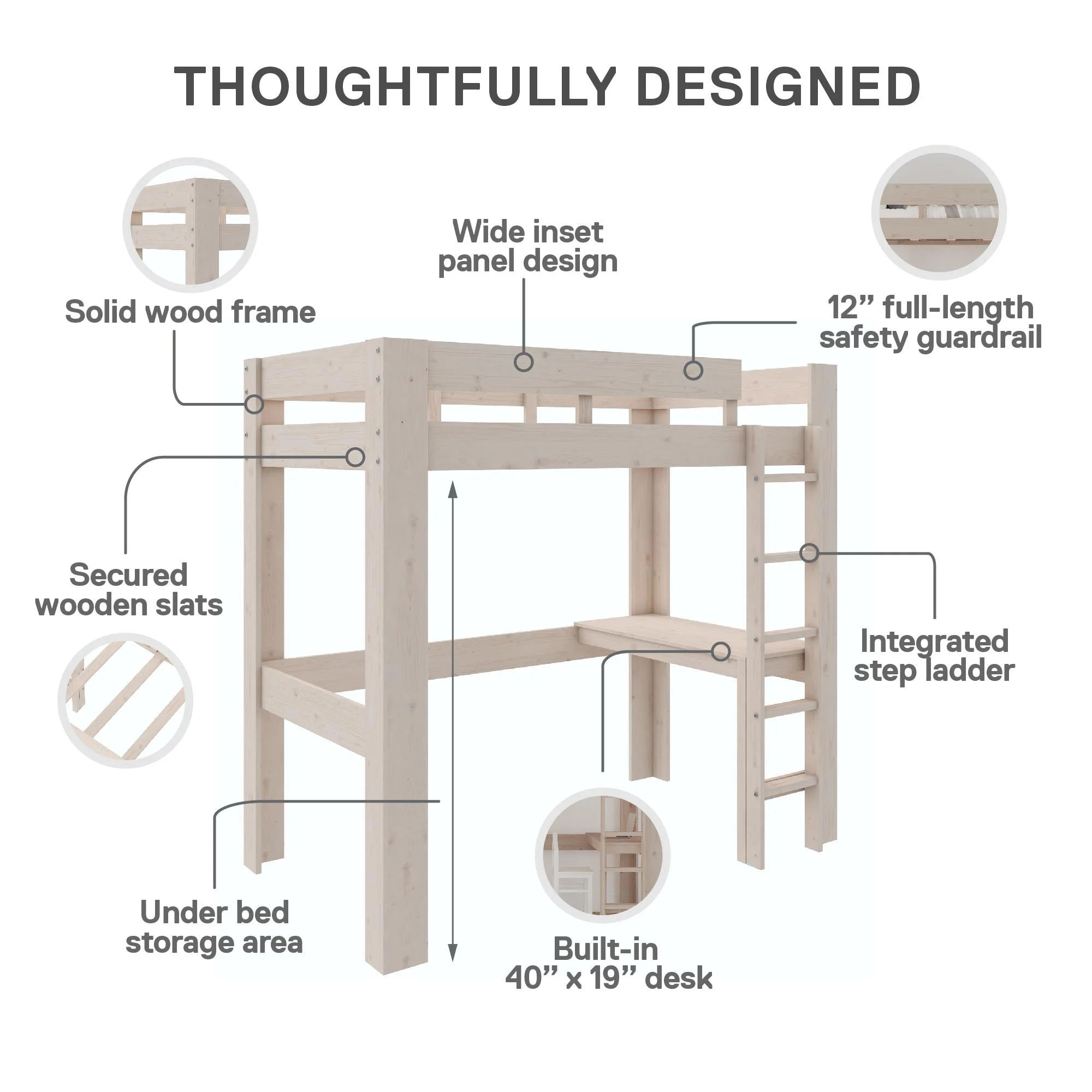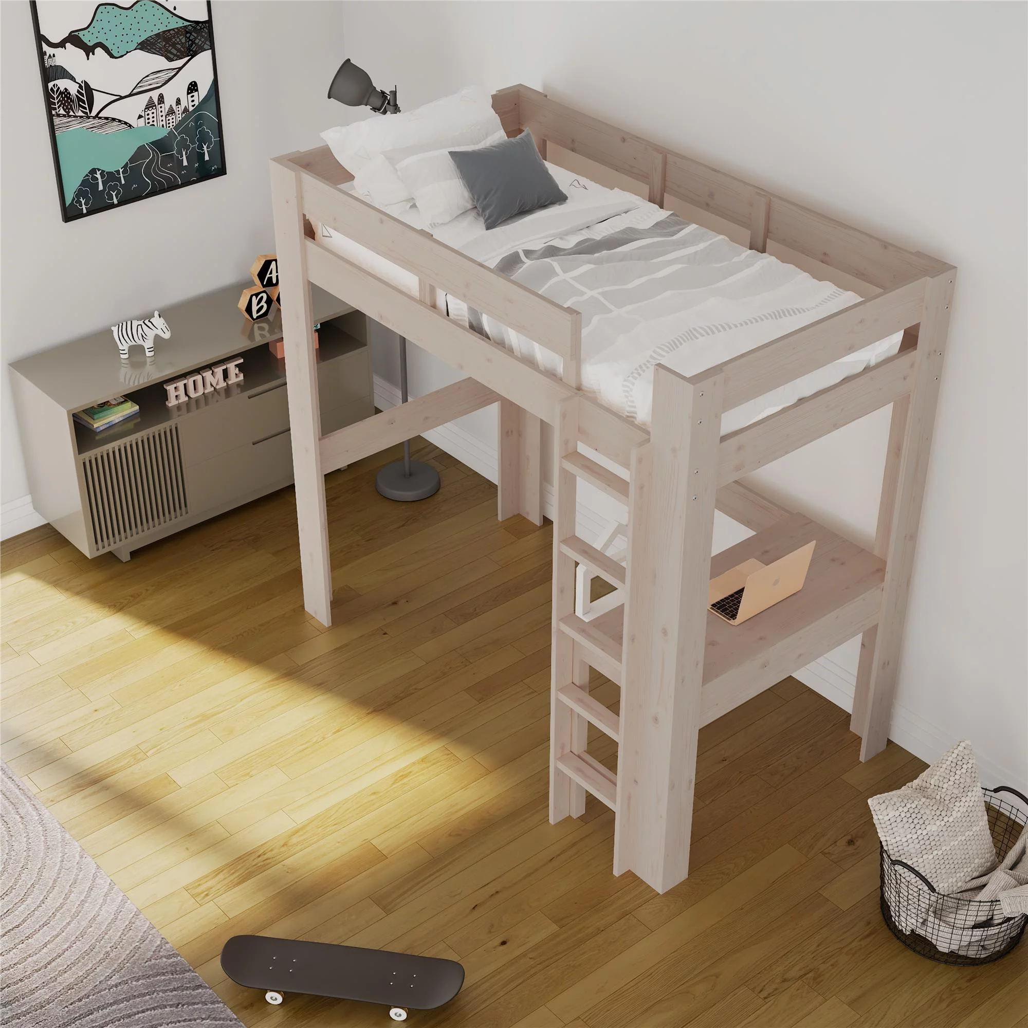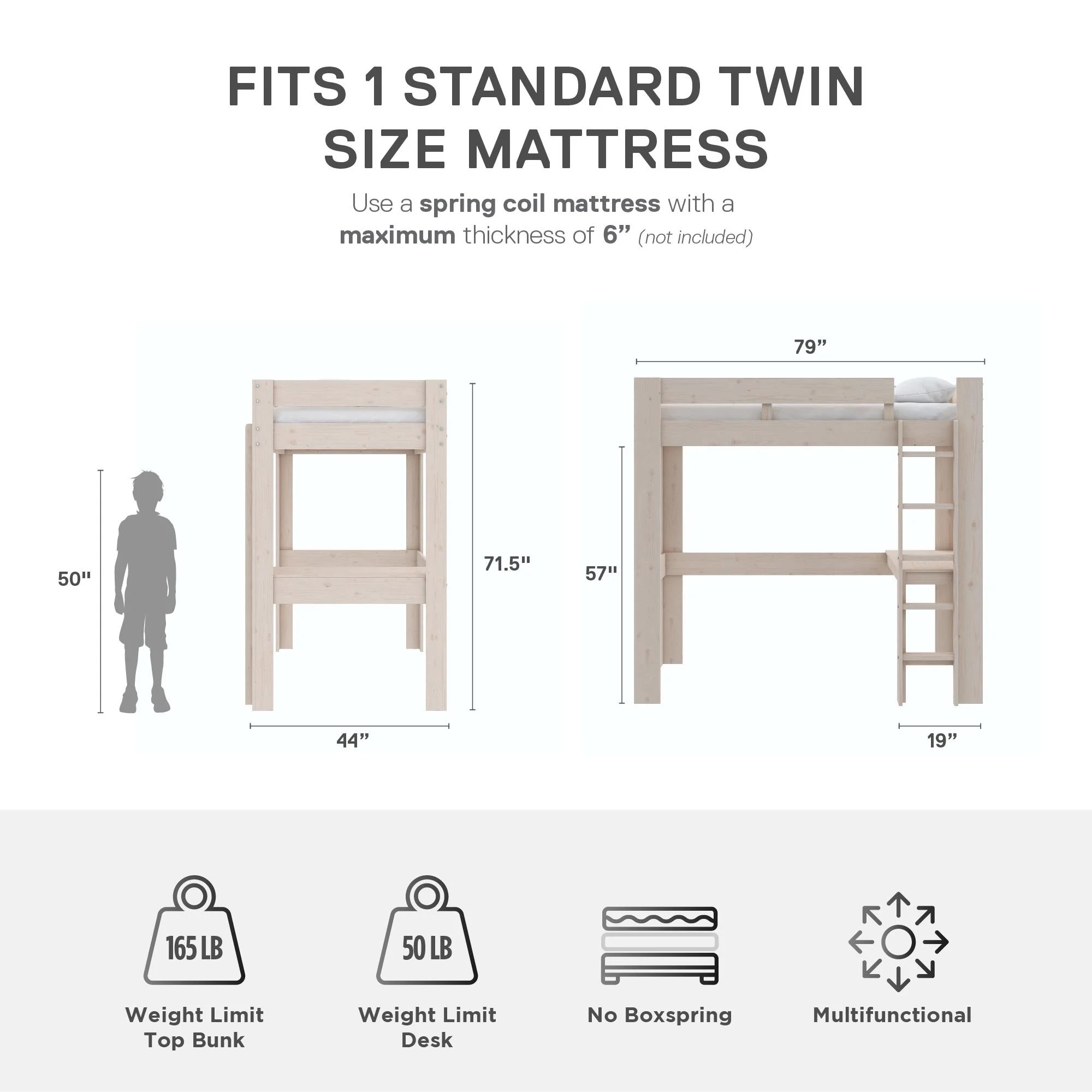 DHP Jaymee Kids Loft Bed with Desk in Solid Wood, Twin, Sandwashed Gray