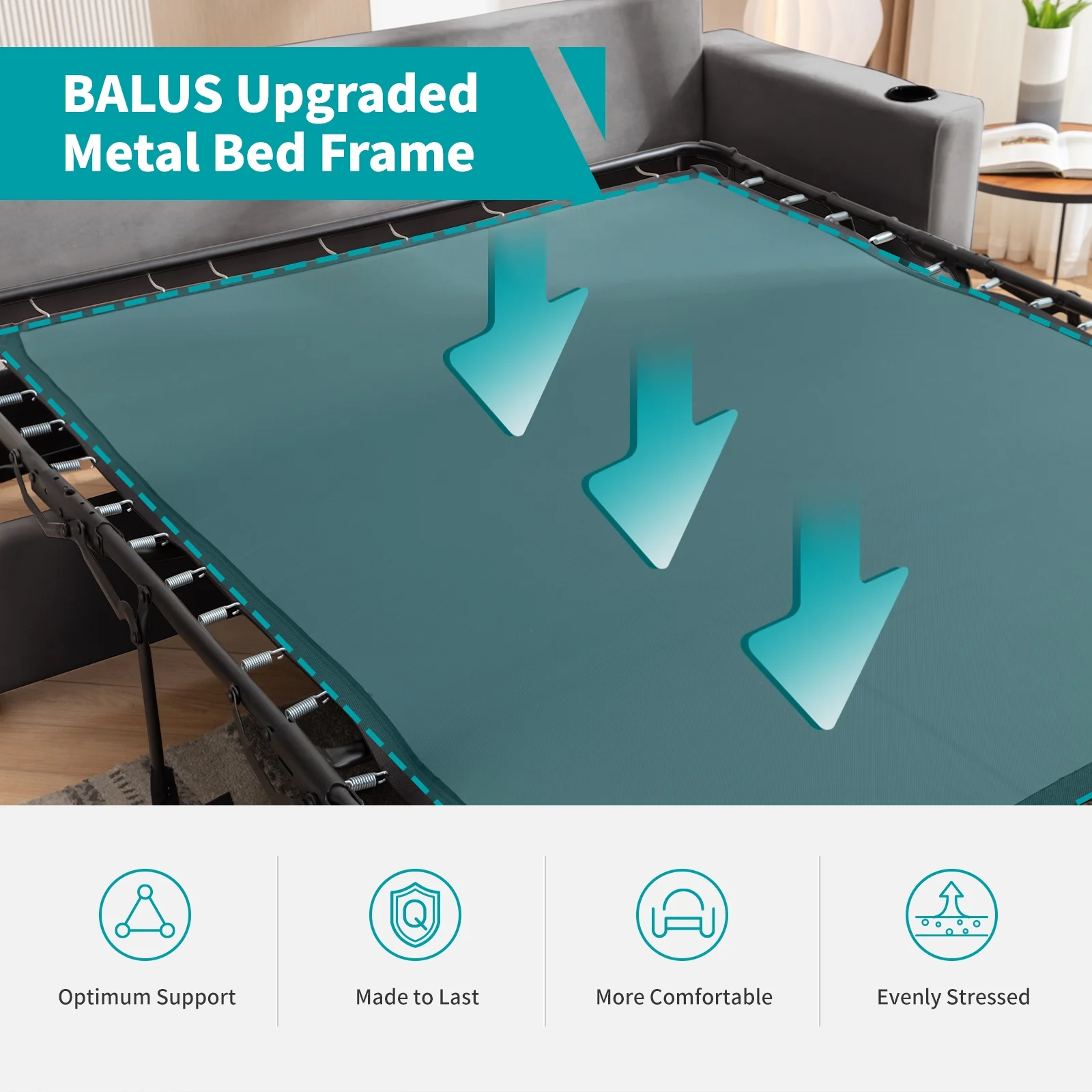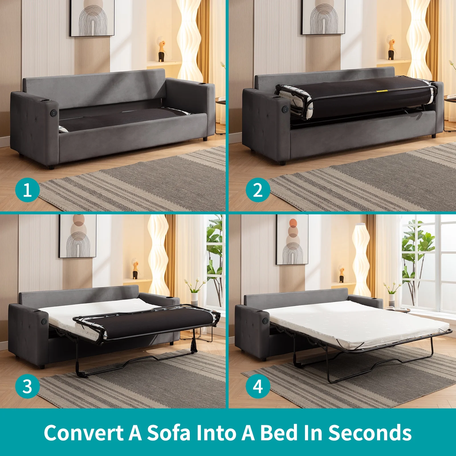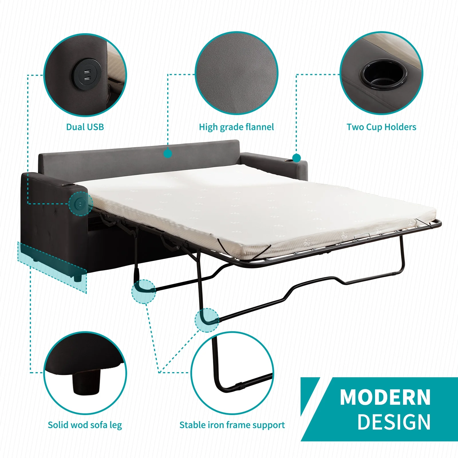 BALUS 2 in 1 Pull Out Sofa Bed, Queen Size Sofa Sleeper With 2 Cup Holders and Dual USB, Dark Grey