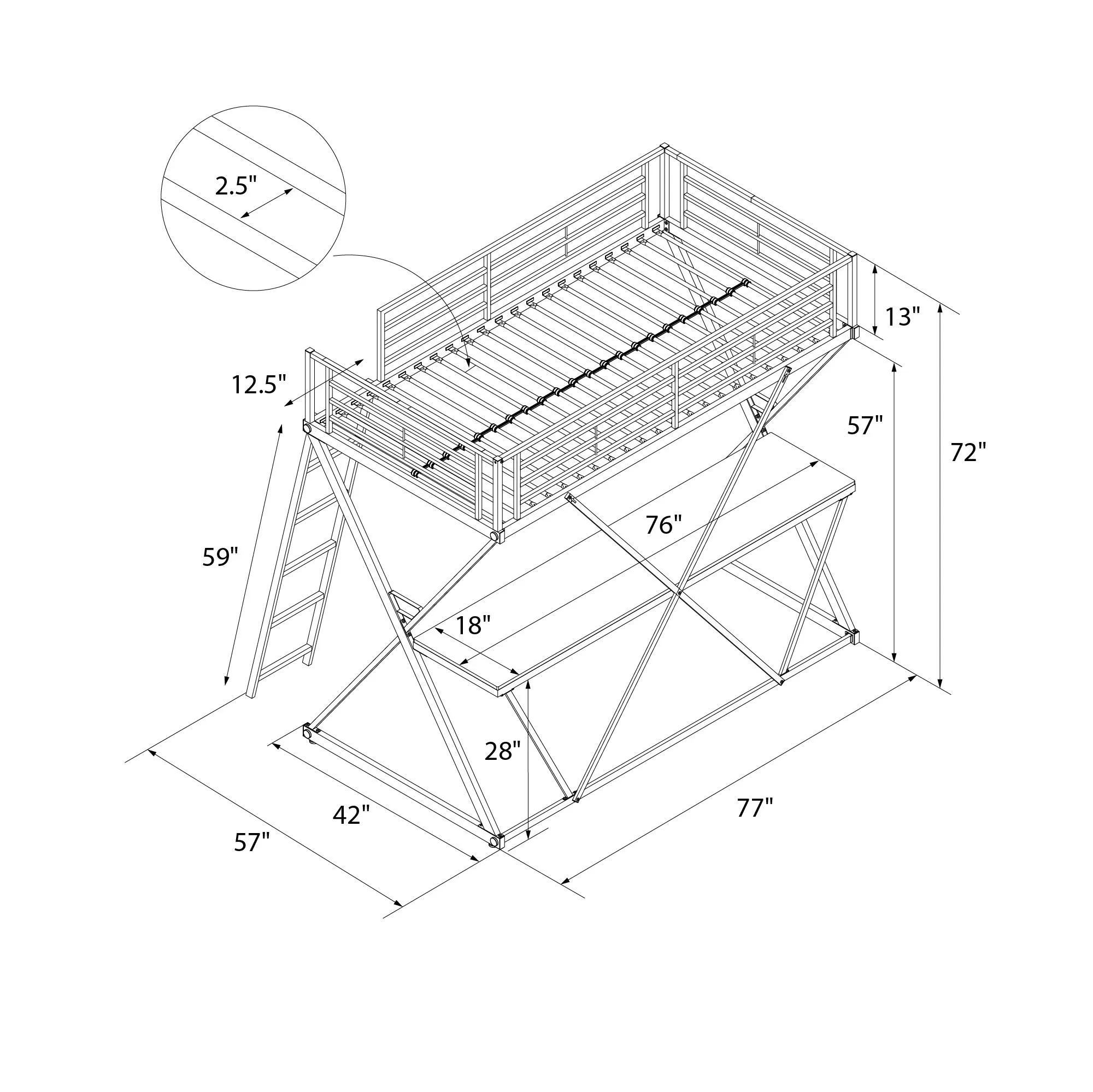 Gewnee Twin Size Metal Loft Bed with Desk and Shelving for Kids,Teens,Black