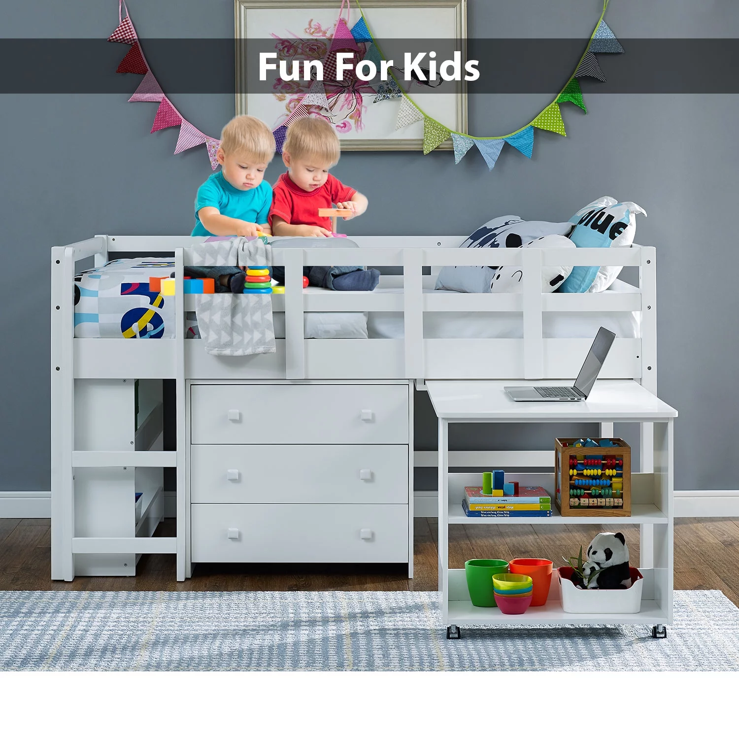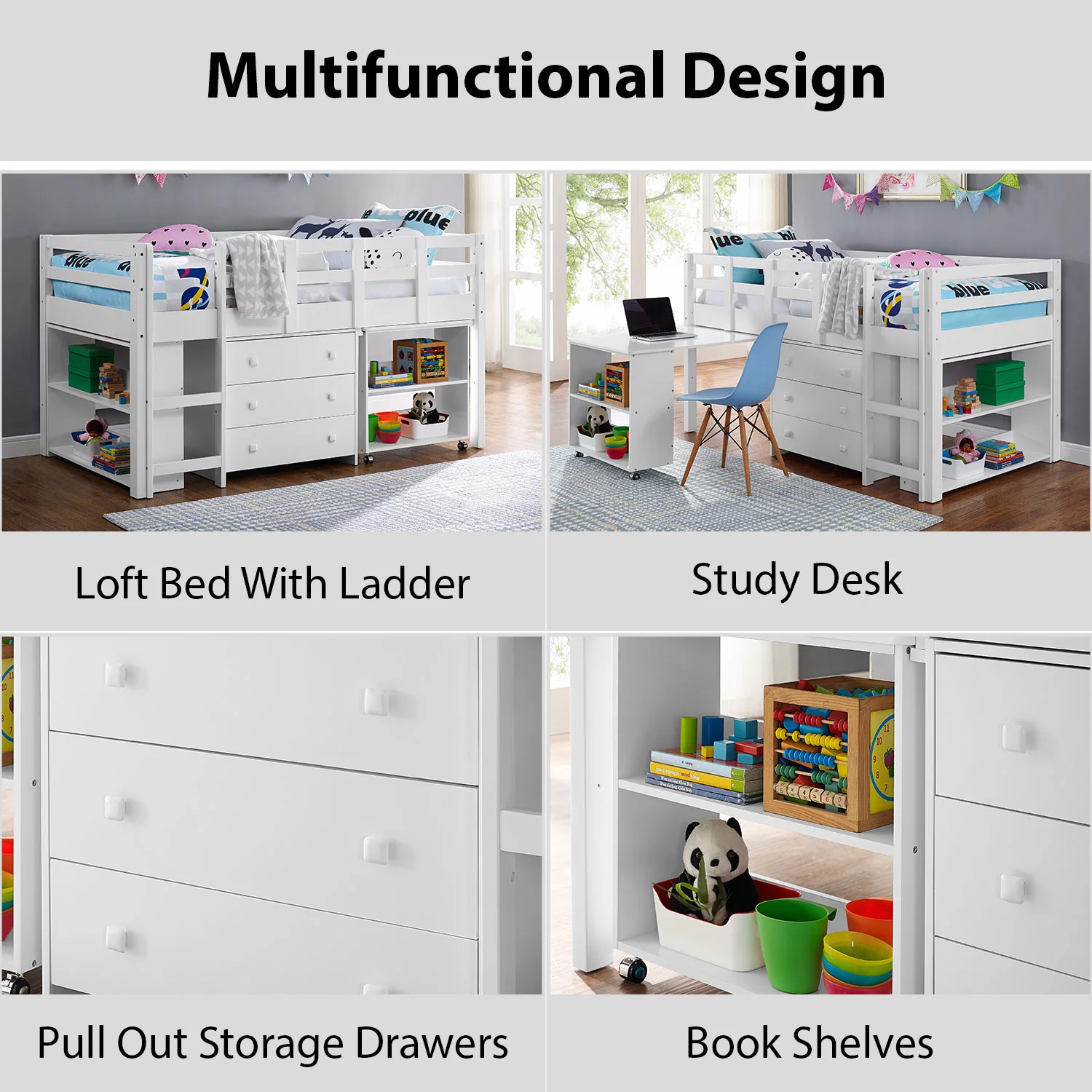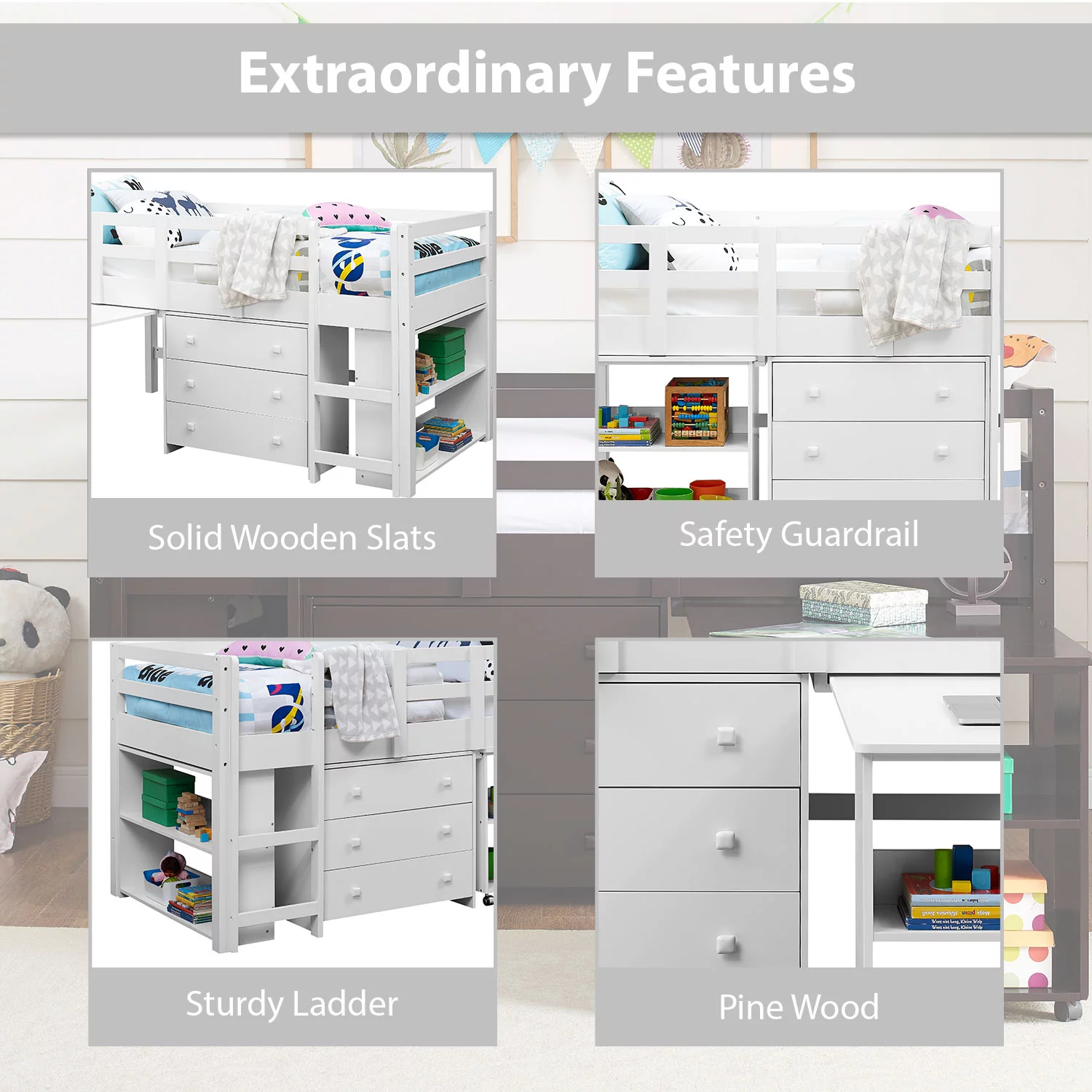 Euroco Wood Twin Bunk Loft Bed with Desk, Drawers and Shelf for Kids, White