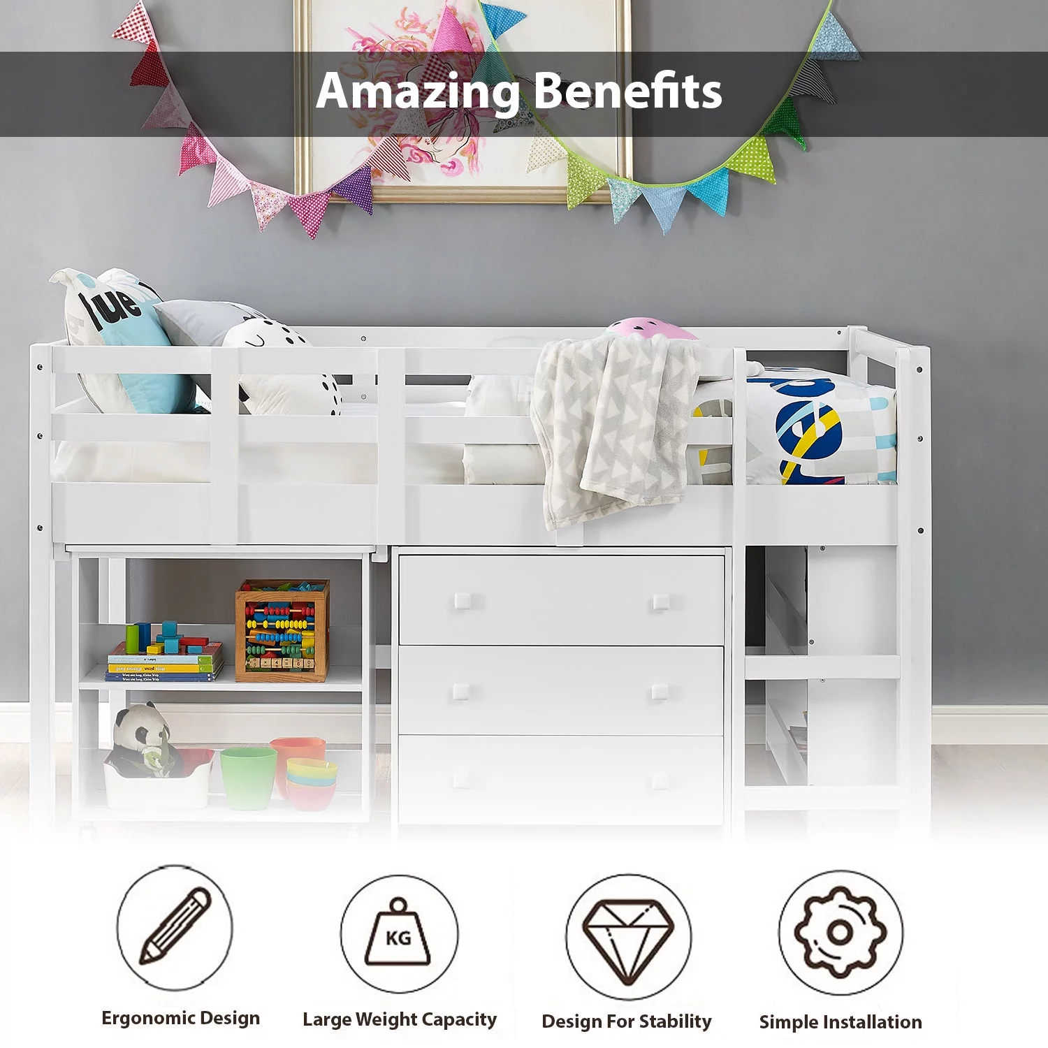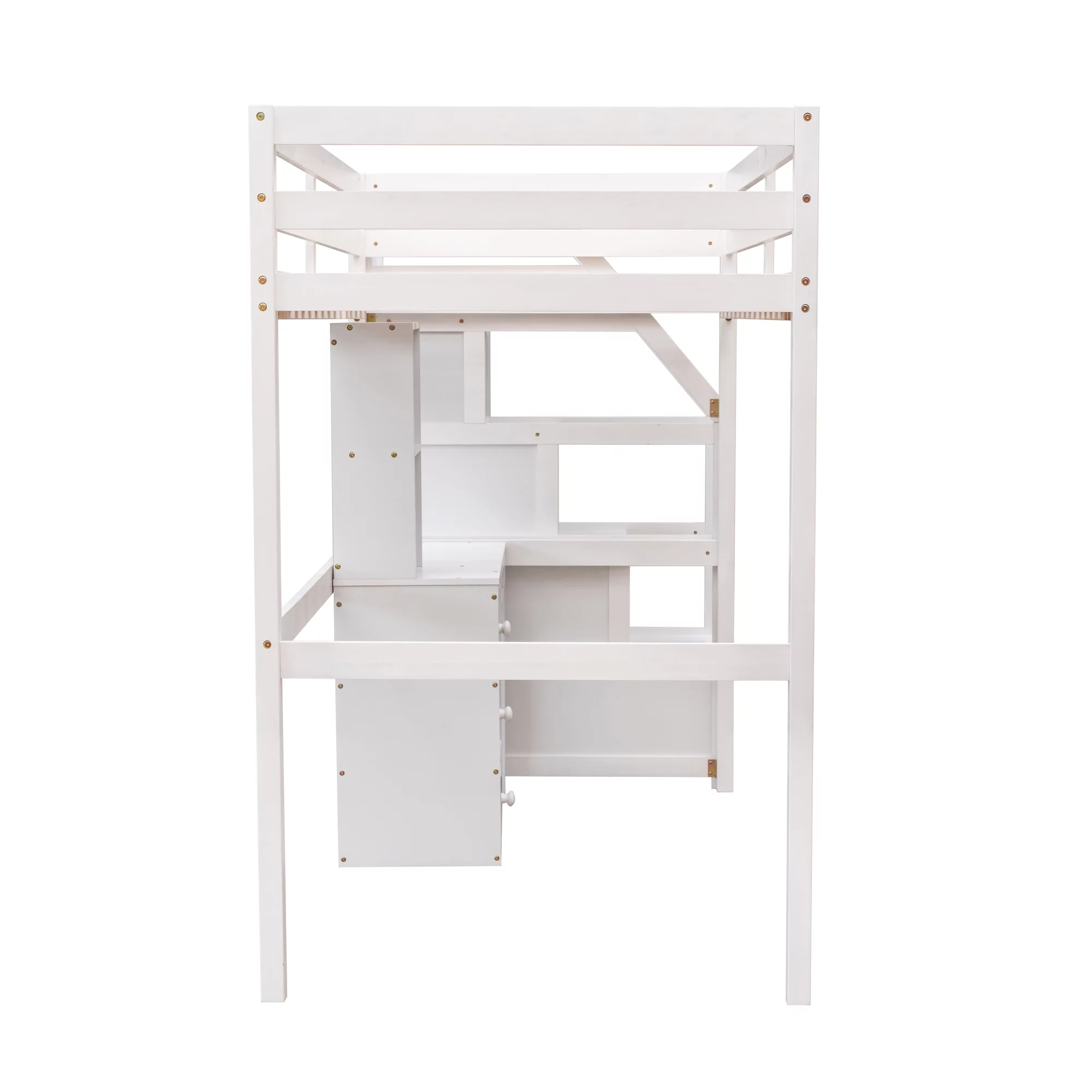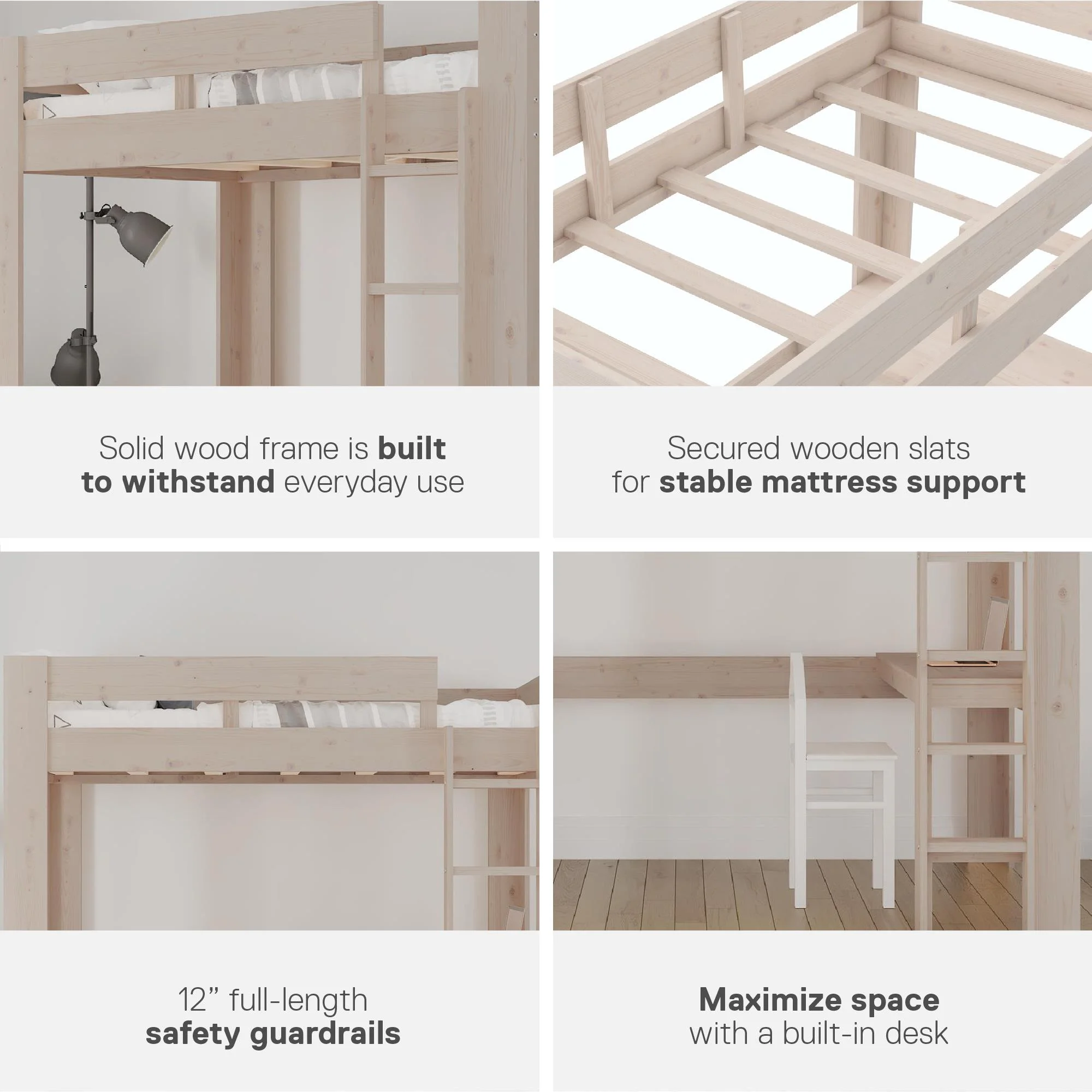 Gewnee Pine Wood Twin Size Loft Bed with Built-in Desk and Ladder for Kids Room,White