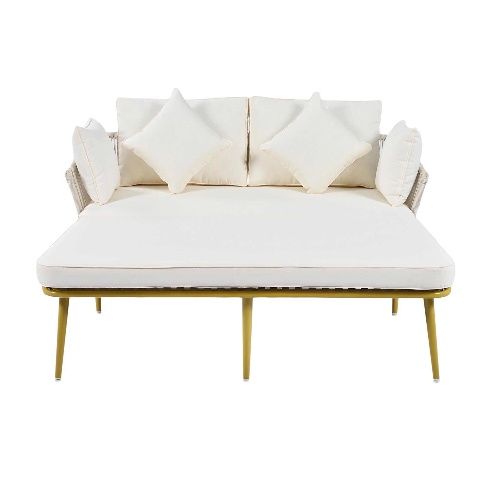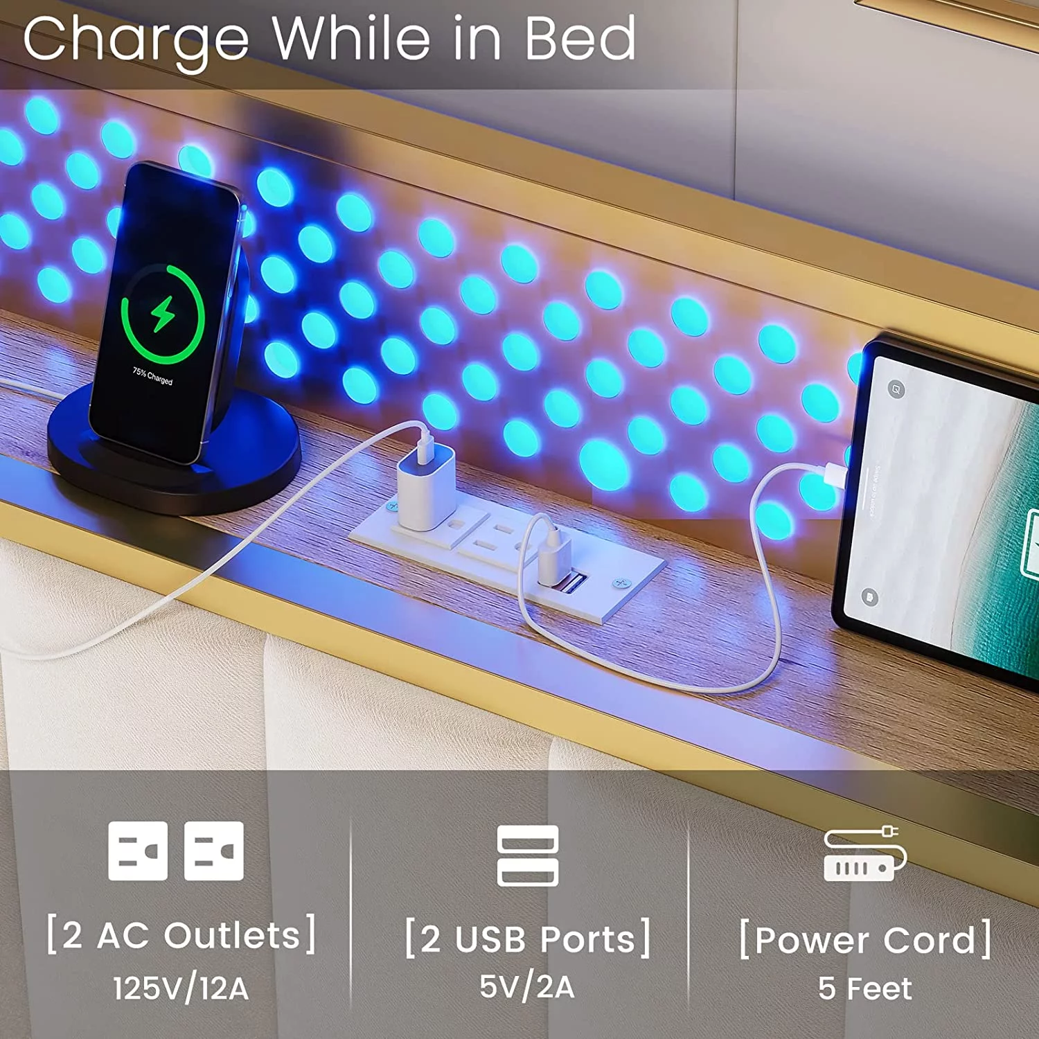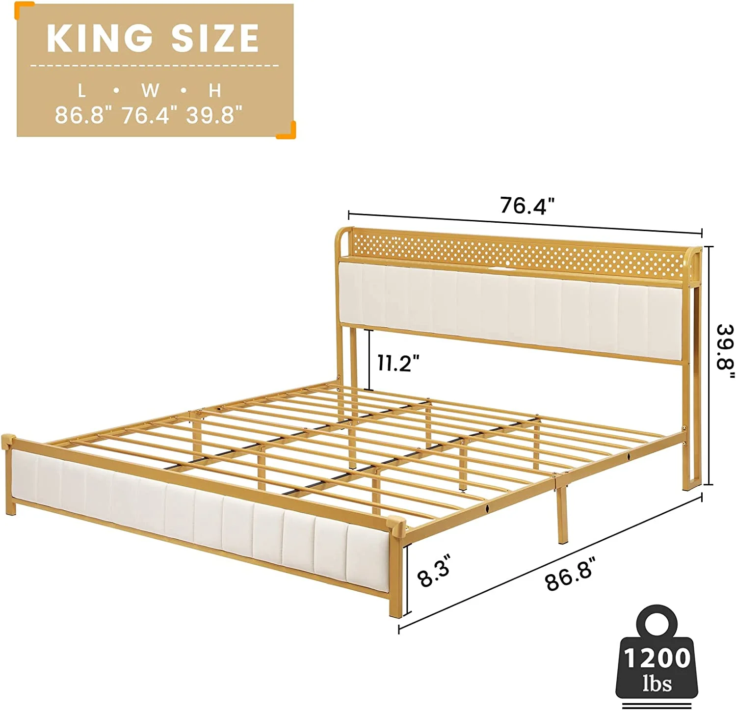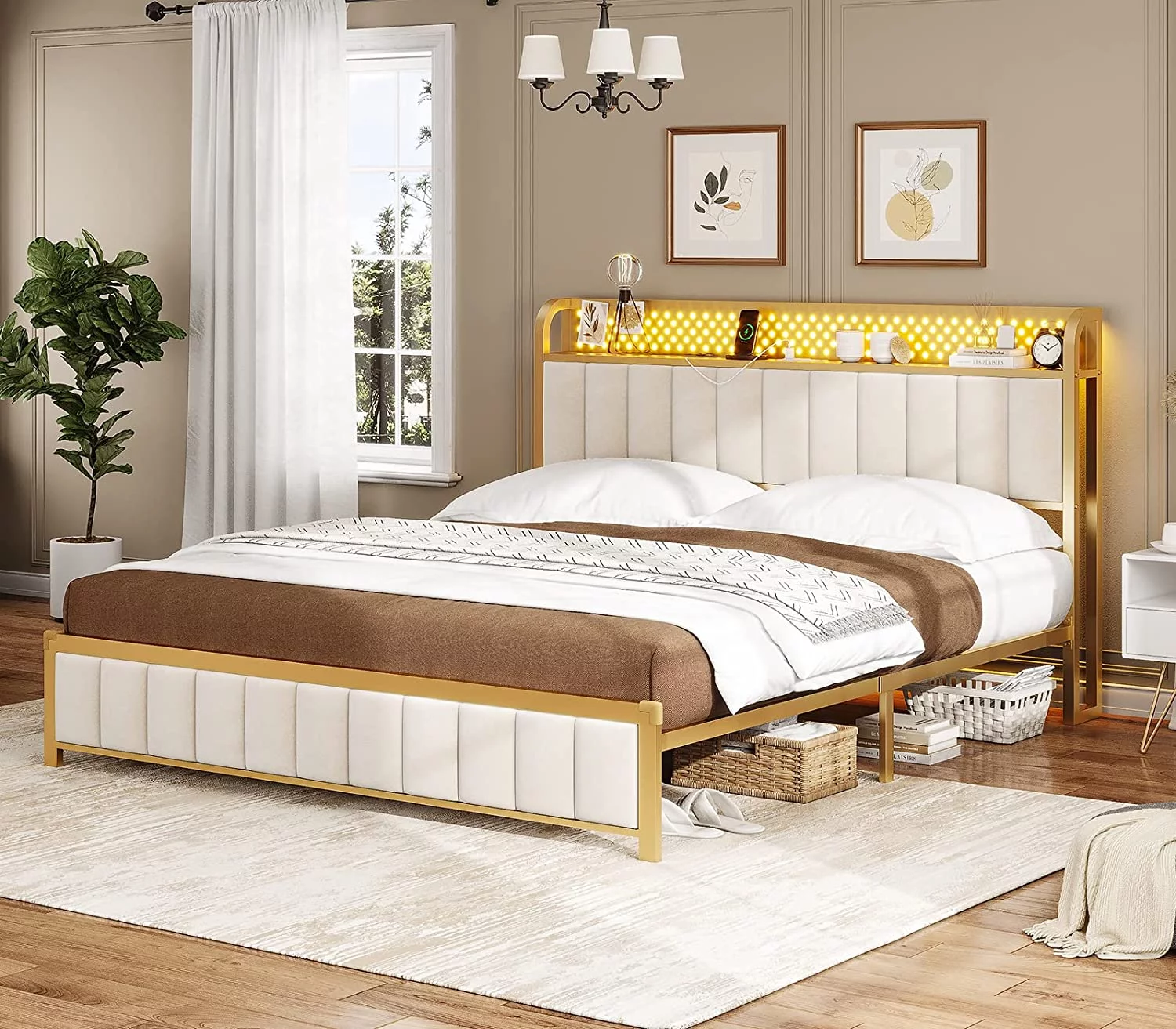 ADORNEVE King Bed Frame with LED Light Headboard, Upholstered Platform Bed Frame with USB Ports and Outlets, Gold