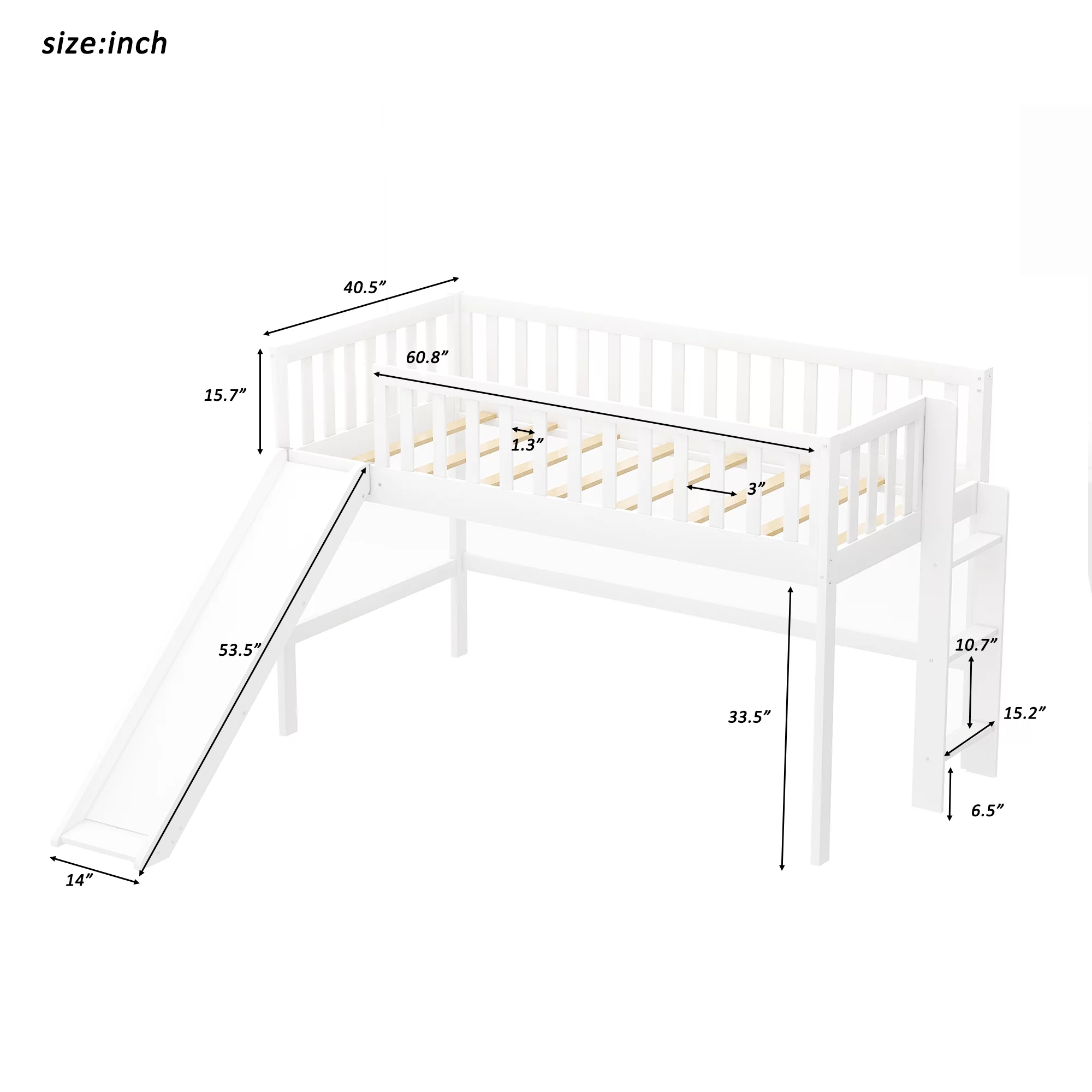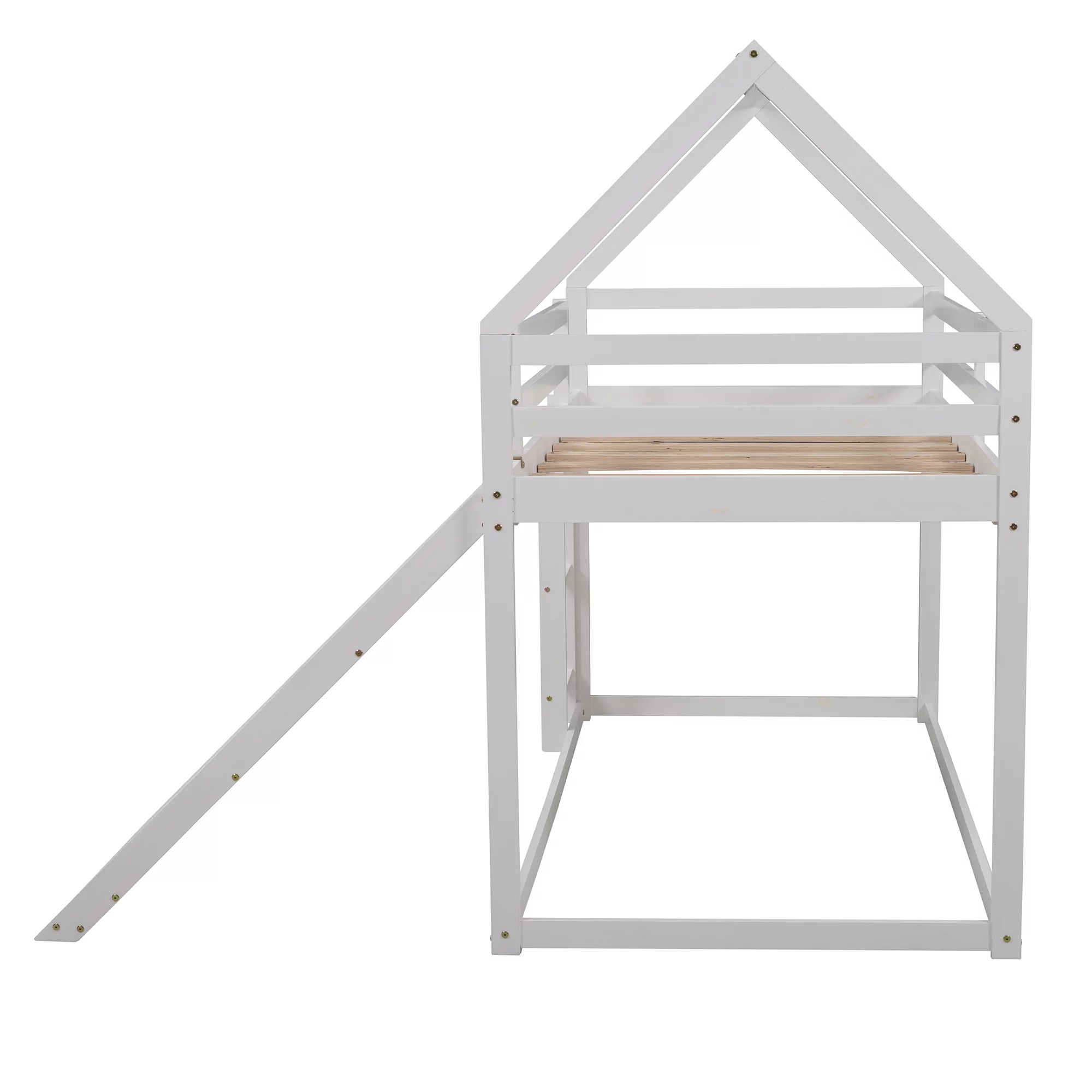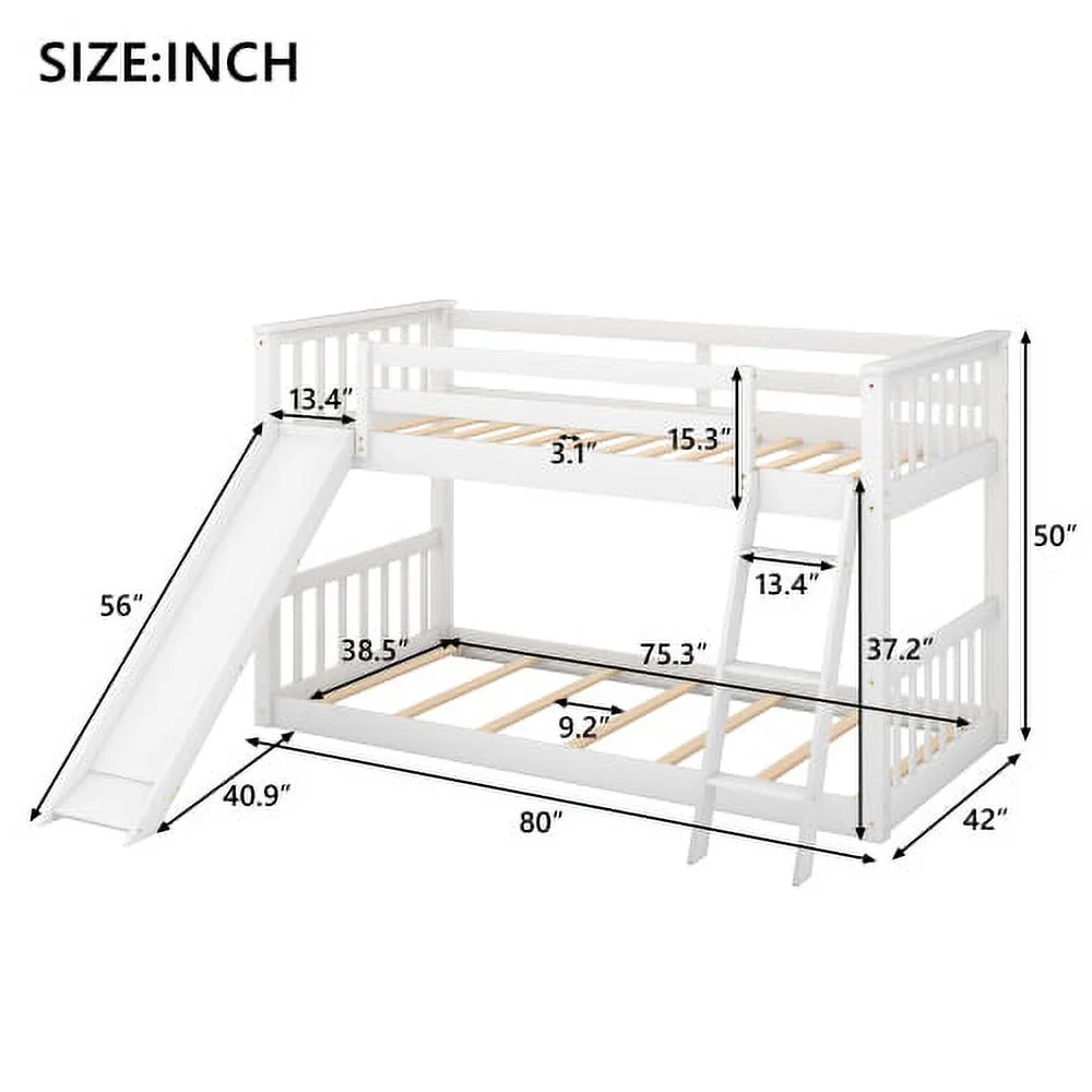 Twin Bunk Beds with Slide Floor Loft Bed Solid Wood Twin Size Low Loft Bed with Slide and Ladder No Box Spring Required