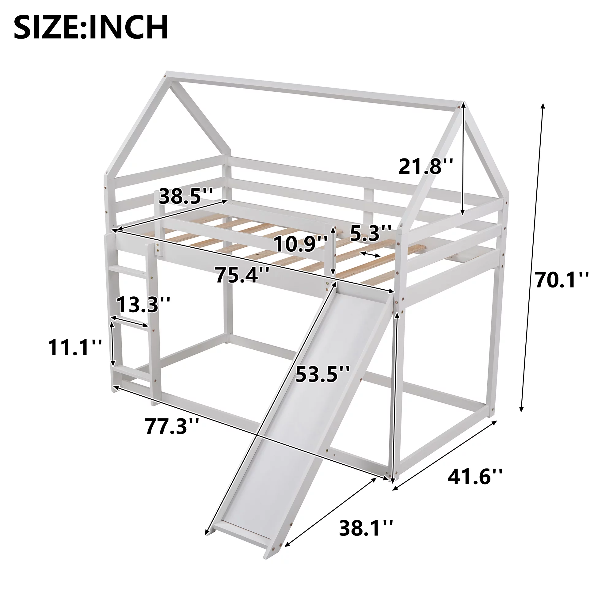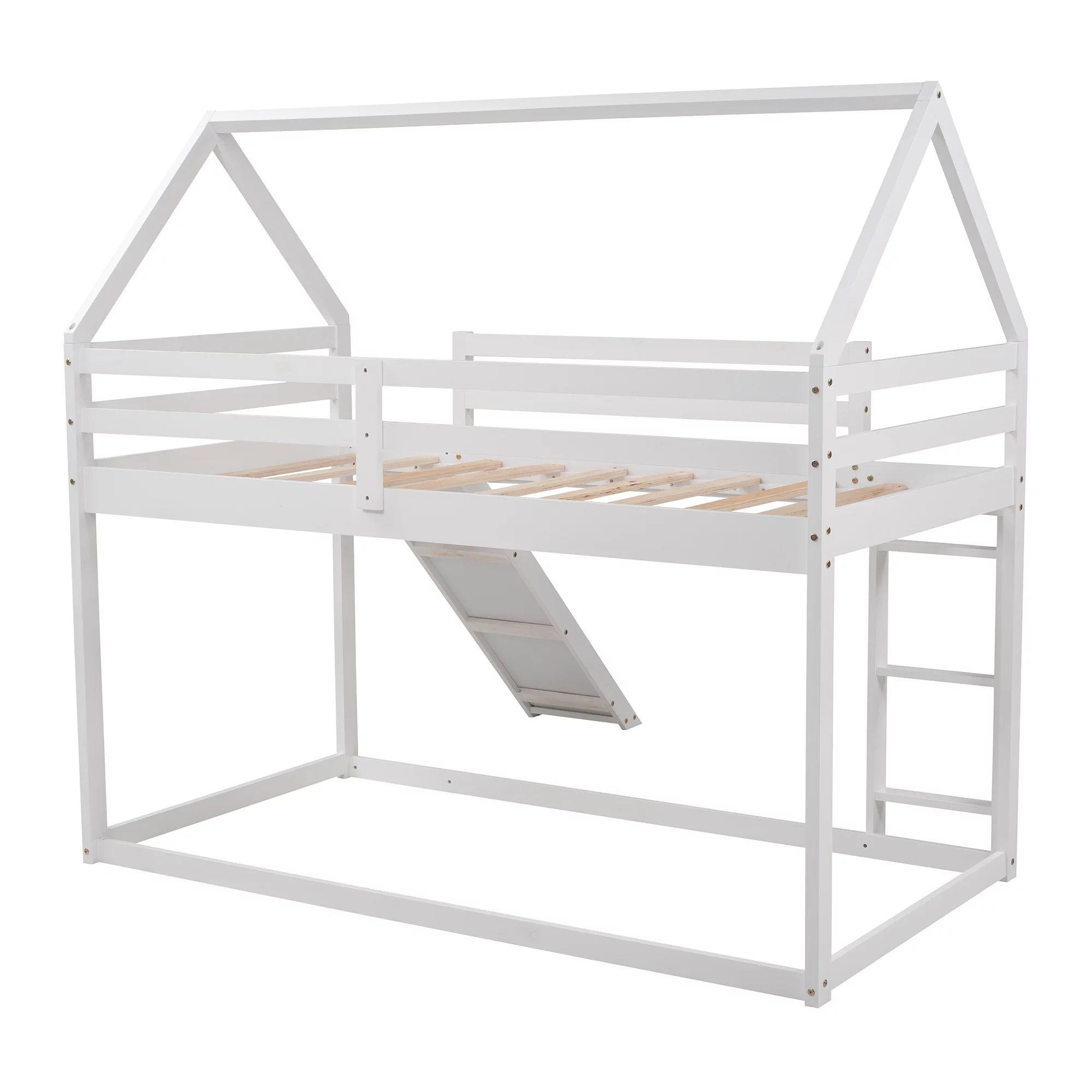 Floor Bunk Beds with Slide and Ladder, Twin Over Twin House-Shaped Bunk Beds with Guardrail for Kids, No Box Spring Needed