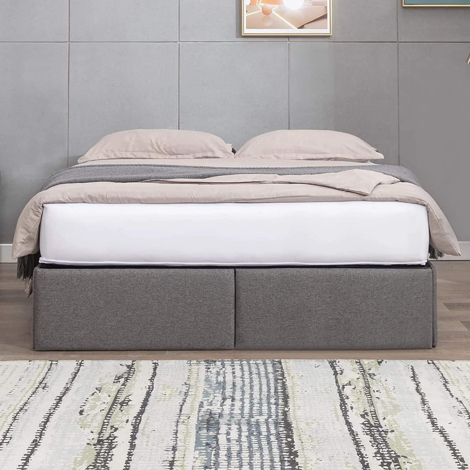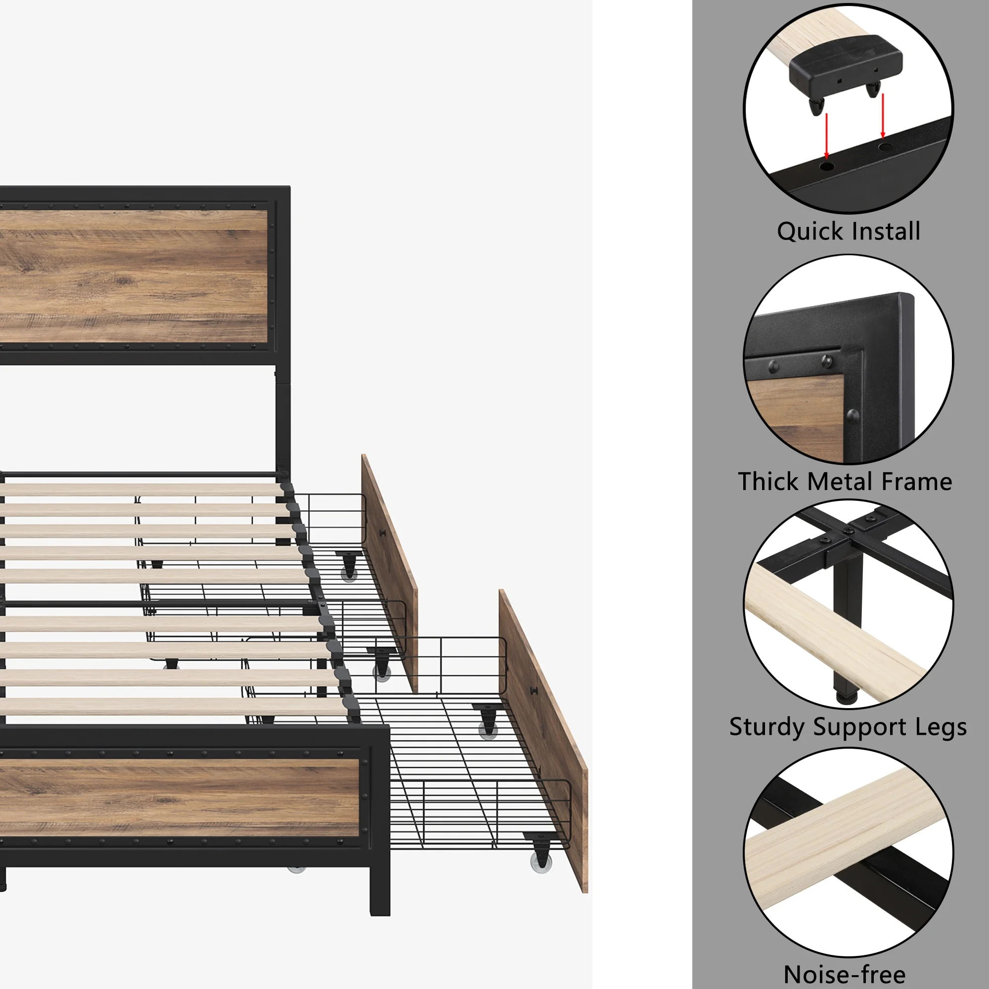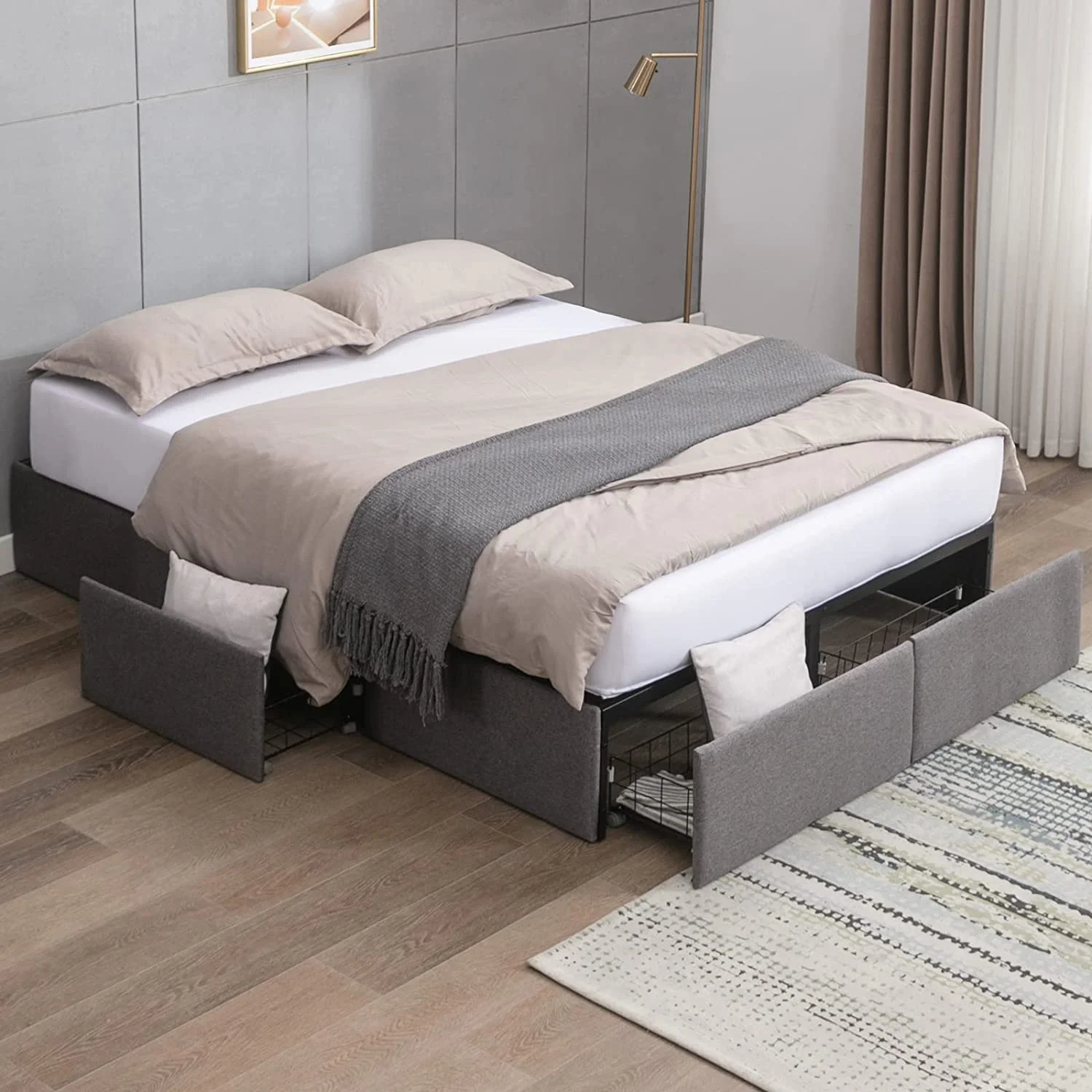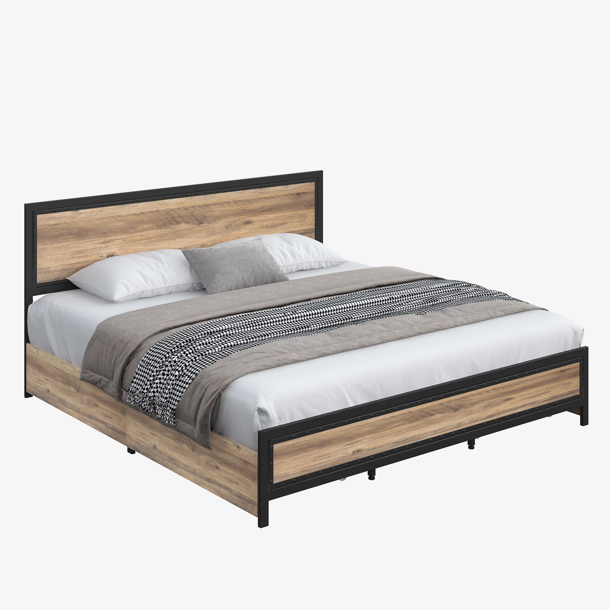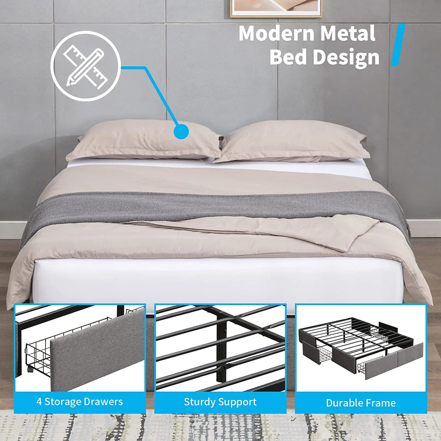 Homfa King 4 Drawer Storage Bed, Heavy Duty Metal Platform Bed Frame with Rivet Headboard, Gray