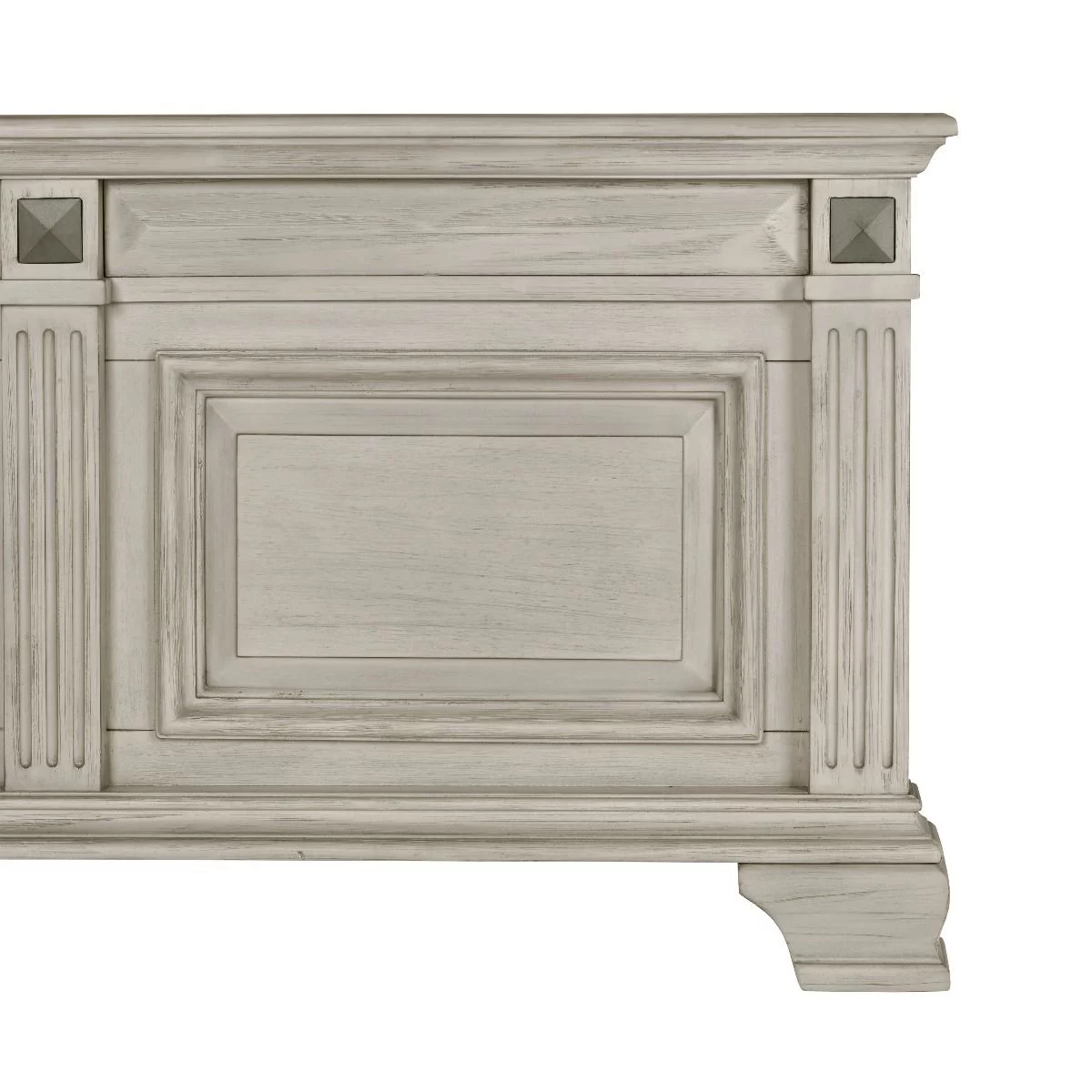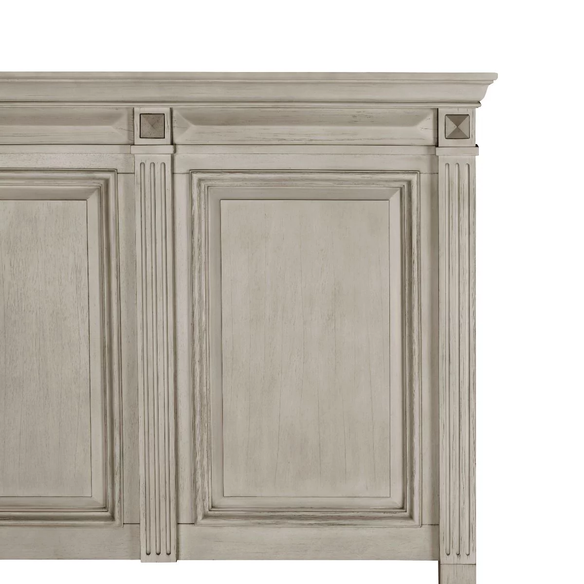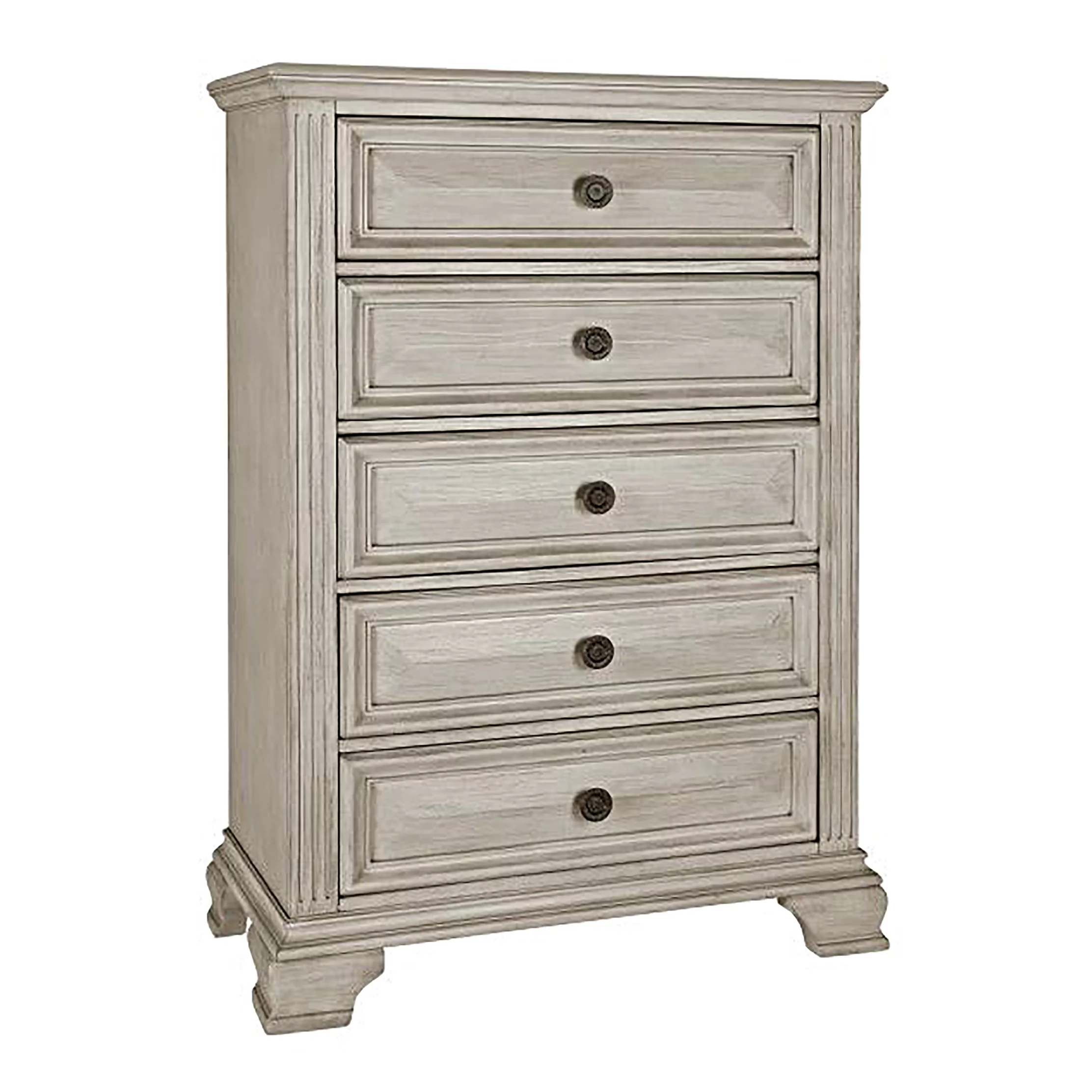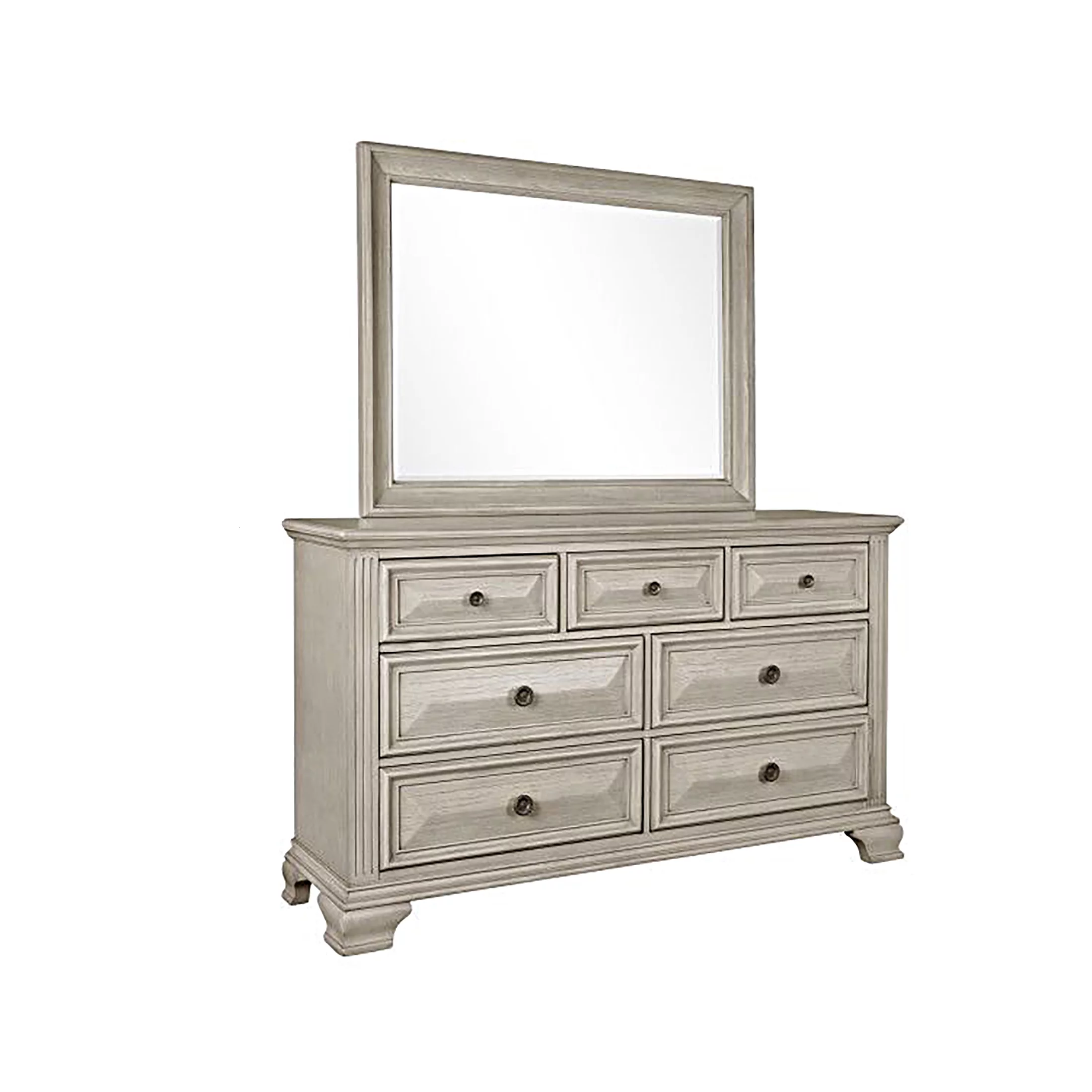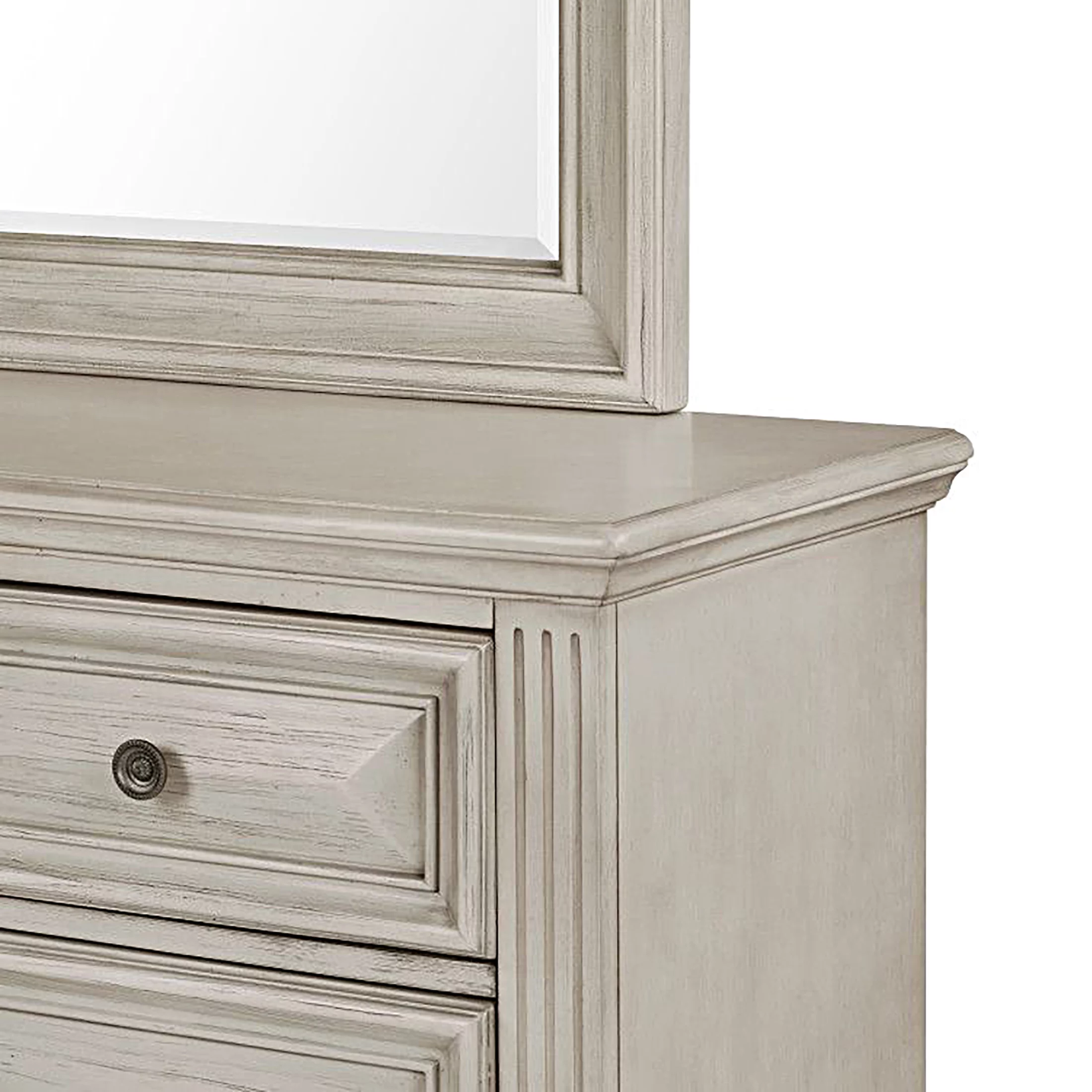 Renova Distressed Parchment Wood Bedroom Set, Queen Panel Bed, Dresser, Mirror, Two Nightstands, Chest