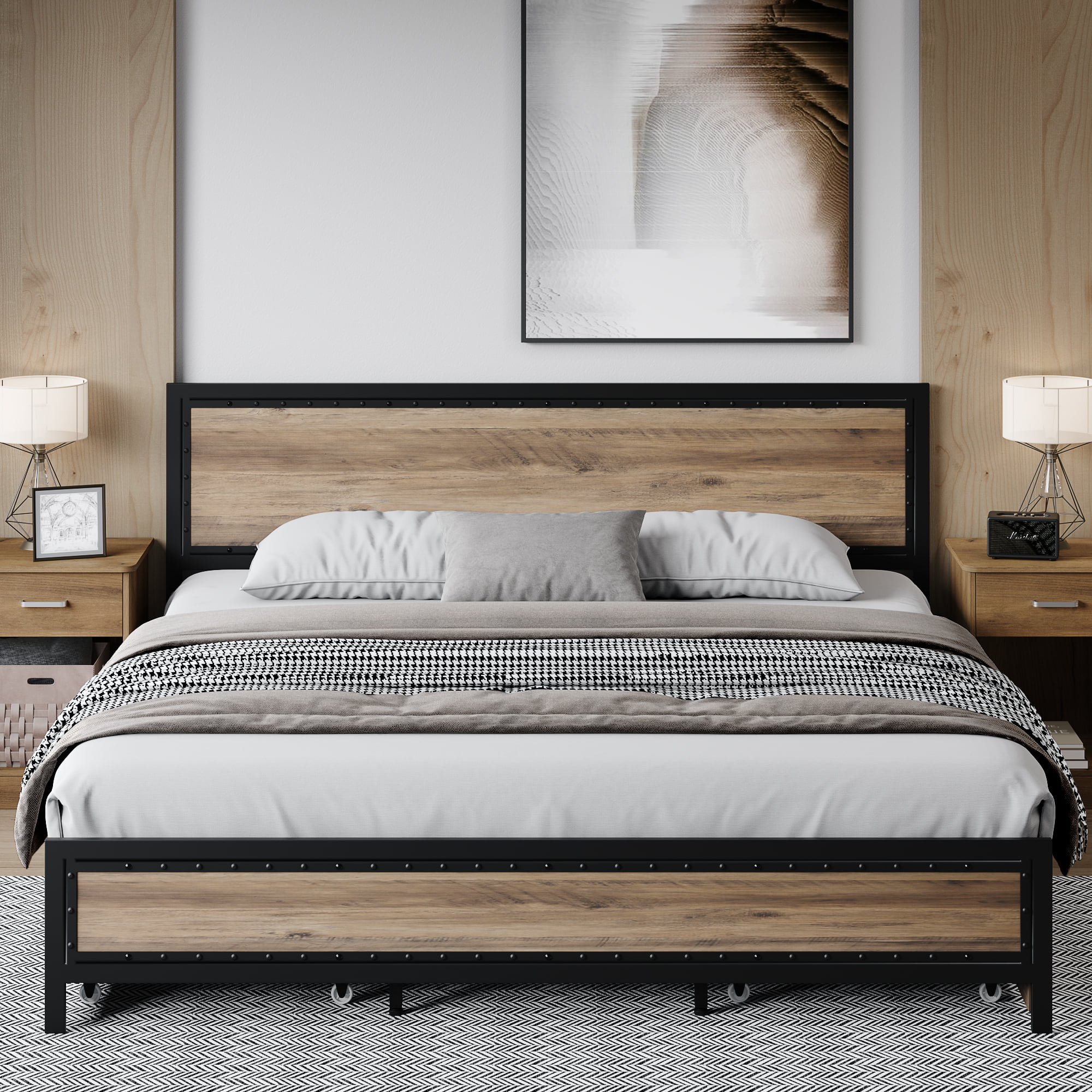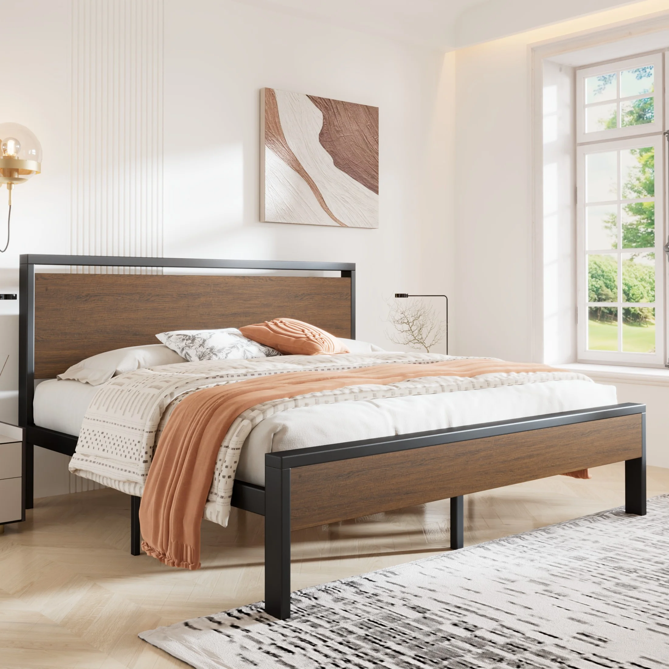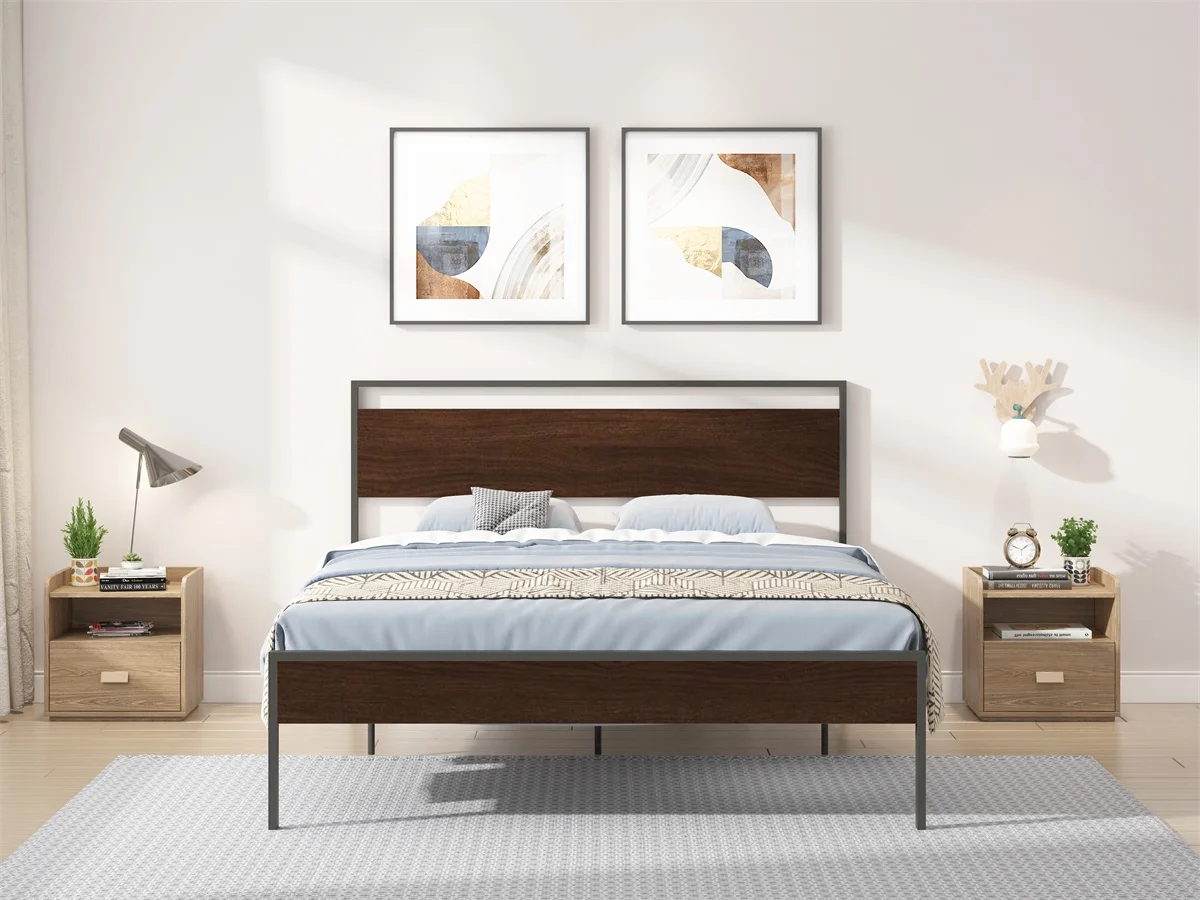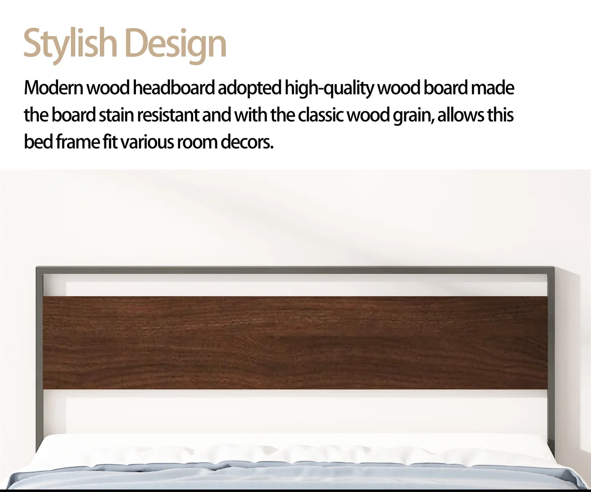 Sha Cerlin Walnut King Size Metal Platform Bed Frame with Wooden Headboard & Footboard, Adult