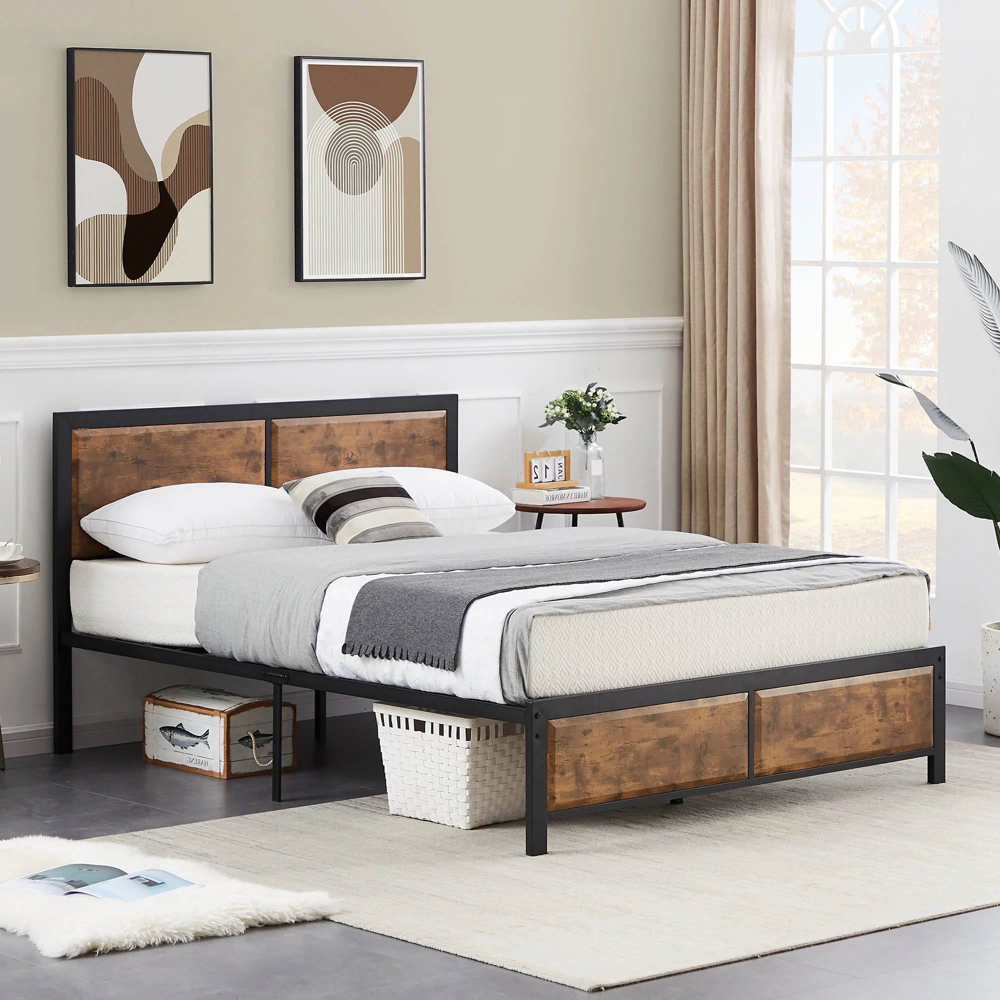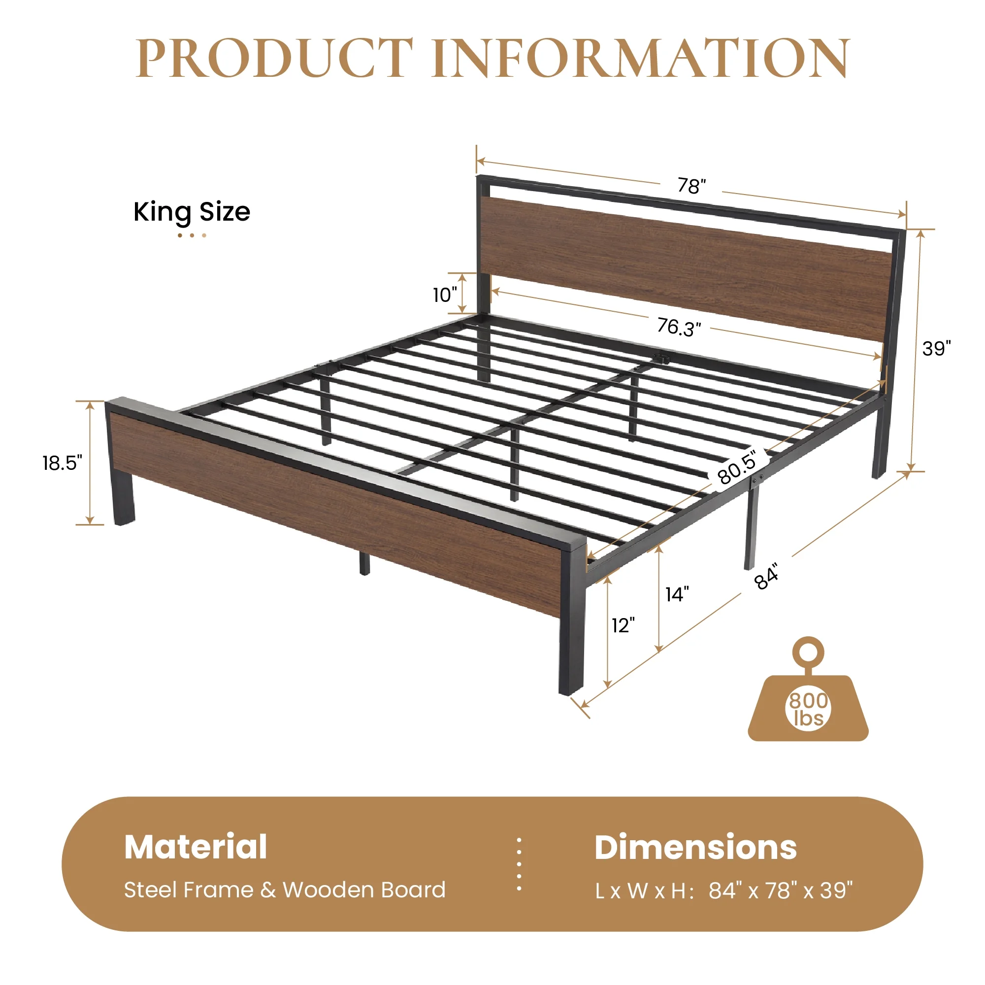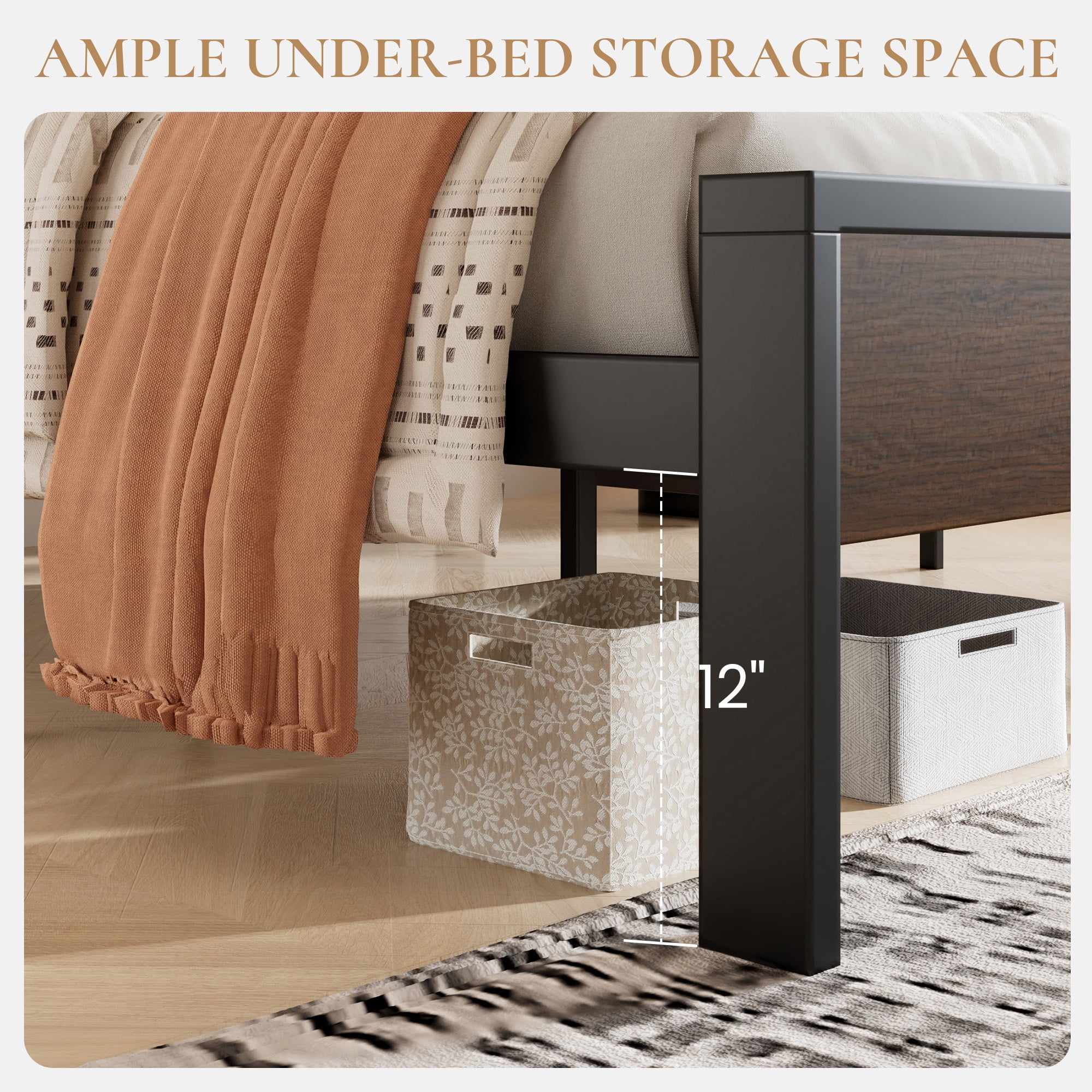 Sha Cerlin Walnut King Size Metal Platform Bed Frame with Wooden Headboard & Footboard, Adult