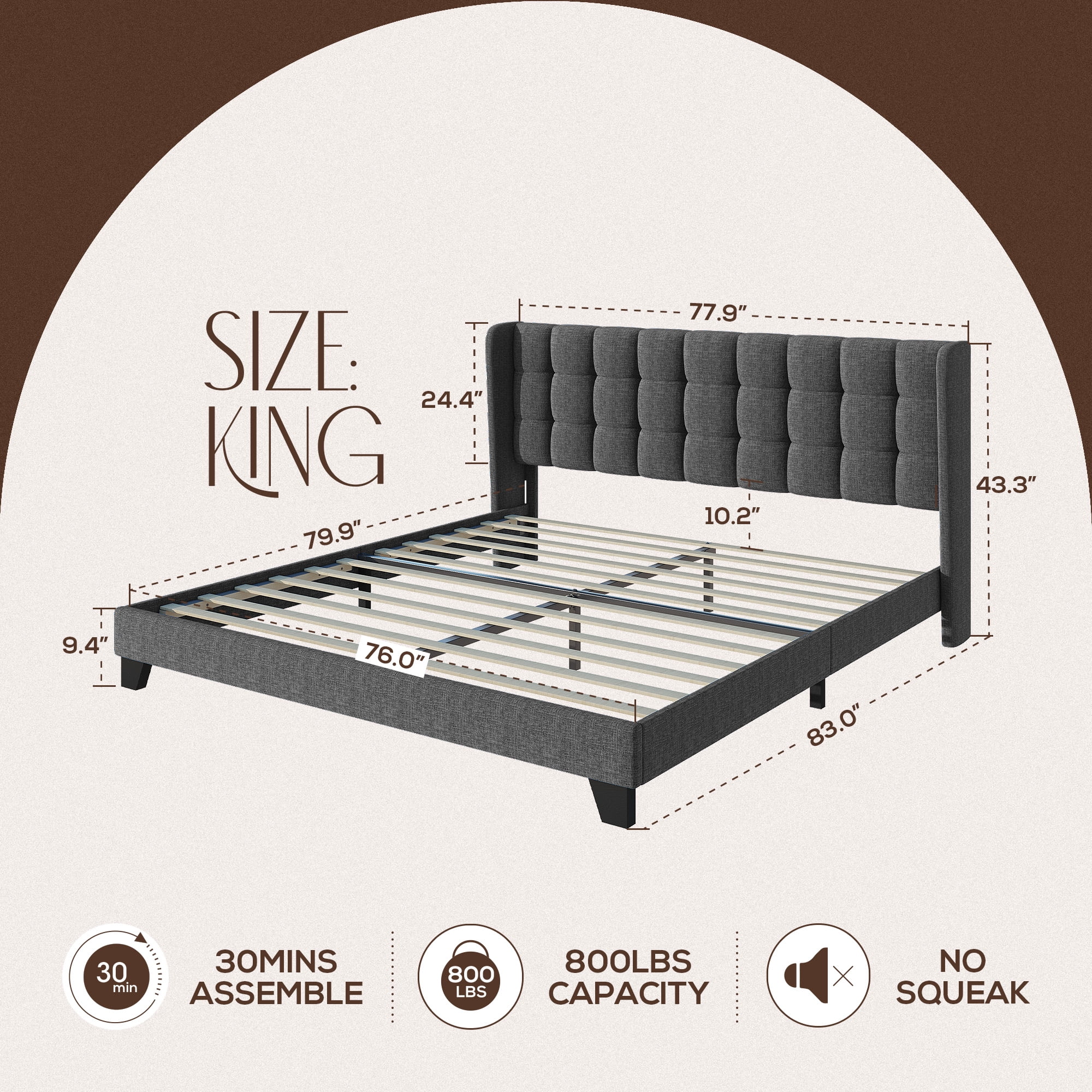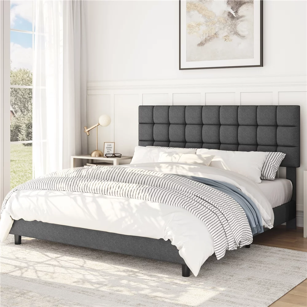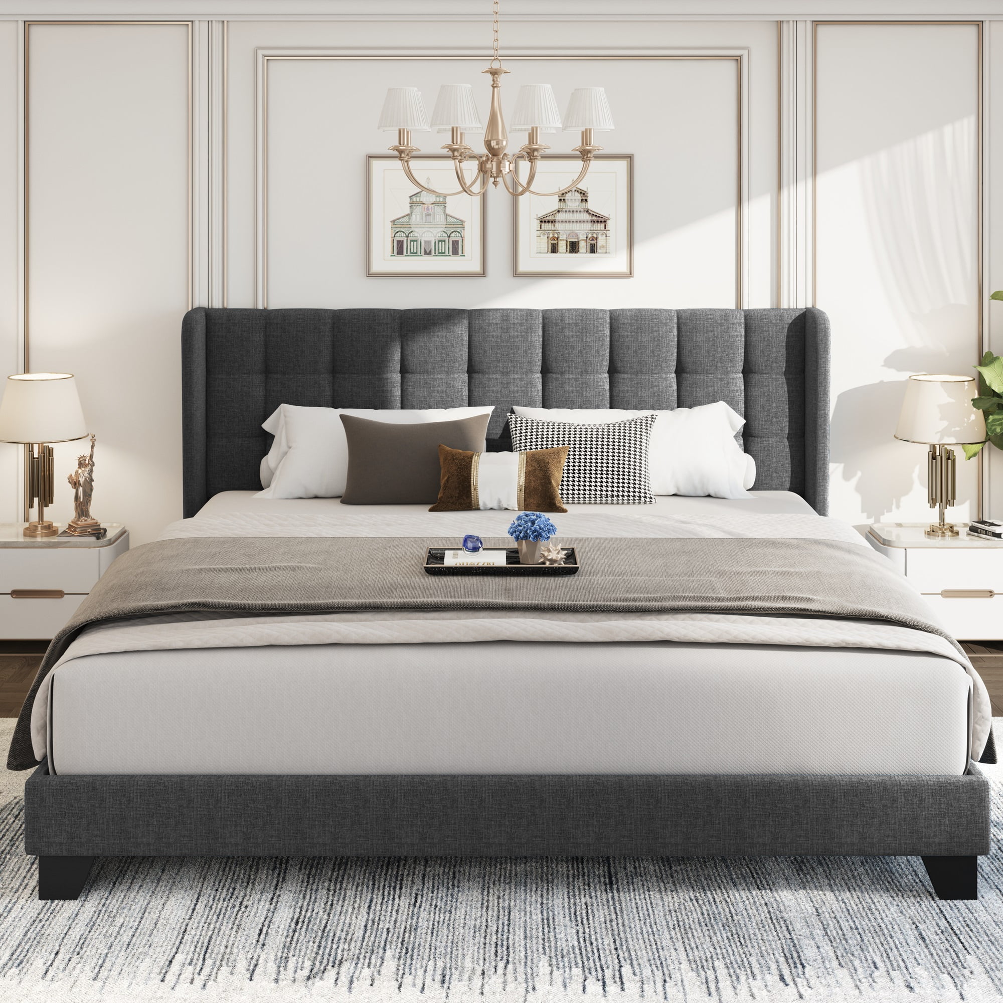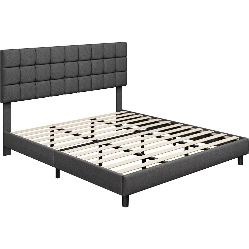 Sha Cerlin Grey King Size Platform Bed Frame with Tufted Headboard & Wingback, Adult